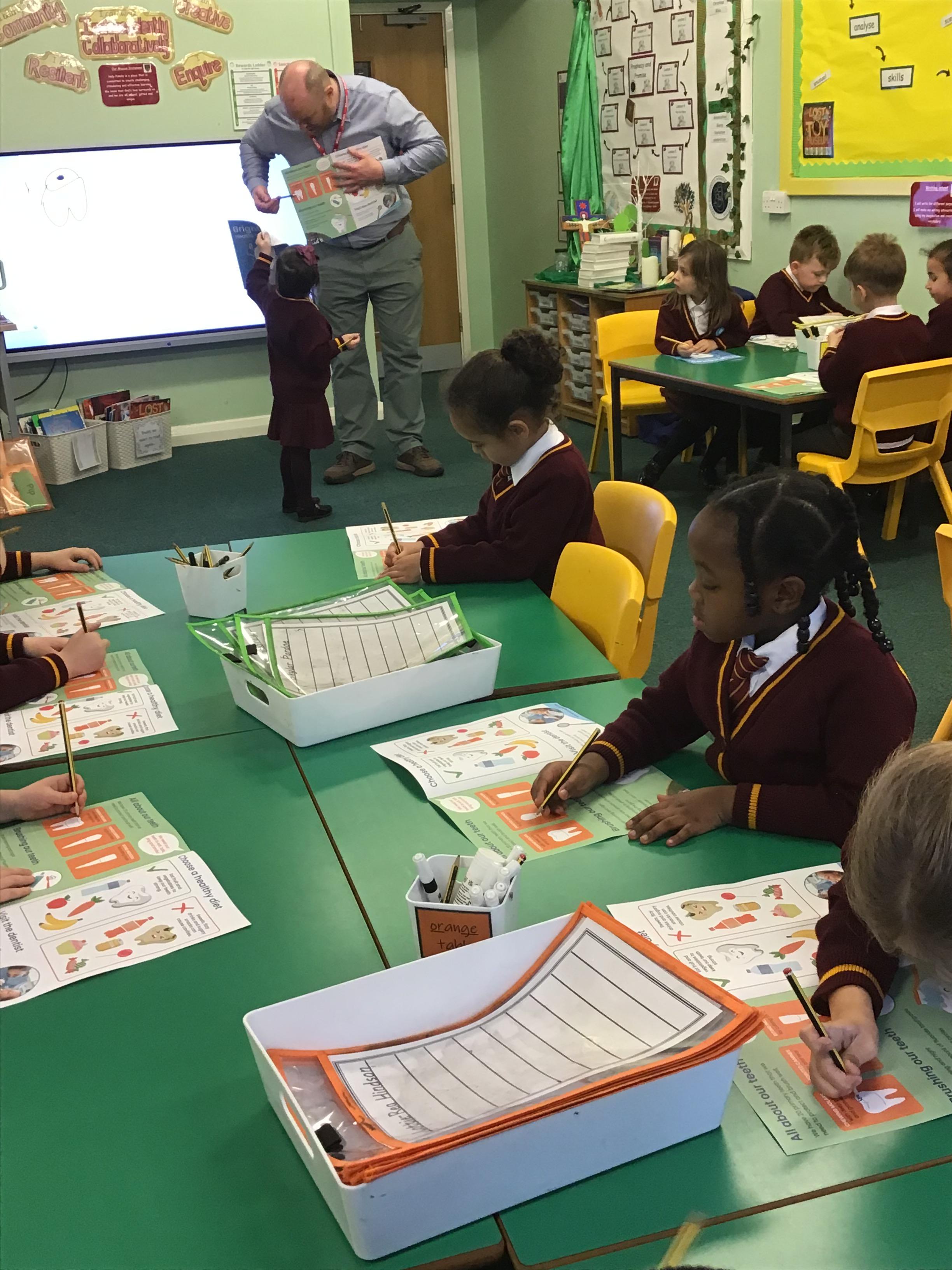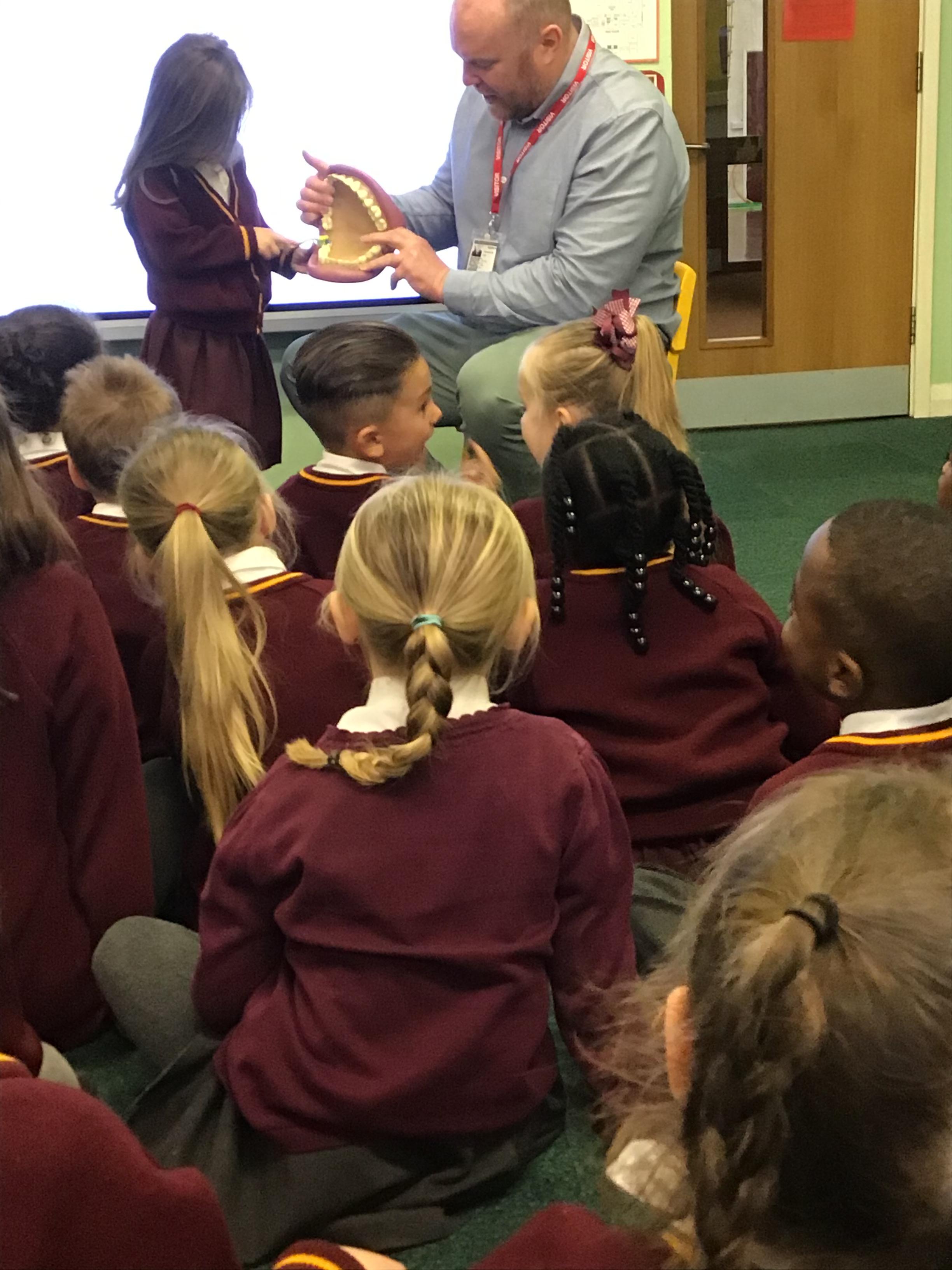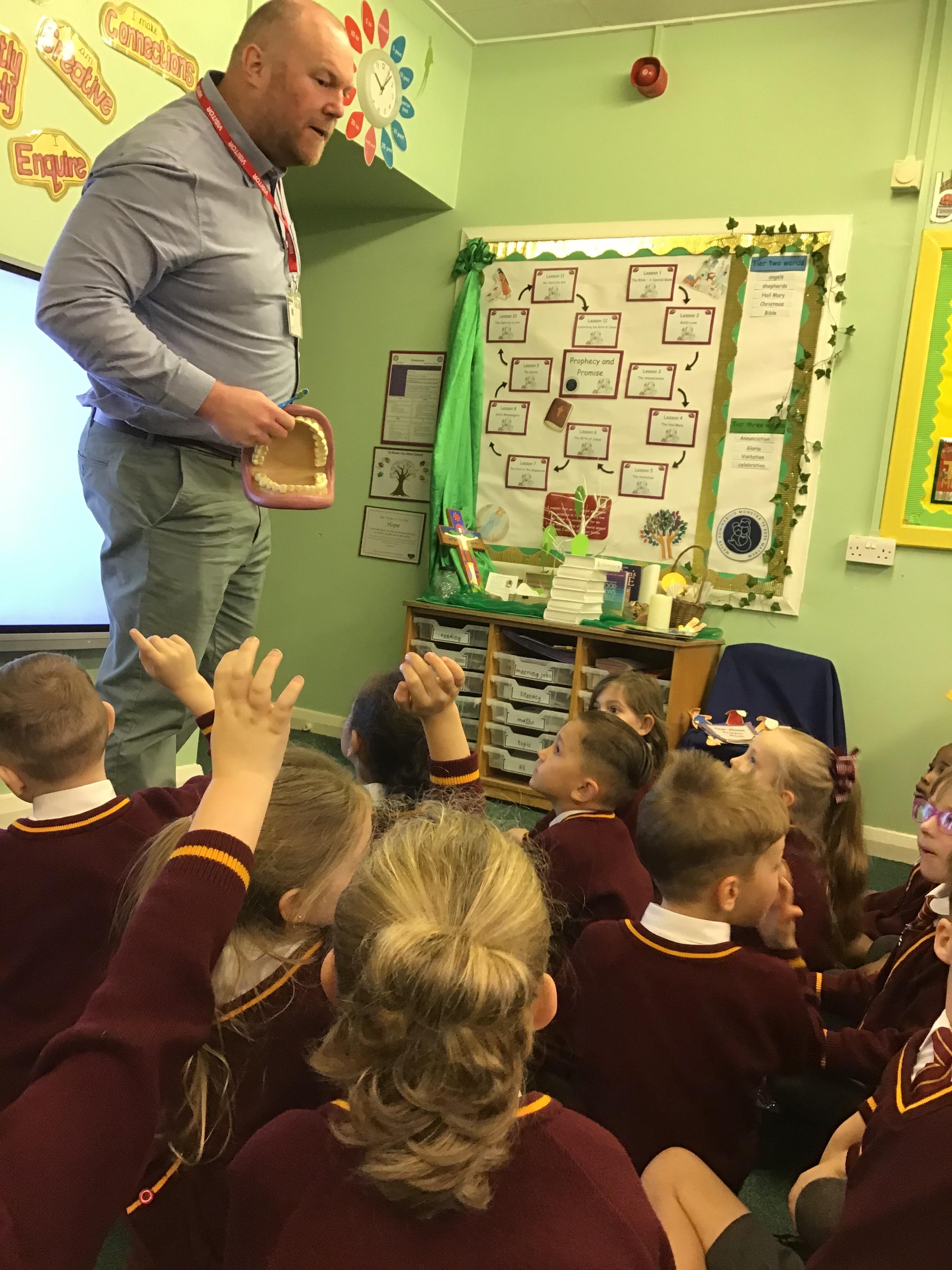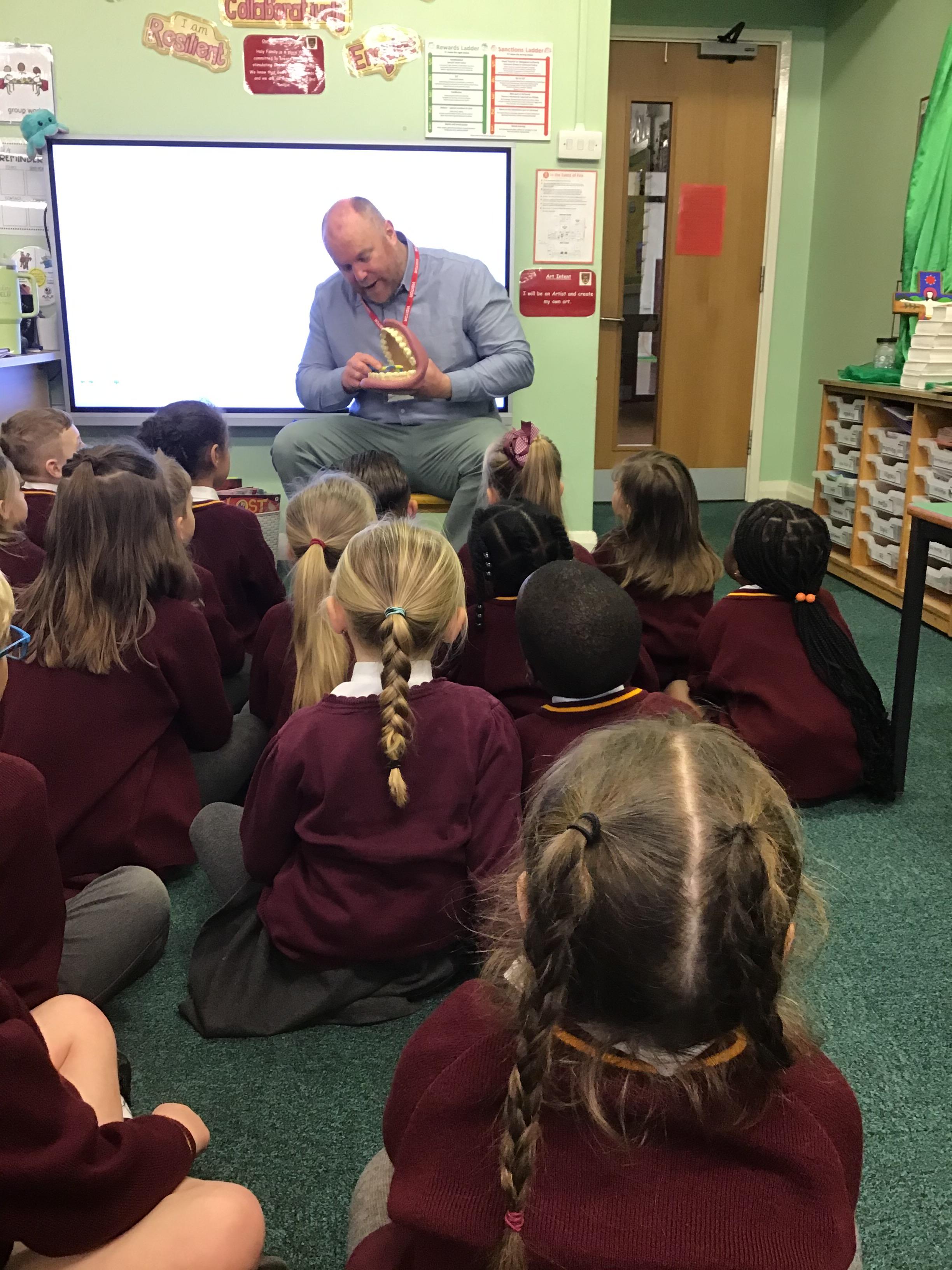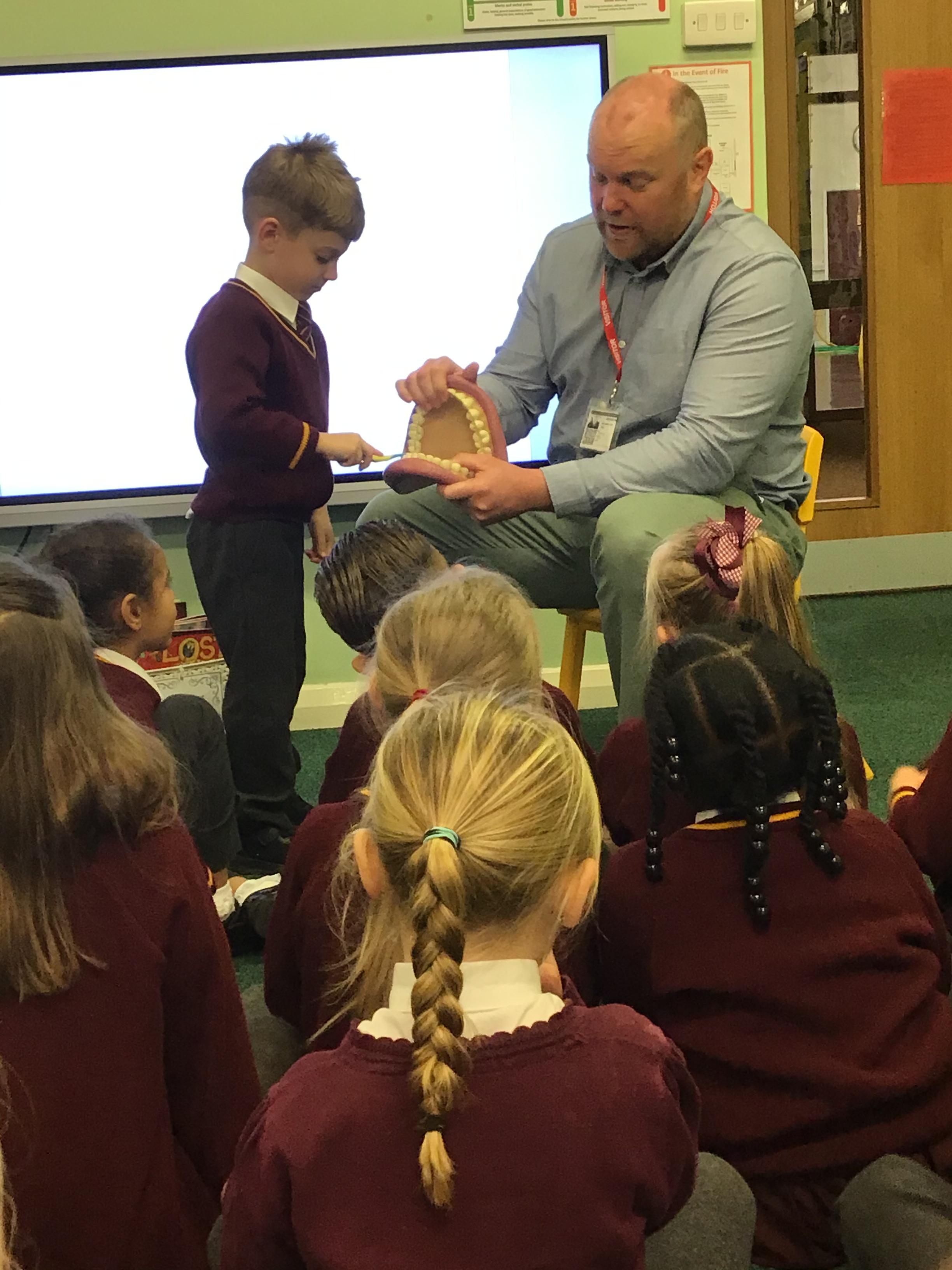 The children were excited to welcome Thomas Gibbs, a teacher from Dentaid, the dental charity. The charity works to improve oral health and delivers the BrightBites oral health education programme. The children learnt about the names and functions of teeth, healthy eating, good tooth brushing techniques and the importance of regularly seeing a dentist. They even were given a toothbrush and tooth paste to take home.