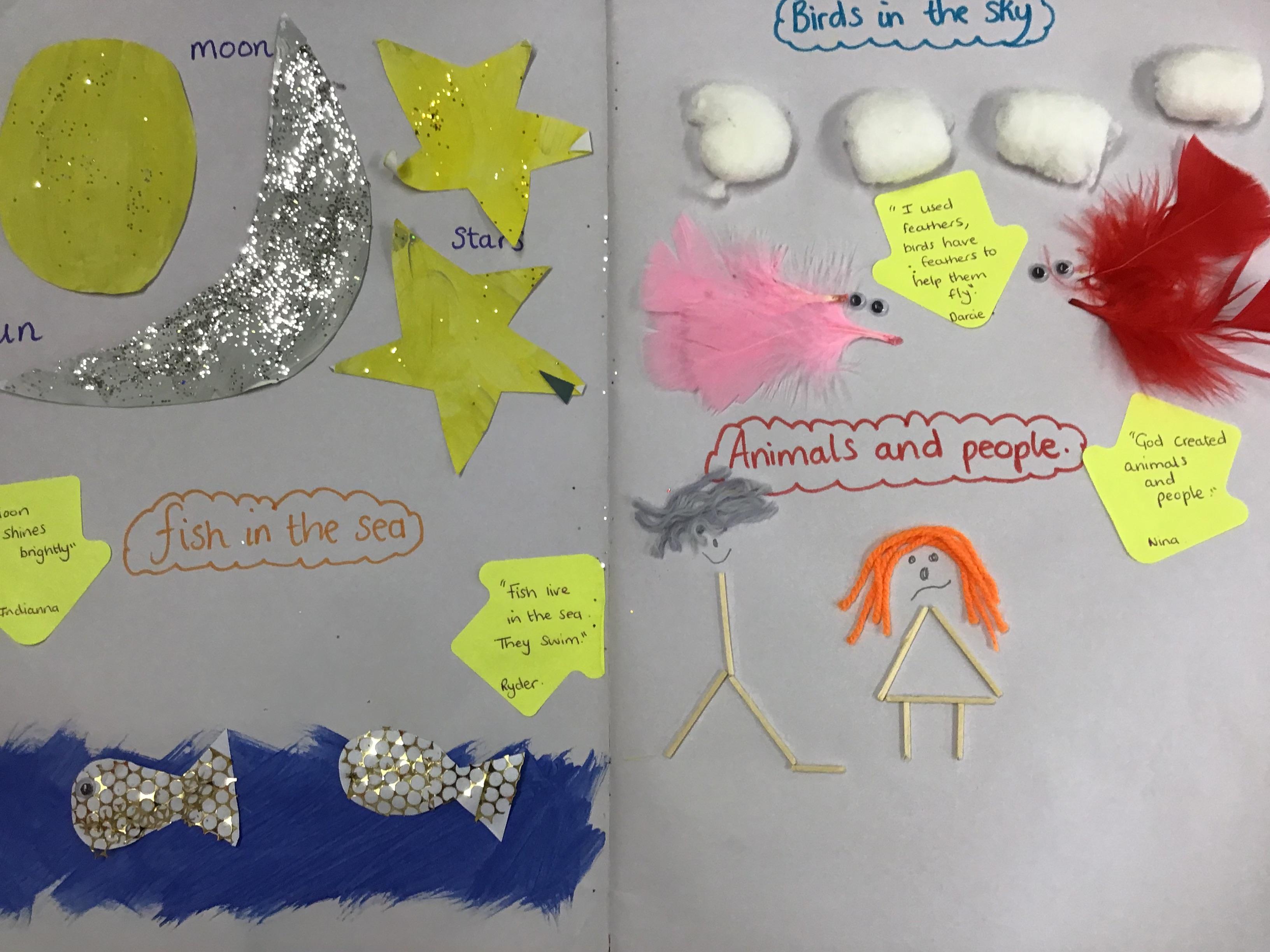 In RSE, FS2 children have been introduced to the story of creation, where God created the earth, sea, stars, planets animals and humans. The five-story sessions encouraged children to creatively explore this topic and help them to deeply know that they are created by God out of love and for love. The children really enjoyed using their creative talents to create all things on our amazing earth that God created.