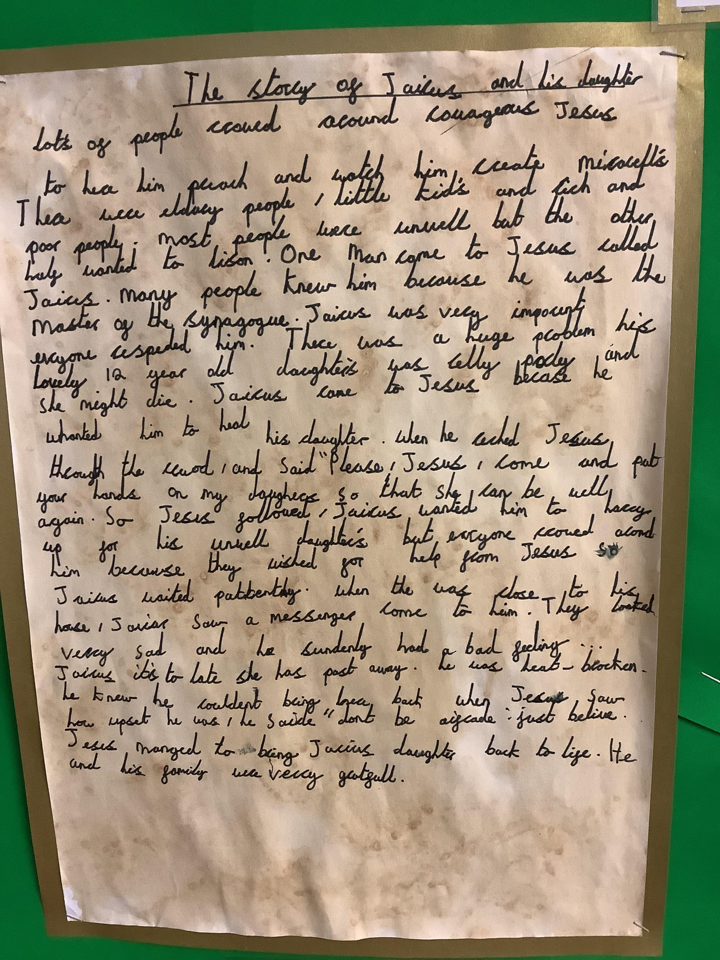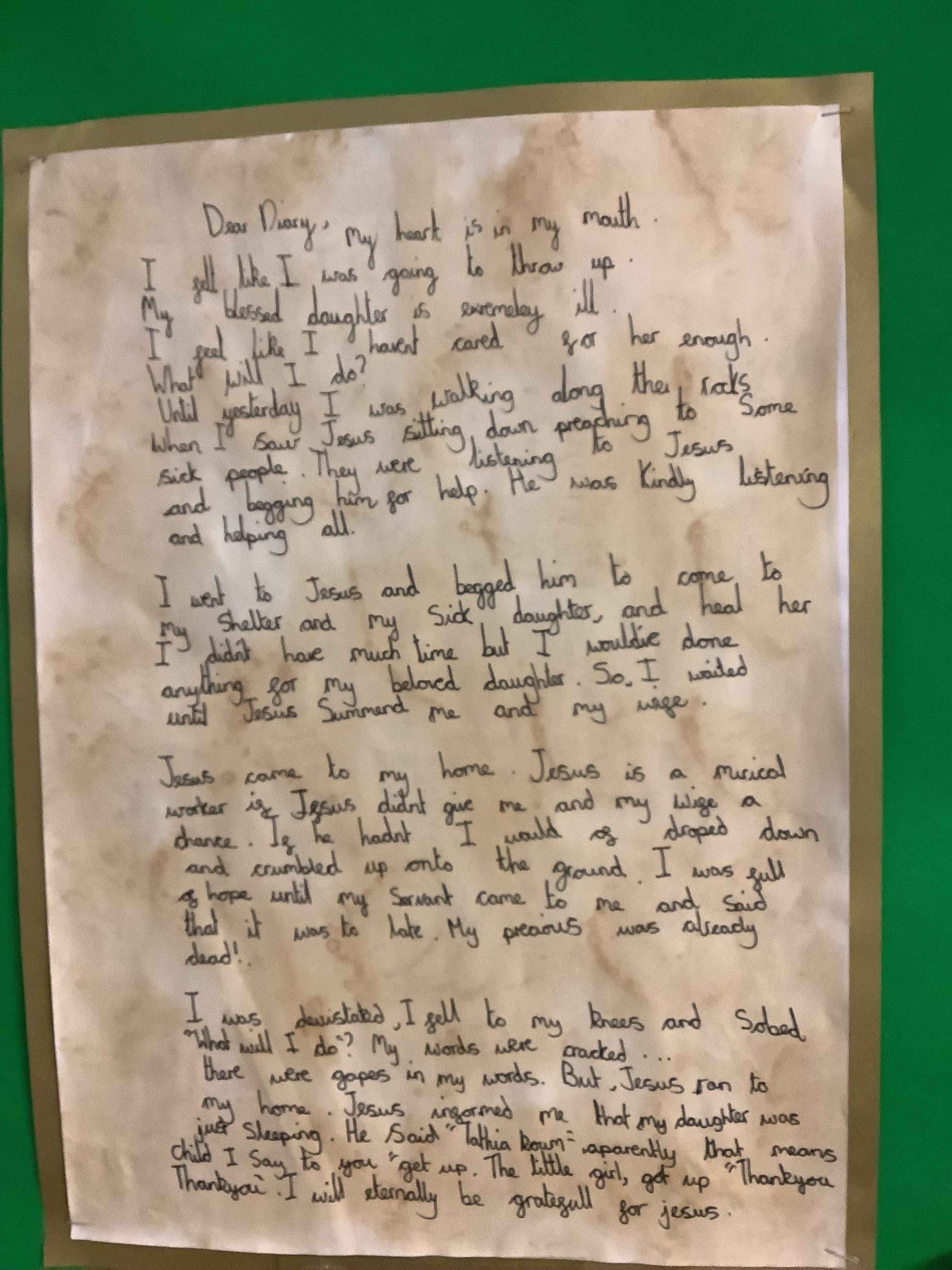 Children in Year four have explored the story of Jesus healing Jairus' daughter and how He gives us life. The children have enjoyed writing a diary entry from Jairus' viewpoint, retelling the story and writing prayers of thanks for the lives we lead.