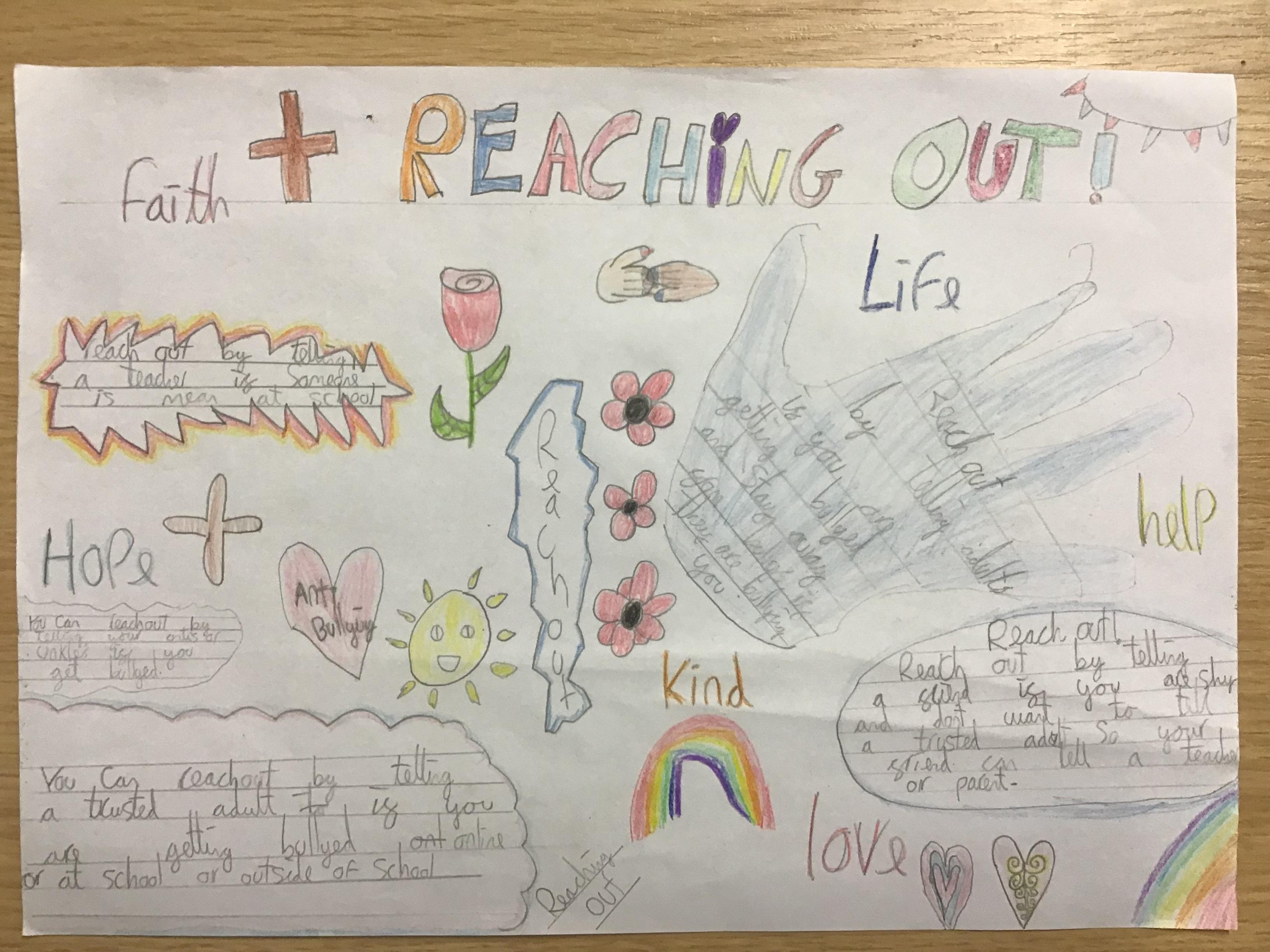 Year 5 discussed the theme, Reach Out and created posters to place around school to encourage children to reach out and tell others about bullying.