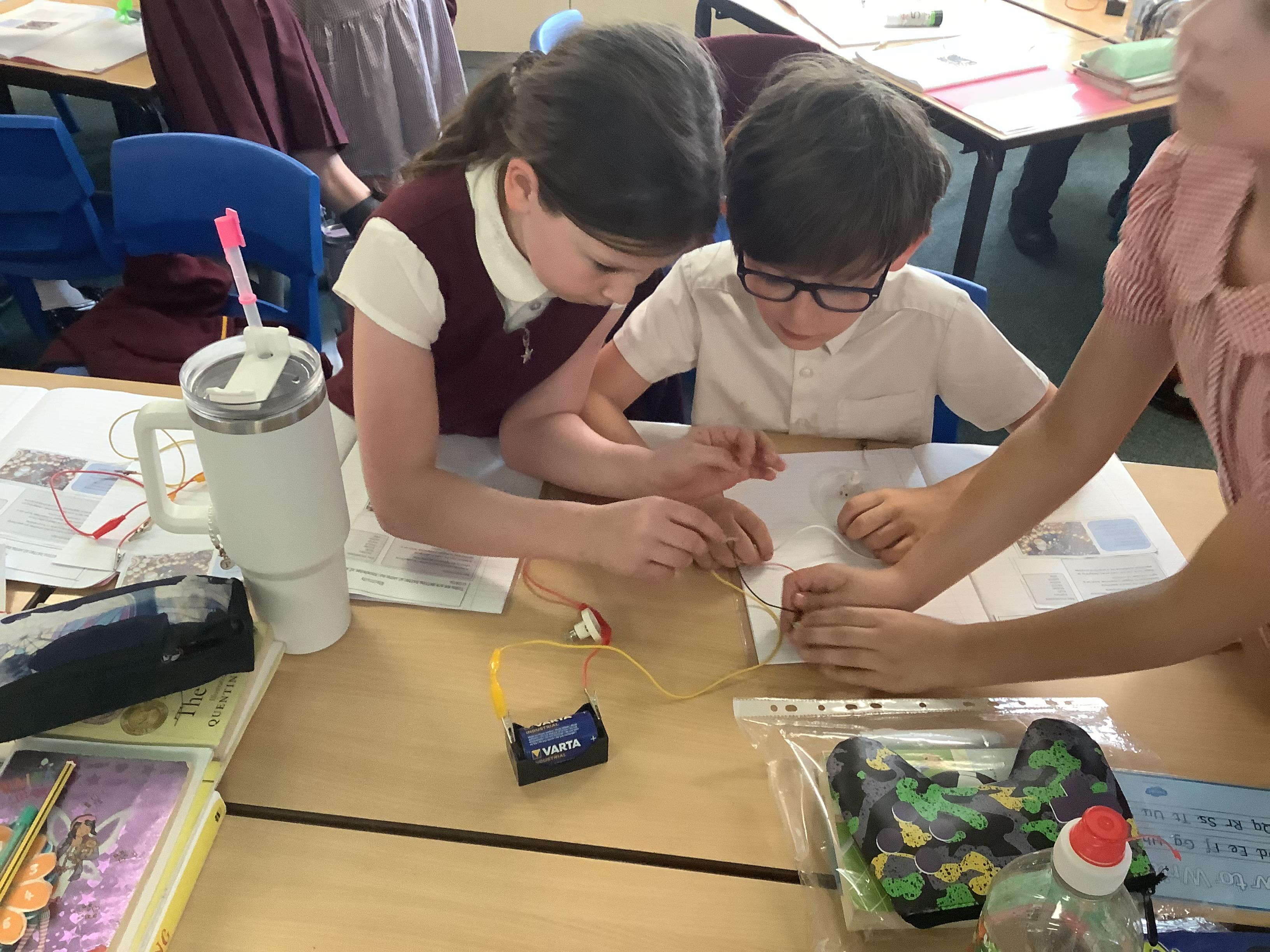 In science, Year 4 have names electrical components and created their own circuits. They worked with a partner to investigate how to make a bulb light up and what can change the brightness of a bulb.