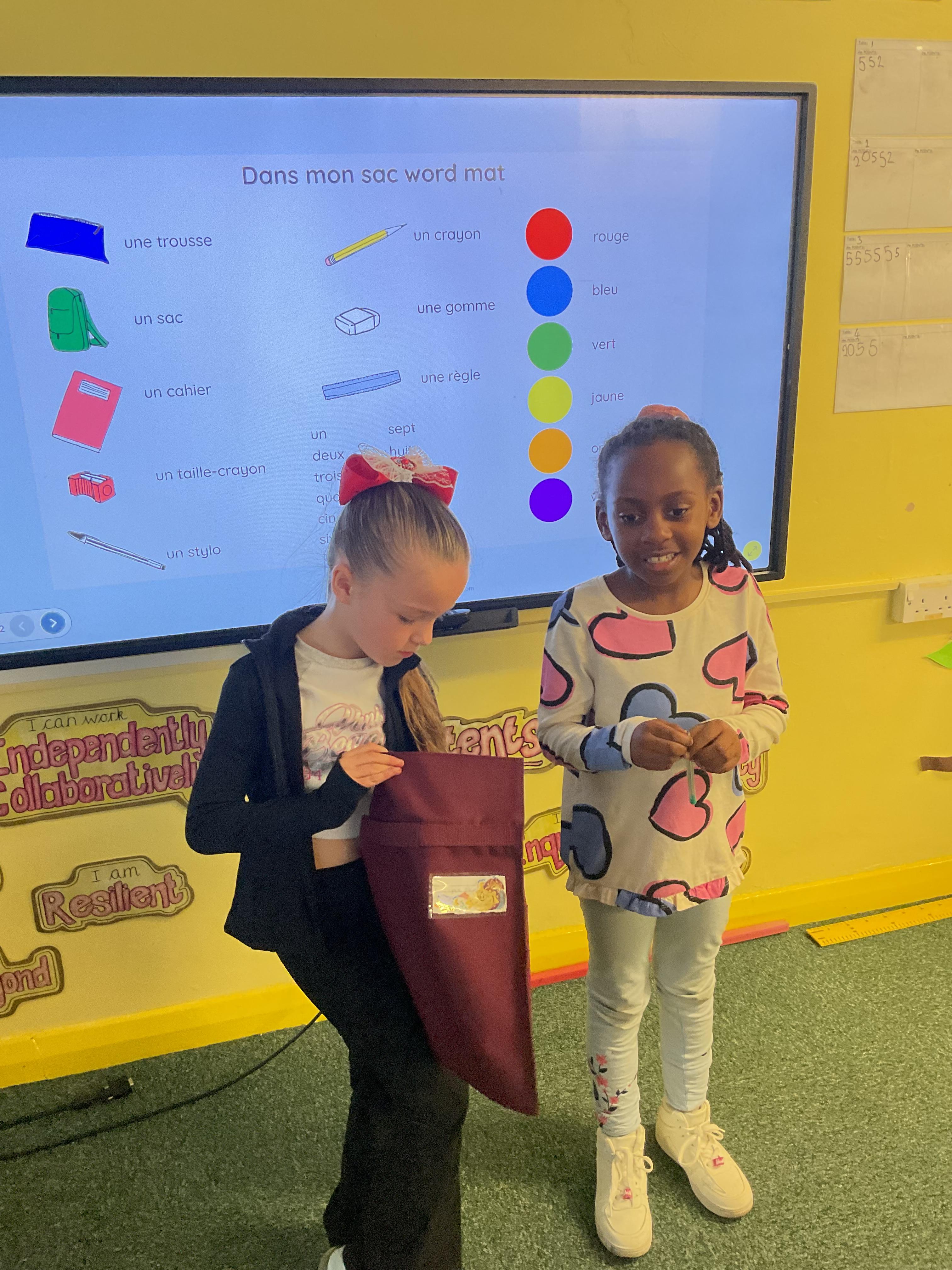 In this lesson, the children have been practicing the question Ë‹Tu as un/une….? and answering it in French. They have enjoyed asking and answering questions about school bag items.