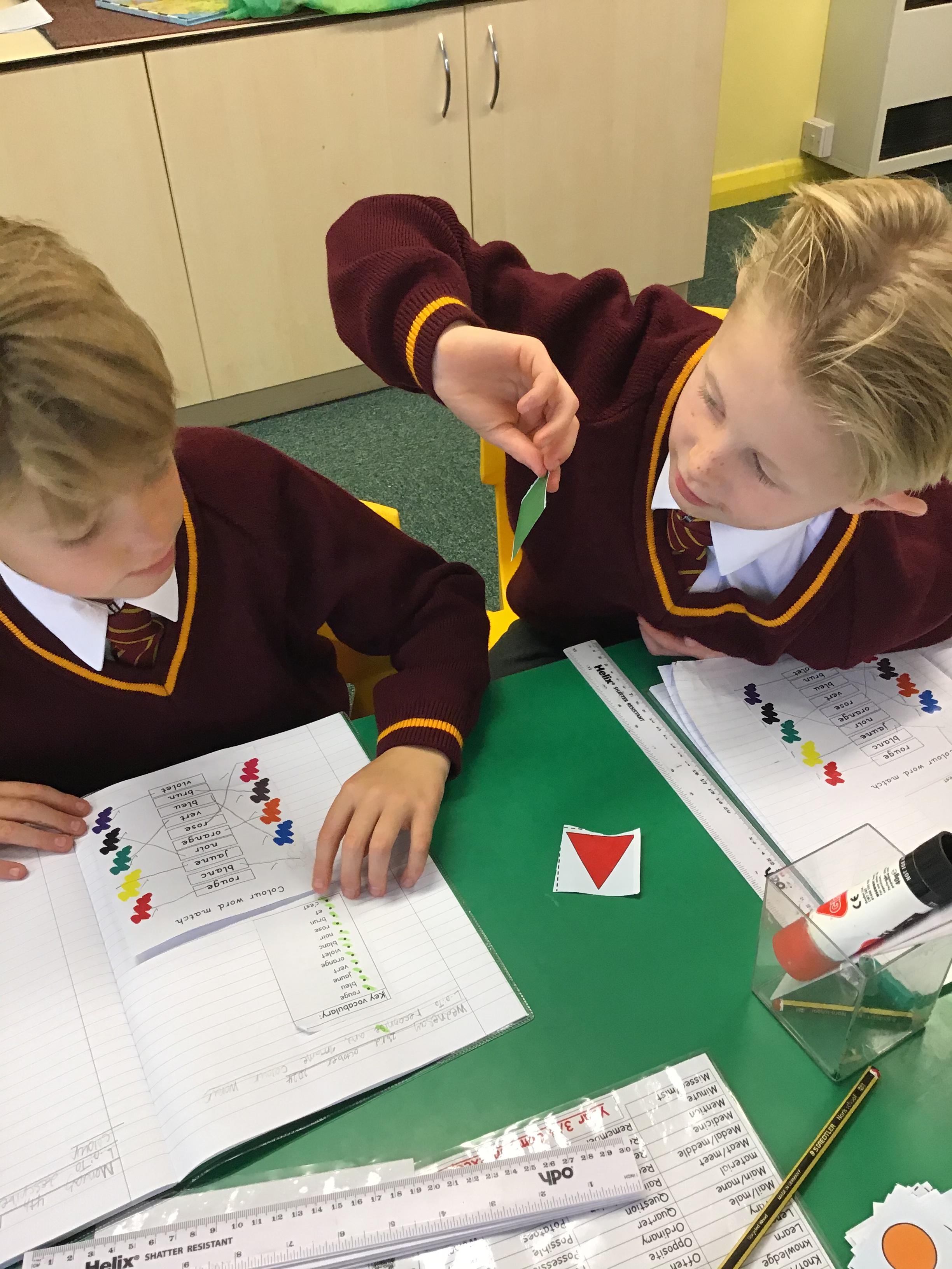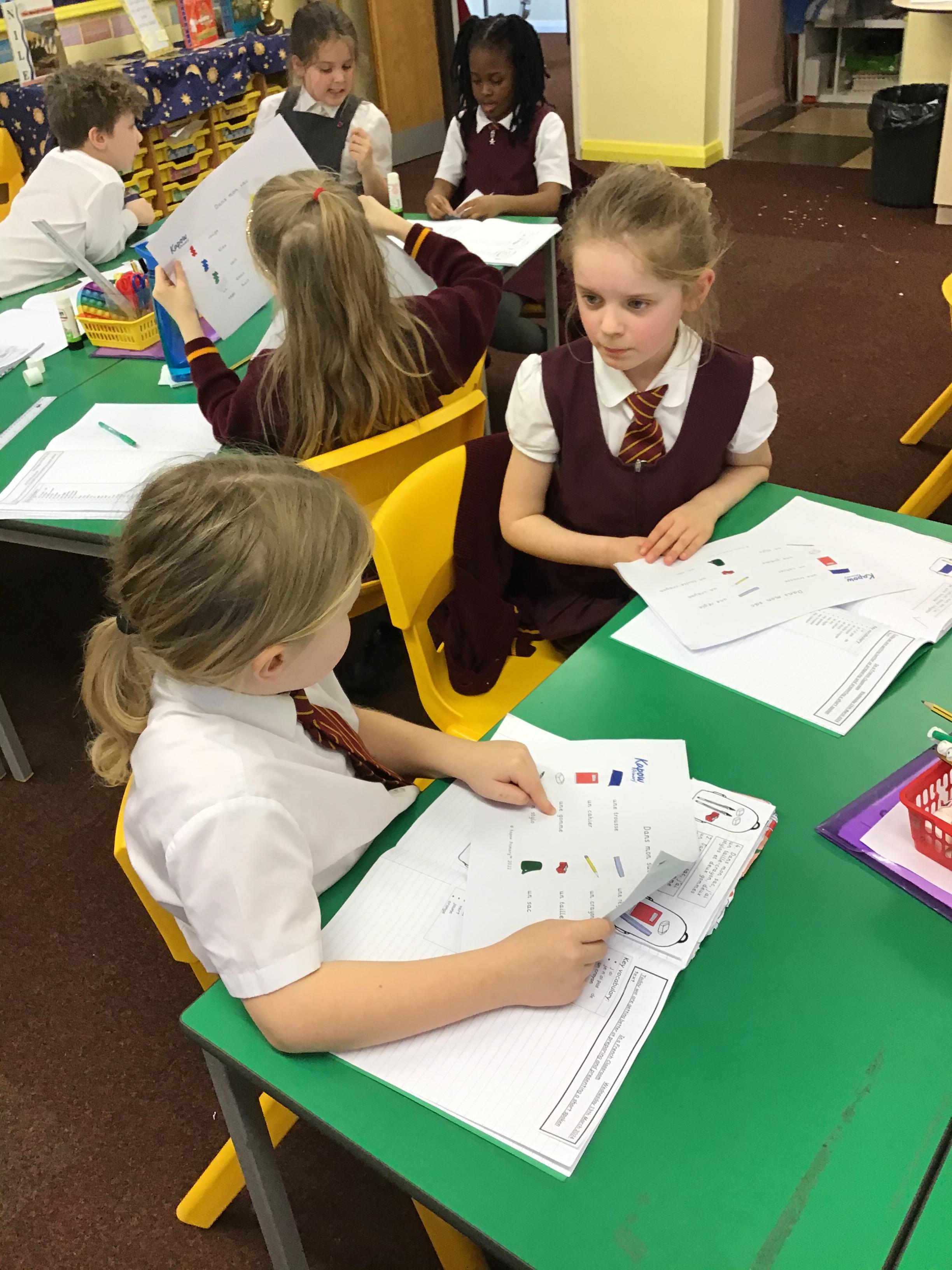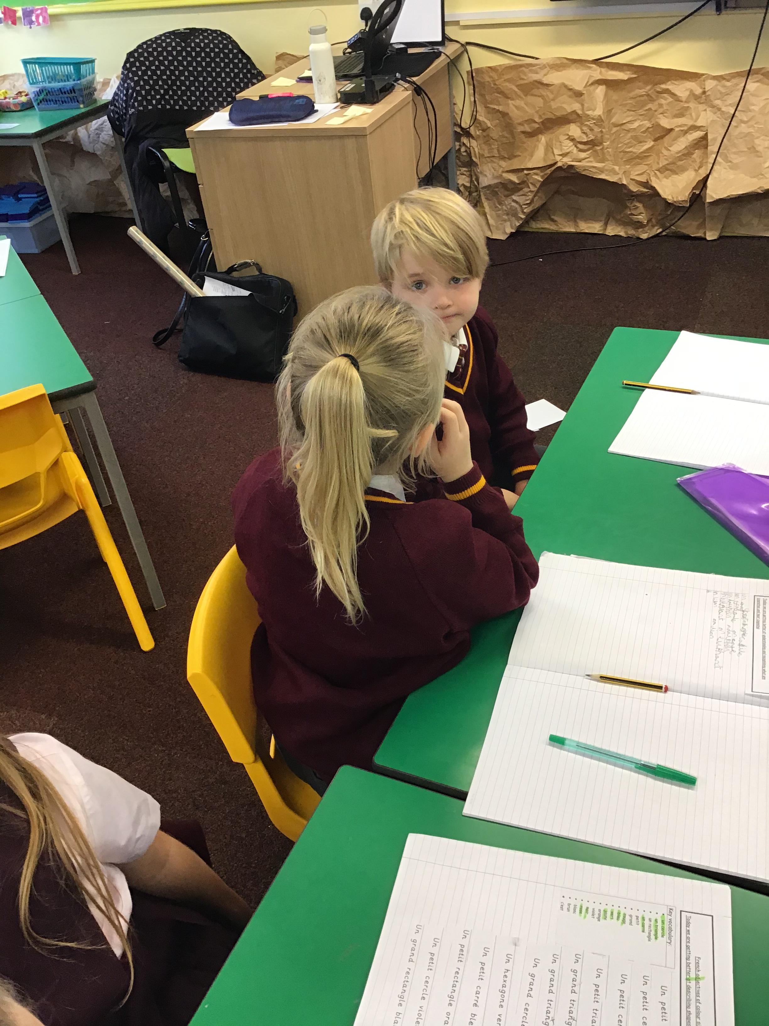 The children were able to recognise what cognates are, and near cognates. They were able to give instructions in French, using size, shape and colour. They asked politely and said ‘thank you’ in French.