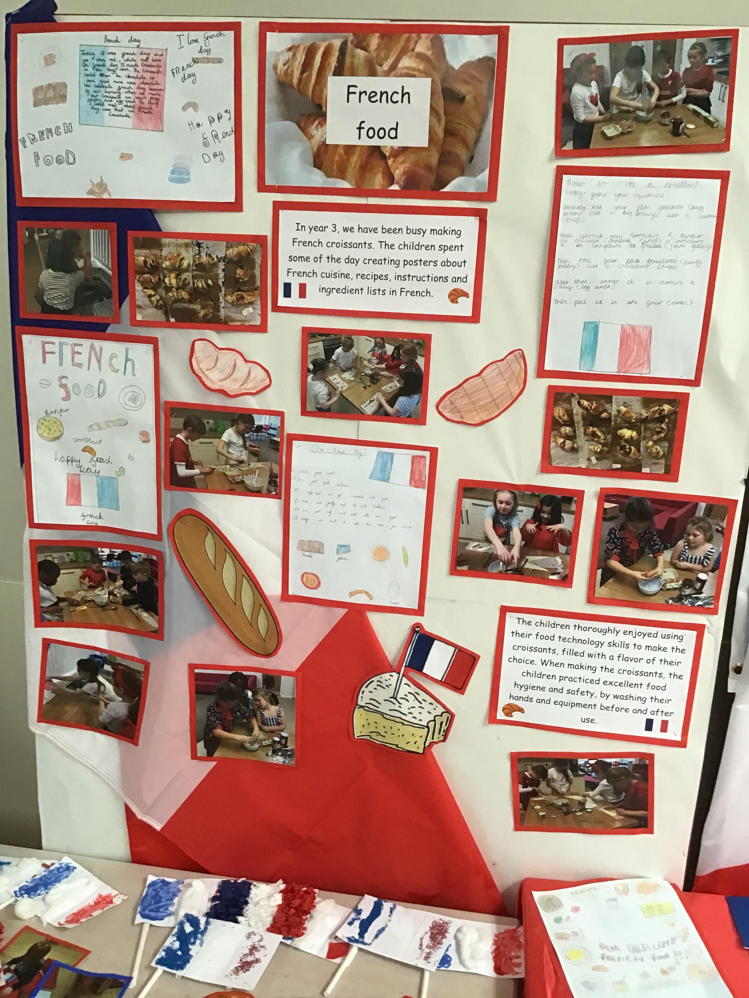 In year 3, we have been cooking and learning more about french foods. The children enjoyed creating croissants and choosing their filling. After this they used egg wash to glaze and rolled the pastry into a shell. Children were cautious when using equipment and maintaining hygiene. The children have been busy creating a French ingredients list along with instructions, and French food posters.
