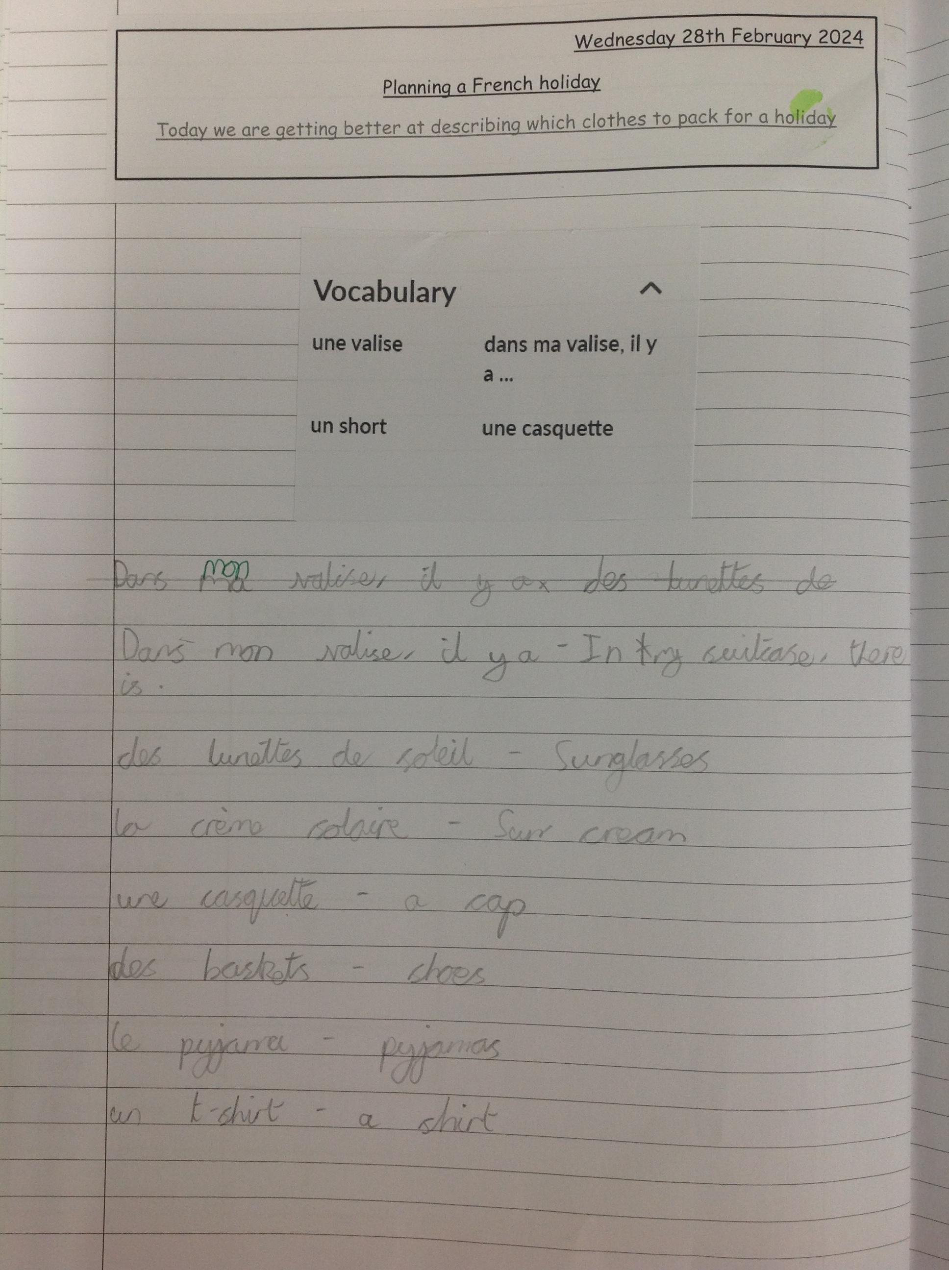 Year 6 were able to plan their French holiday including using the future tense, describe what will be in their suitcase, read a simple story and plan a holiday to France!