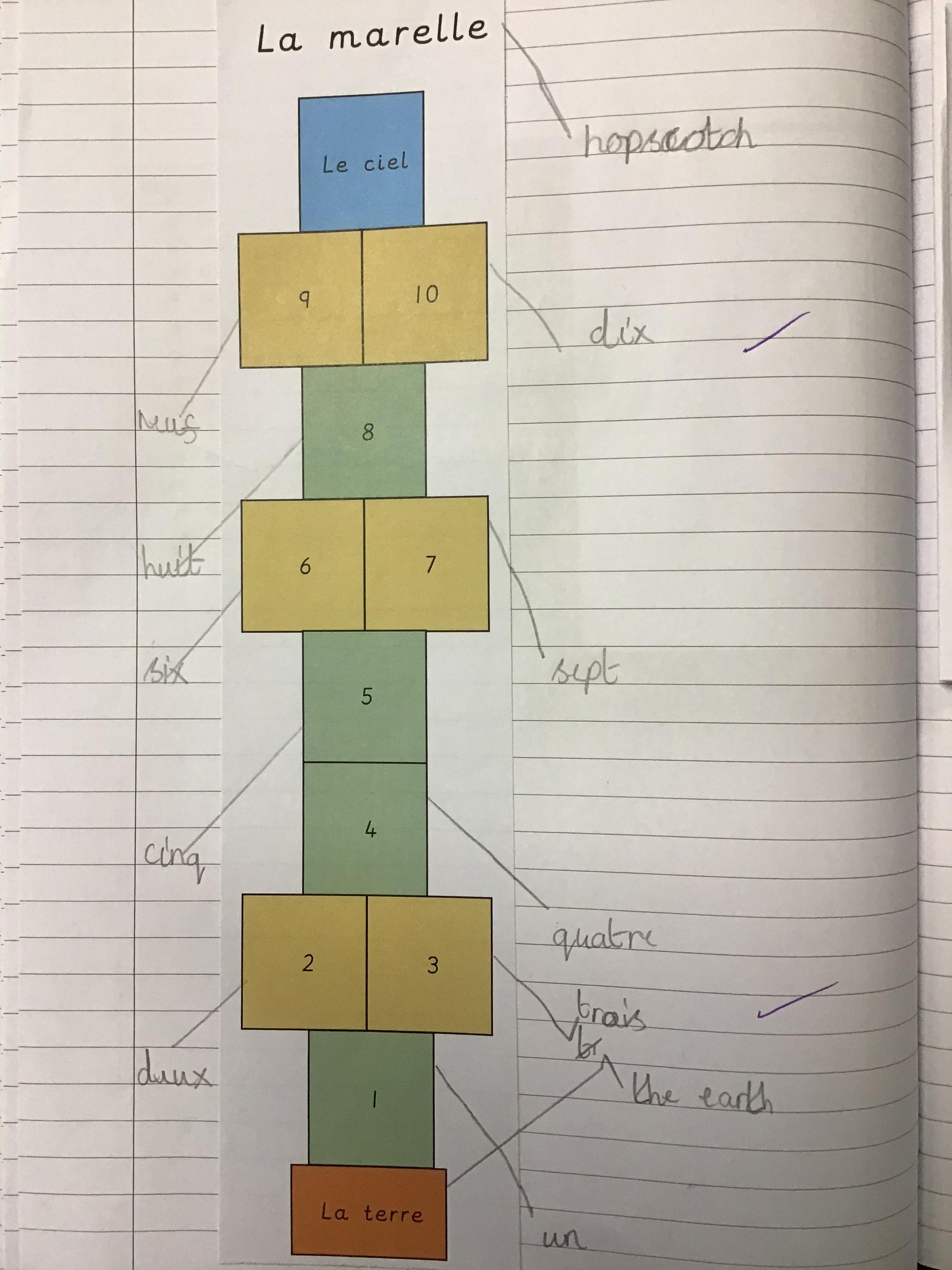 In this lesson, the children have been understanding how to use the words one to twelve in French, throughout playground games such as hopscotch.