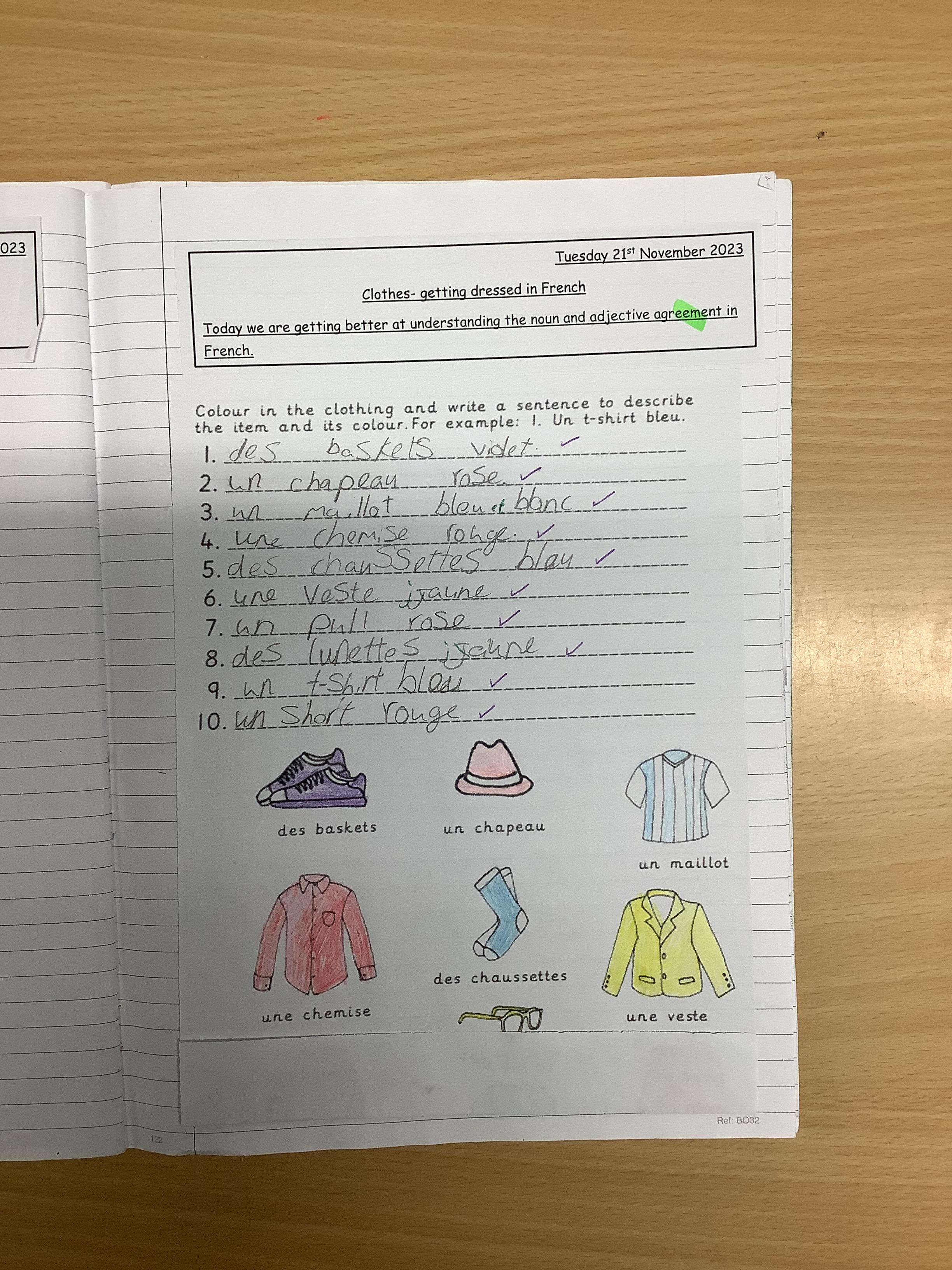 Year 4 have studied the names for different items of clothing in French. They have used these words in spoken and written French.