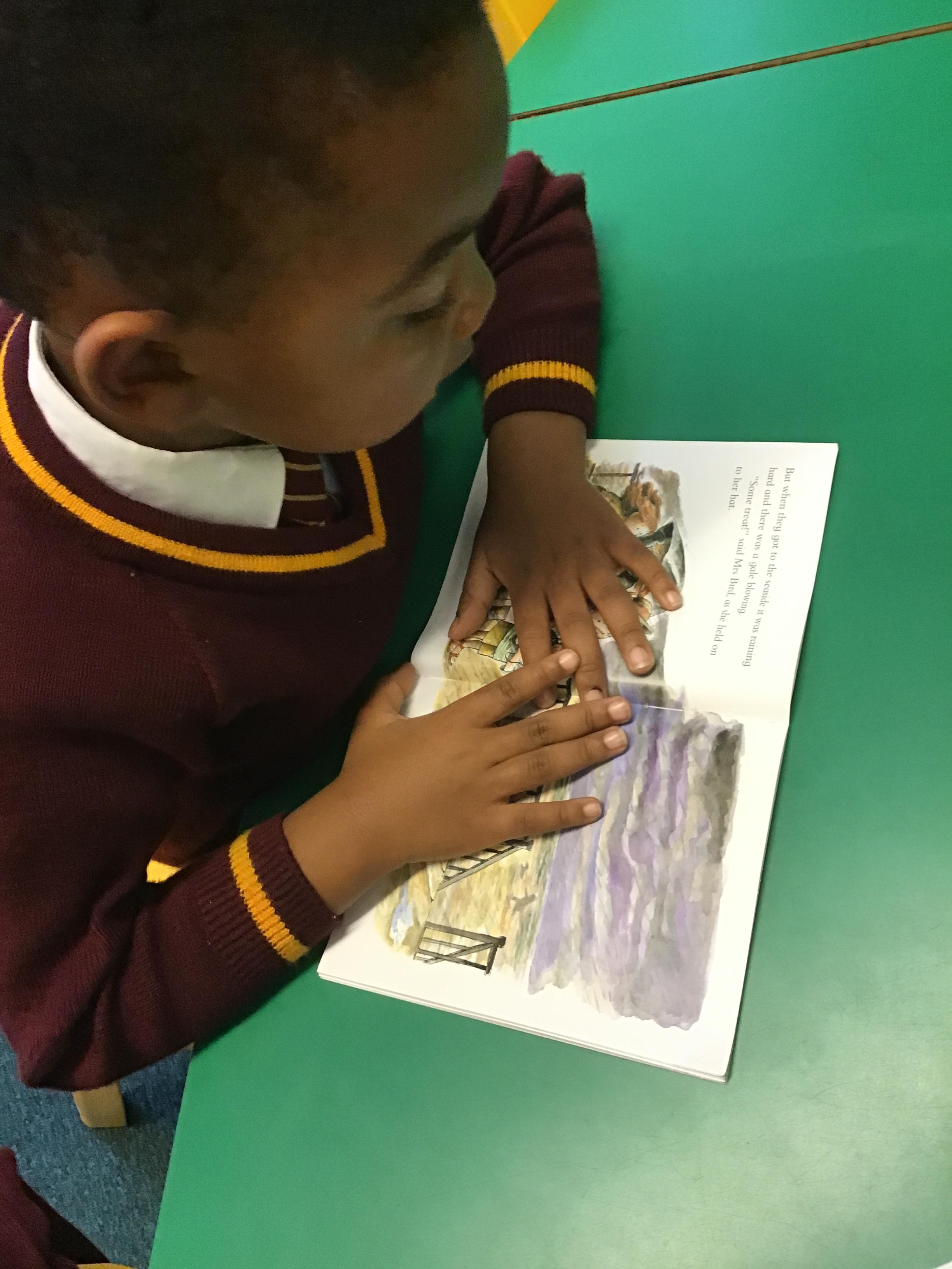 Nursery enjoy visiting the Reading Room every week. We have to go carefully up the stairs, making sure we hold on tight. Once we are up there, we explore the books and choose one to take home. We enjoy listening to a story whilst we are there.