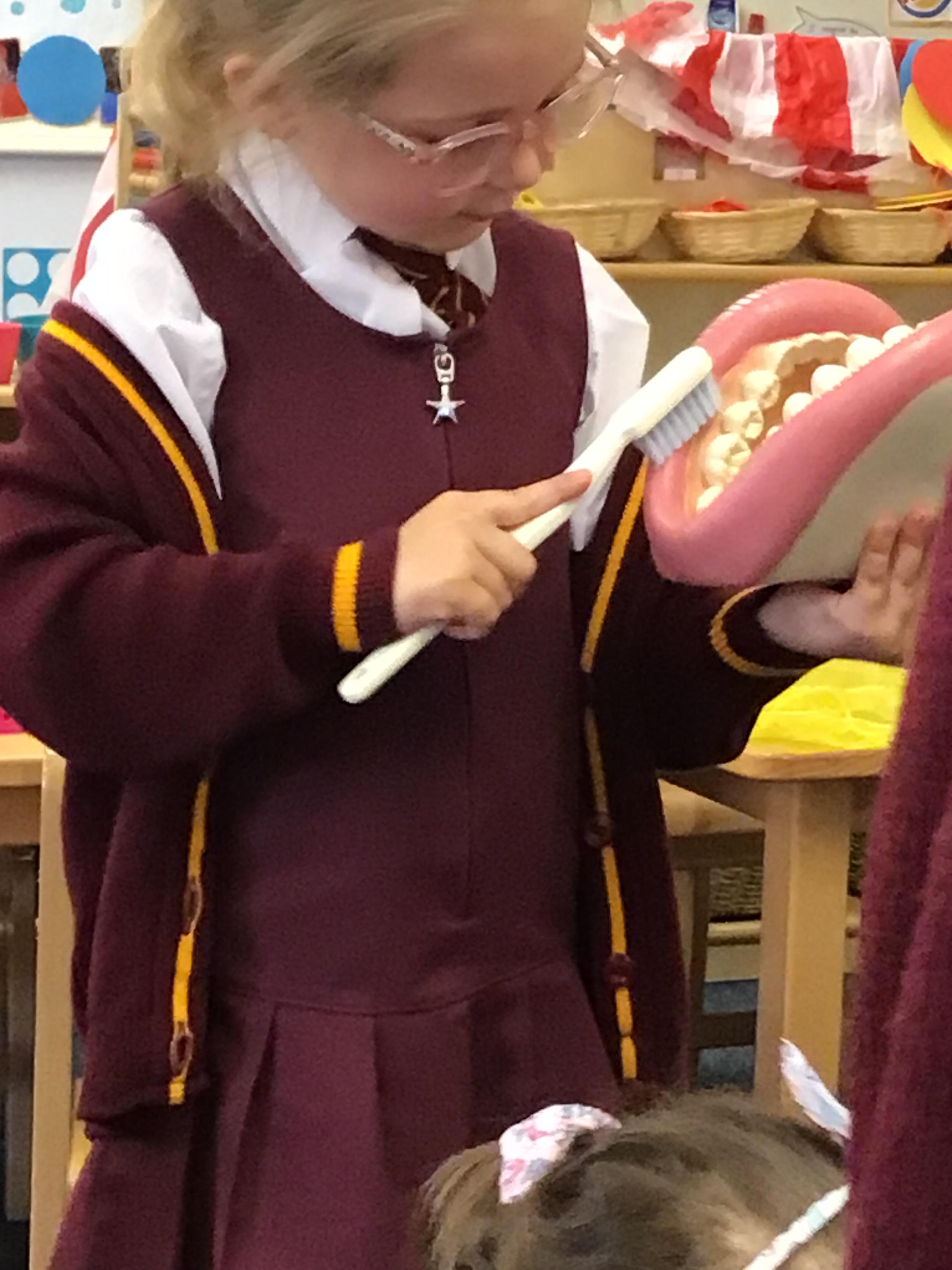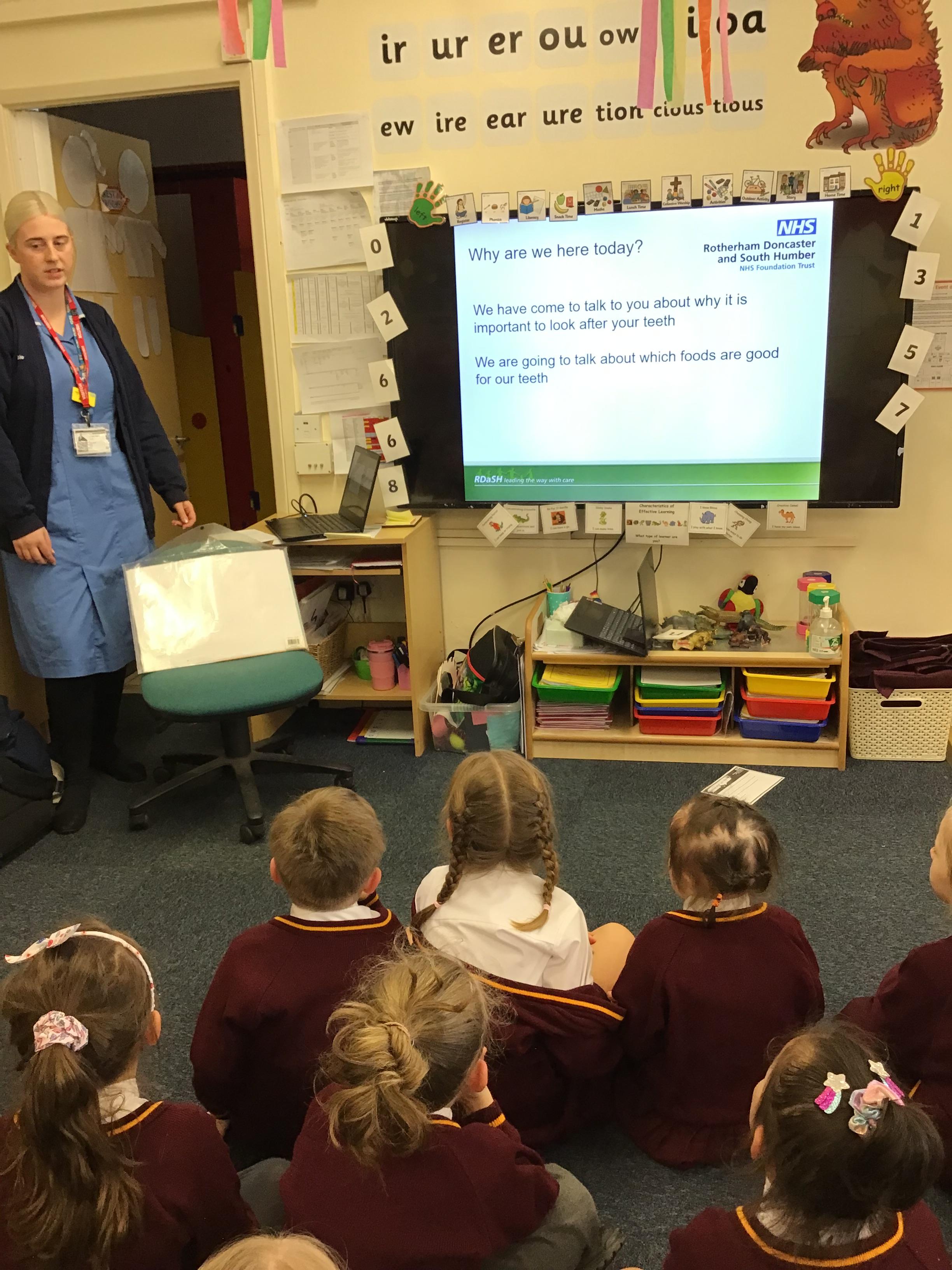 Reception had a visit from the dental nurse. They were reminded to brush their teeth twice a day and brush them for 2 minutes. They were also reminded about all the good food and drink that help to look after our teeth and all the bad foods that give us cavities.
