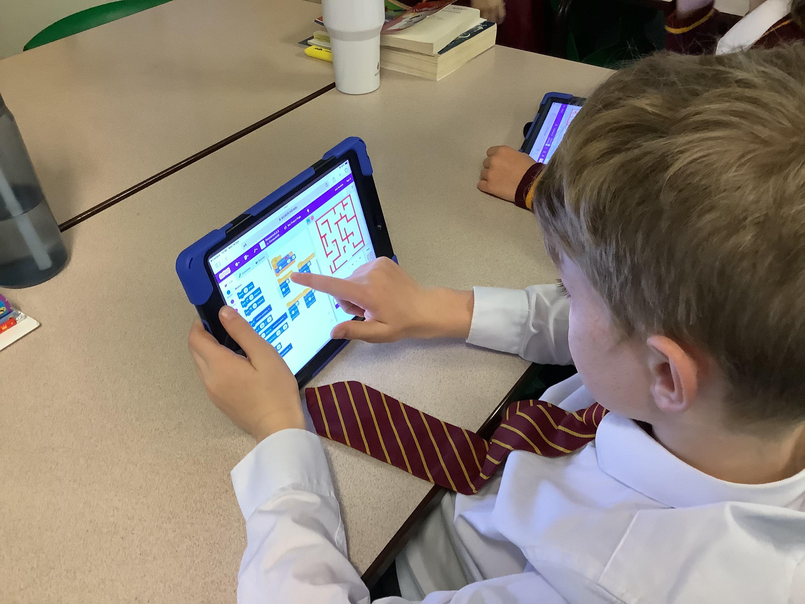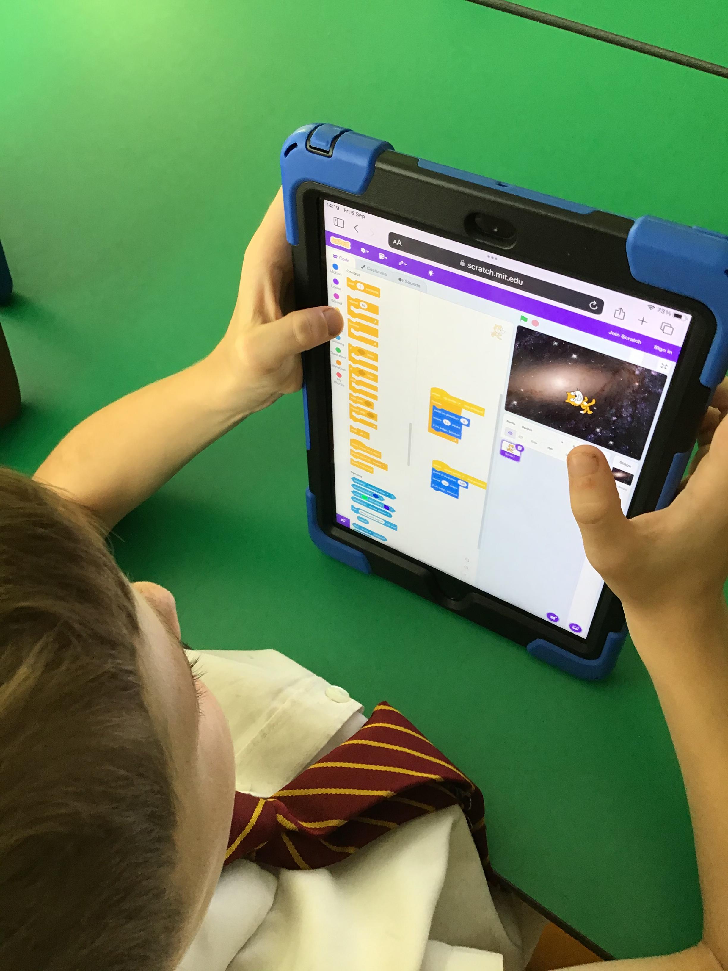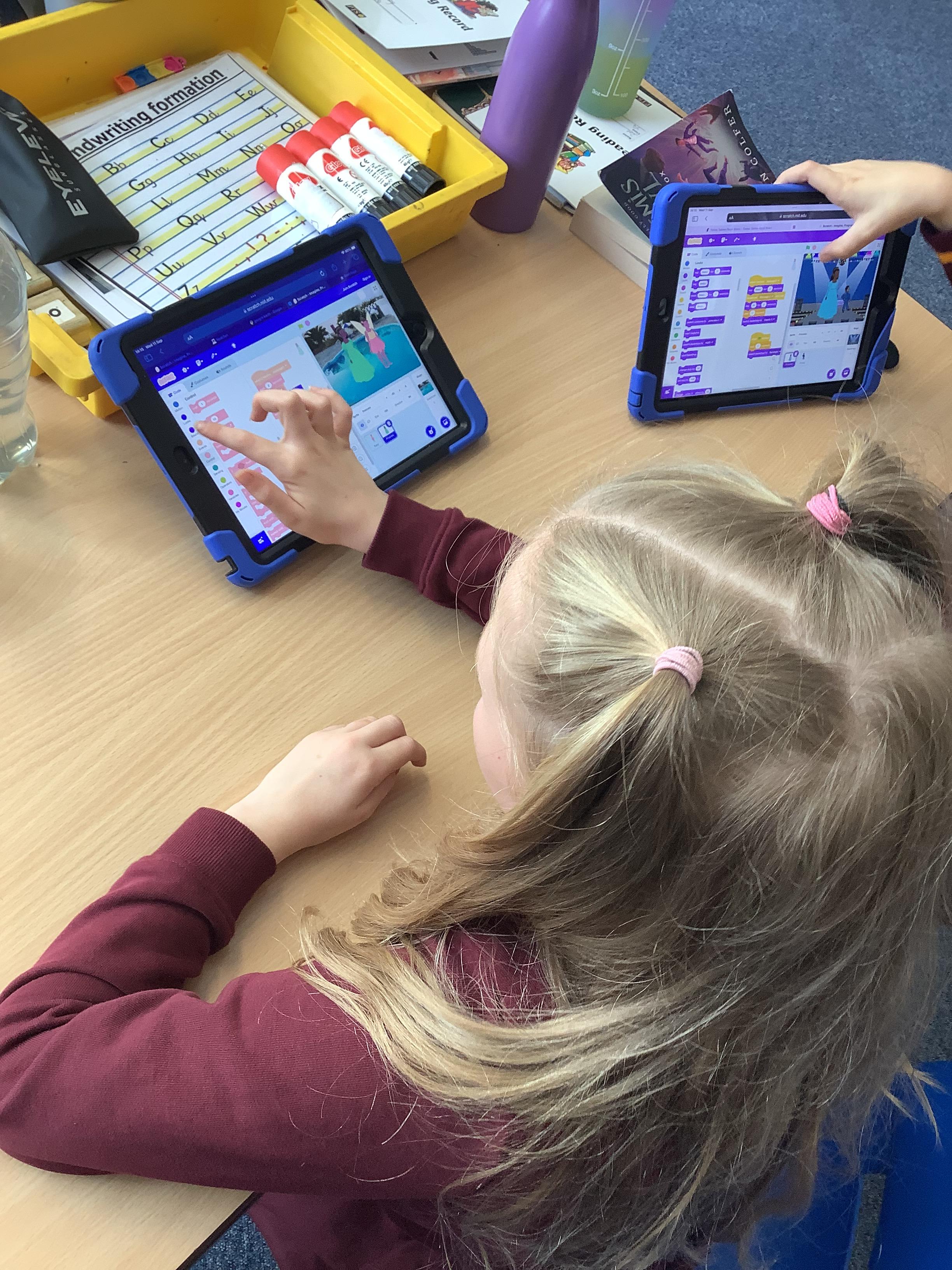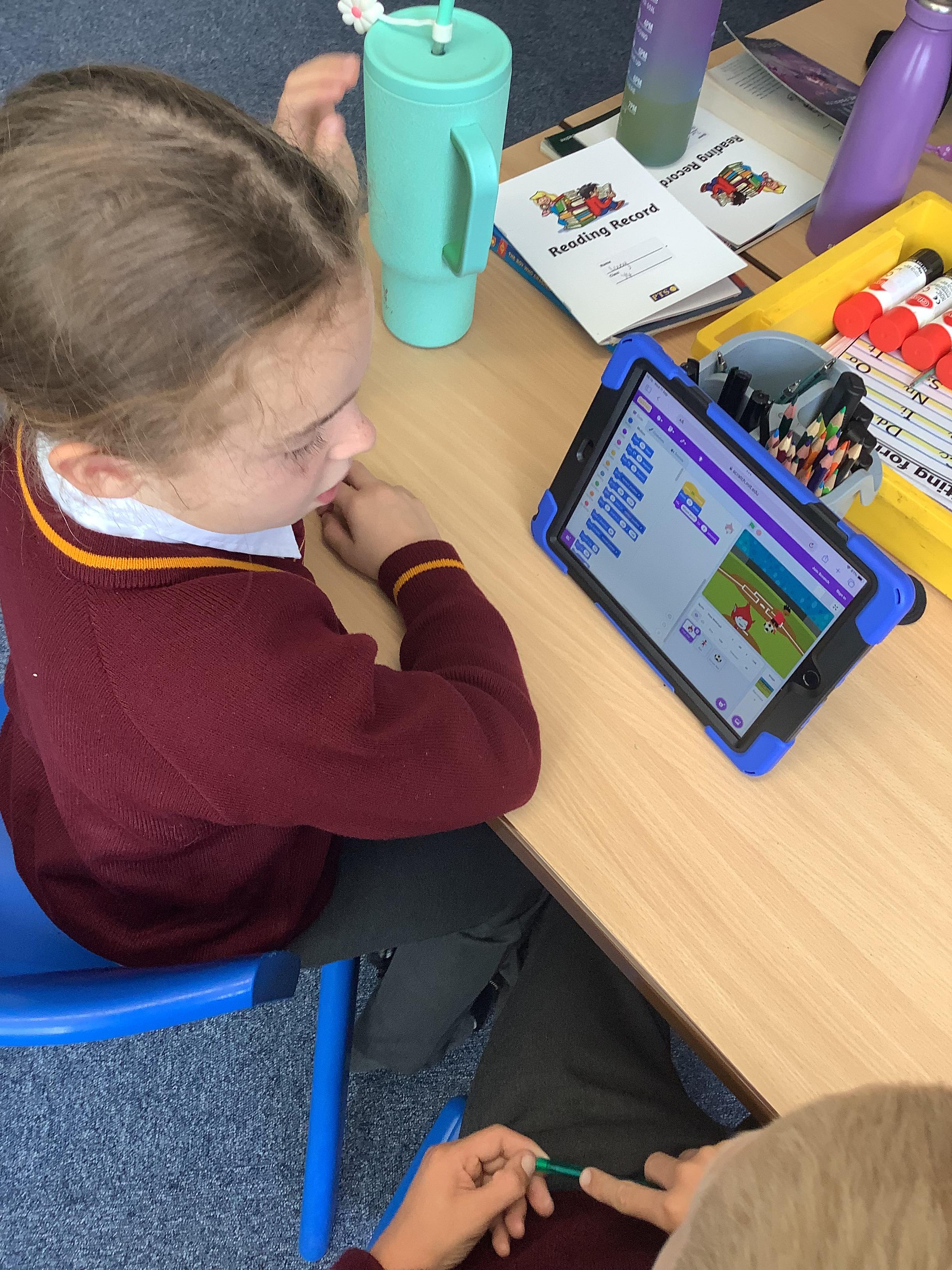 Year 4 used ipads to understand that broadcasts can be used to change scenes in Scratch.