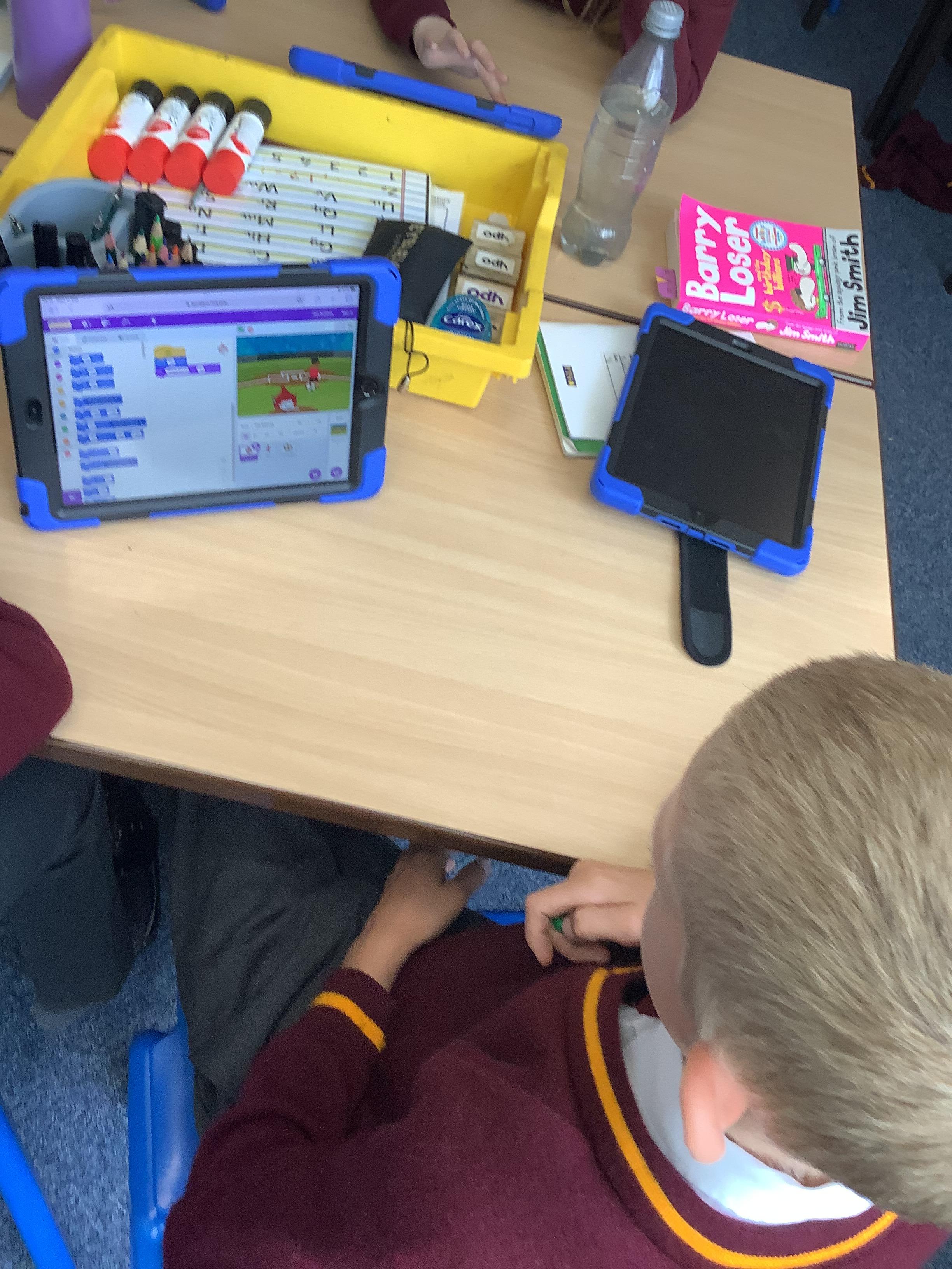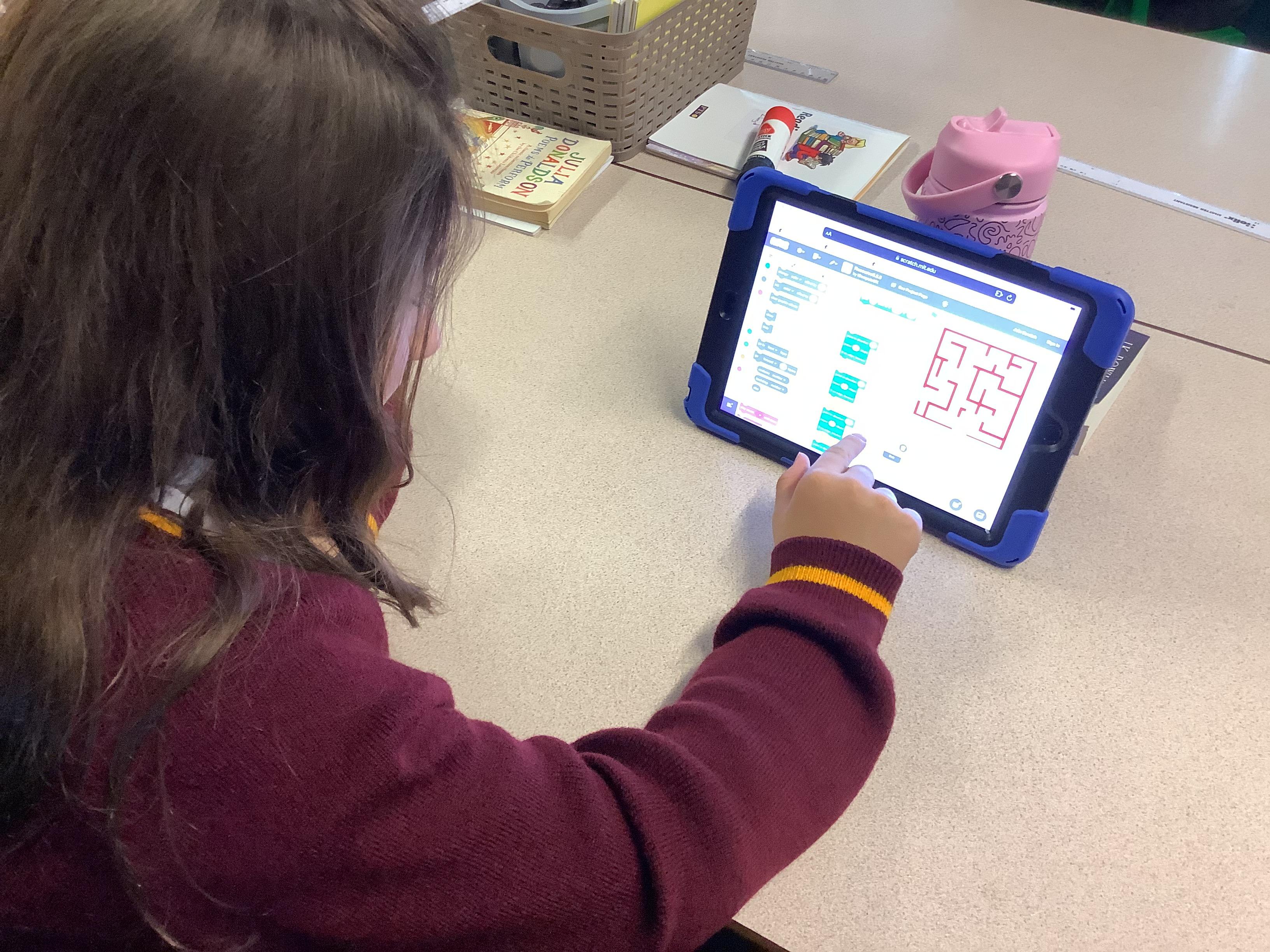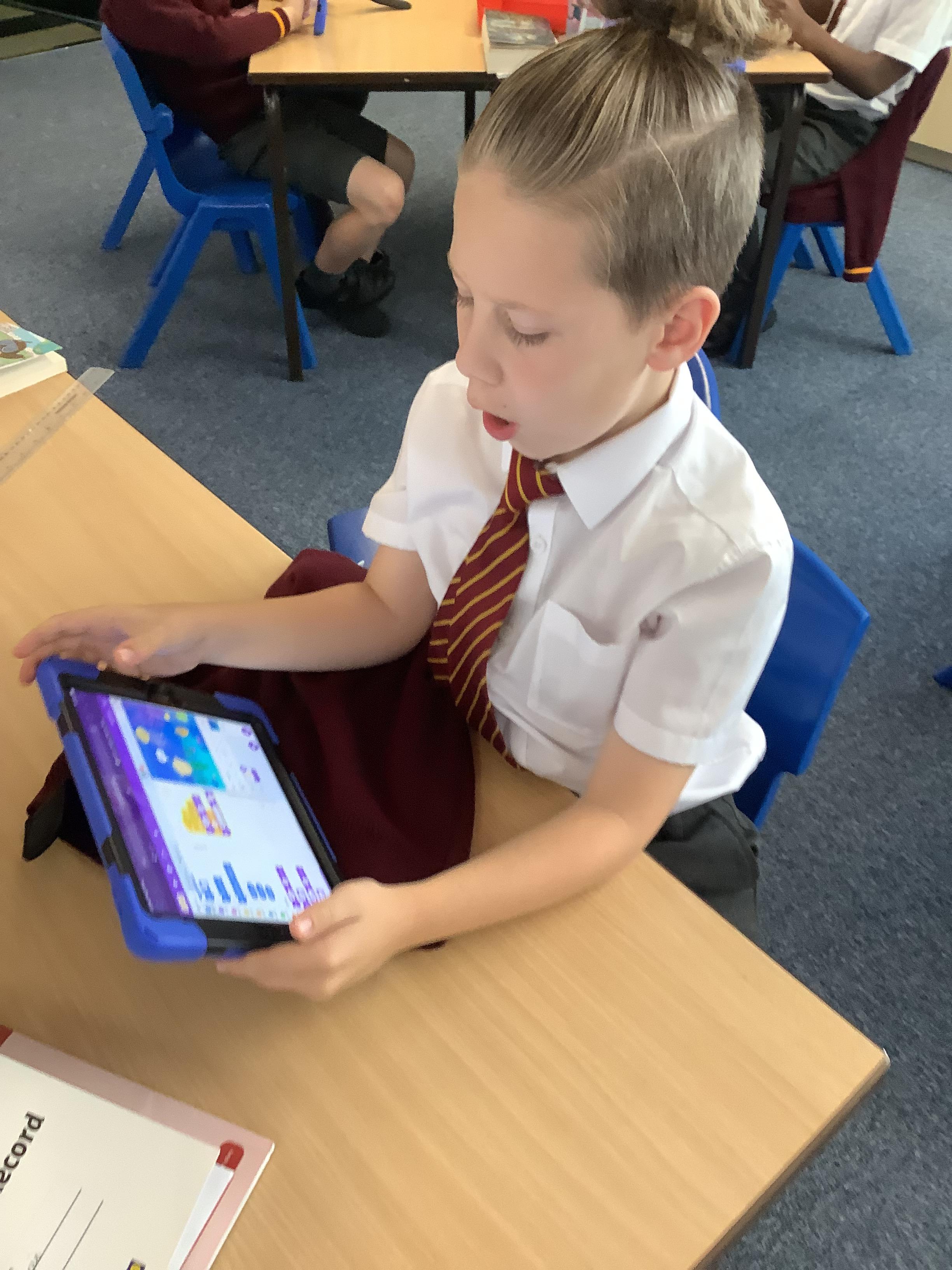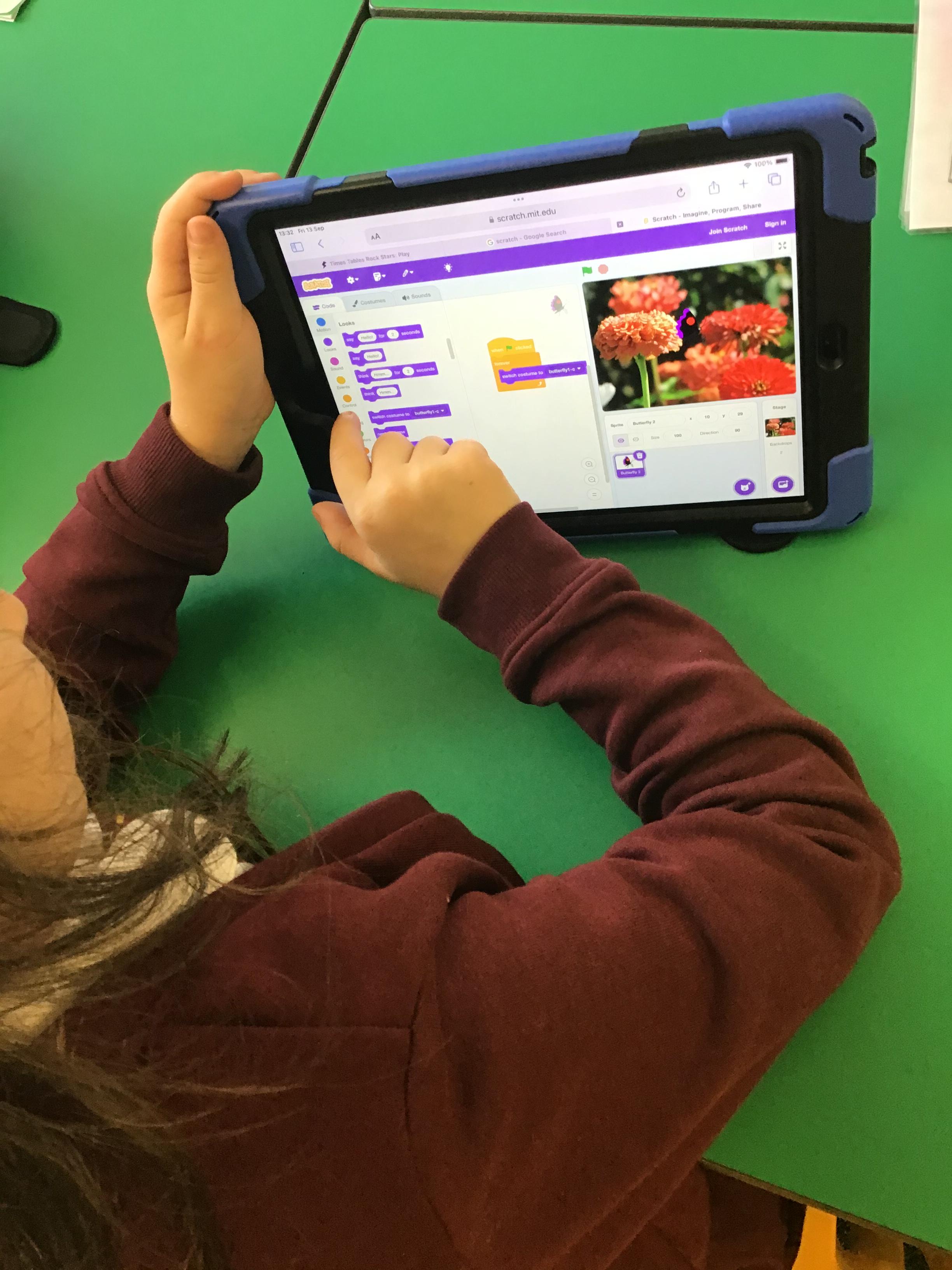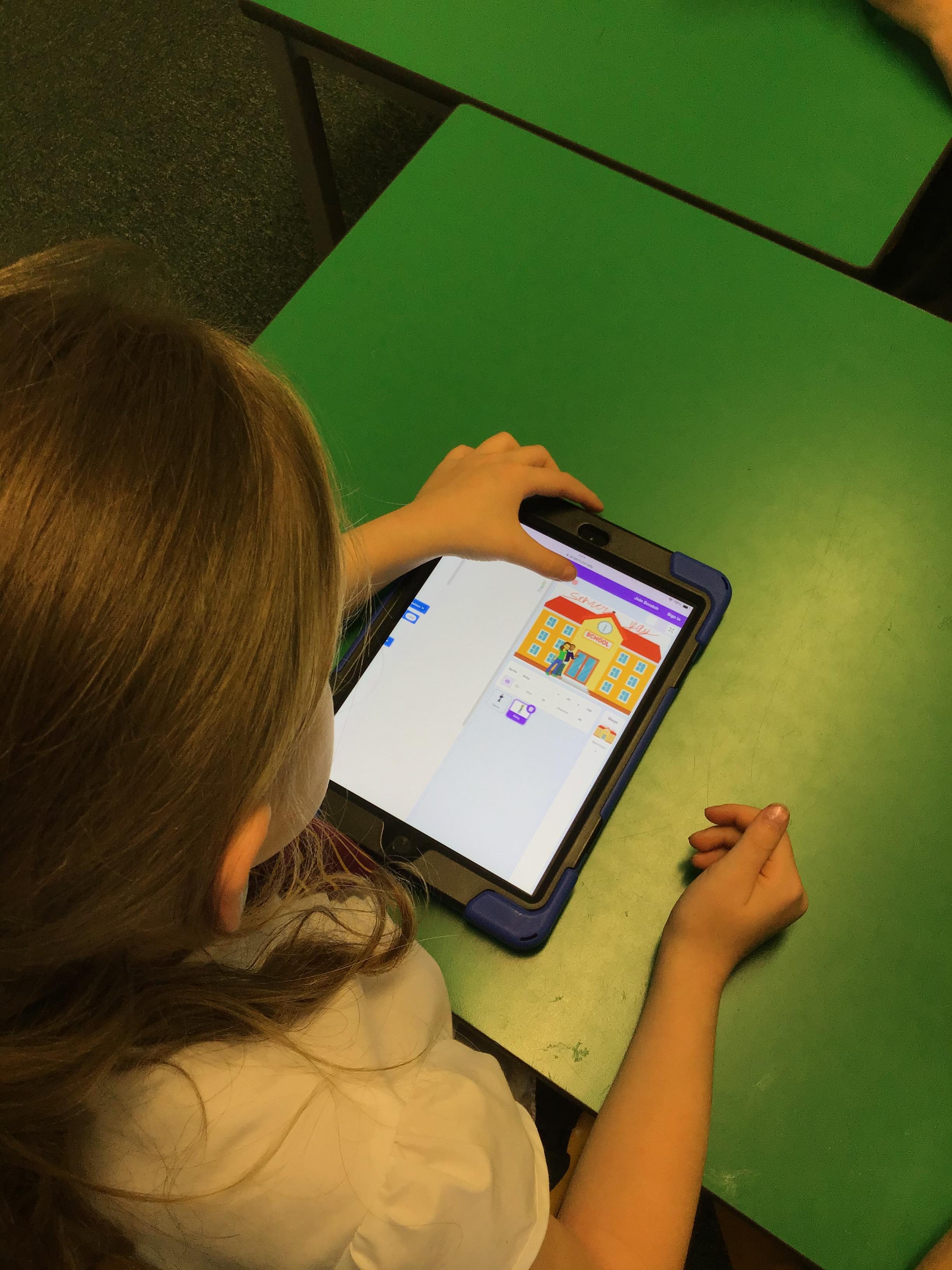 Year 4 used ipads to understand that broadcasts can be used to change scenes in Scratch.