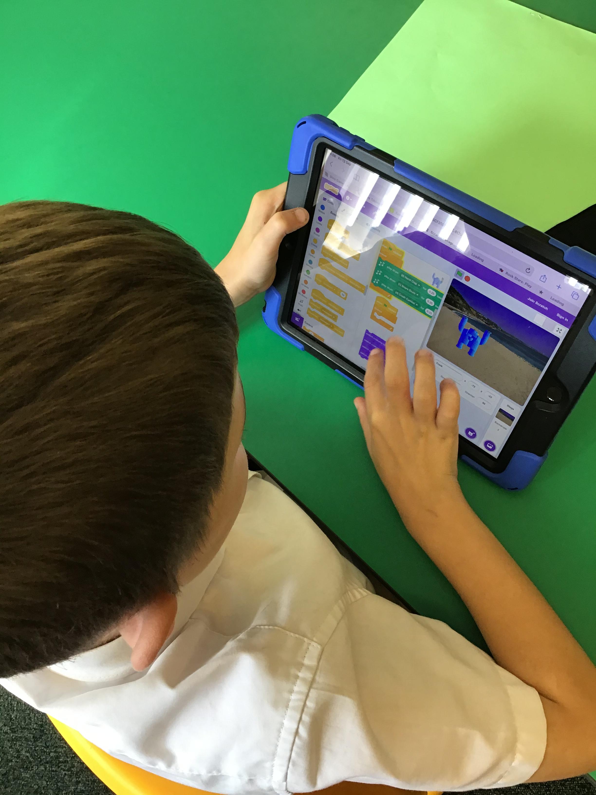 In this session the children were using ‘iMakeMusic’ to program the sprites to move to music, by using coding such as import, record, animate, repeat and loop.