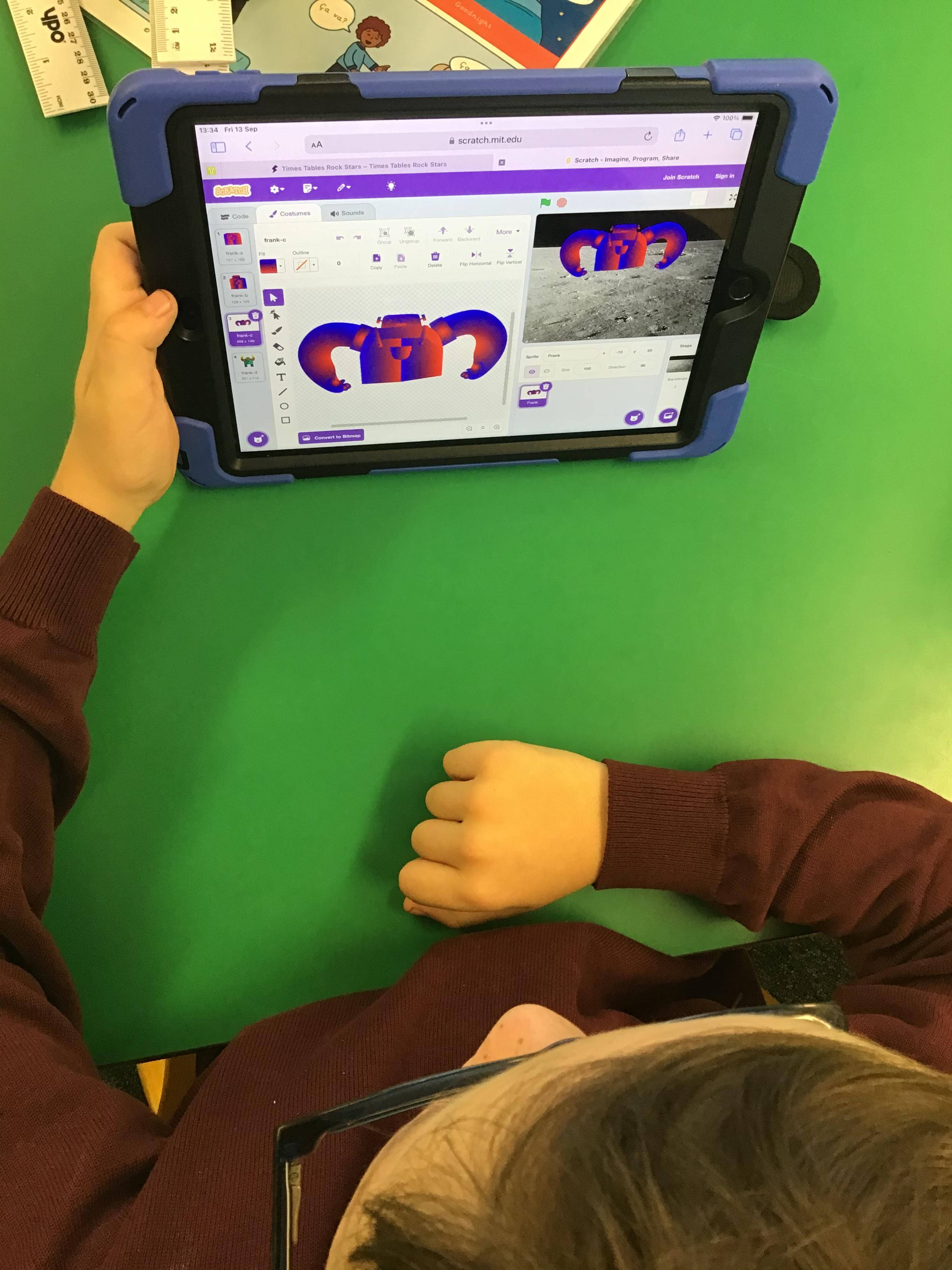 In this lesson the children were learning how to animate their sprites to change costume with coding techniques such as sequencing, repeating and loop.