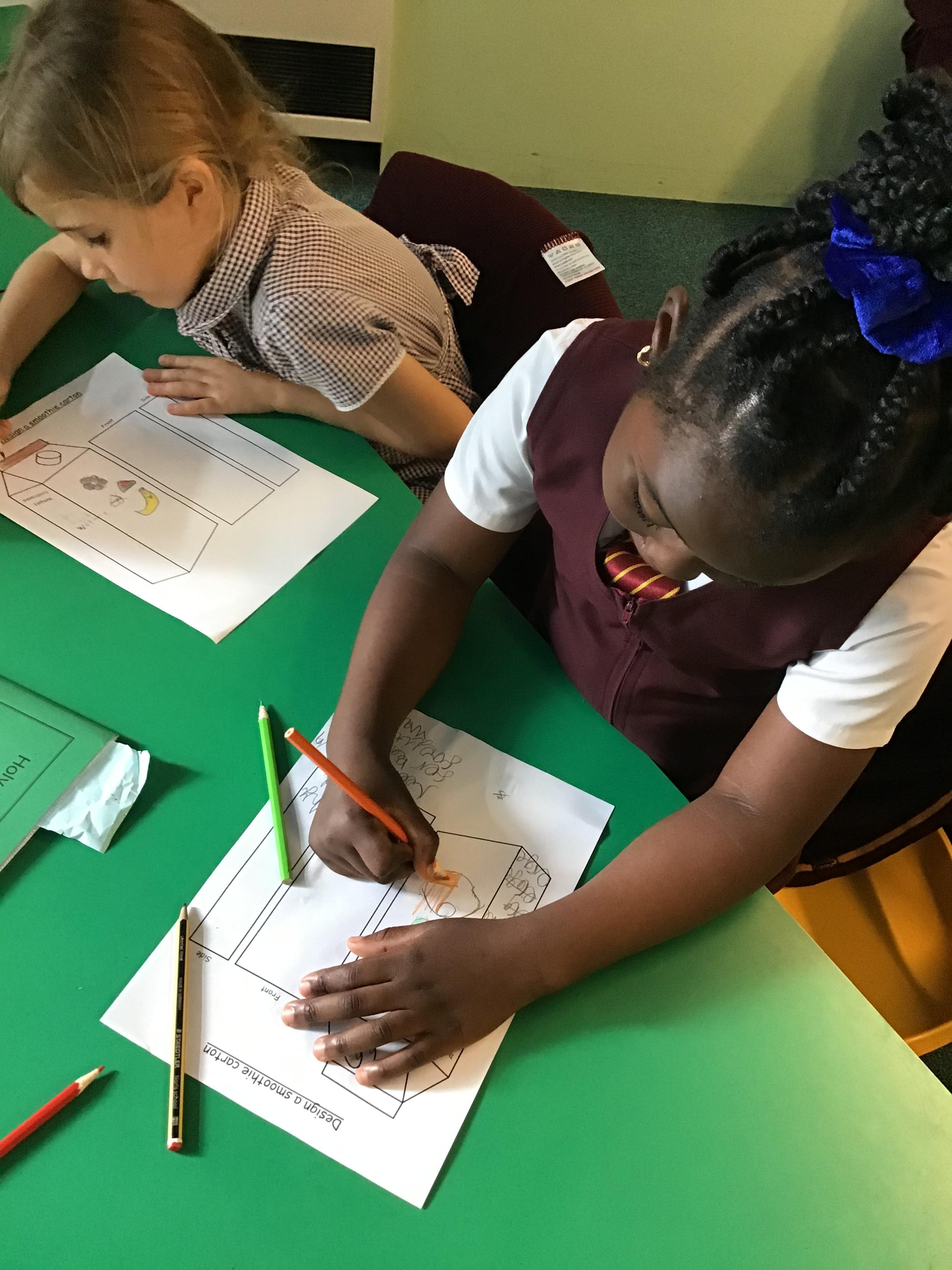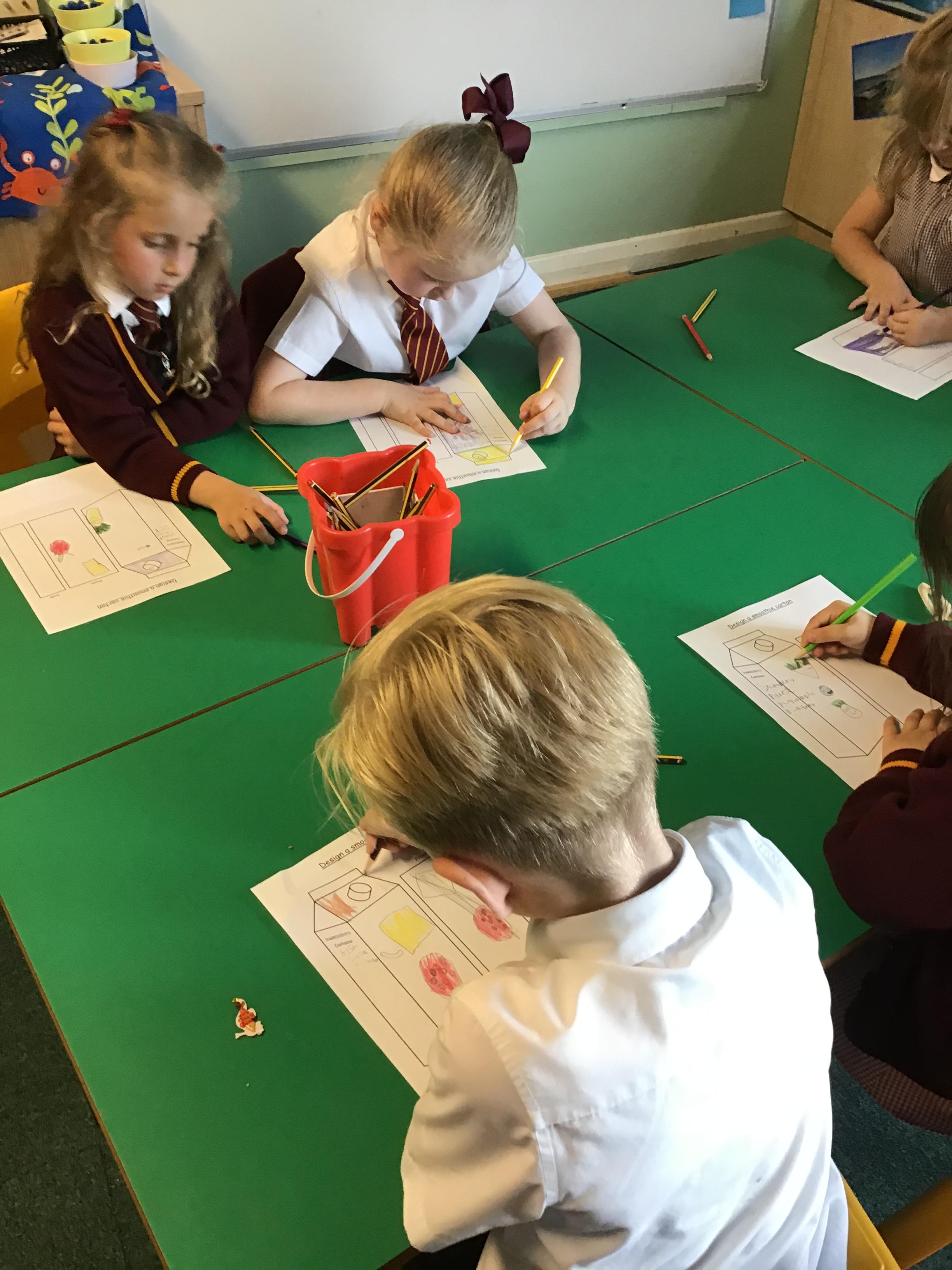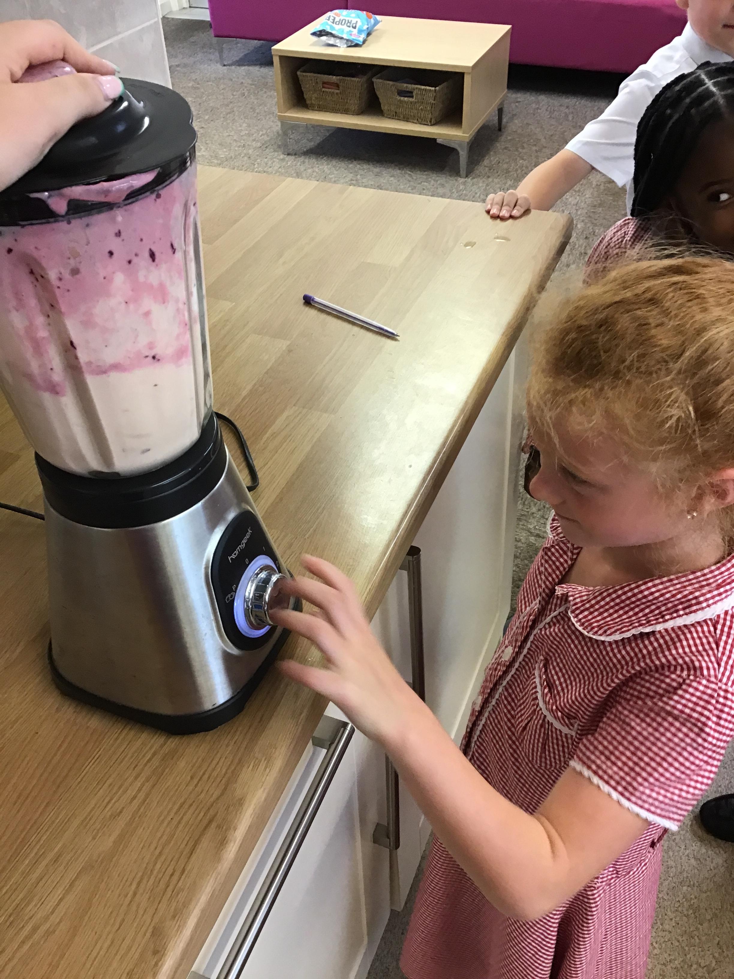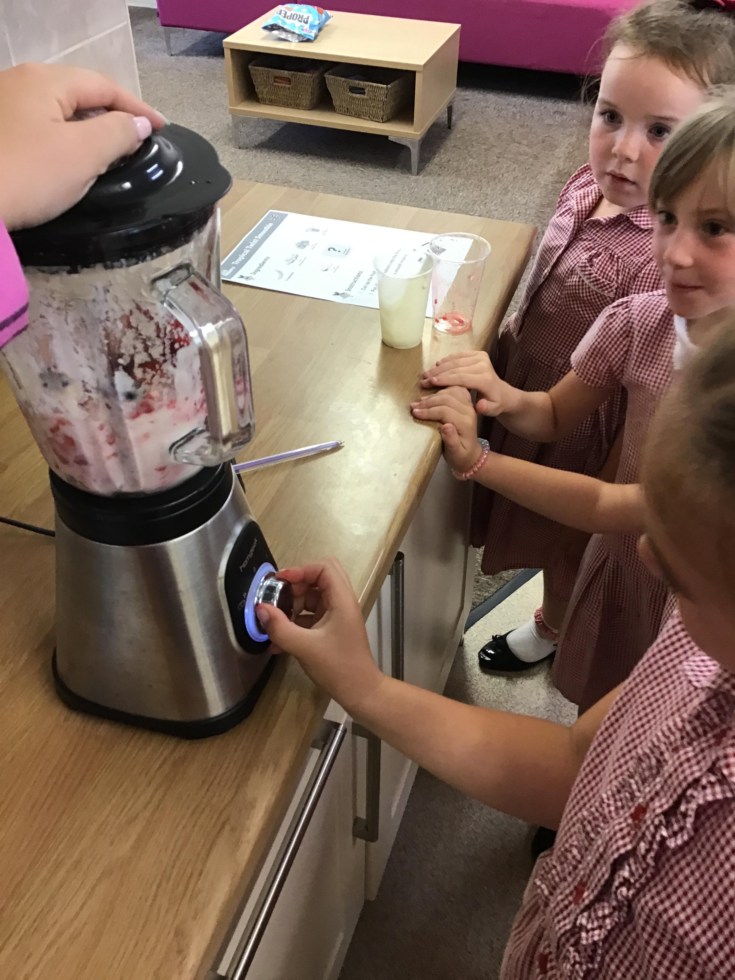 Children tried the different fruits and vegetables needed to make the three smoothies. Children prepare and blend chosen fruits and vegetables to make smoothies and design packaging for their drinks to reflect the ingredients.