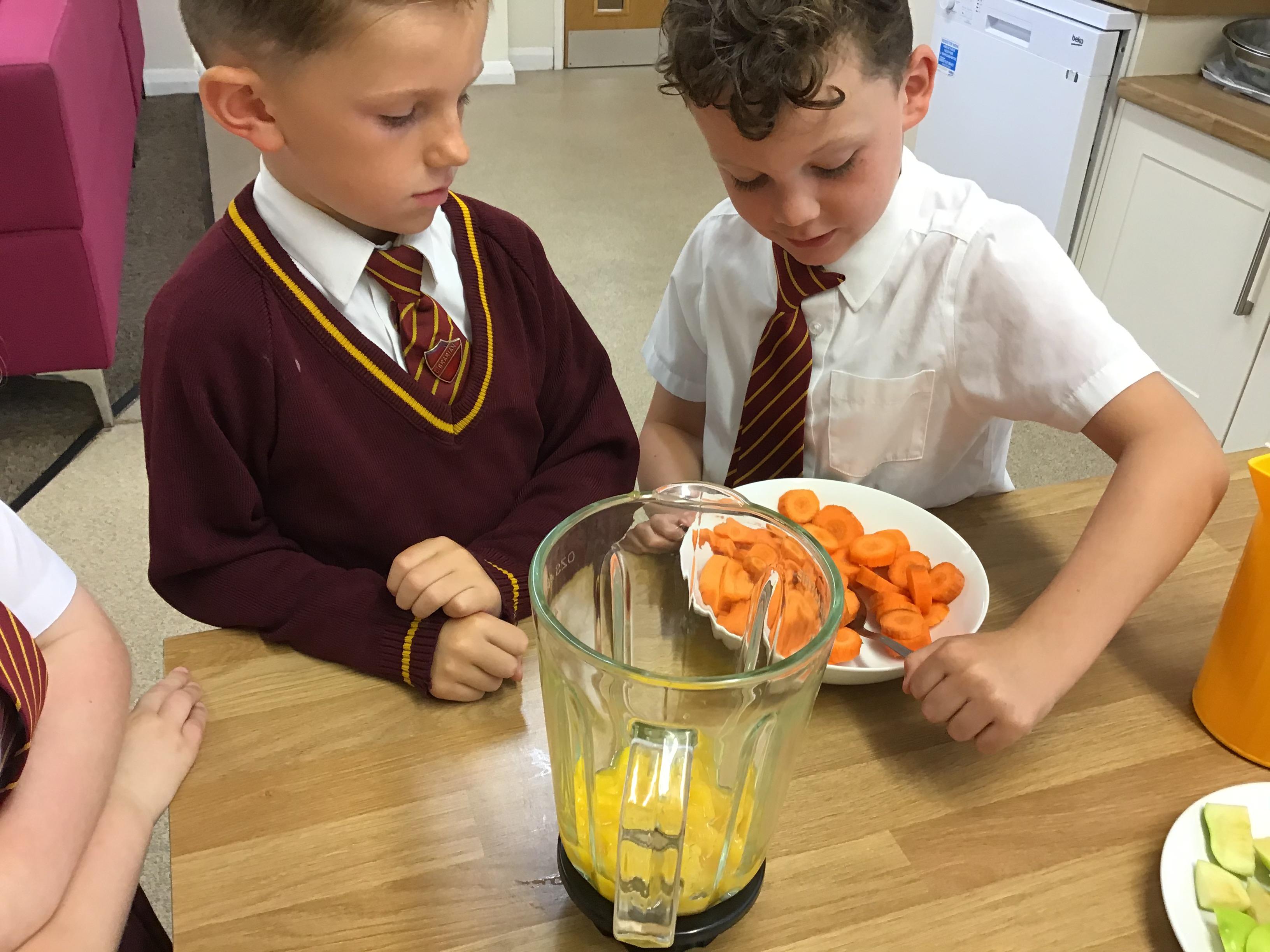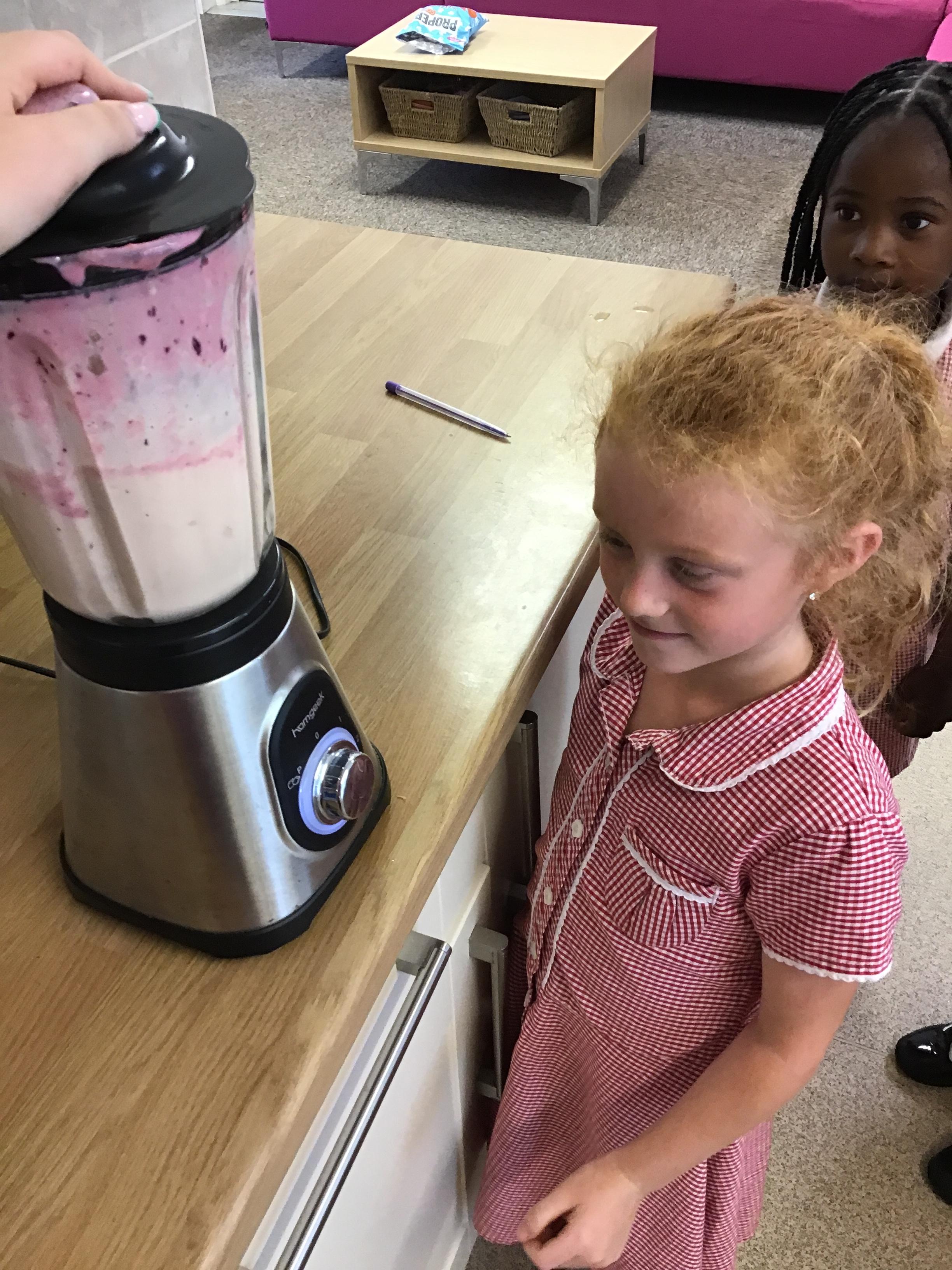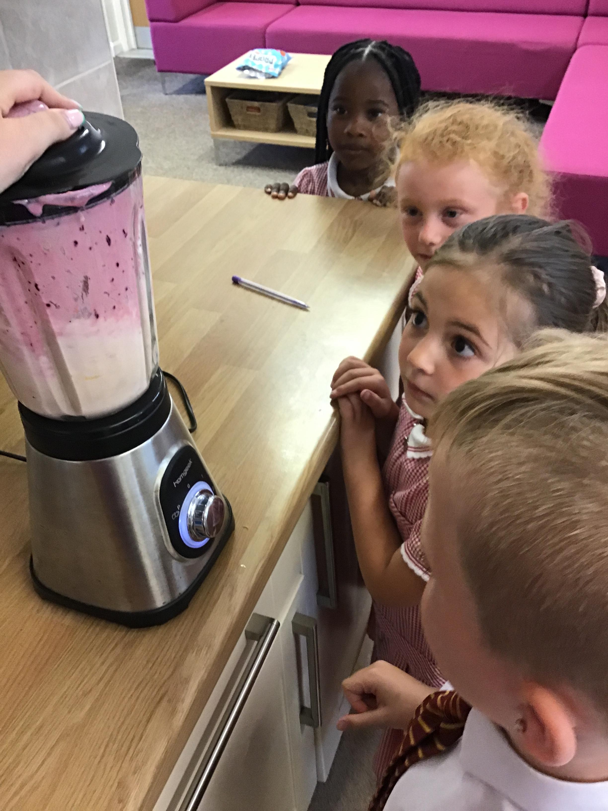 Children tried the different fruits and vegetables needed to make the three smoothies. Children prepare and blend chosen fruits and vegetables to make smoothies and design packaging for their drinks to reflect the ingredients.