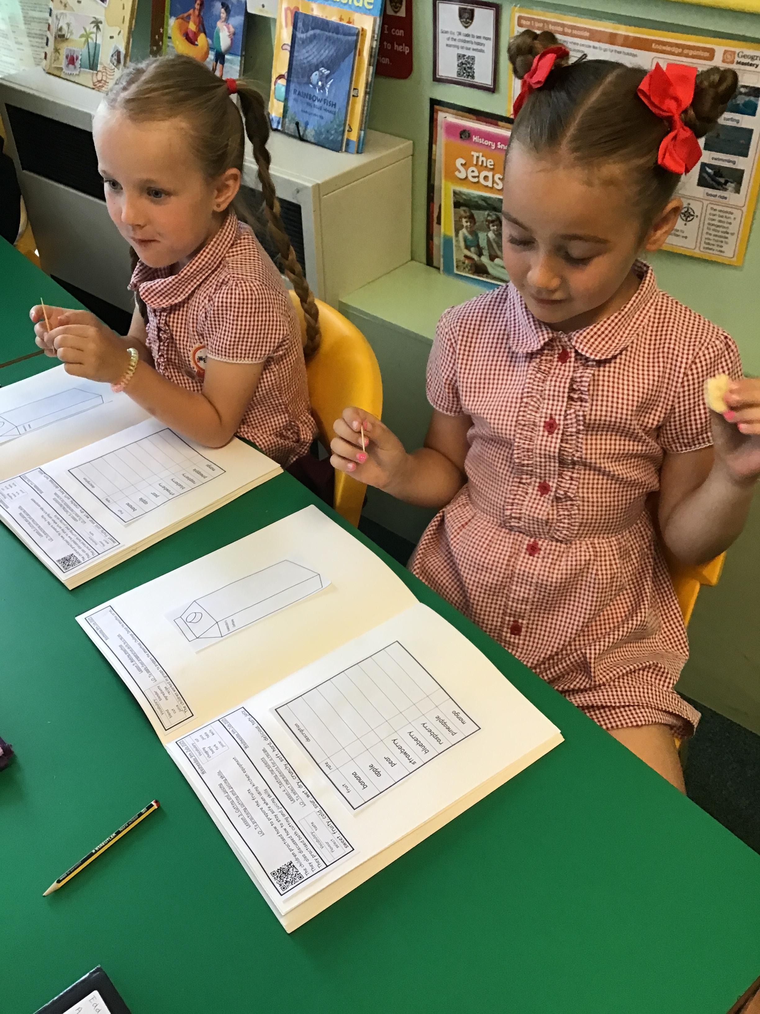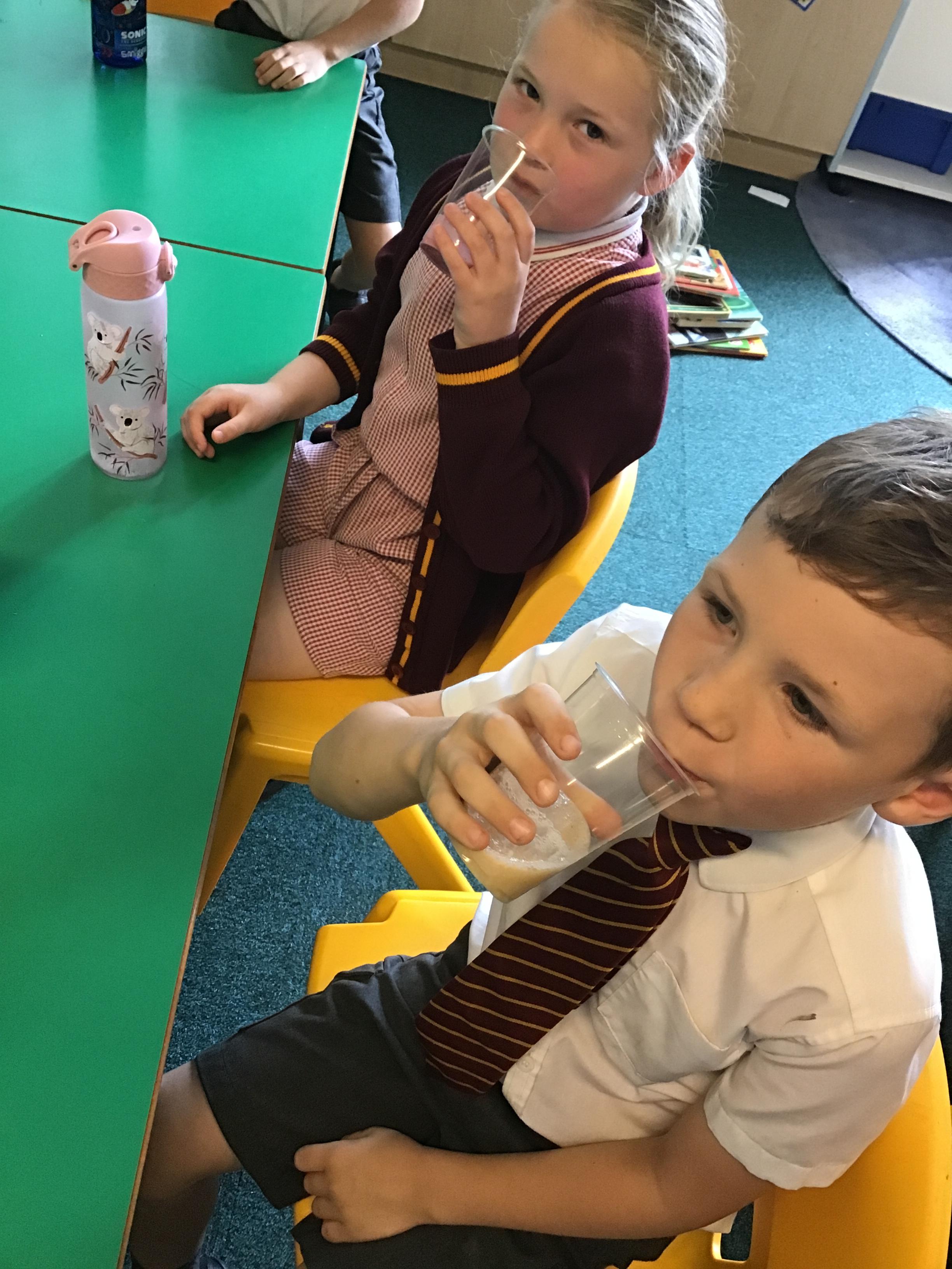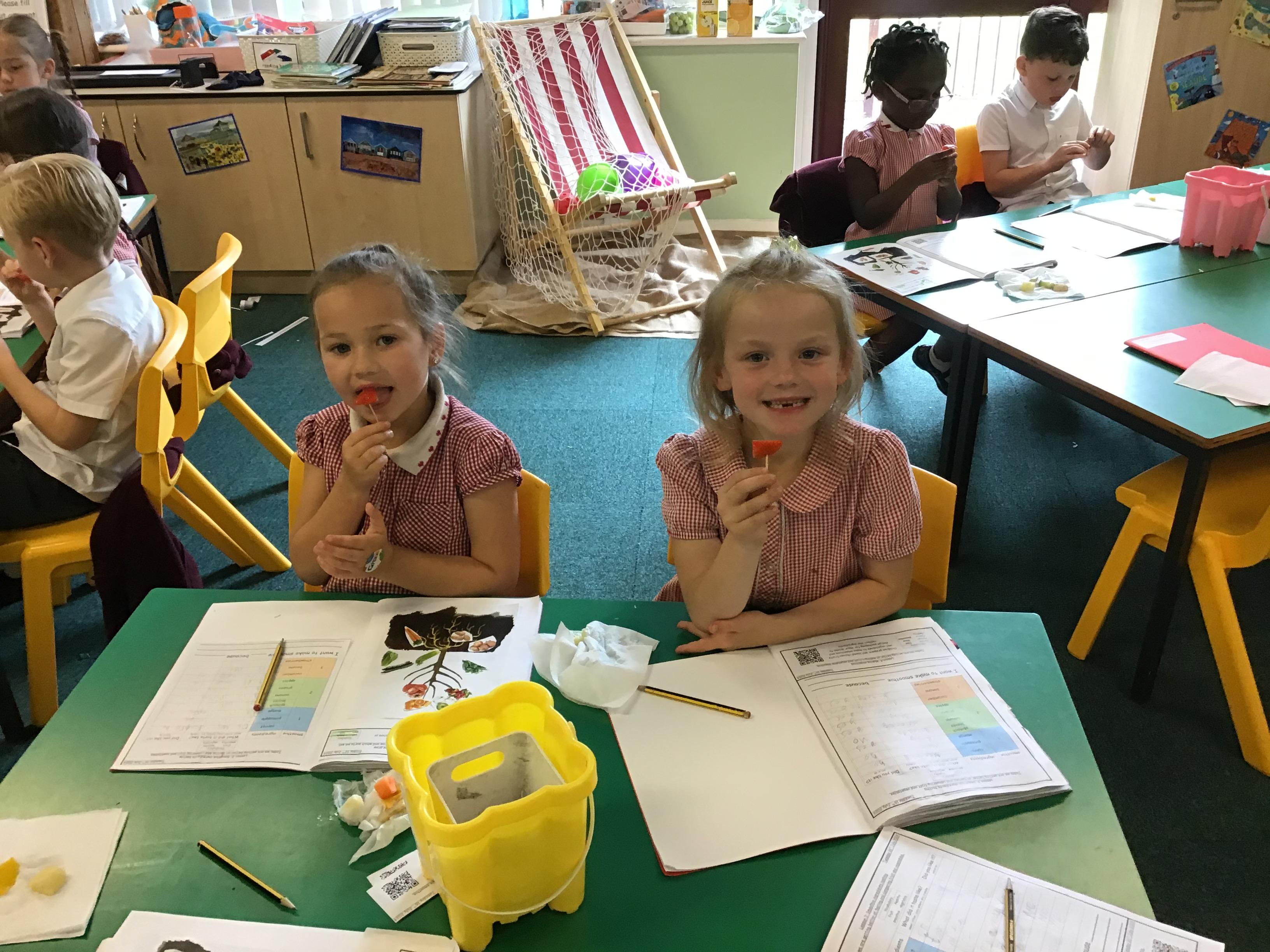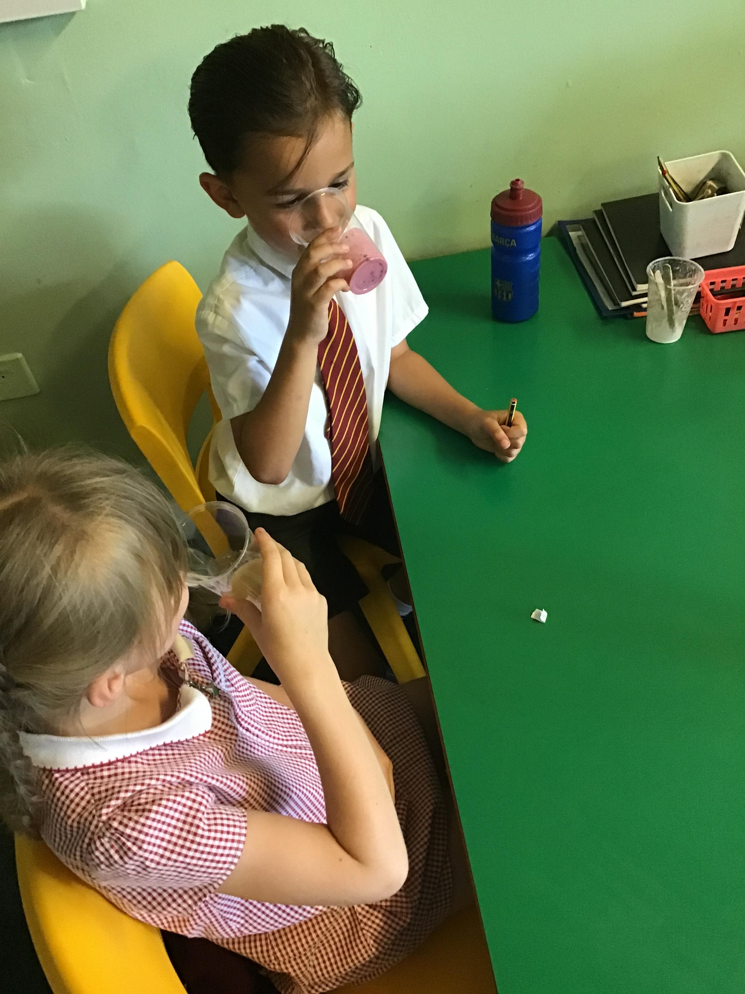Children tried the different fruits and vegetables needed to make the three smoothies. Children prepare and blend chosen fruits and vegetables to make smoothies and design packaging for their drinks to reflect the ingredients.