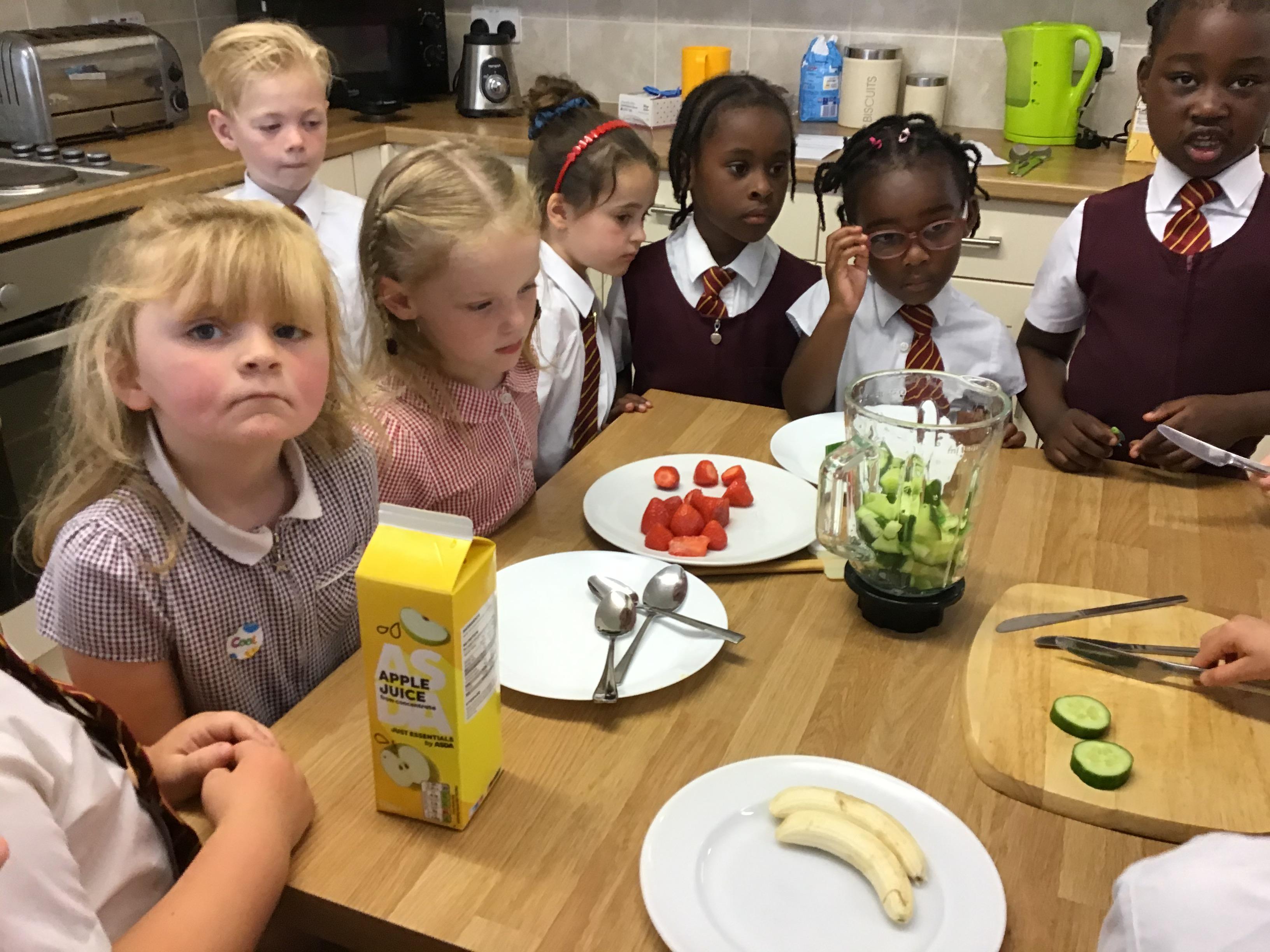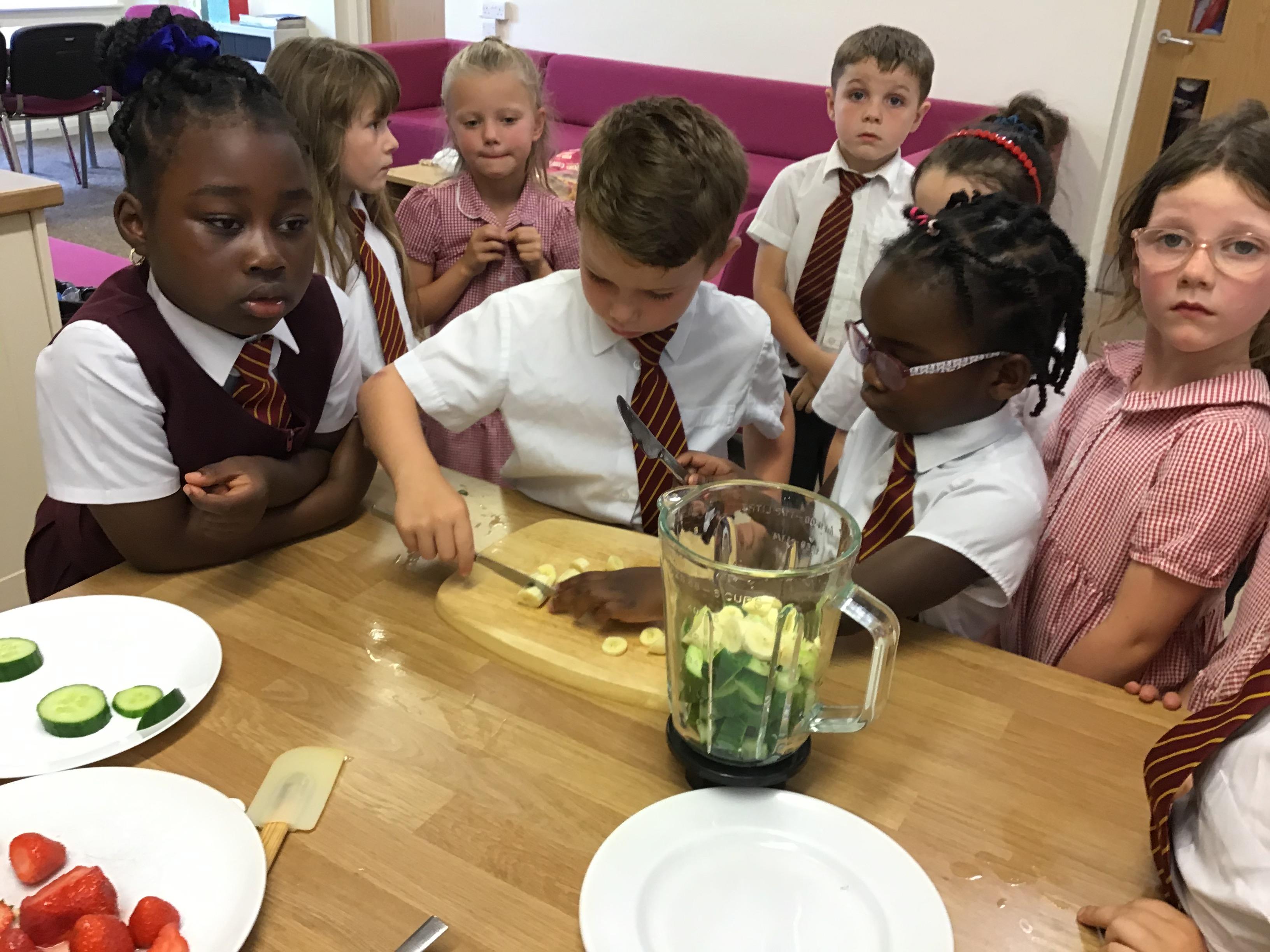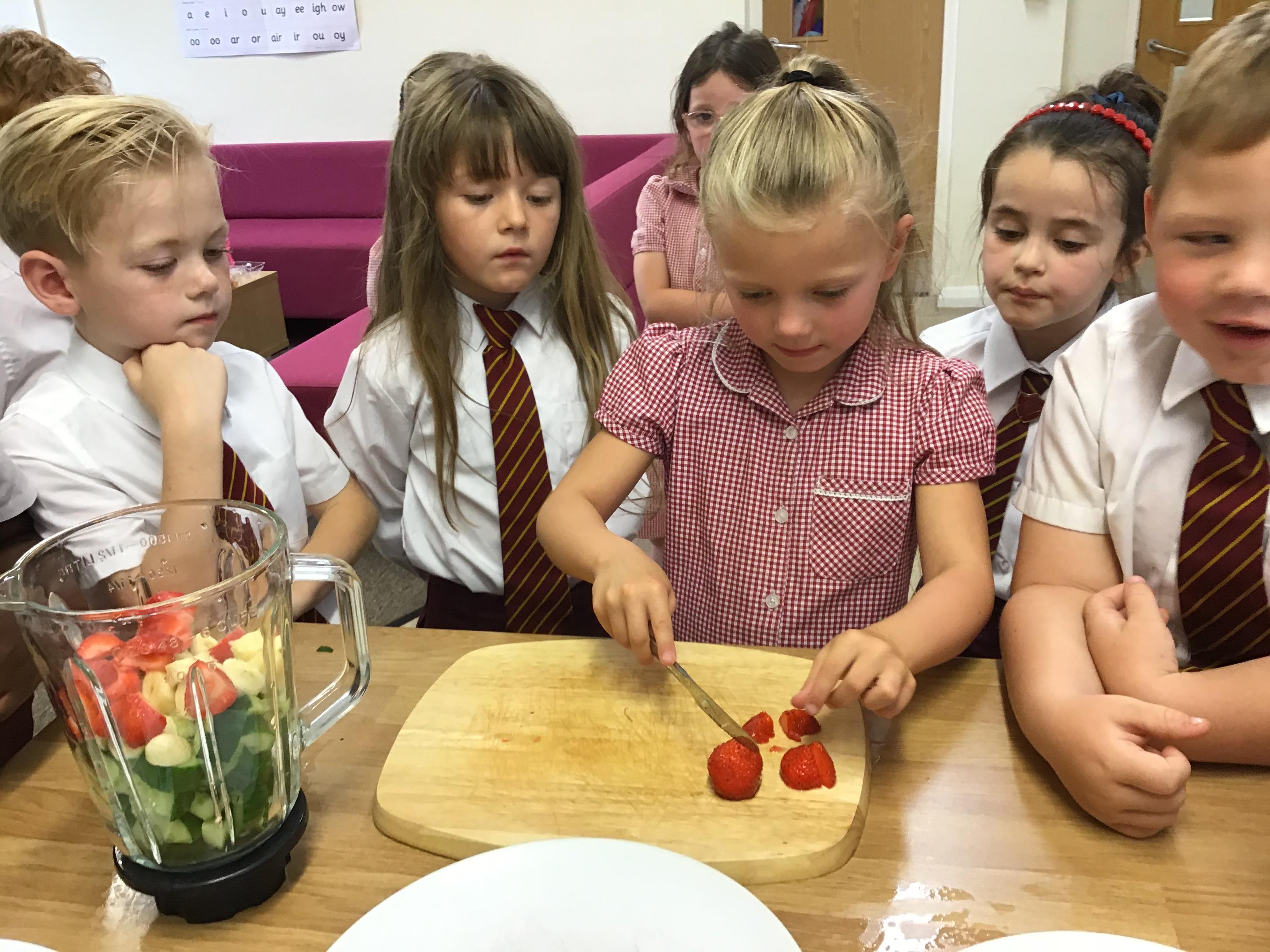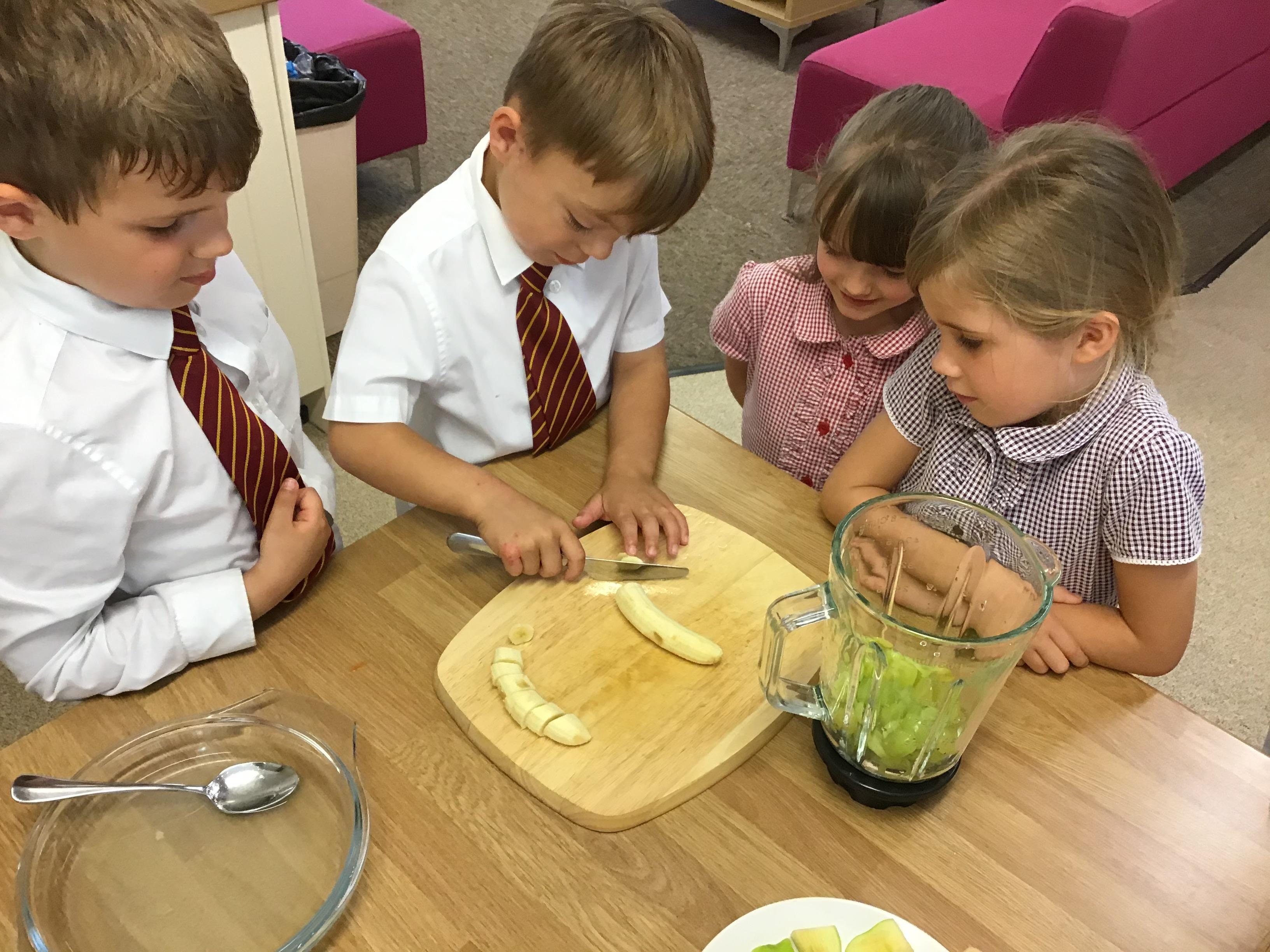 The children practised how to prepare the fruits, discussing how to stay safe when using kitchen equipment. They practised both cutting and juicing skills. The children worked in groups to prepare the smoothies.