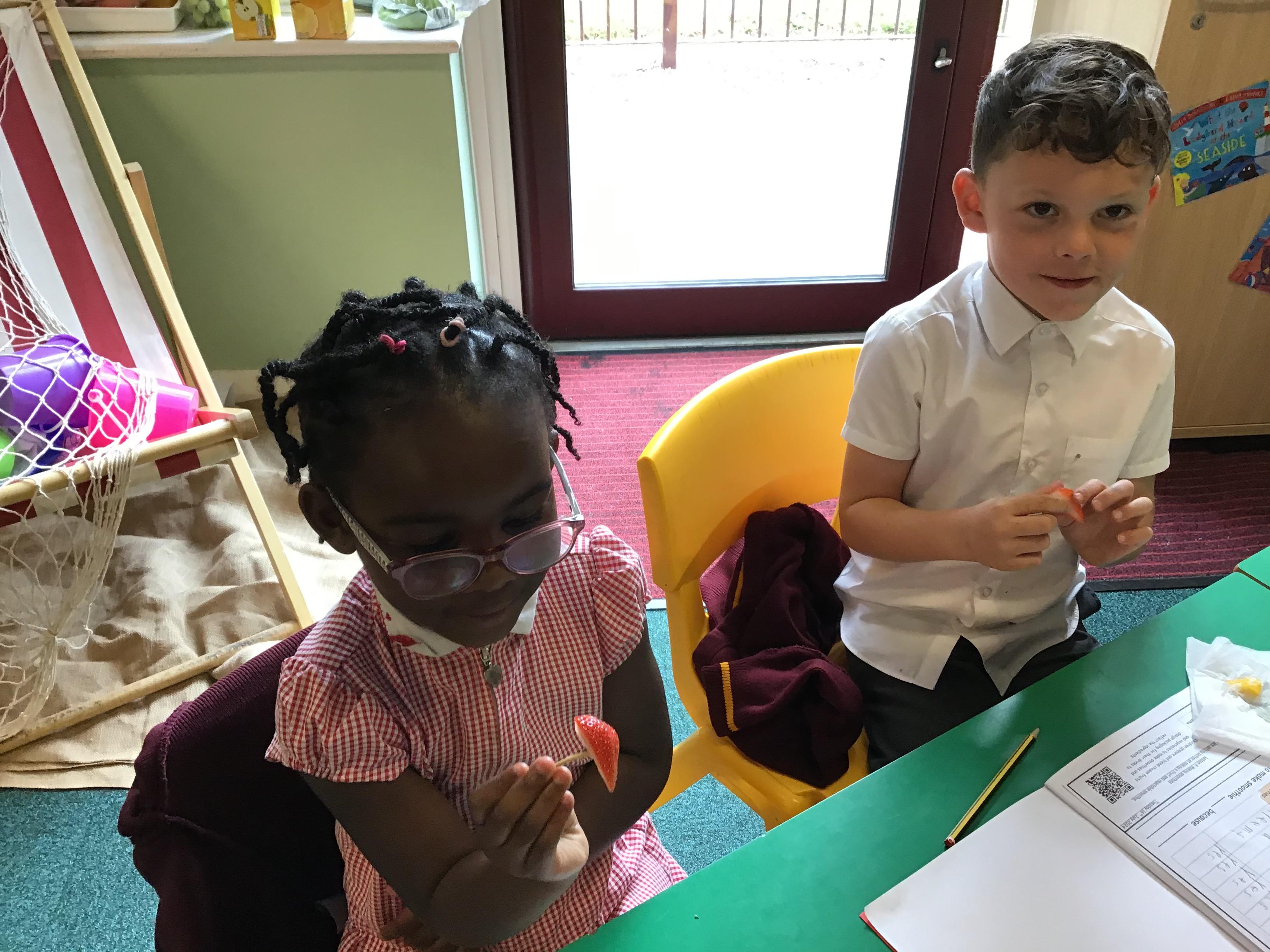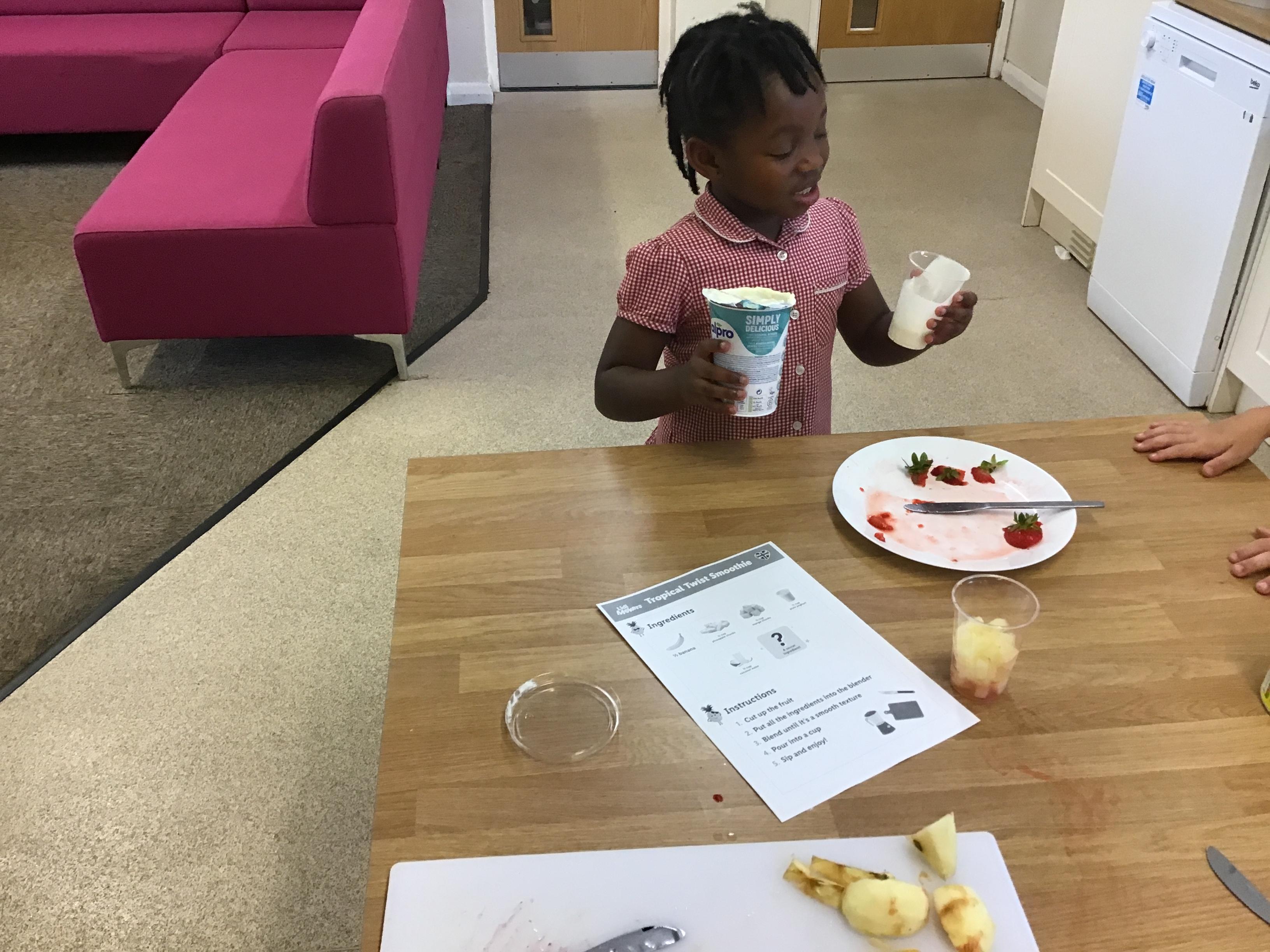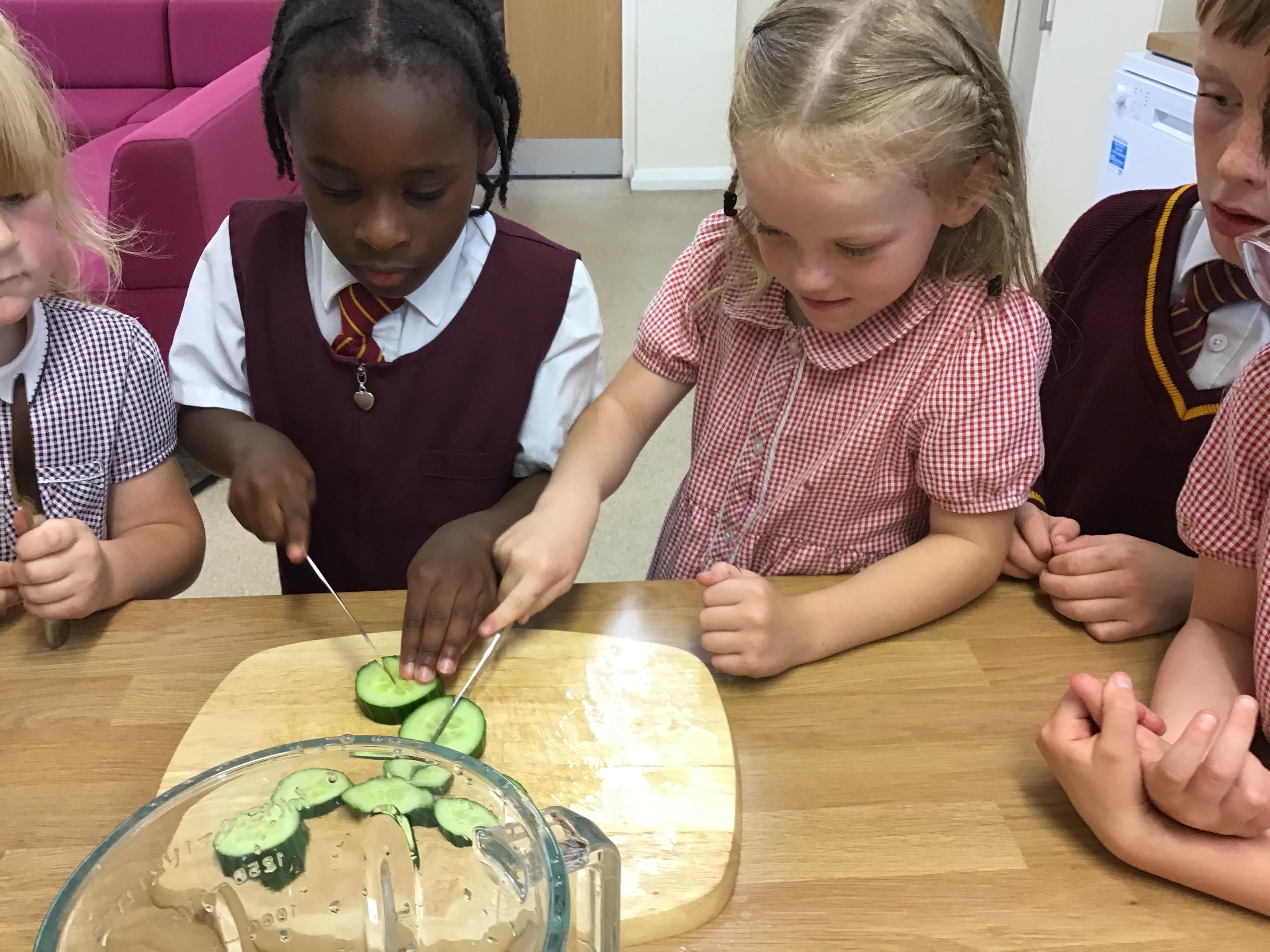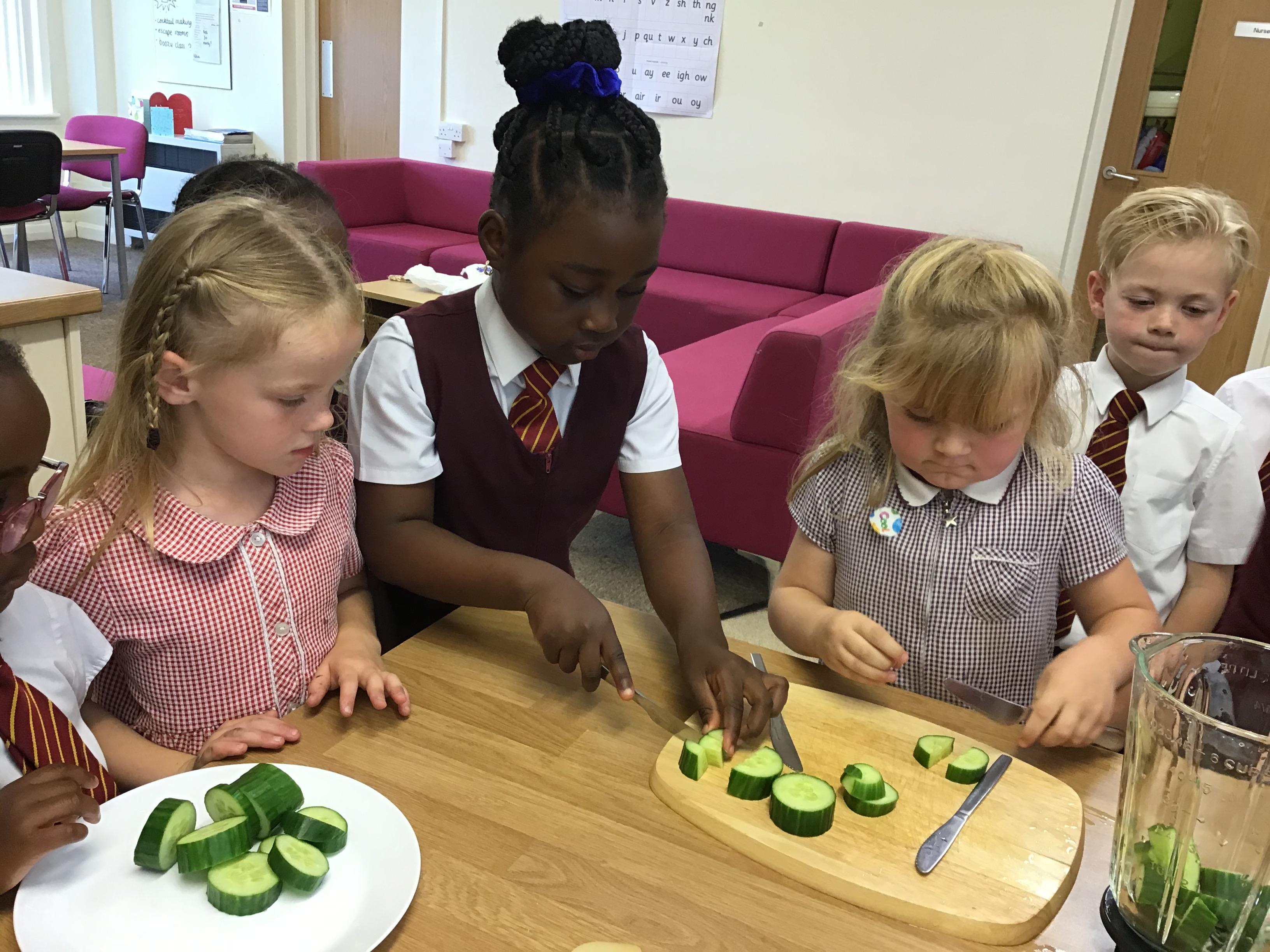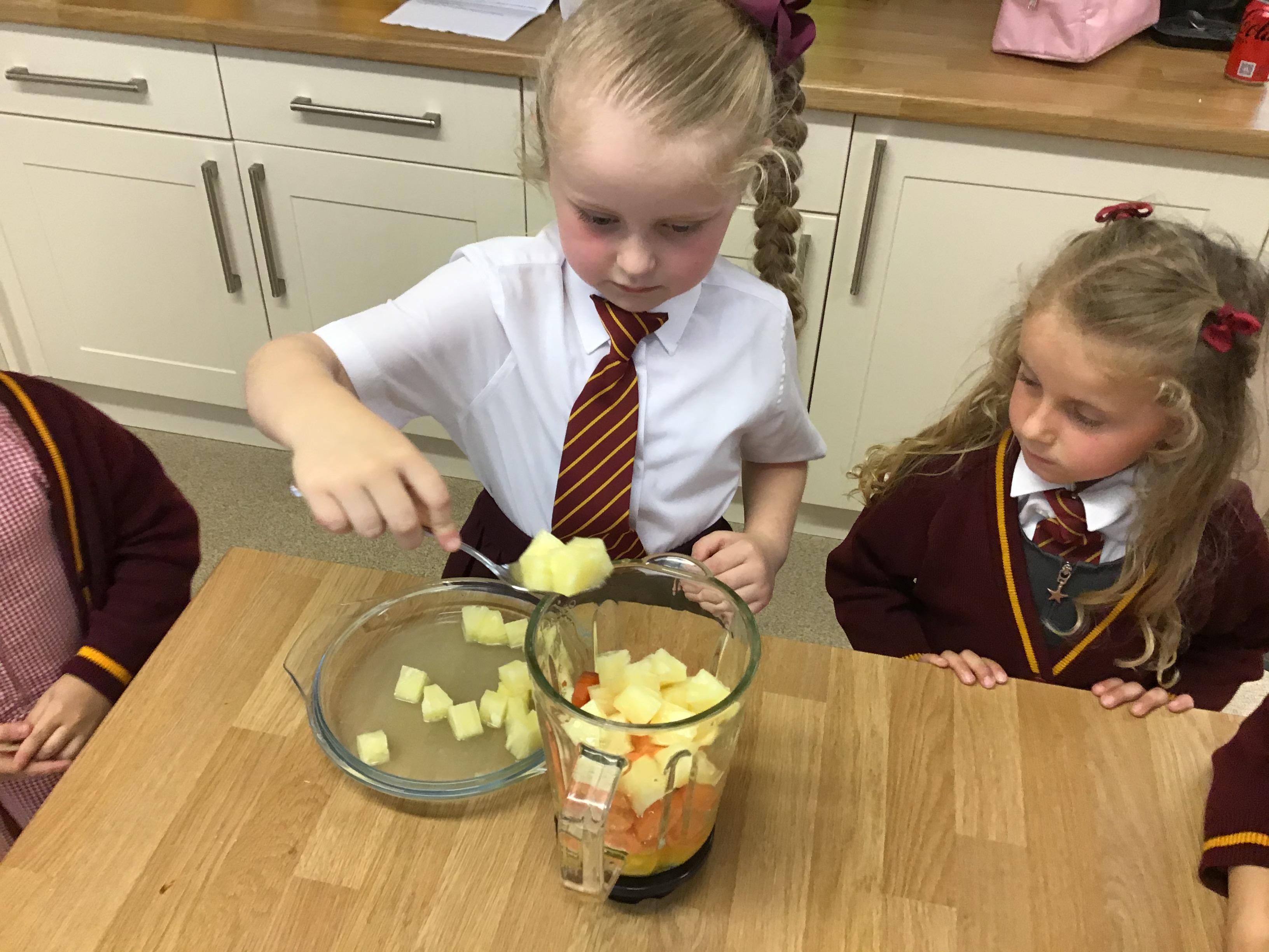 The children practised how to prepare the fruits, discussing how to stay safe when using kitchen equipment. They practised both cutting and juicing skills. The children worked in groups to prepare the smoothies.