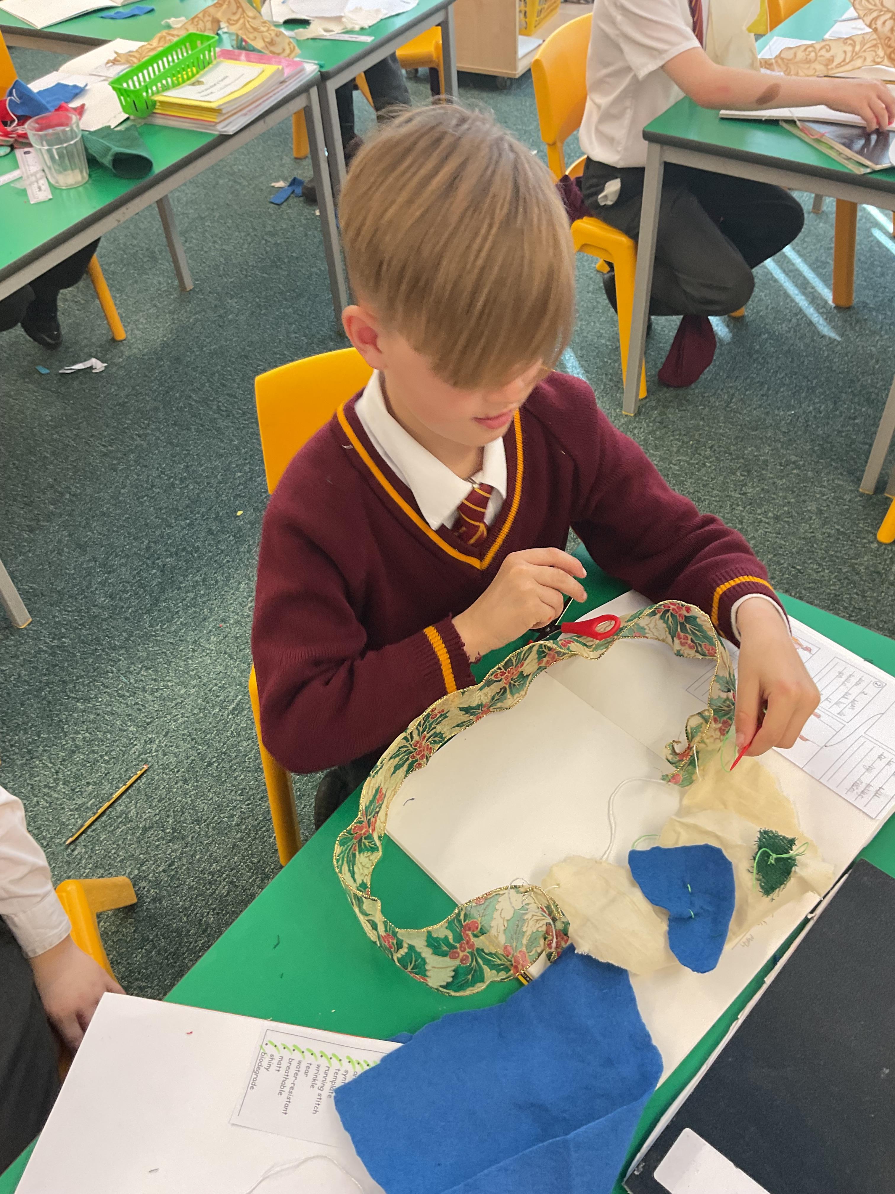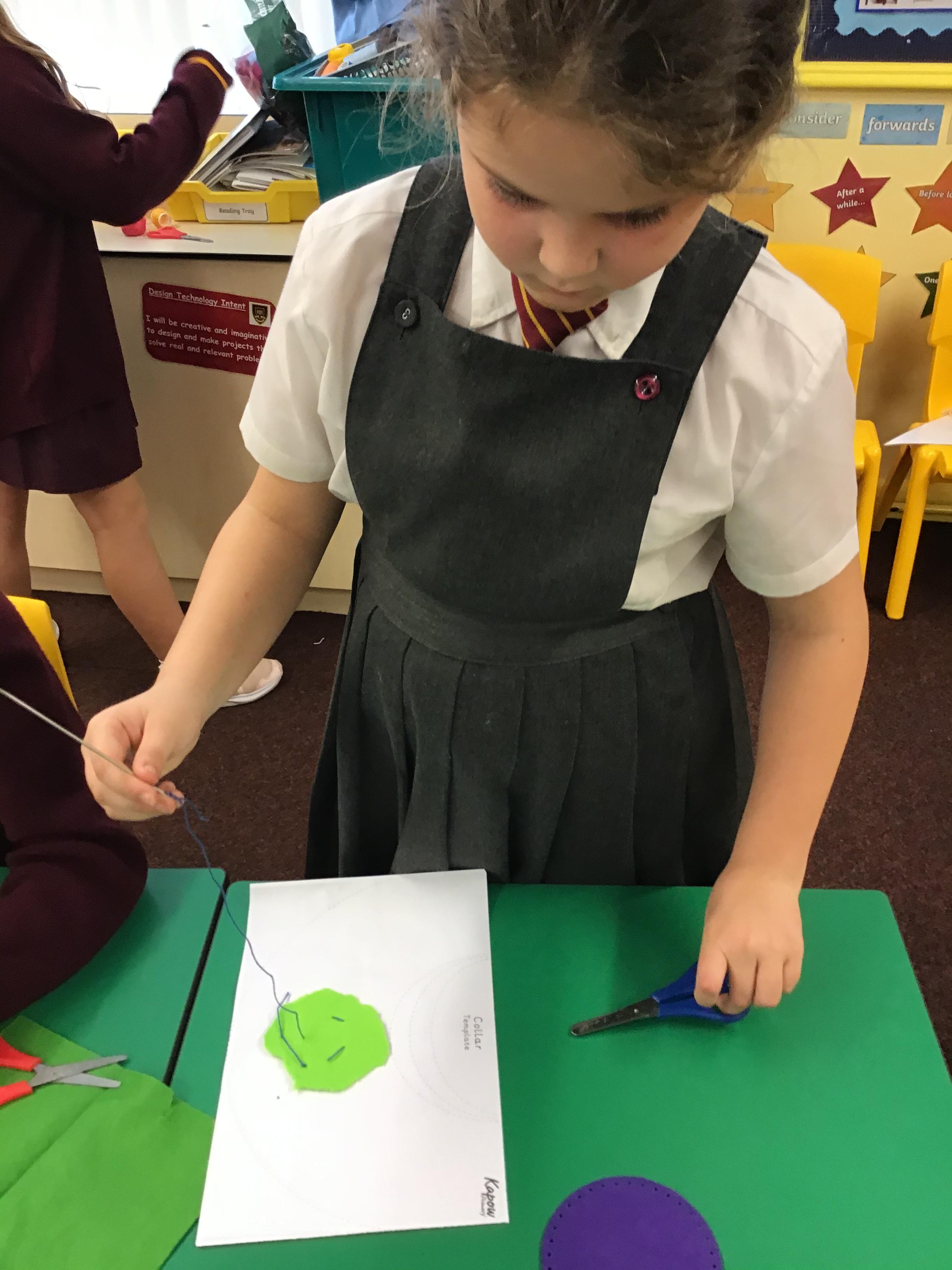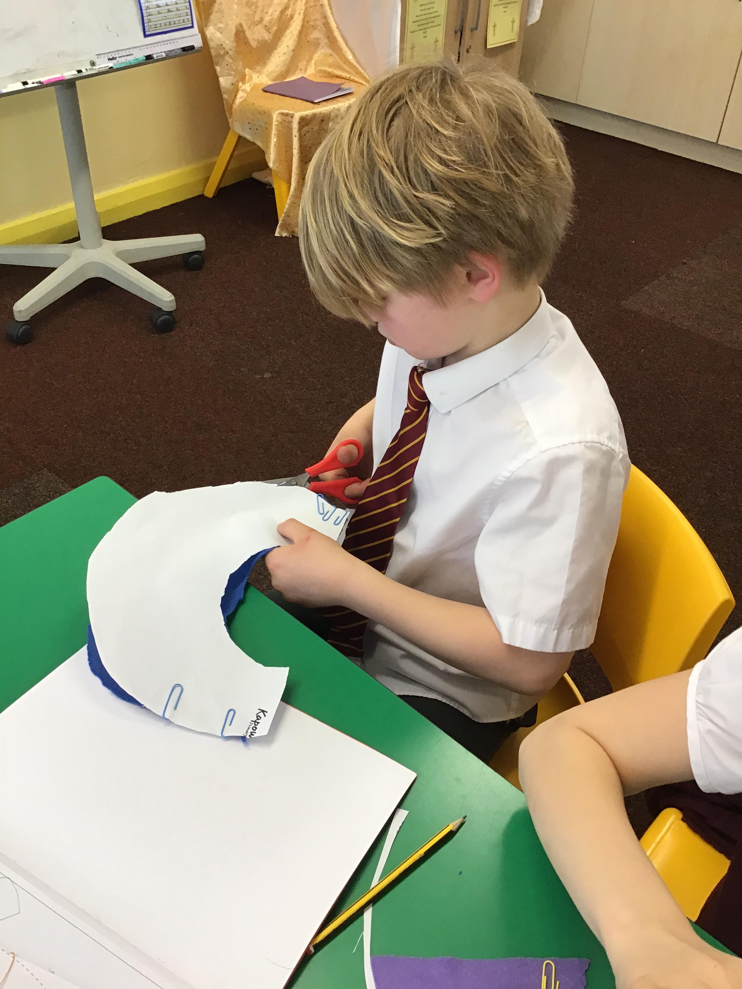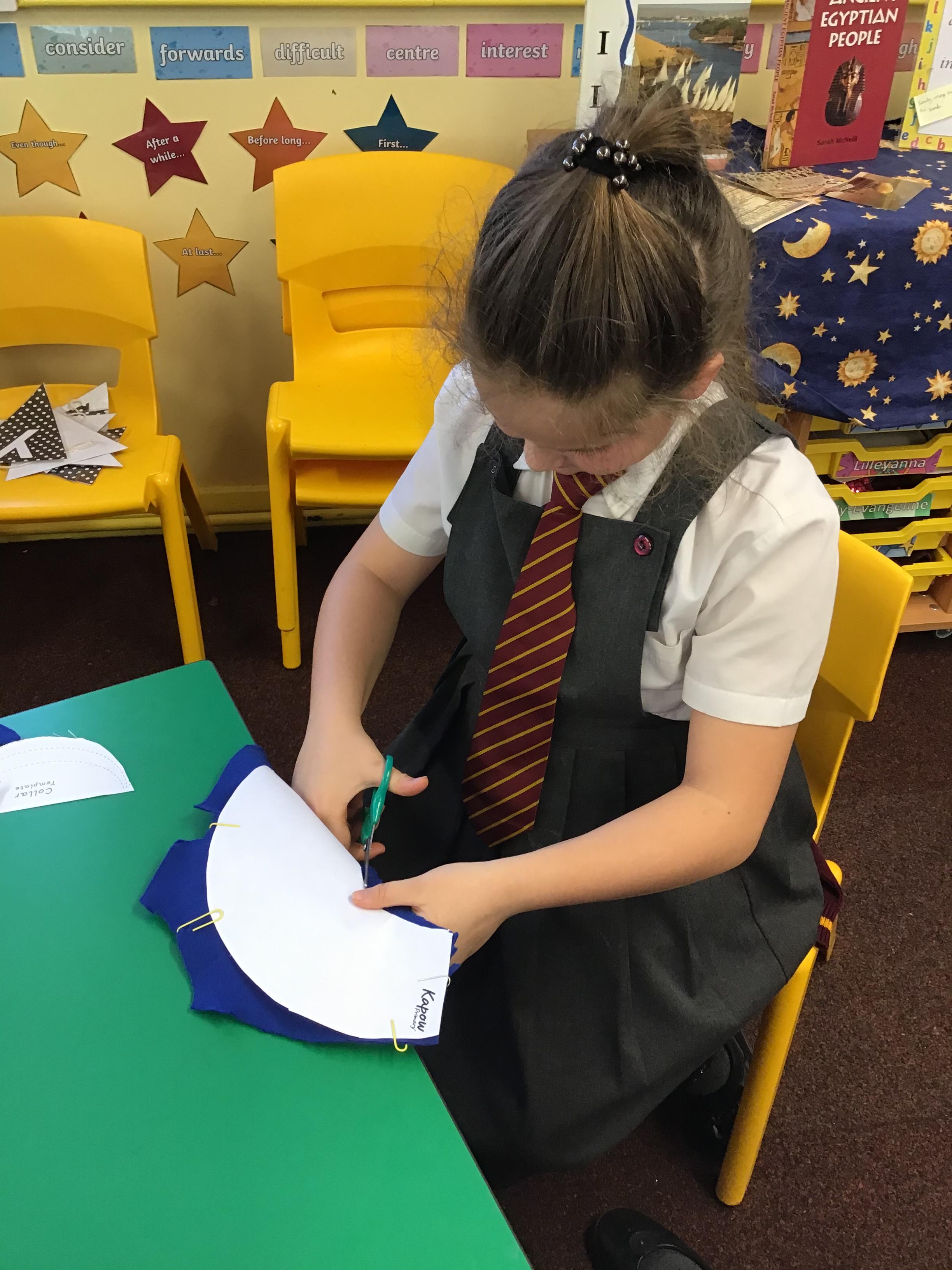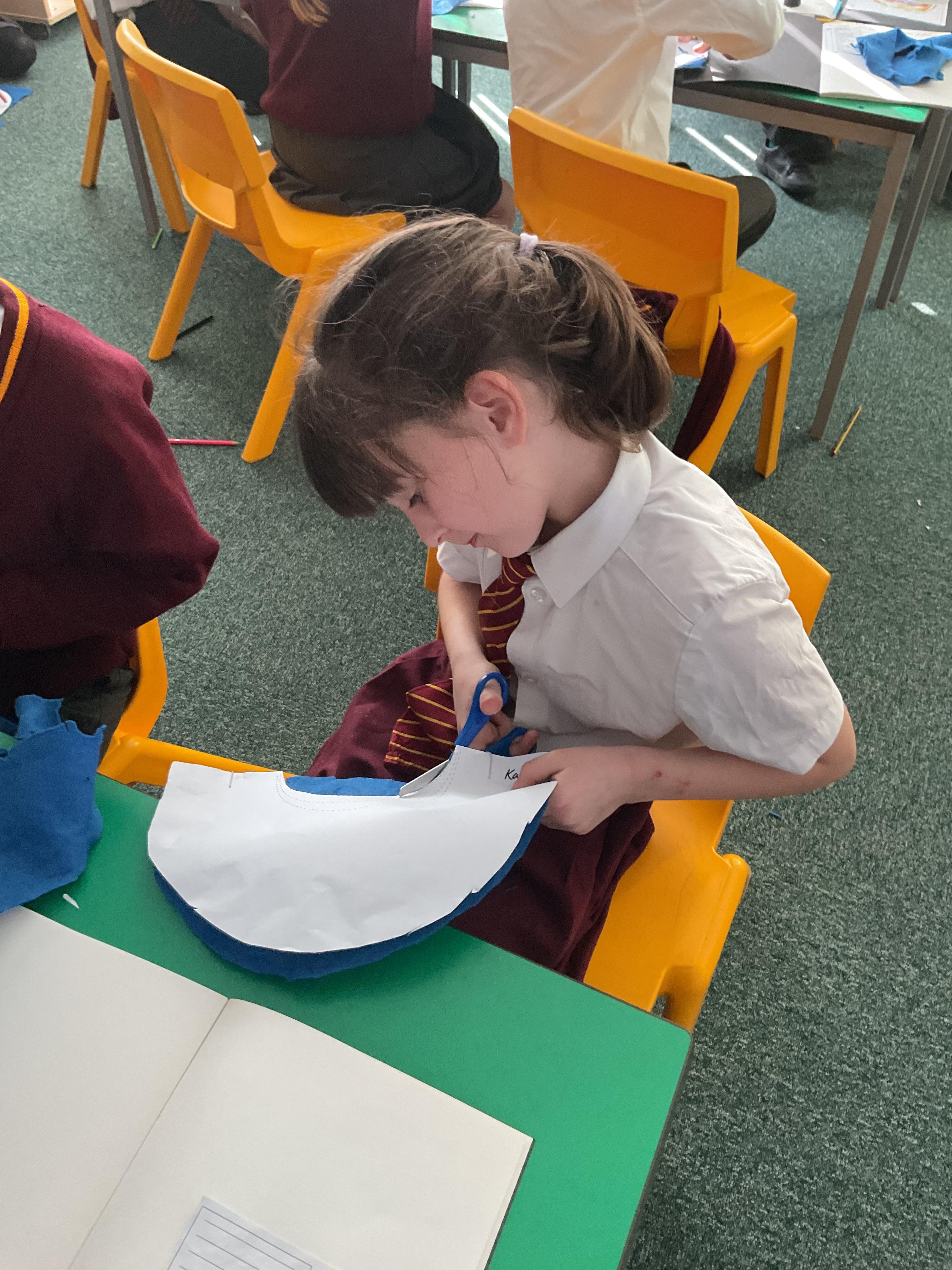 In year 3, children have been assembling the fabric parts into a fabric product. The children have used a template and pins to cut the fabric accurately.