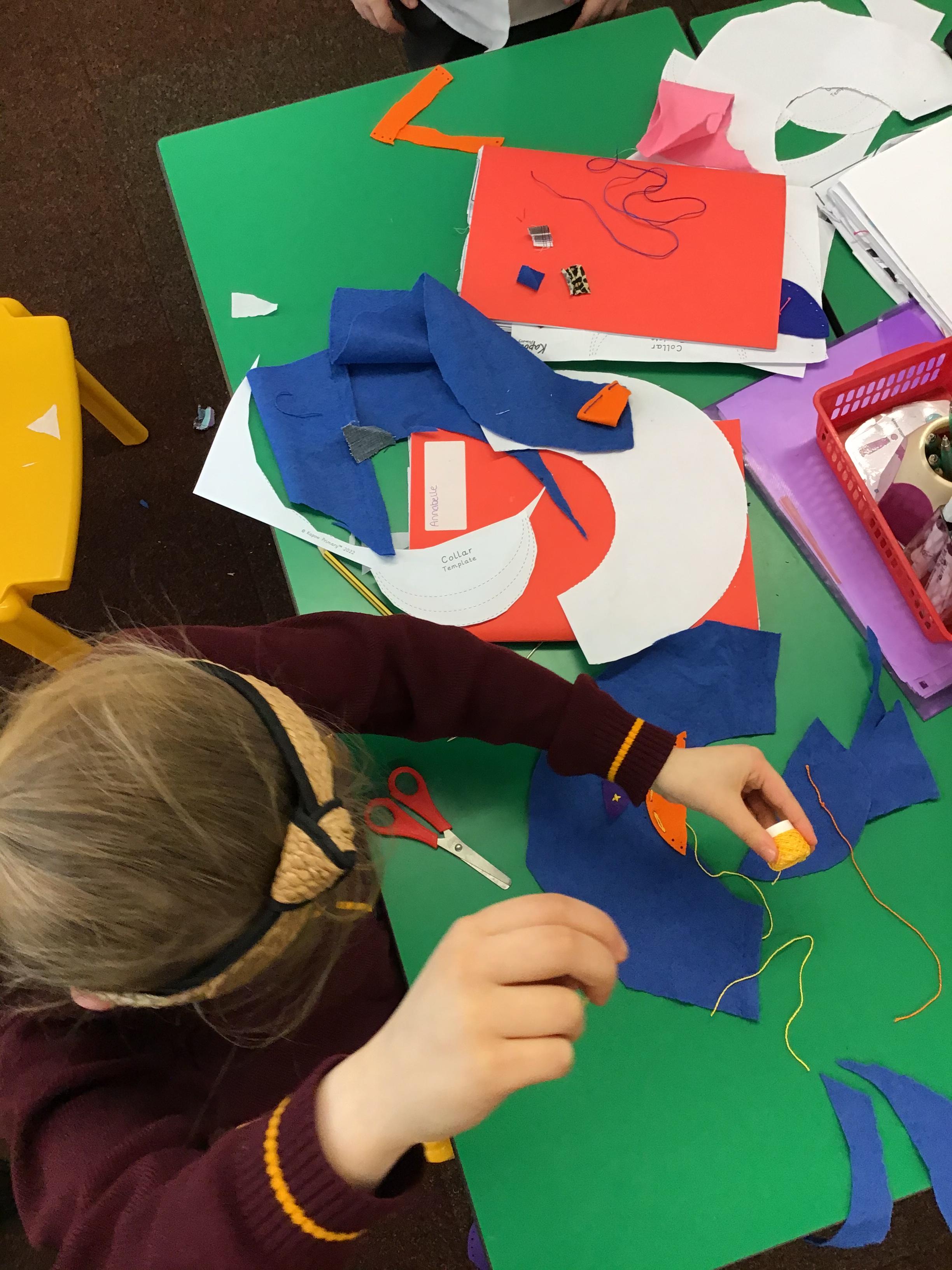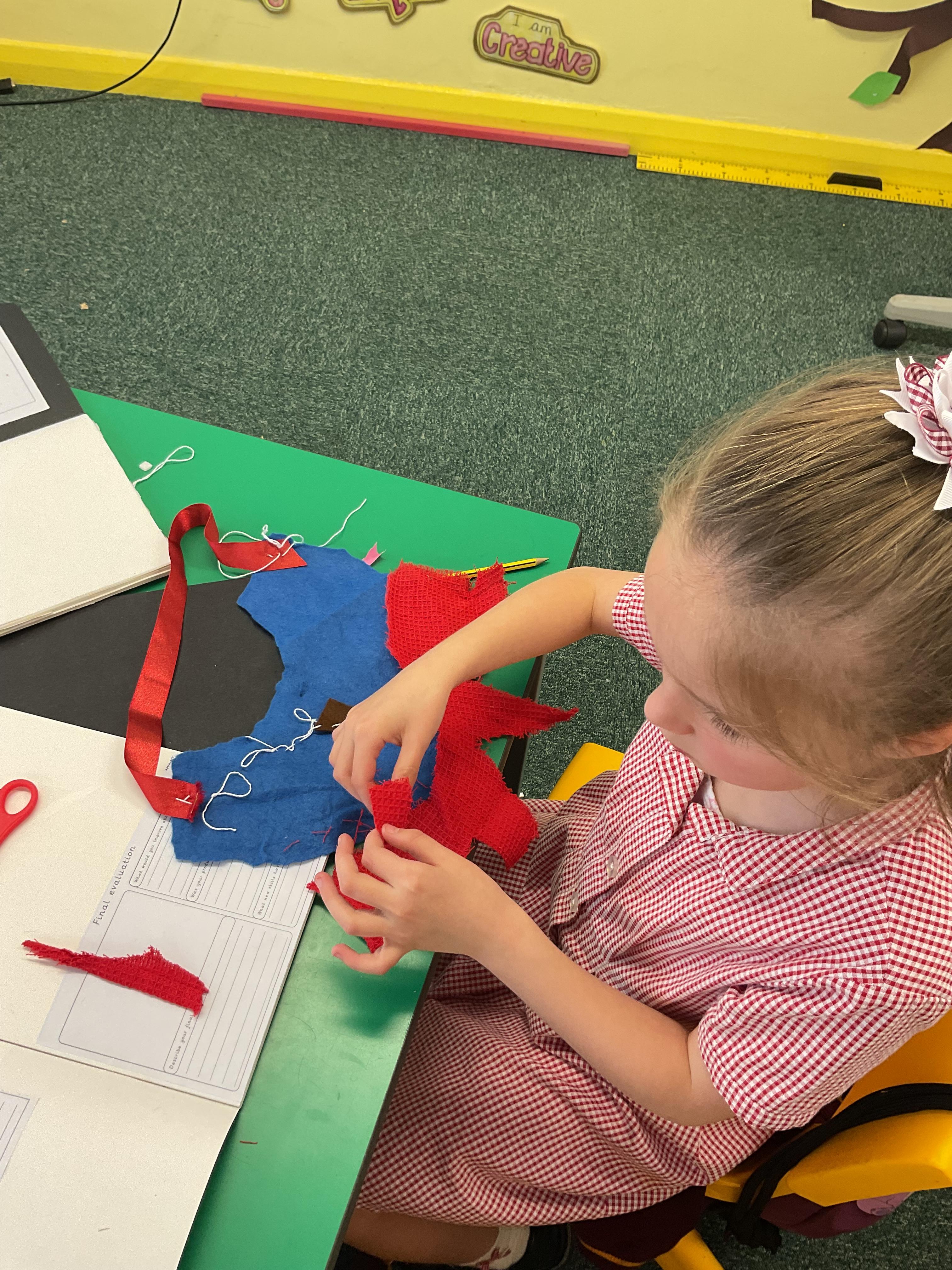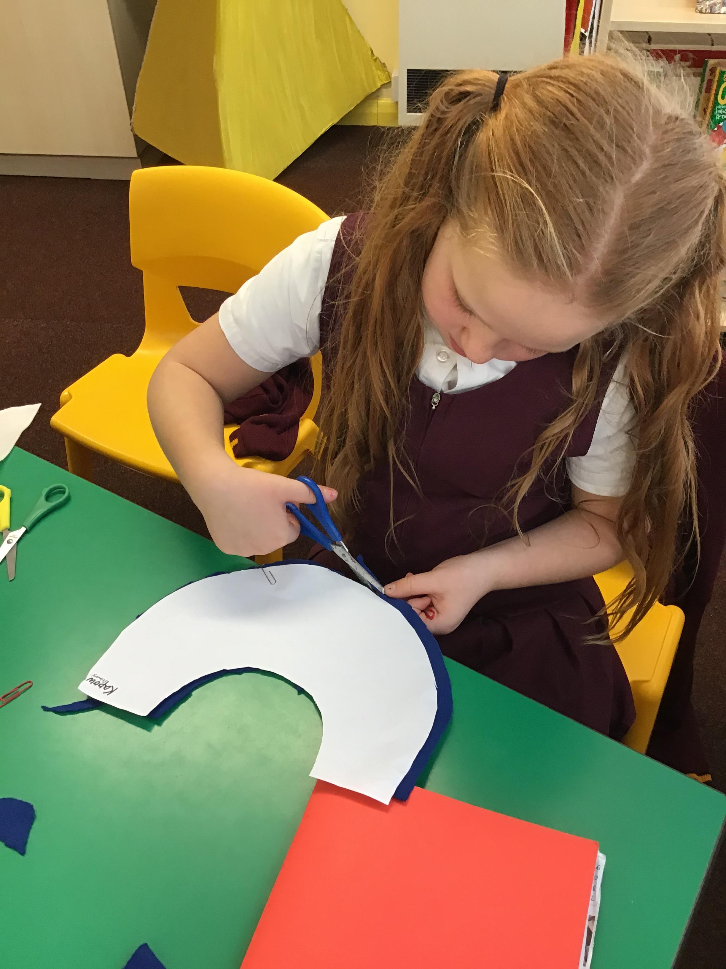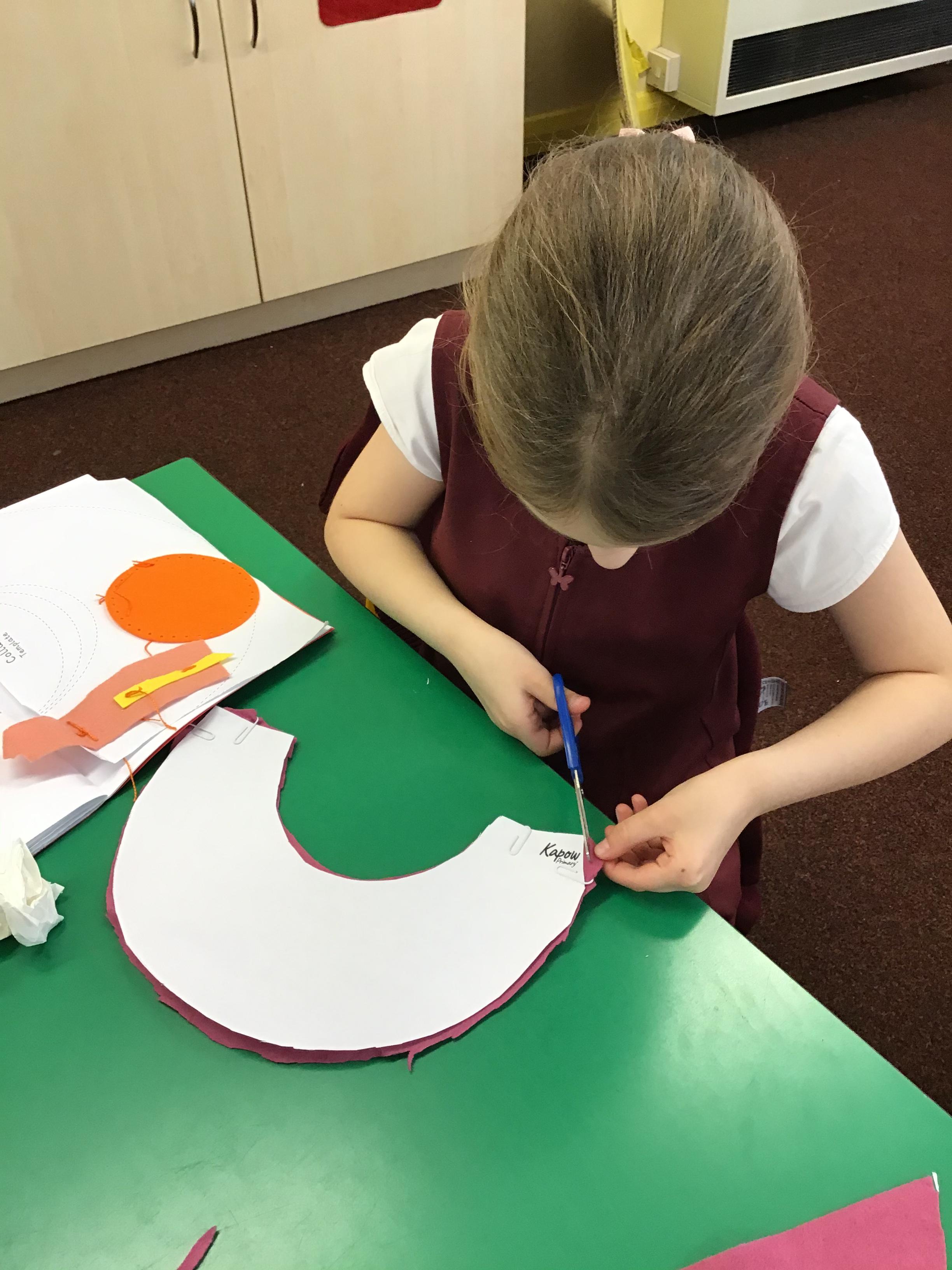 In year 3, children have been assembling the fabric parts into a fabric product. The children have used a template and pins to cut the fabric accurately.
