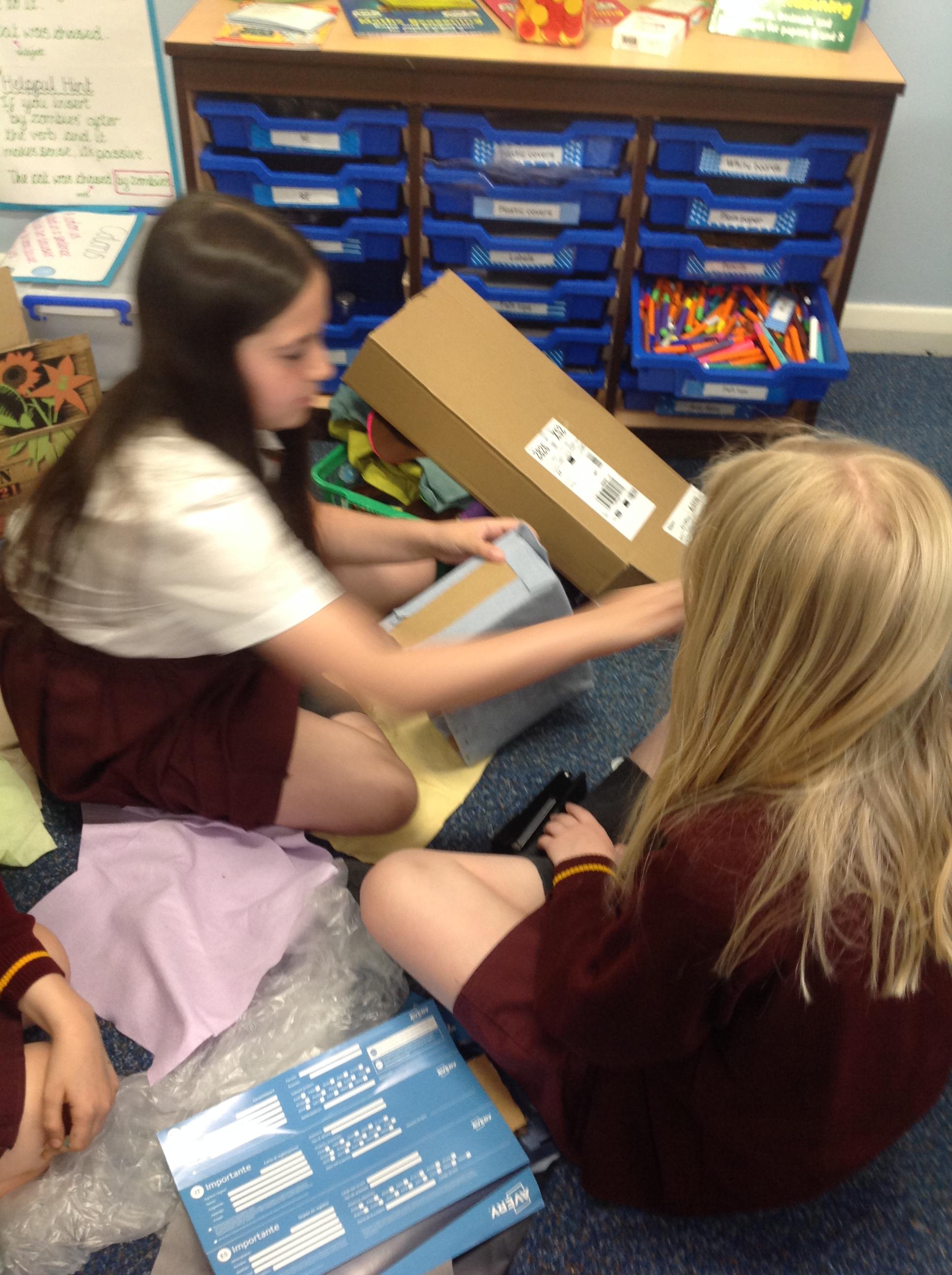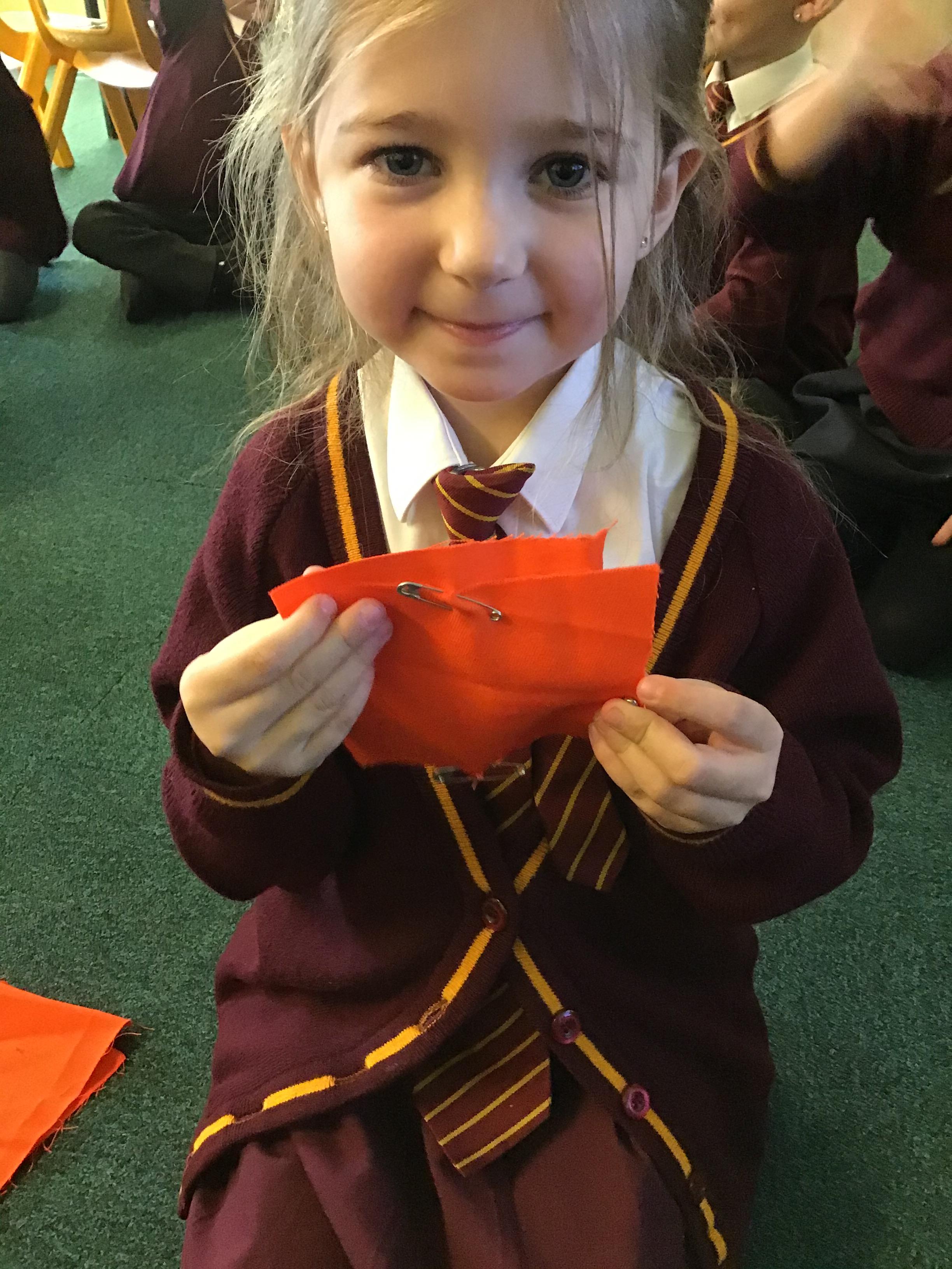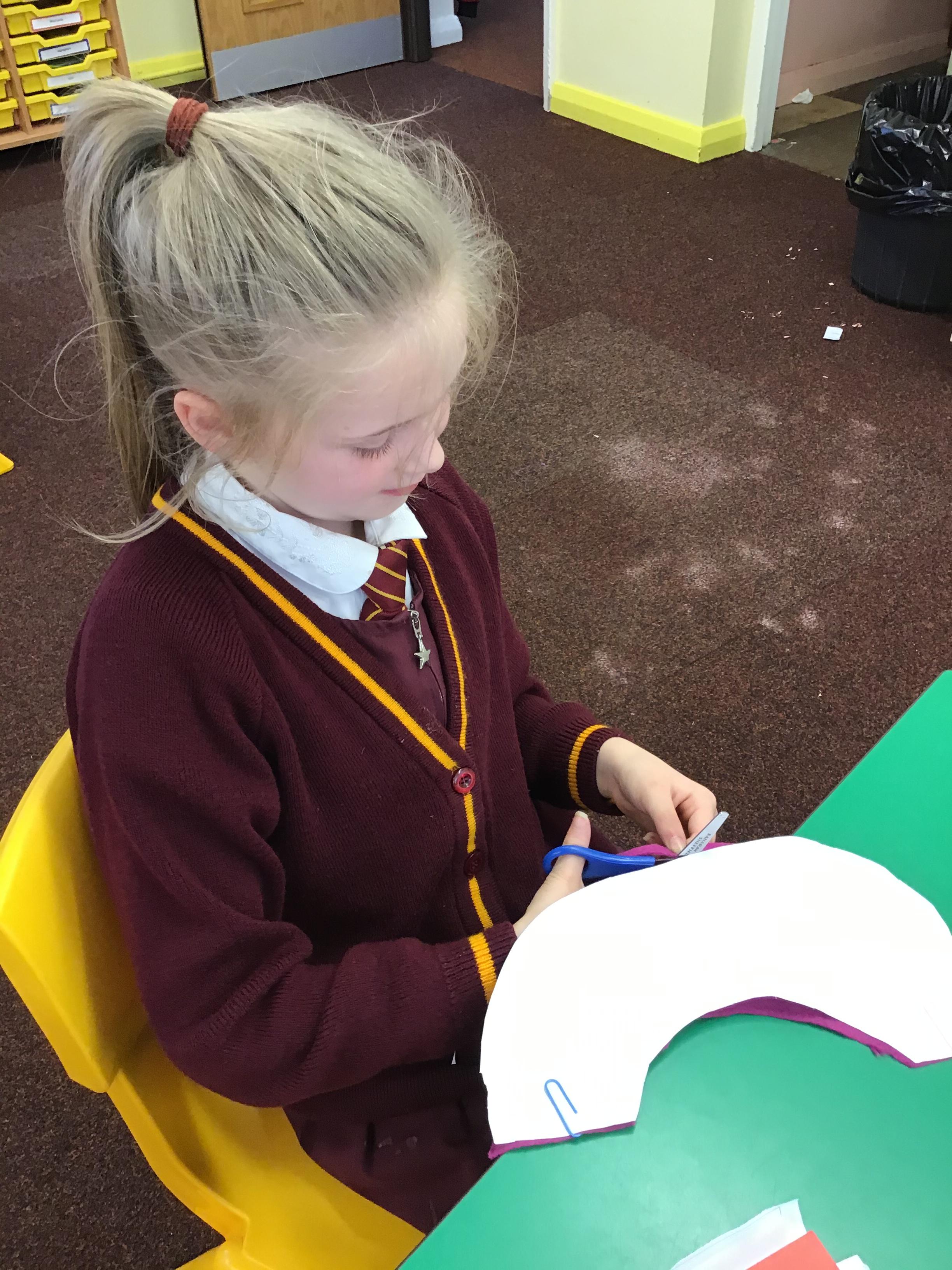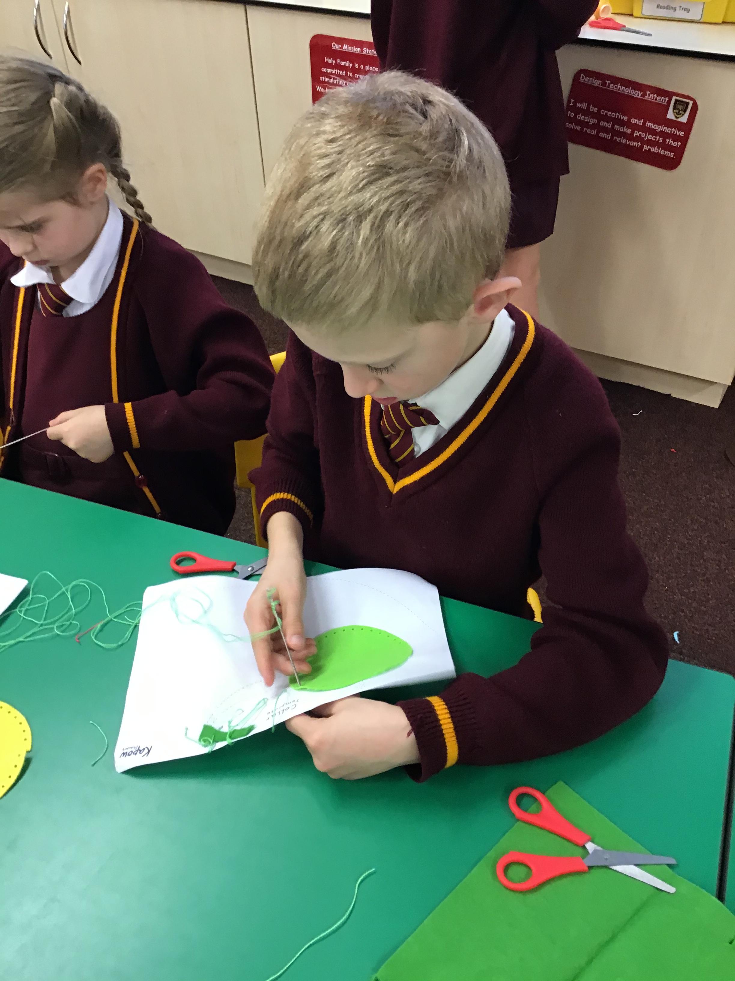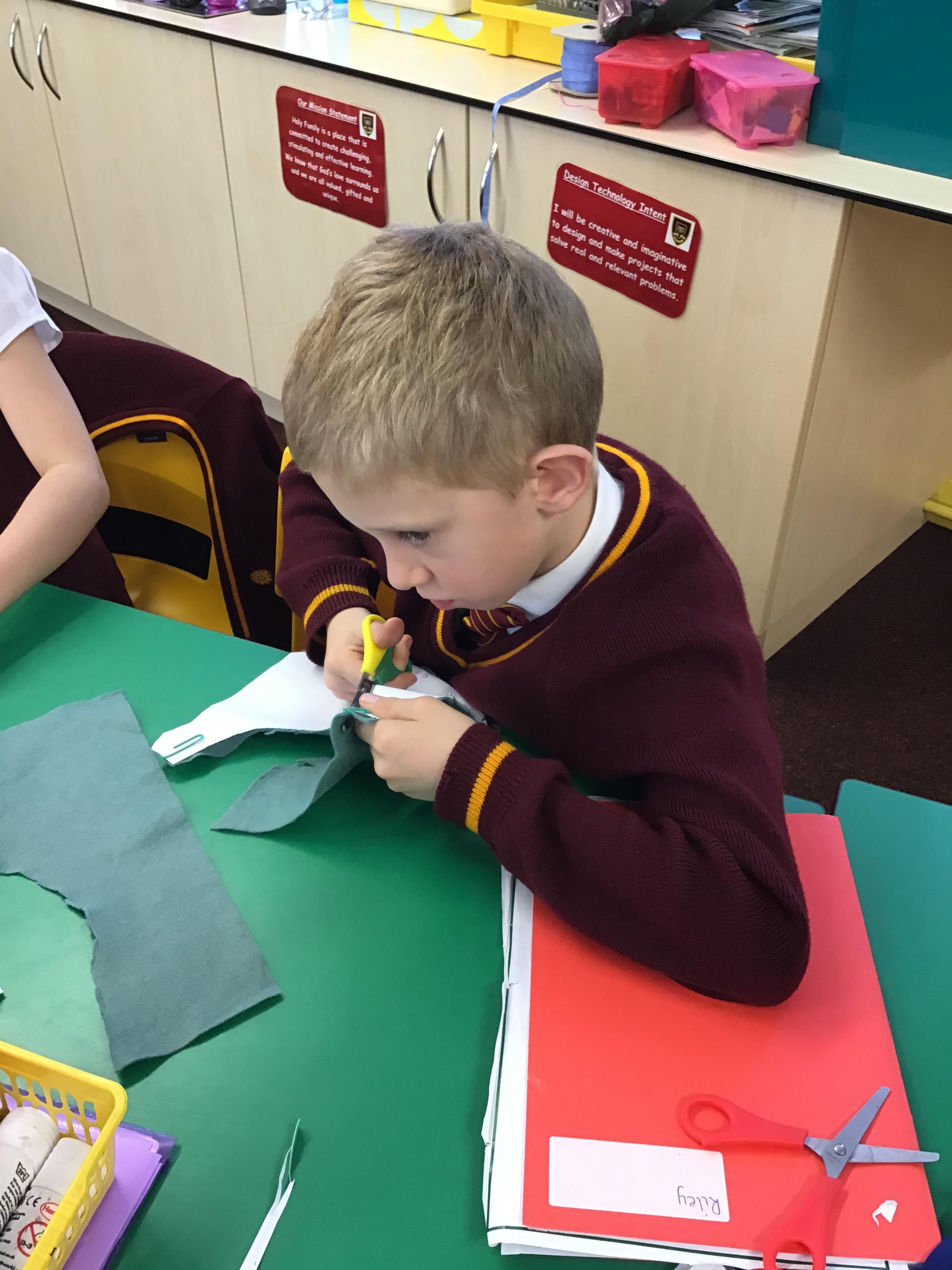 In year 3, children have been assembling the fabric parts into a fabric product. The children have used a template and pins to cut the fabric accurately.
