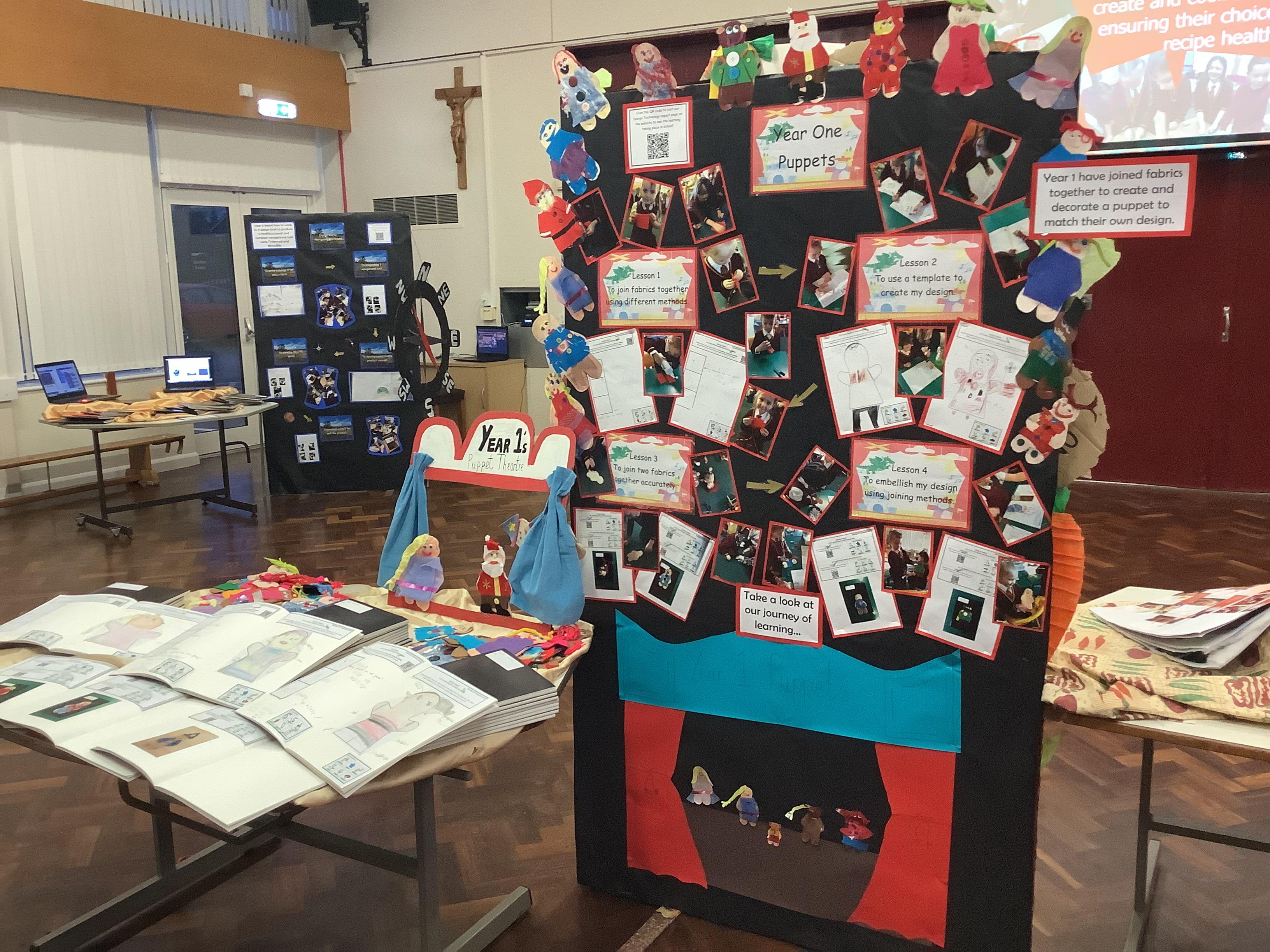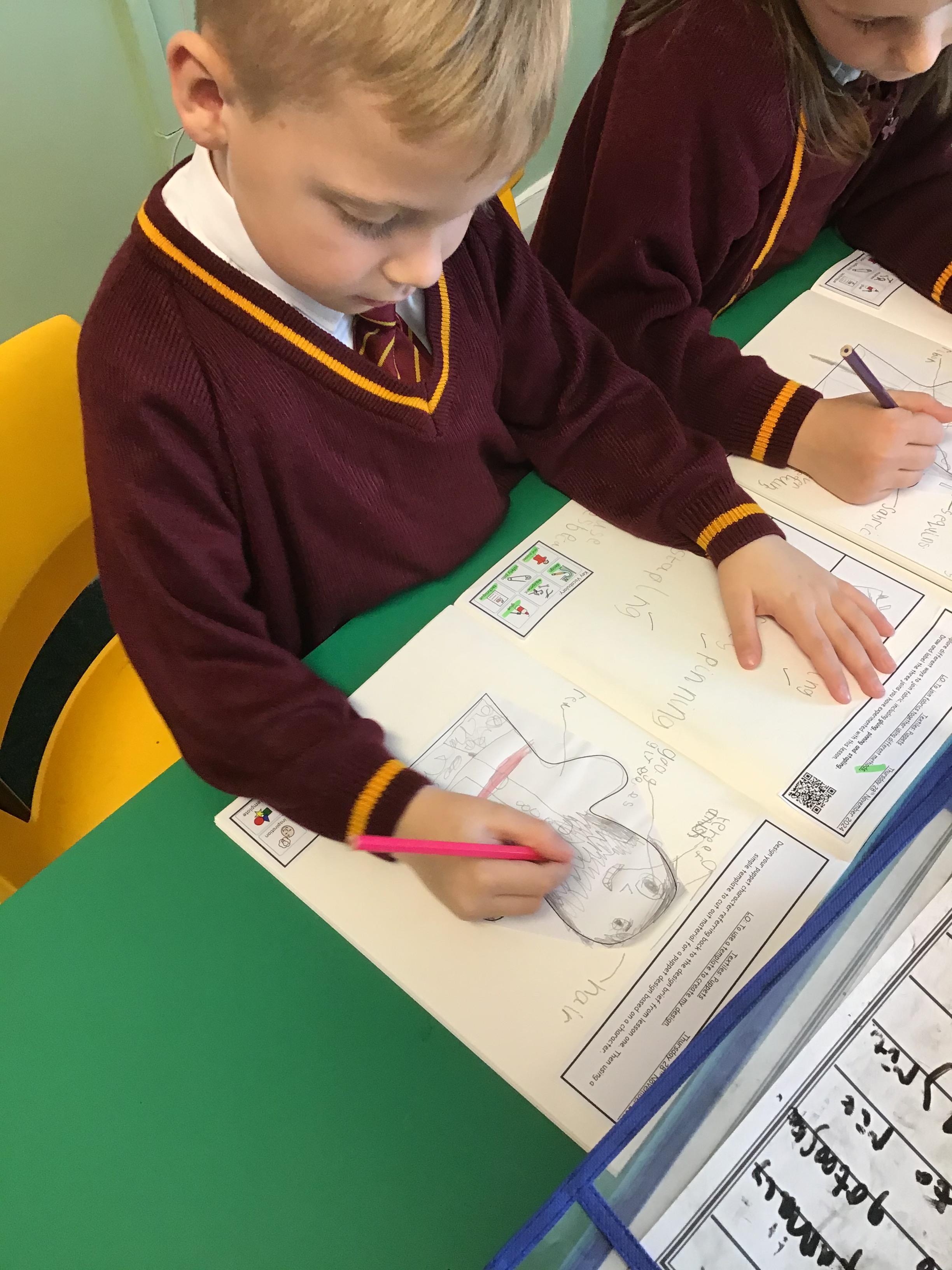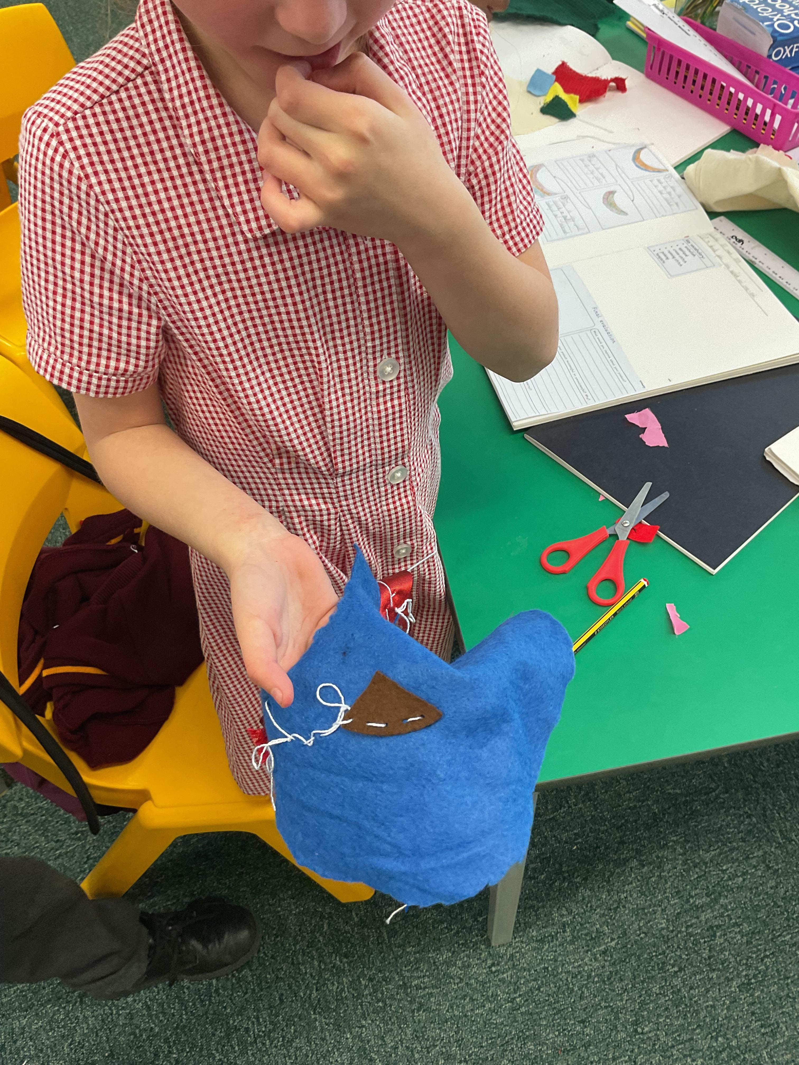 Year 1 explored different ways to join fabric. They looked at safety pinning, stapling and gluing. They designed their own puppets and used their designs to decorate their puppets.