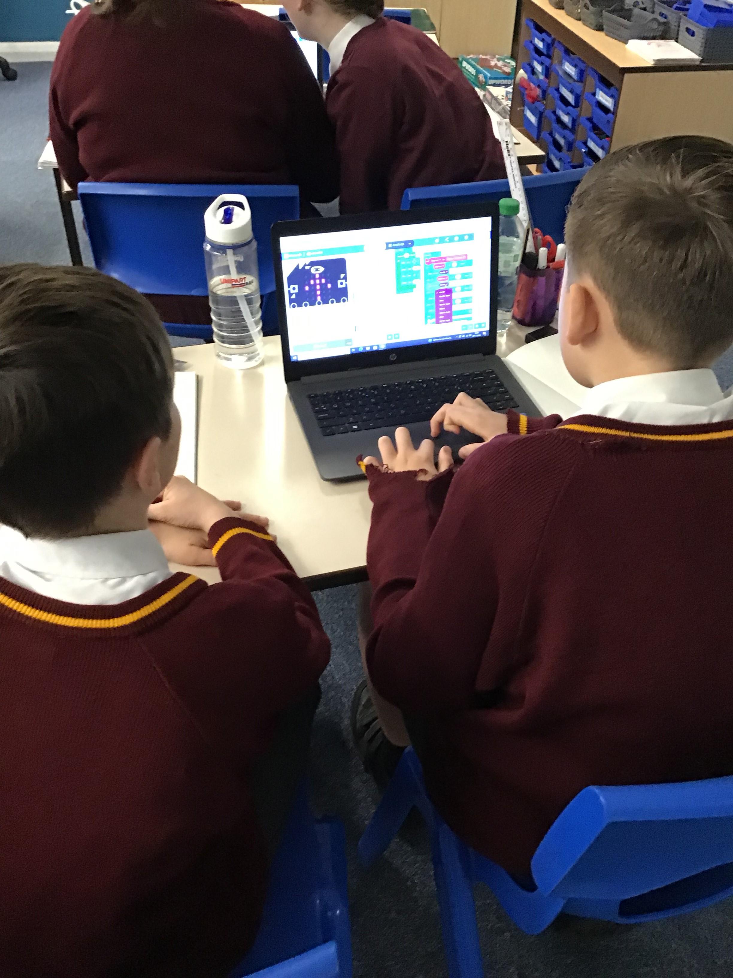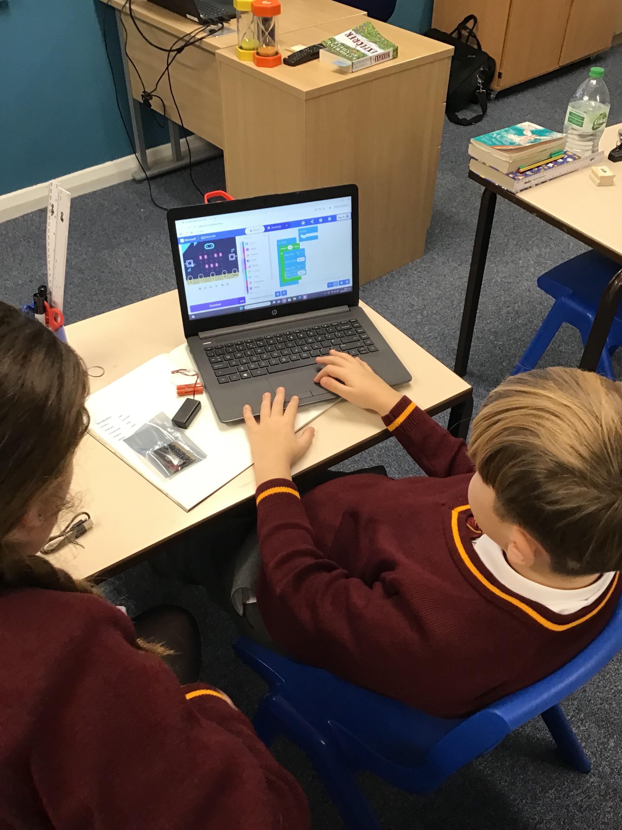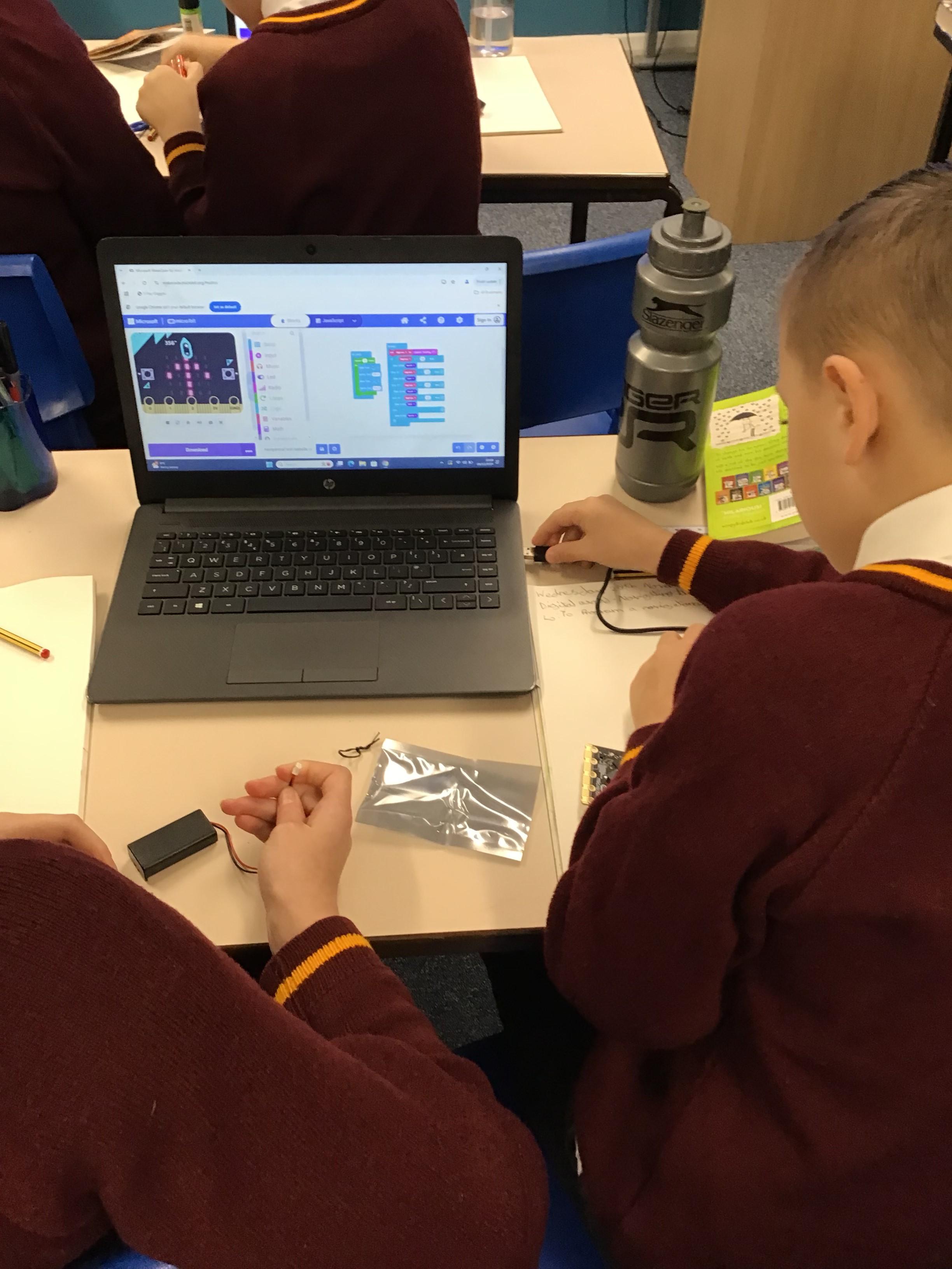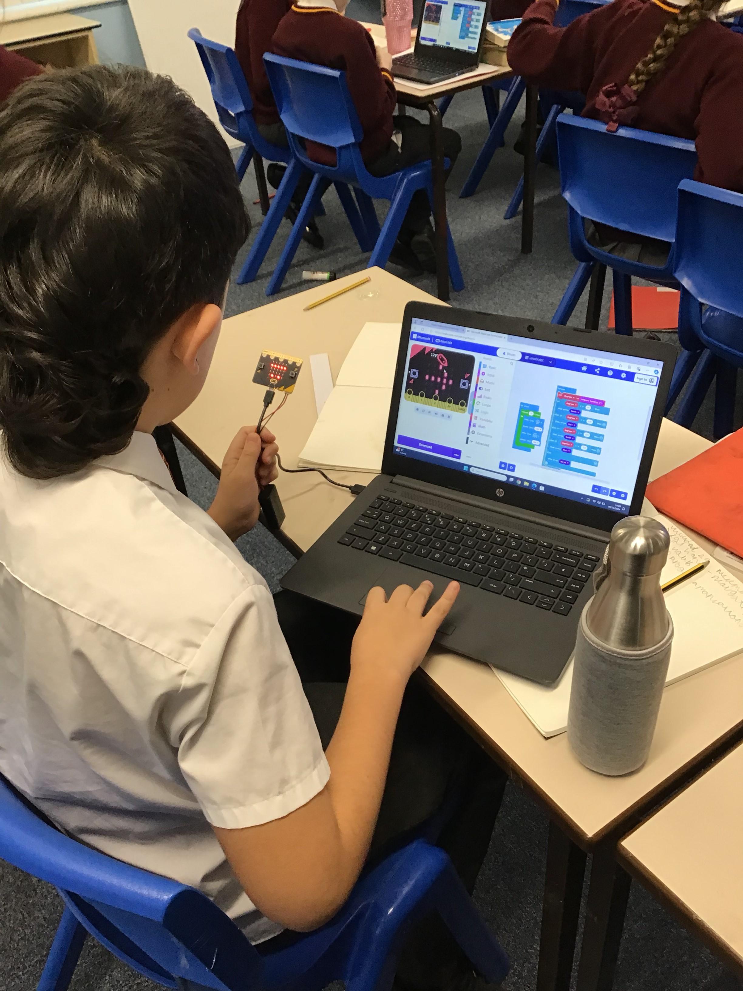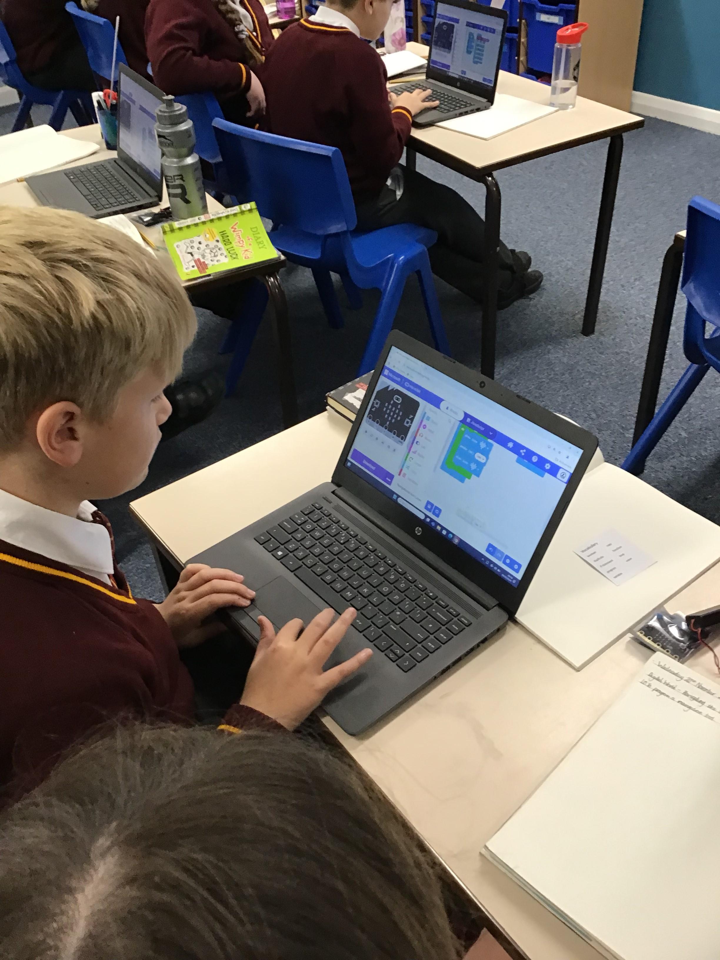 The children in year 5 were learning how to write a program to instruct a micro:bit to monitor movement, including an alert in the event of an earthquake.