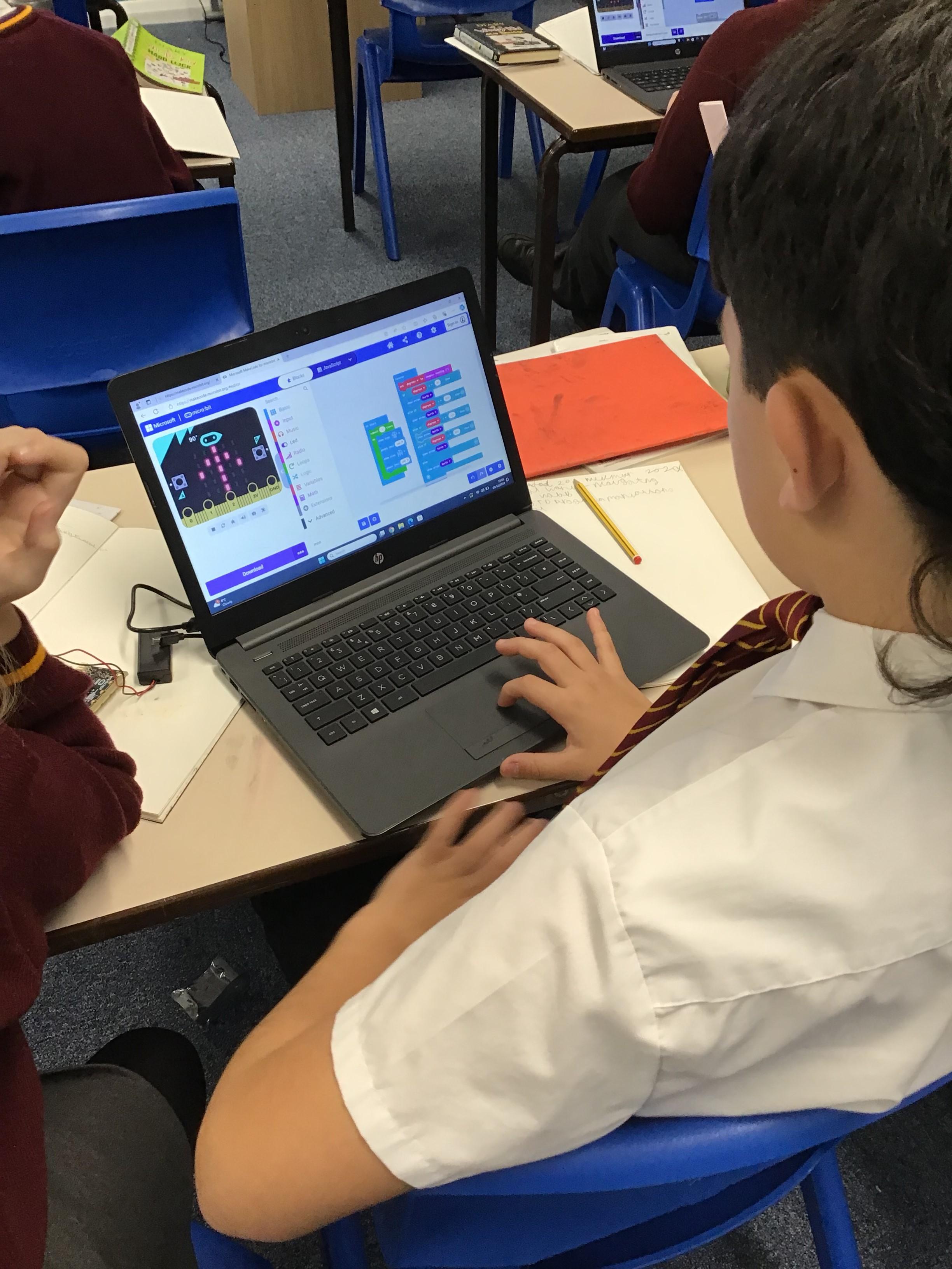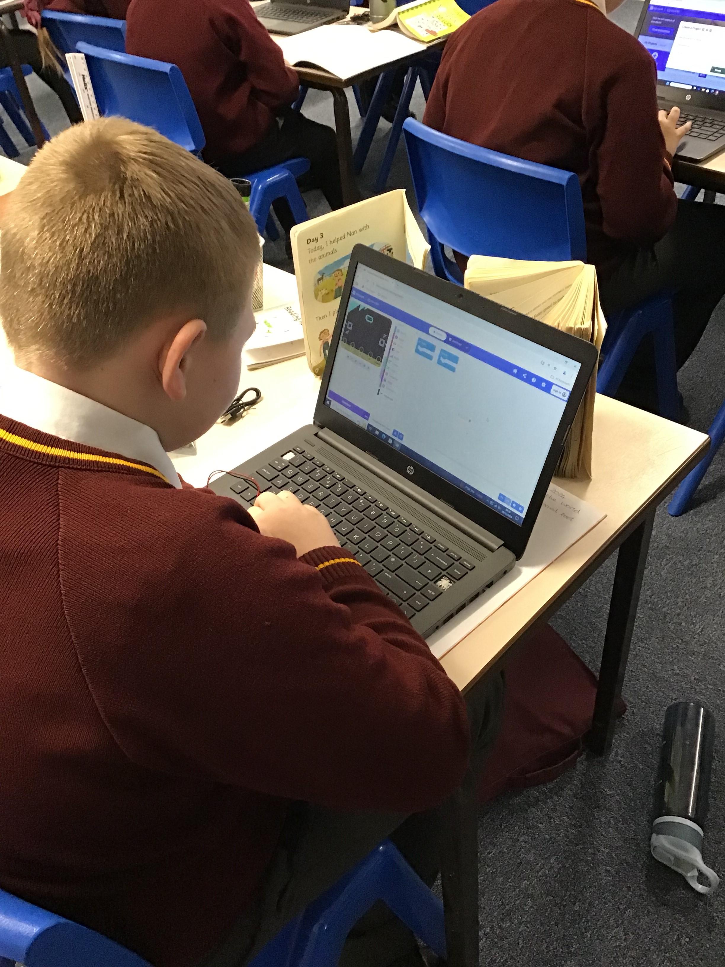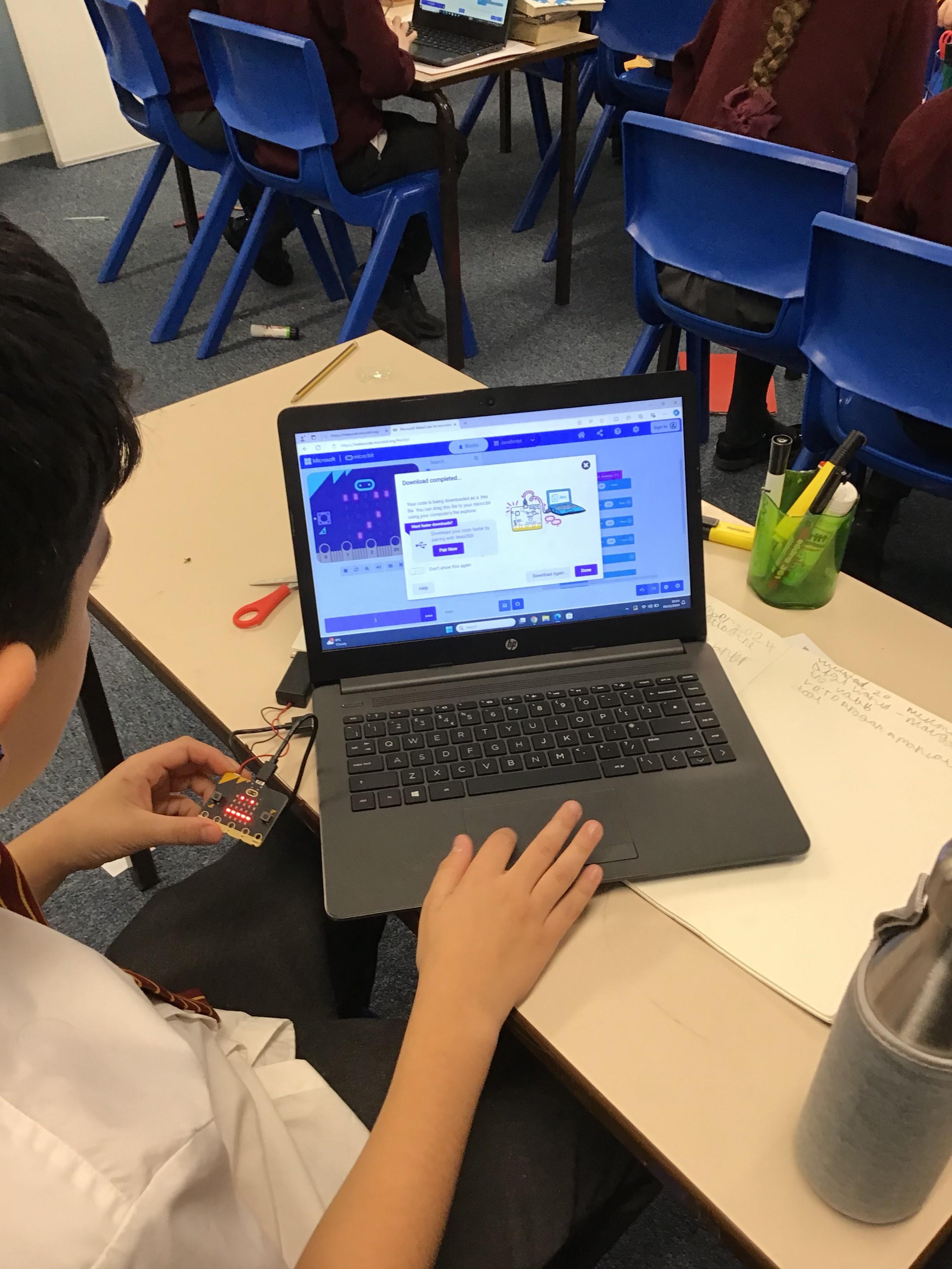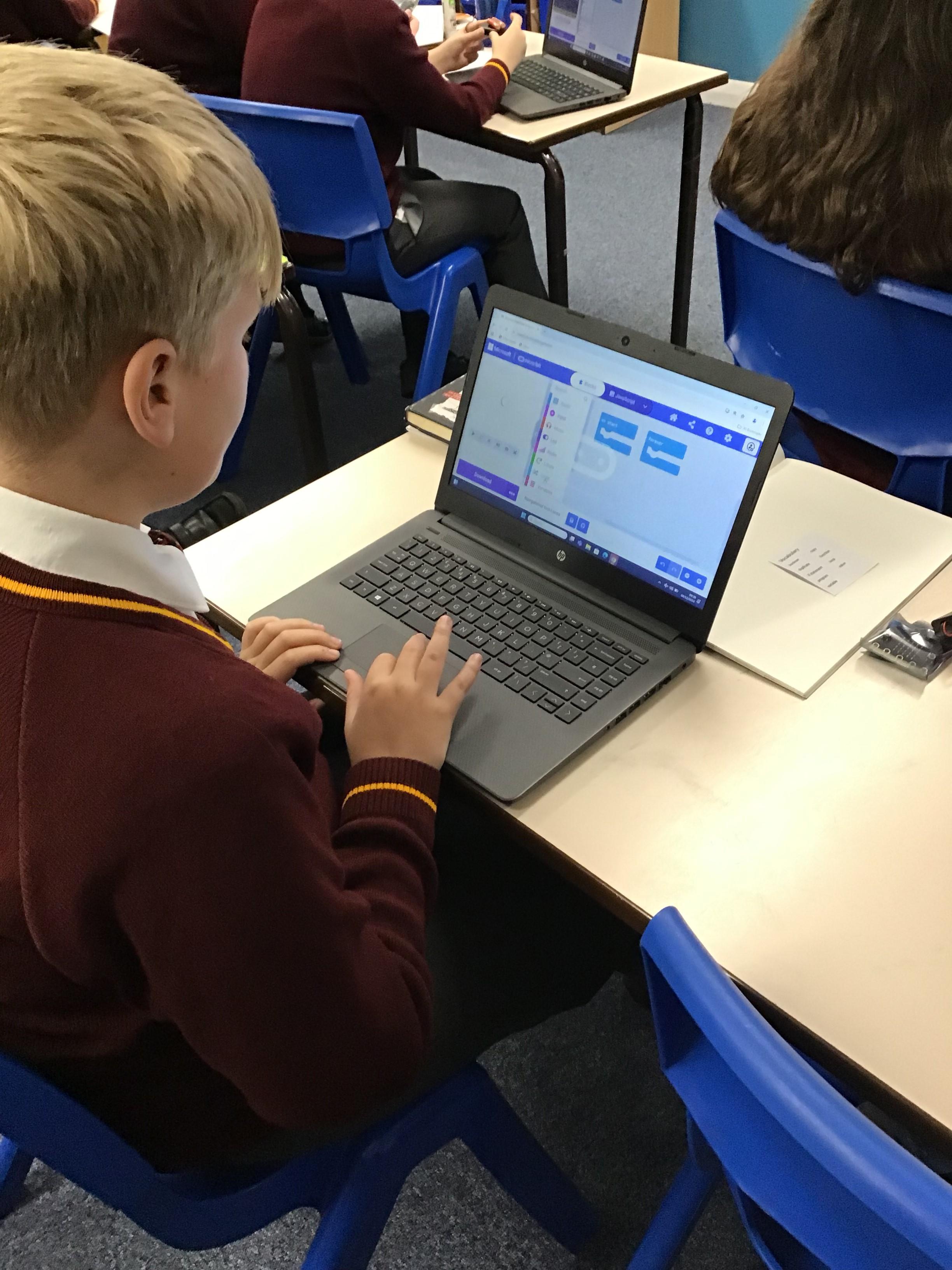The children in year 5 were learning how to write a program to instruct a micro:bit to monitor movement, including an alert in the event of an earthquake.