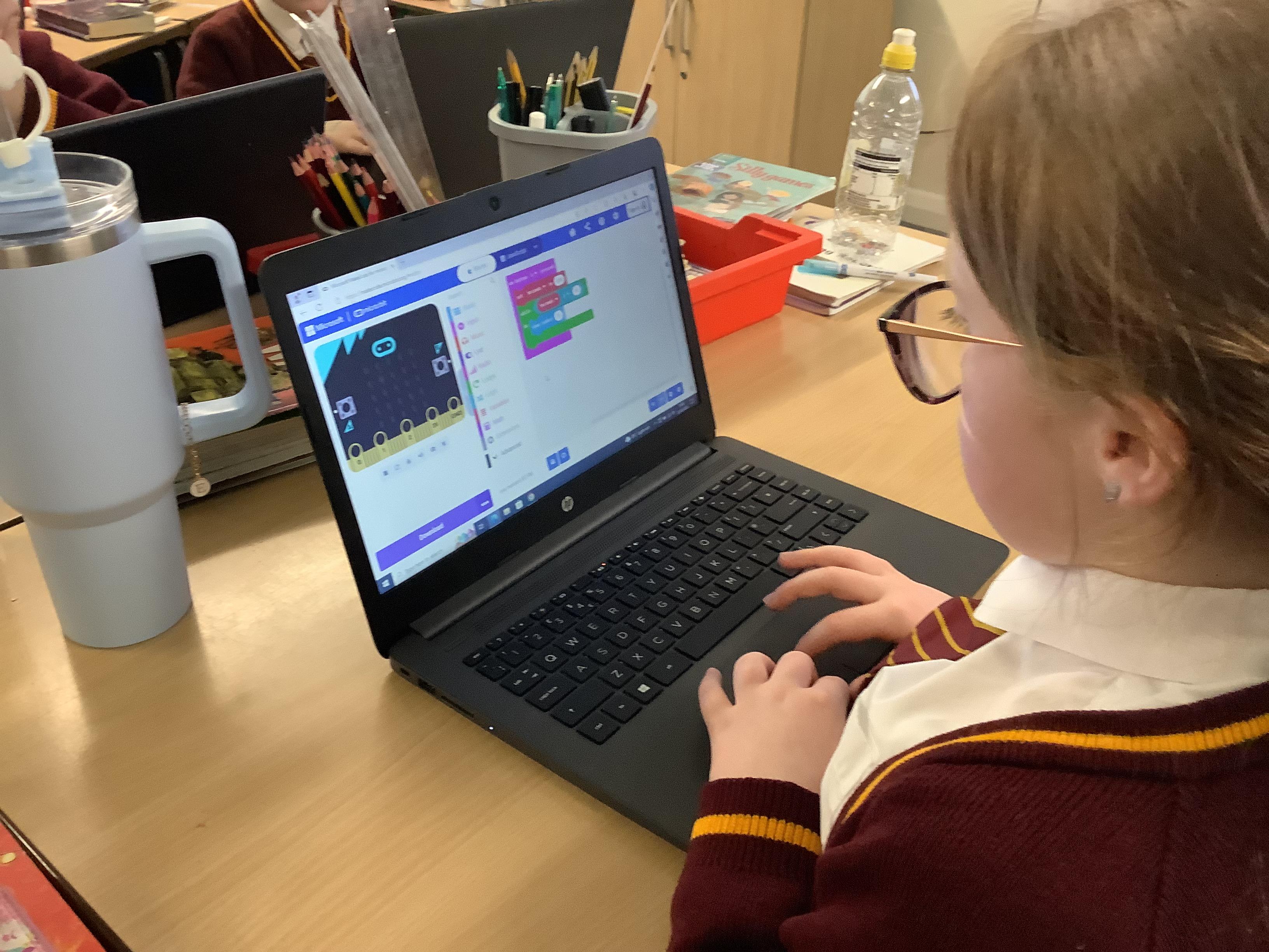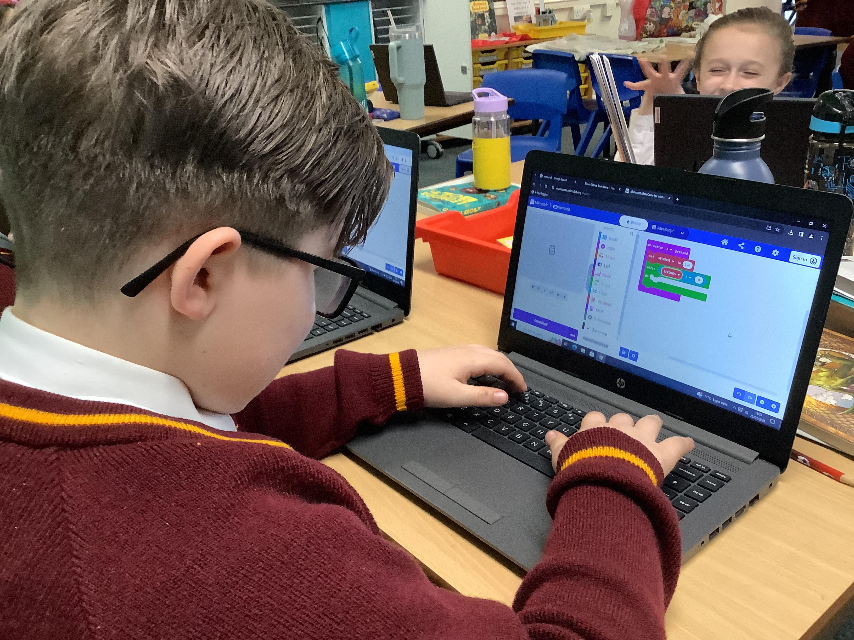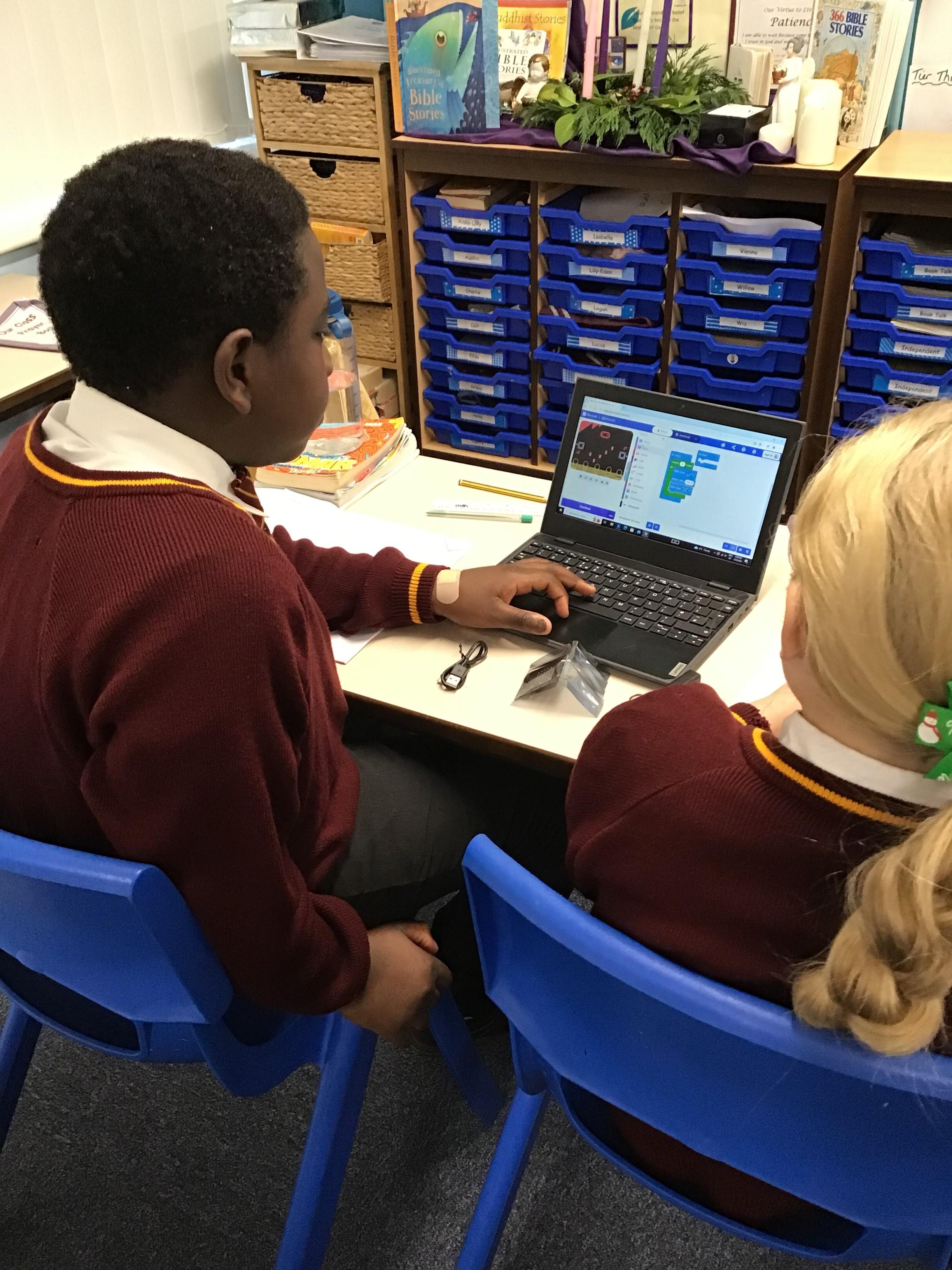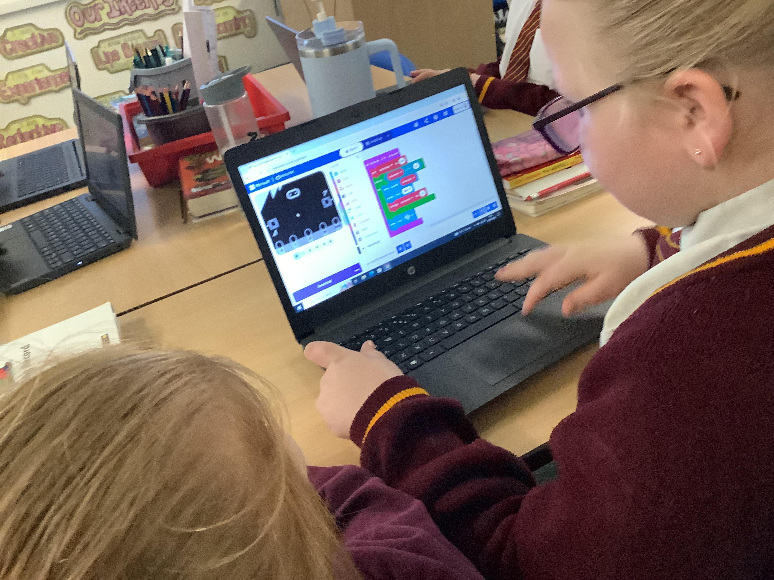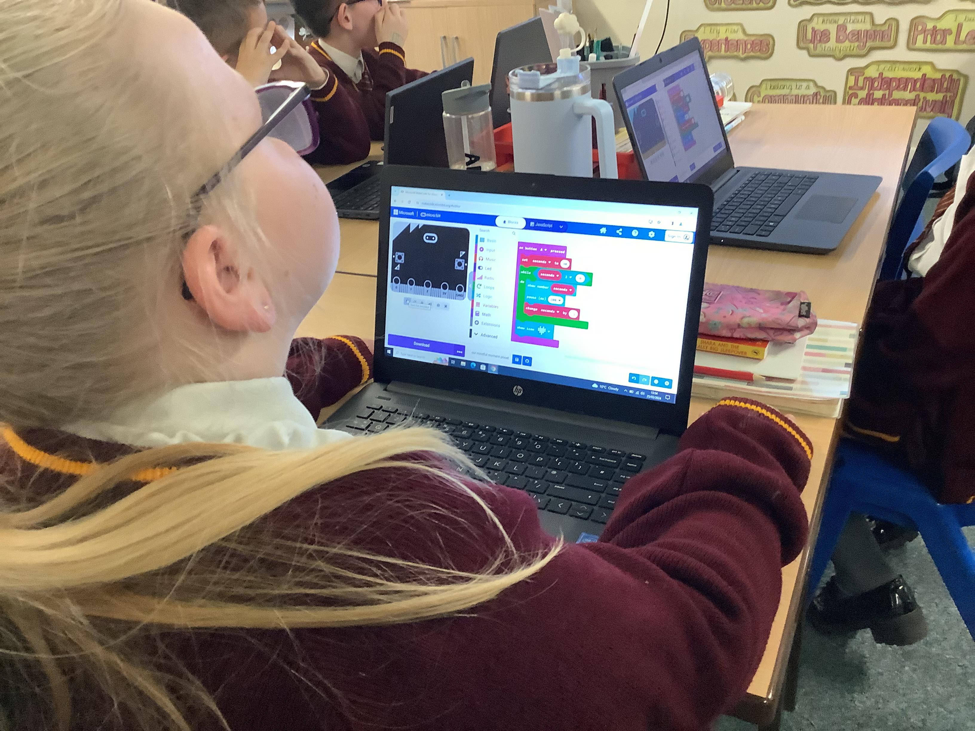 The children in year 5 were learning how to write a program to instruct a micro:bit to monitor movement, including an alert in the event of an earthquake.