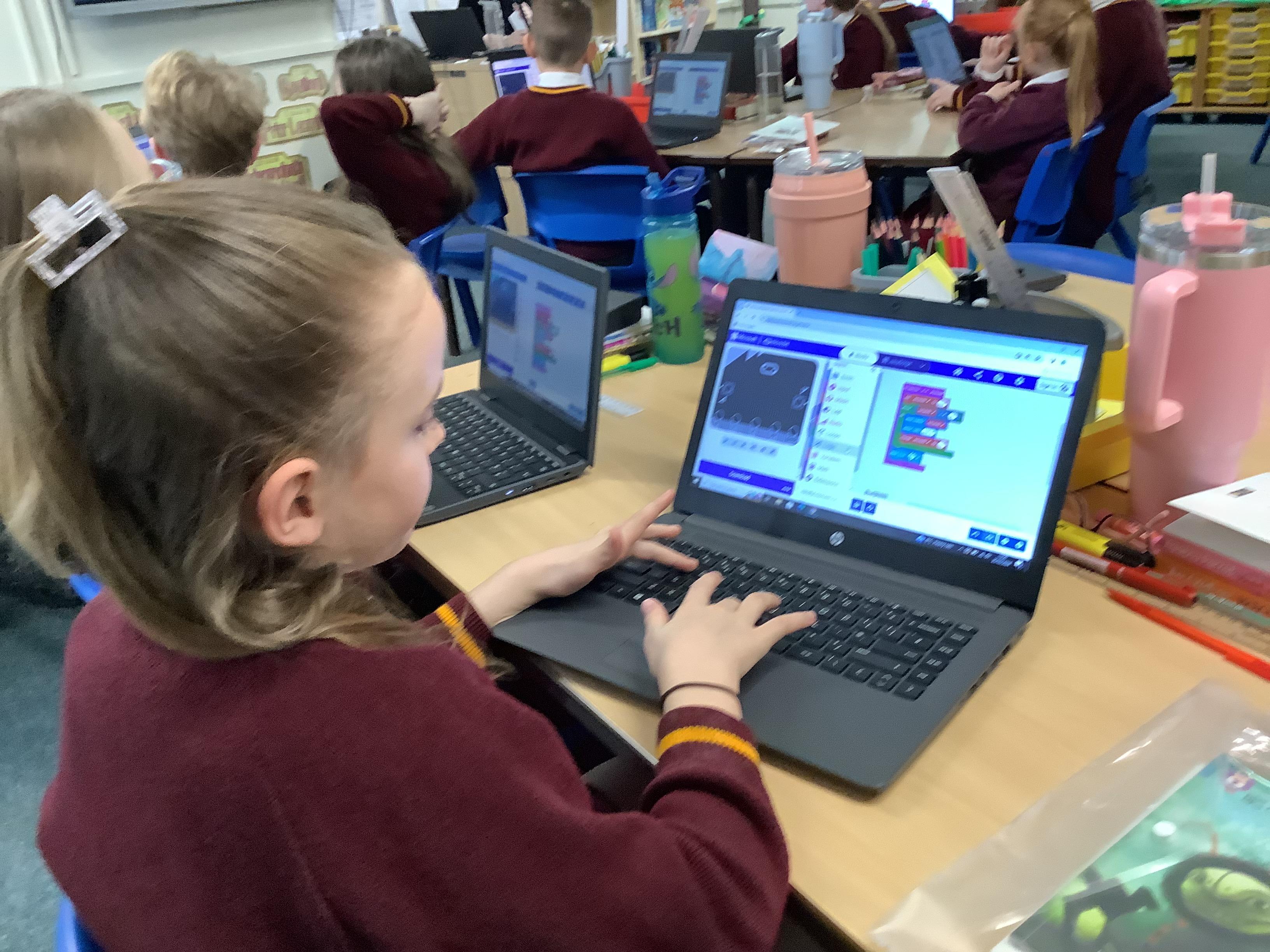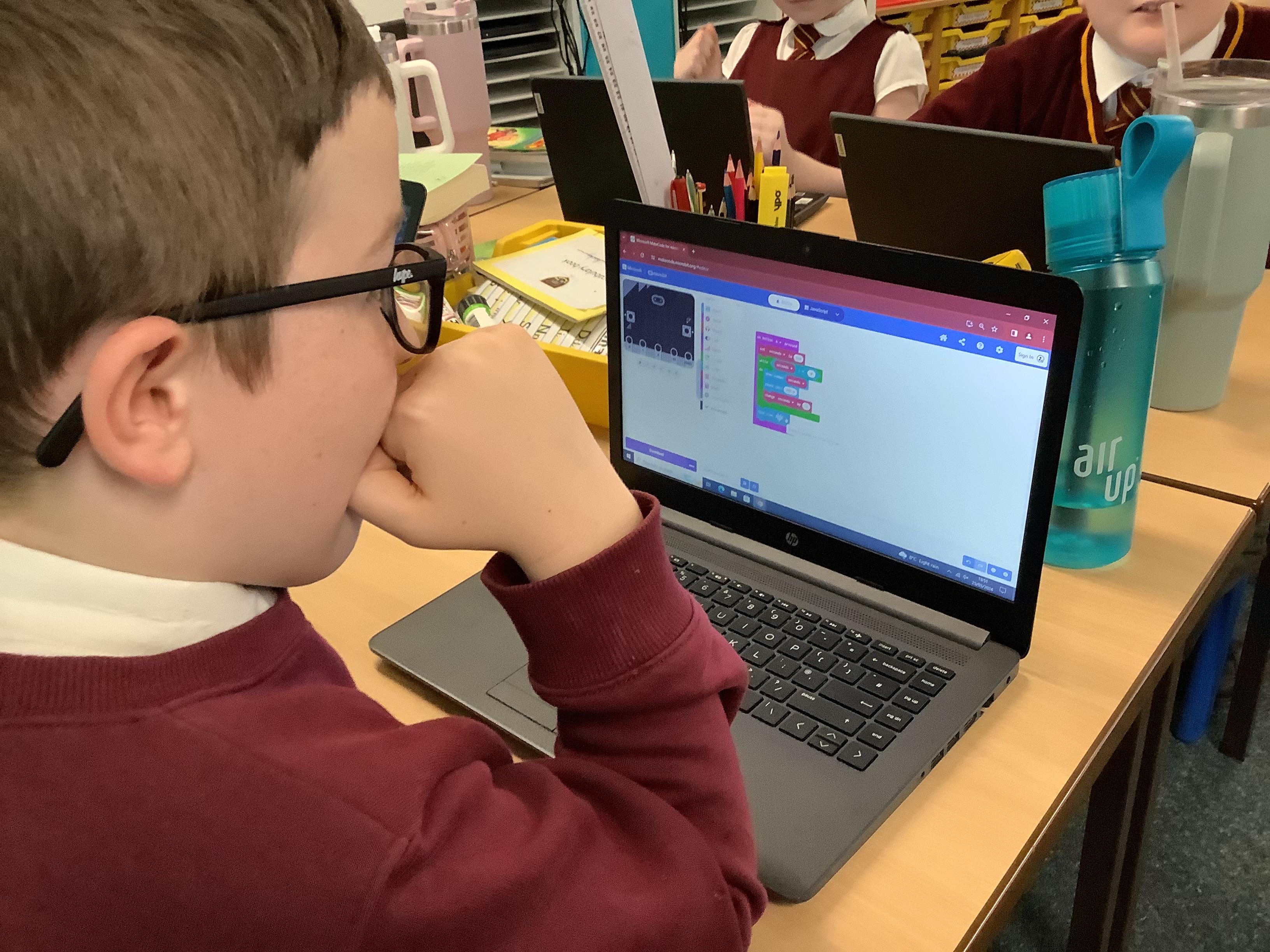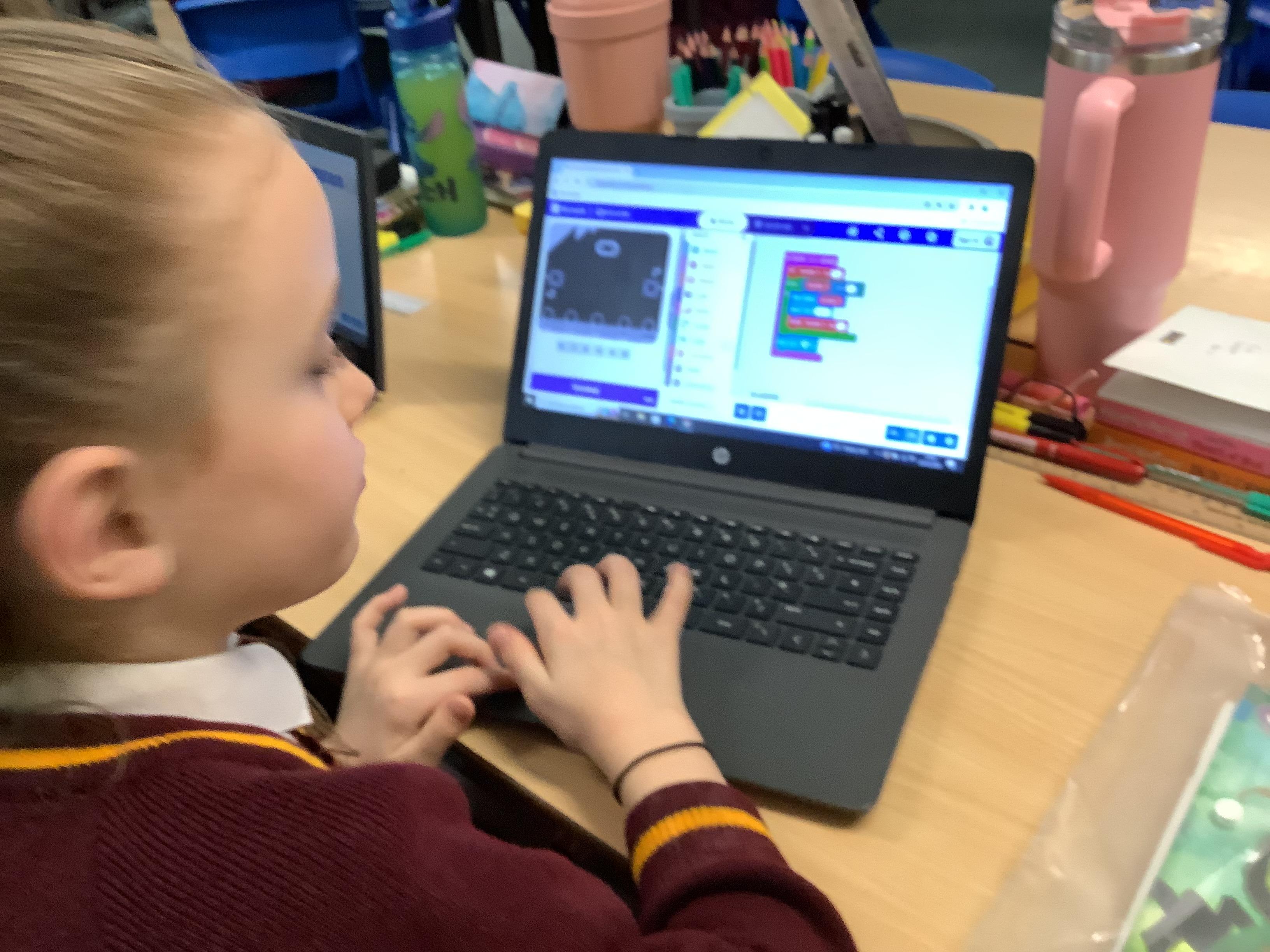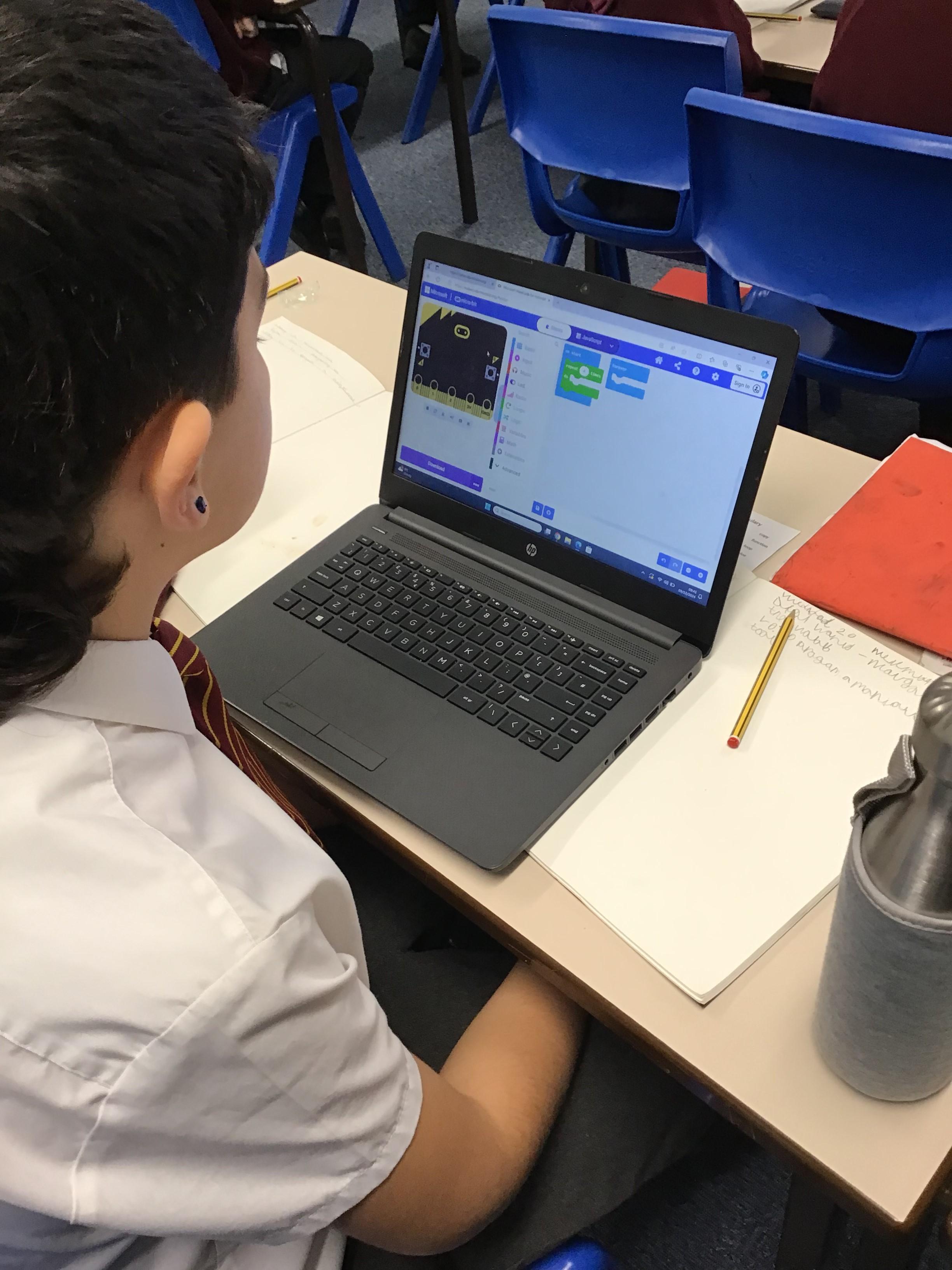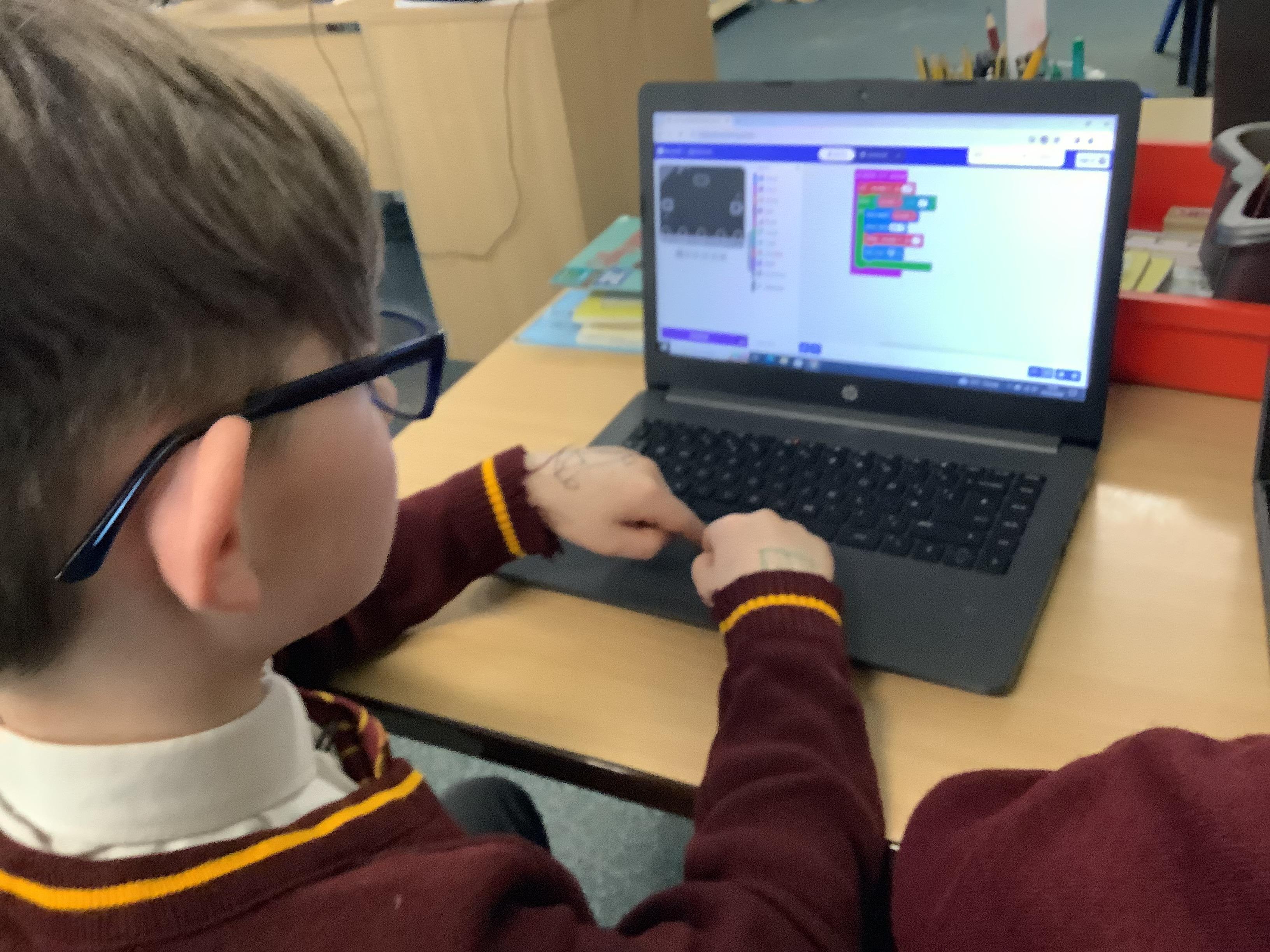 The children in year 5 were learning how to write a program to instruct a micro:bit to monitor movement, including an alert in the event of an earthquake.