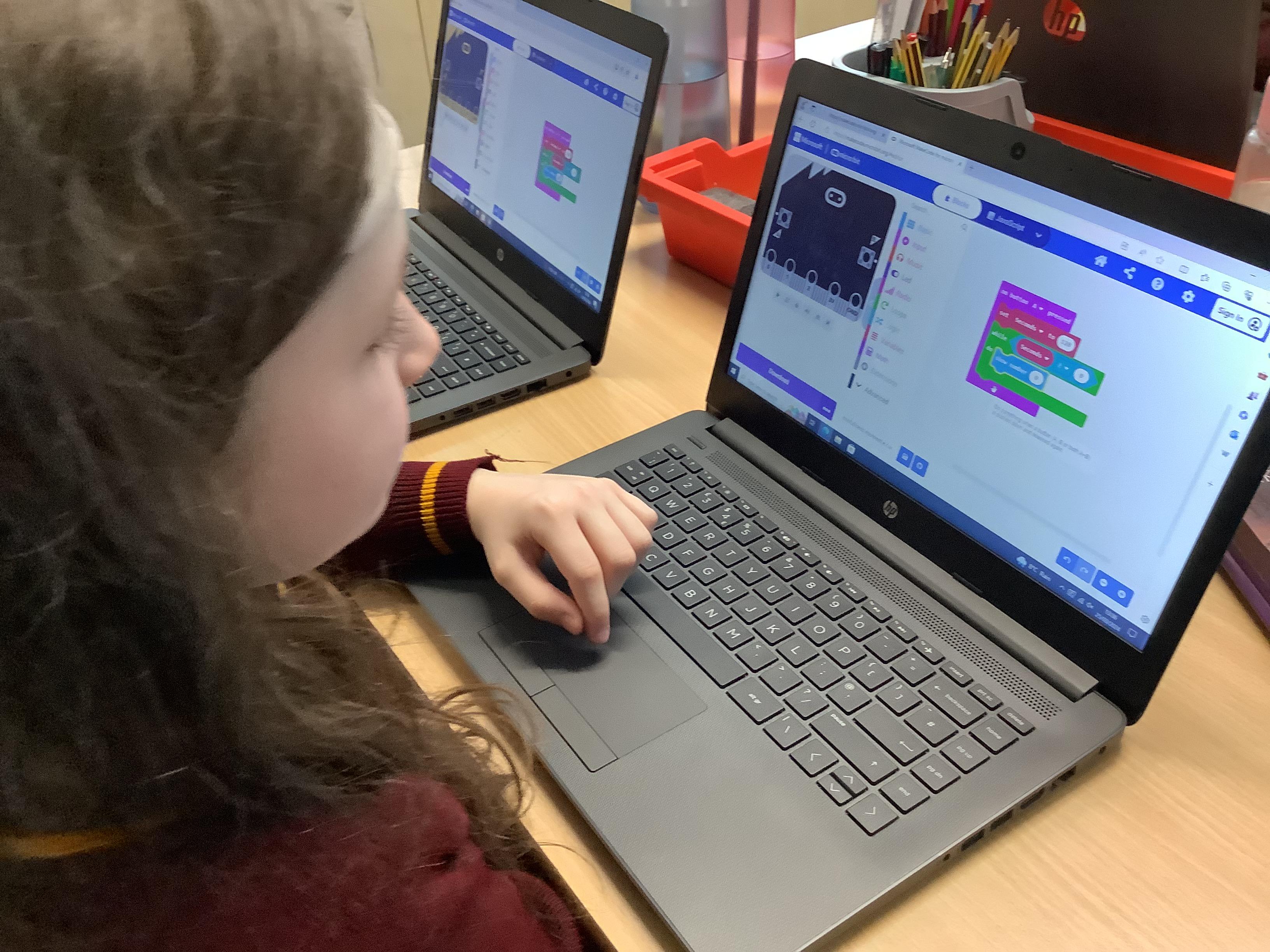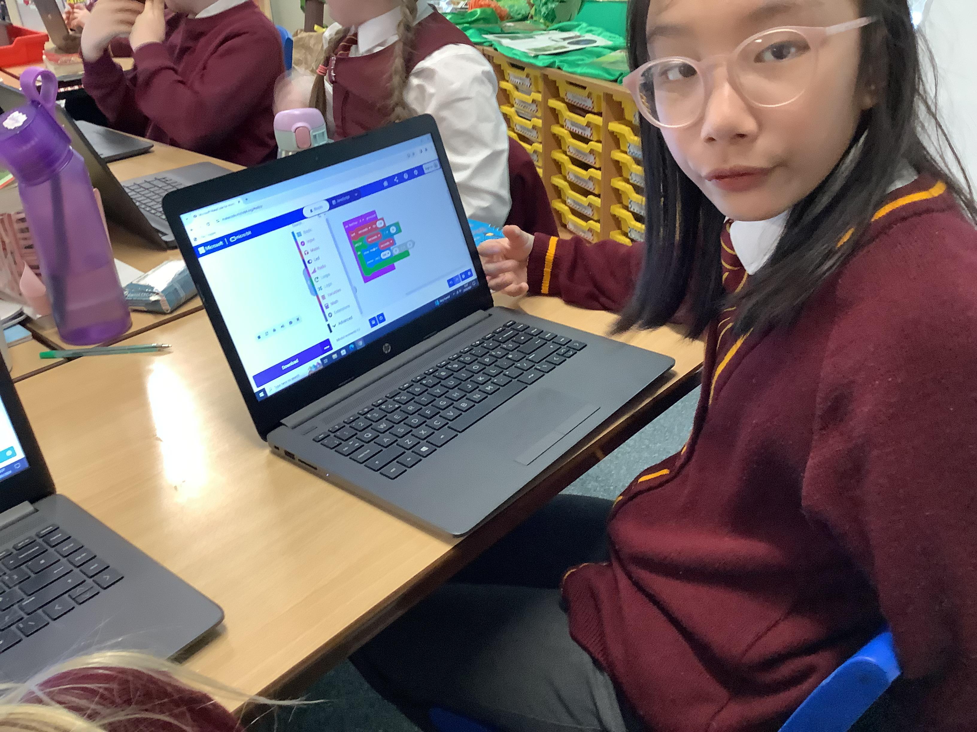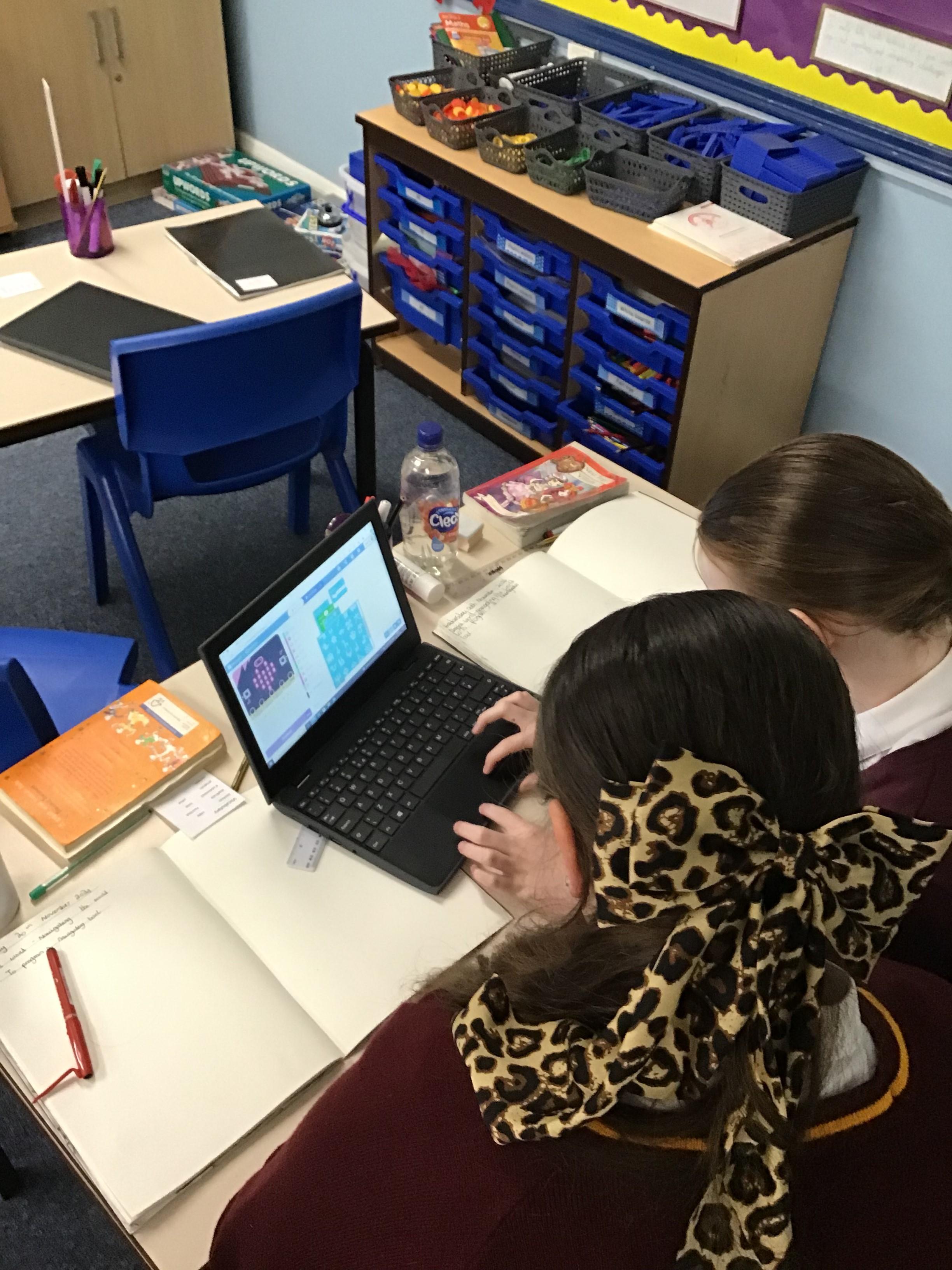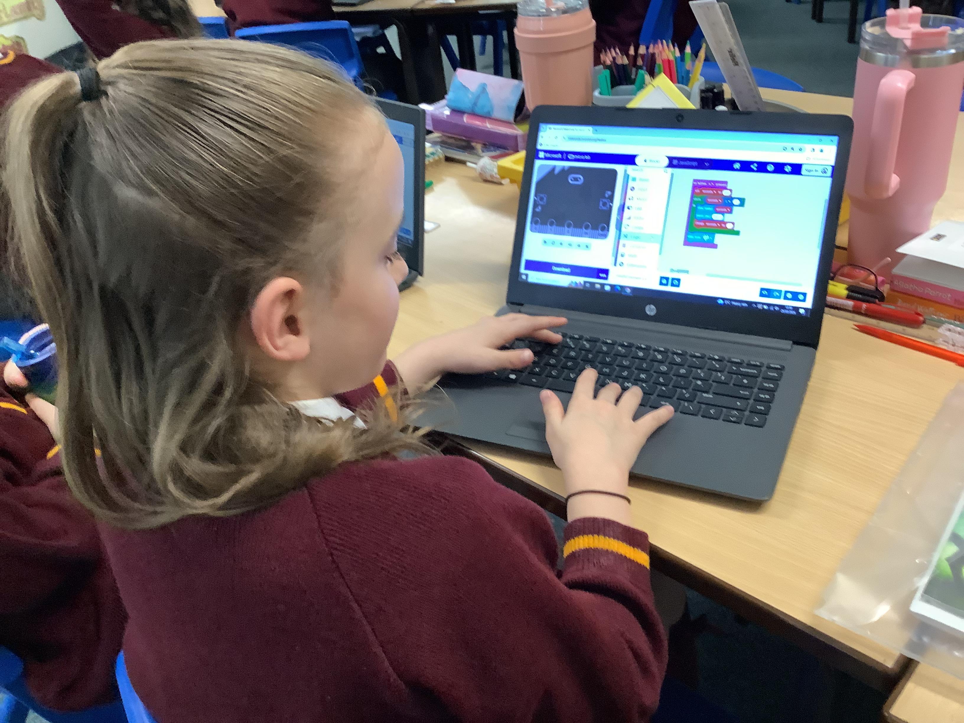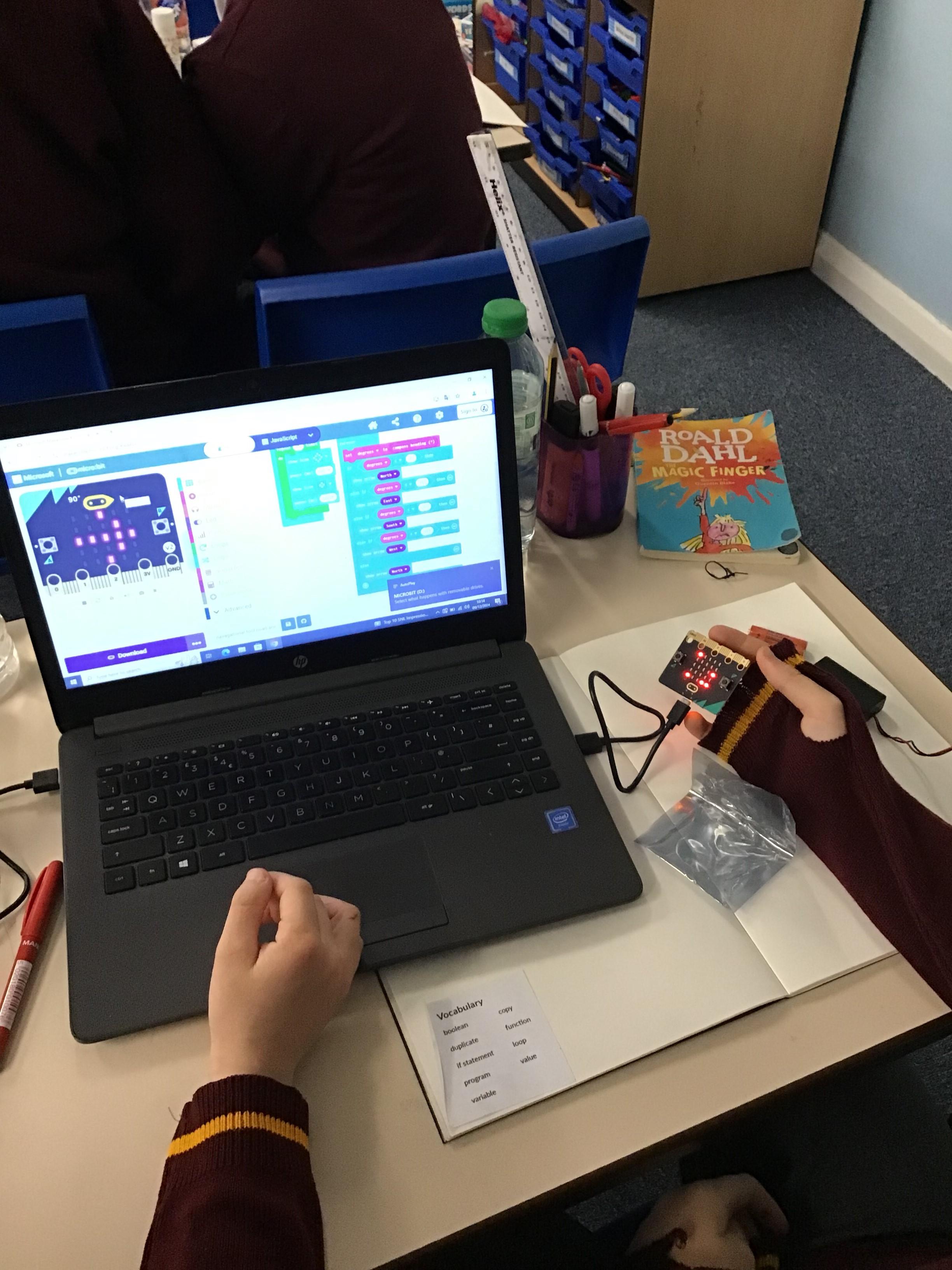 The children in year 5 were learning how to write a program to instruct a micro:bit to monitor movement, including an alert in the event of an earthquake.