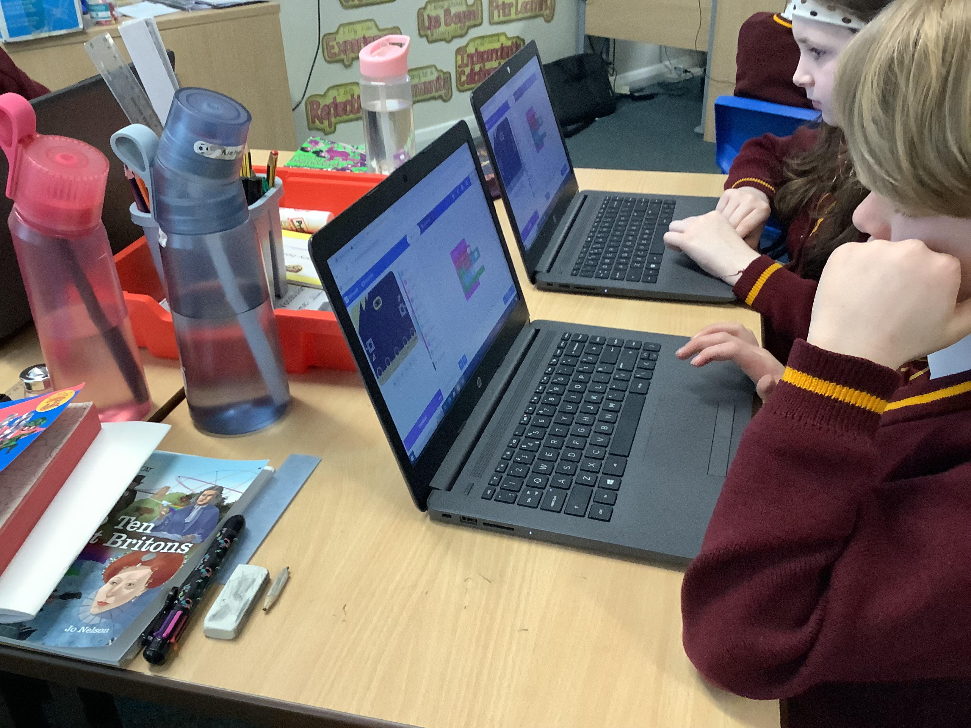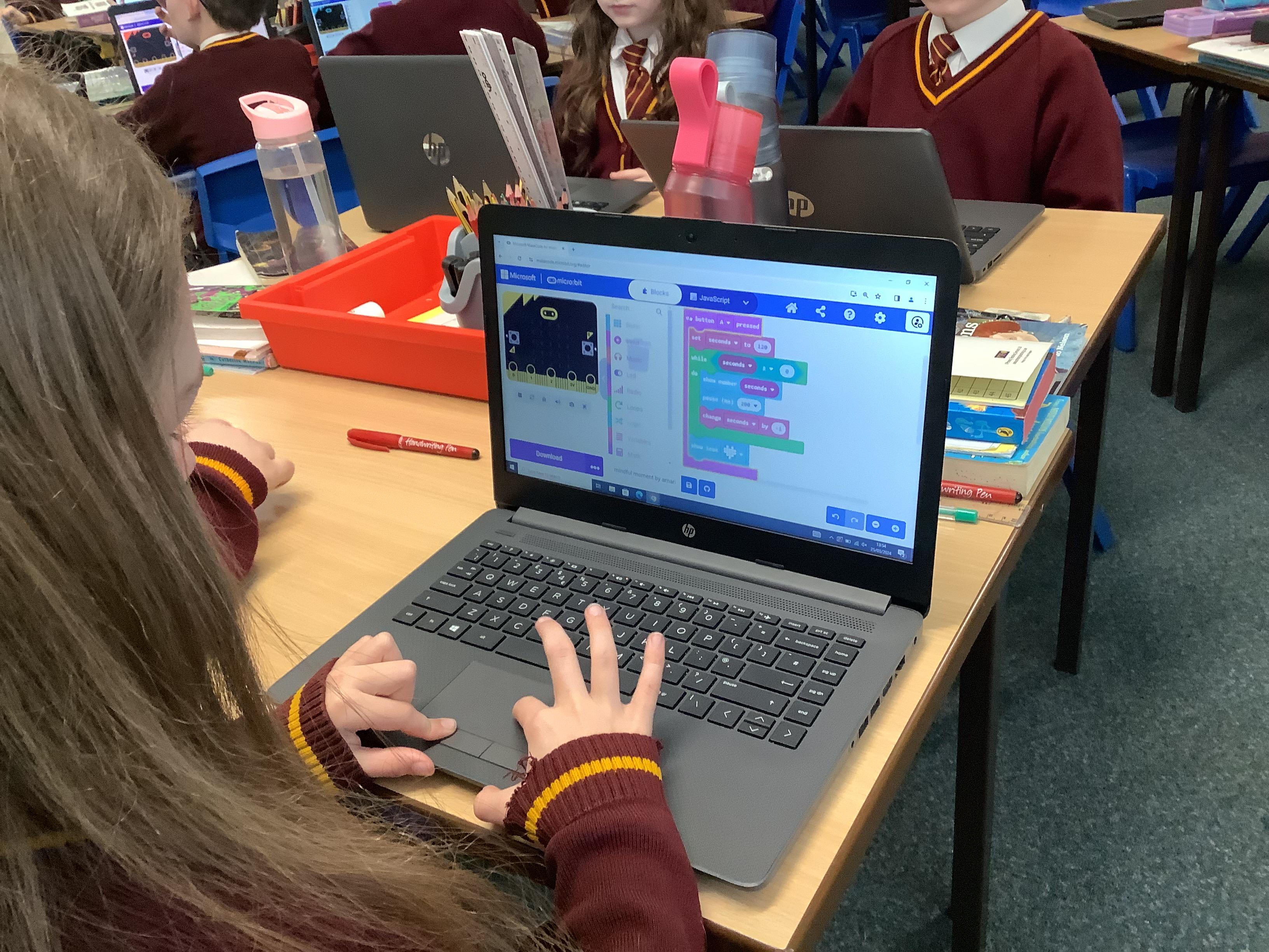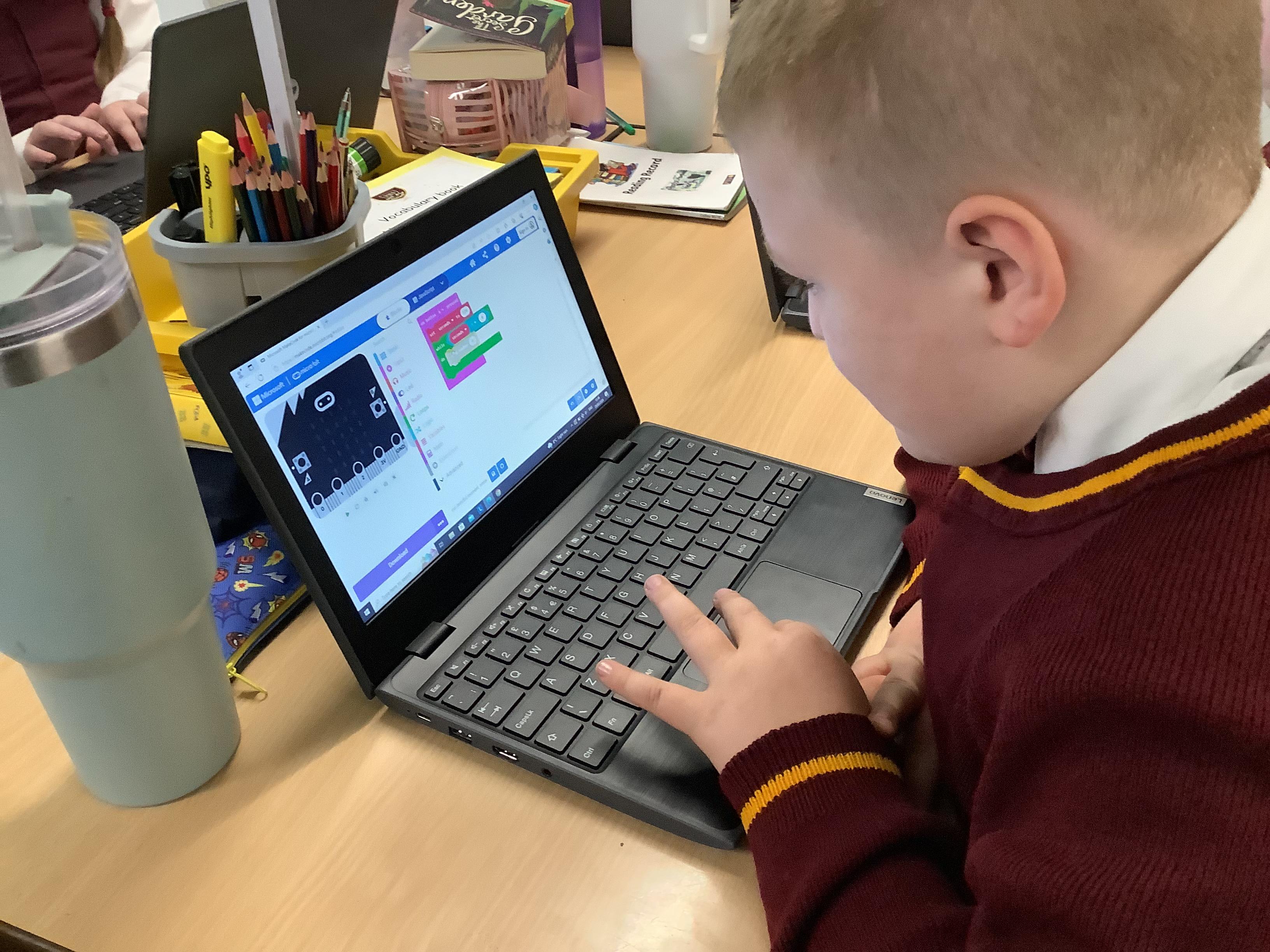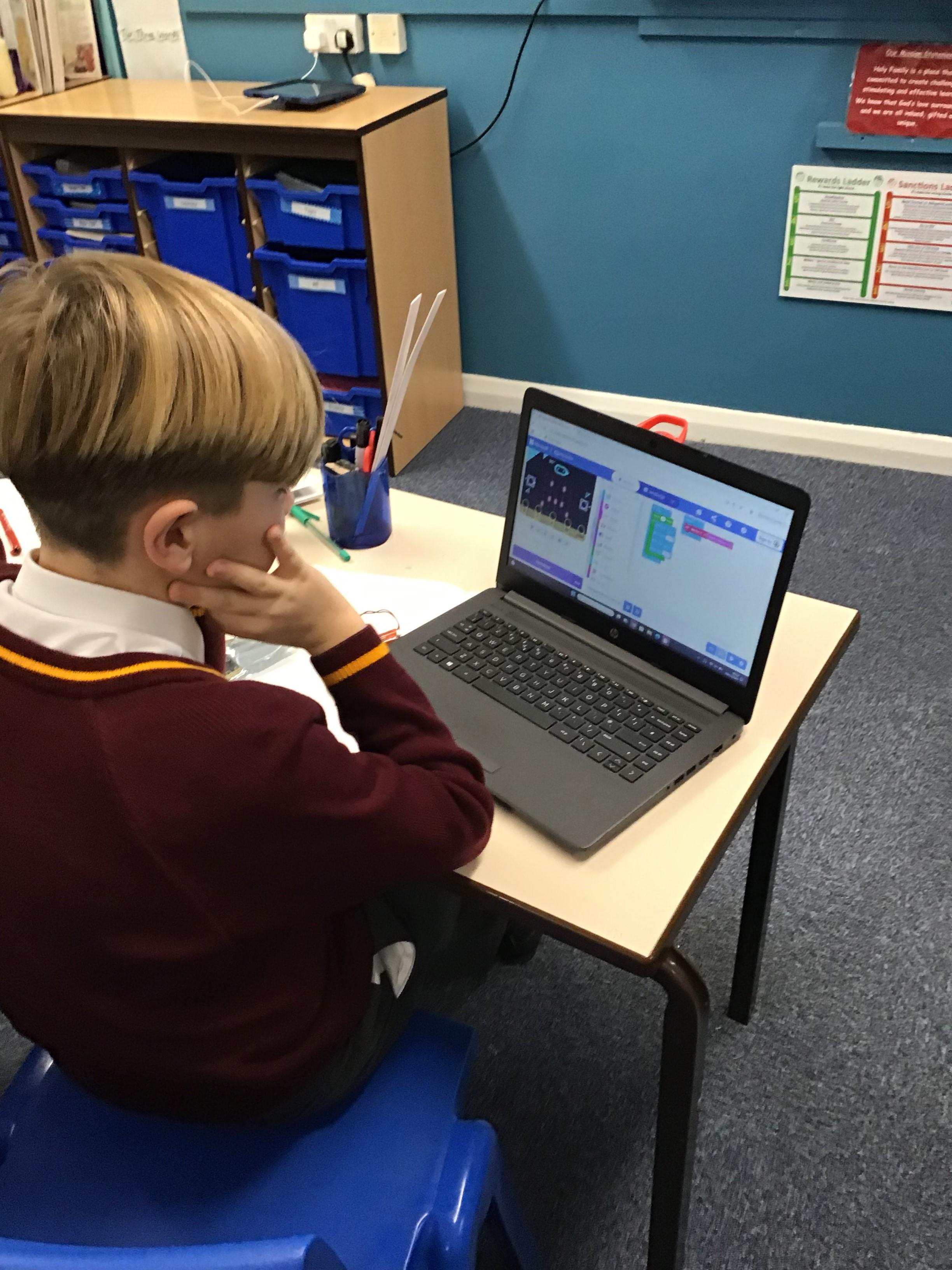 The children in year 5 were learning how to write a program to instruct a micro:bit to monitor movement, including an alert in the event of an earthquake.