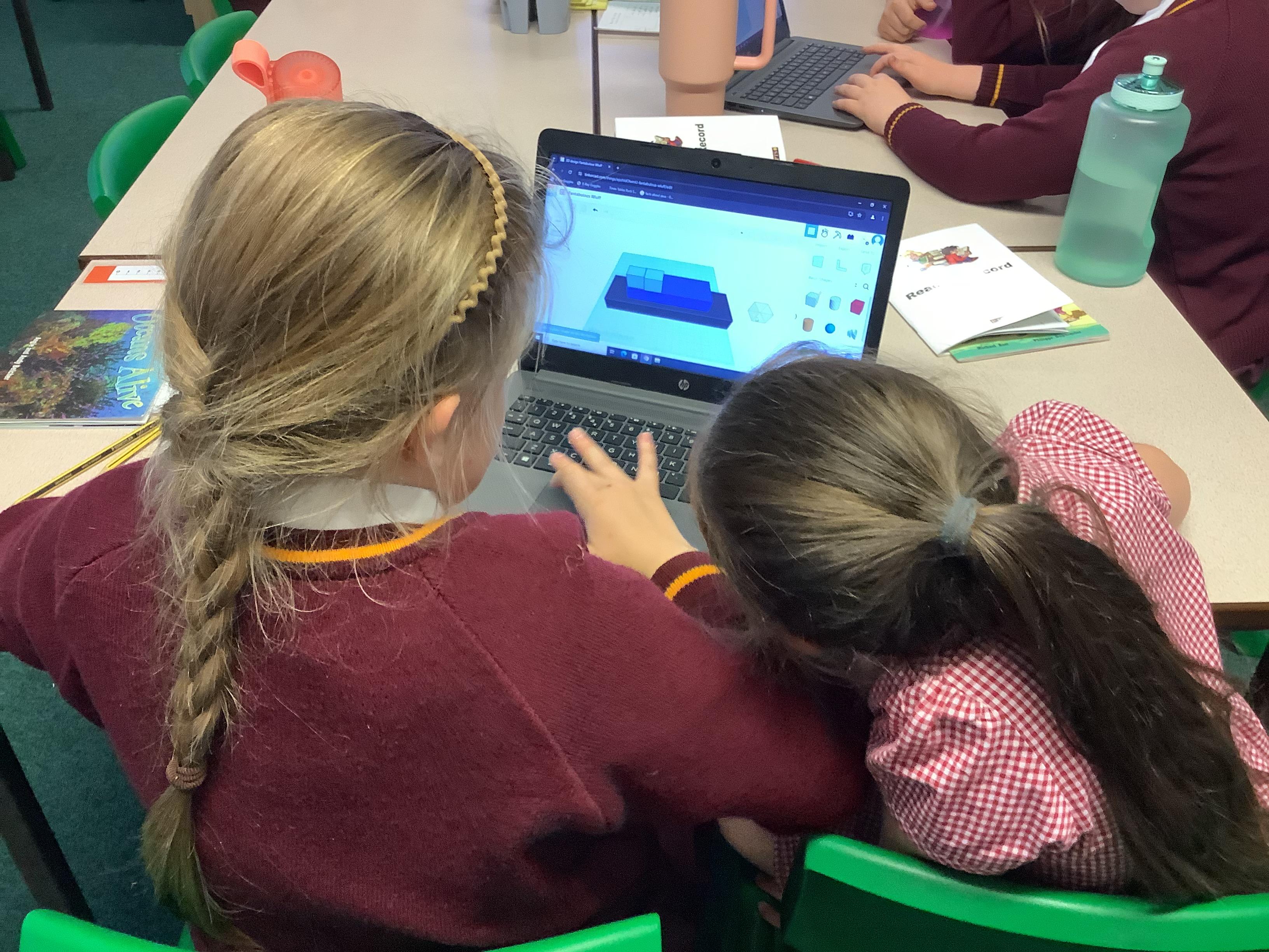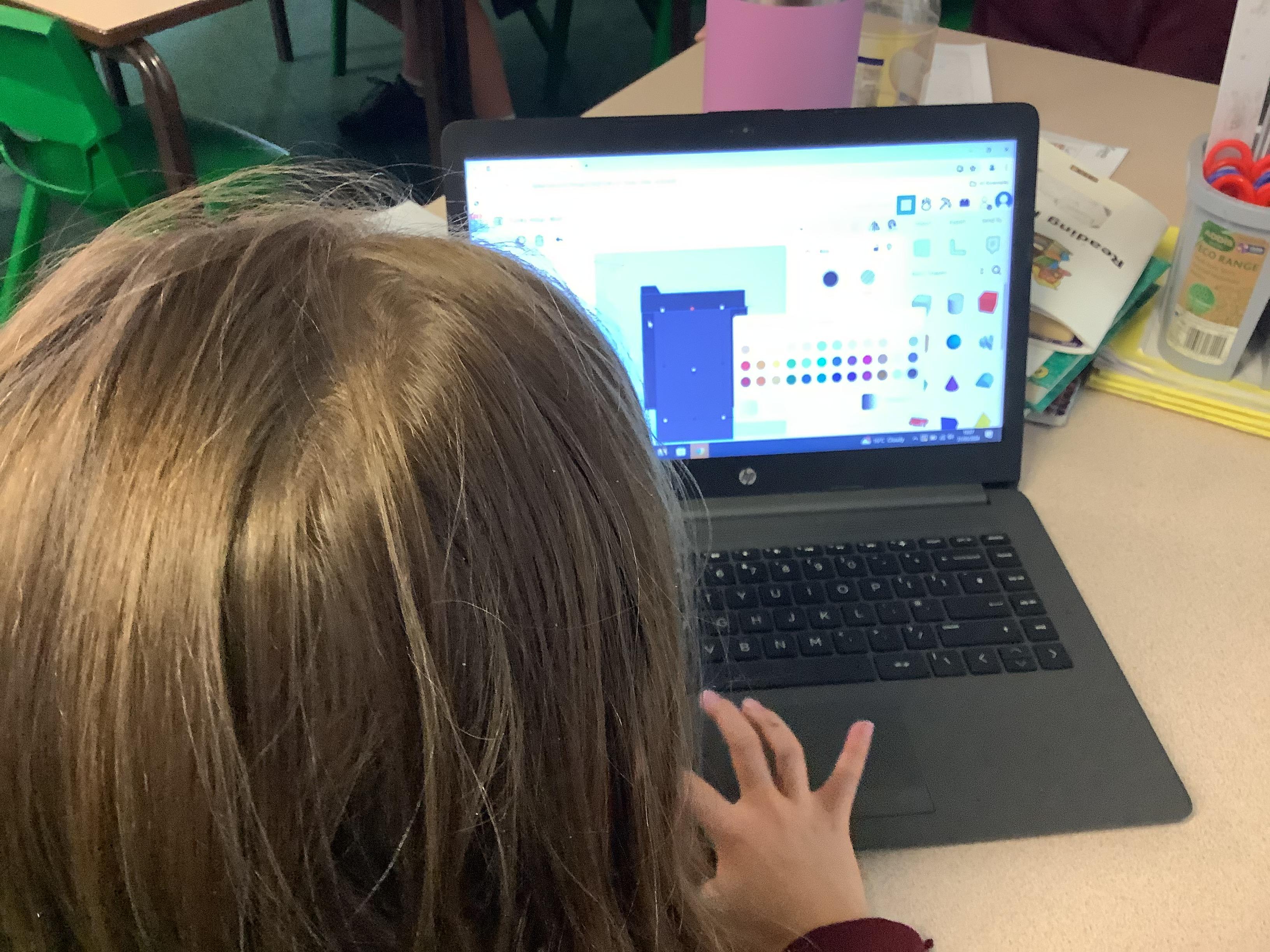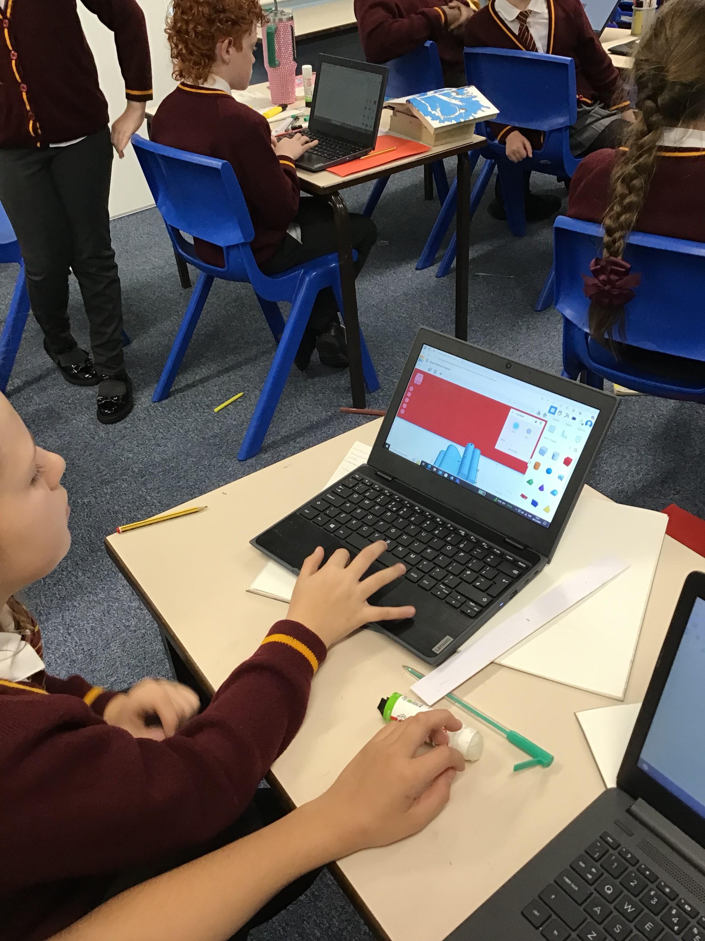 The children in year 5 used the laptops to learn about and practise 3D CAD skills to build the final design of their monitoring device and its case. They were able to place and manoeuvre 3D objects on the Tinkercad interface by changing the properties of and combining one or more 3D objects on a plane.