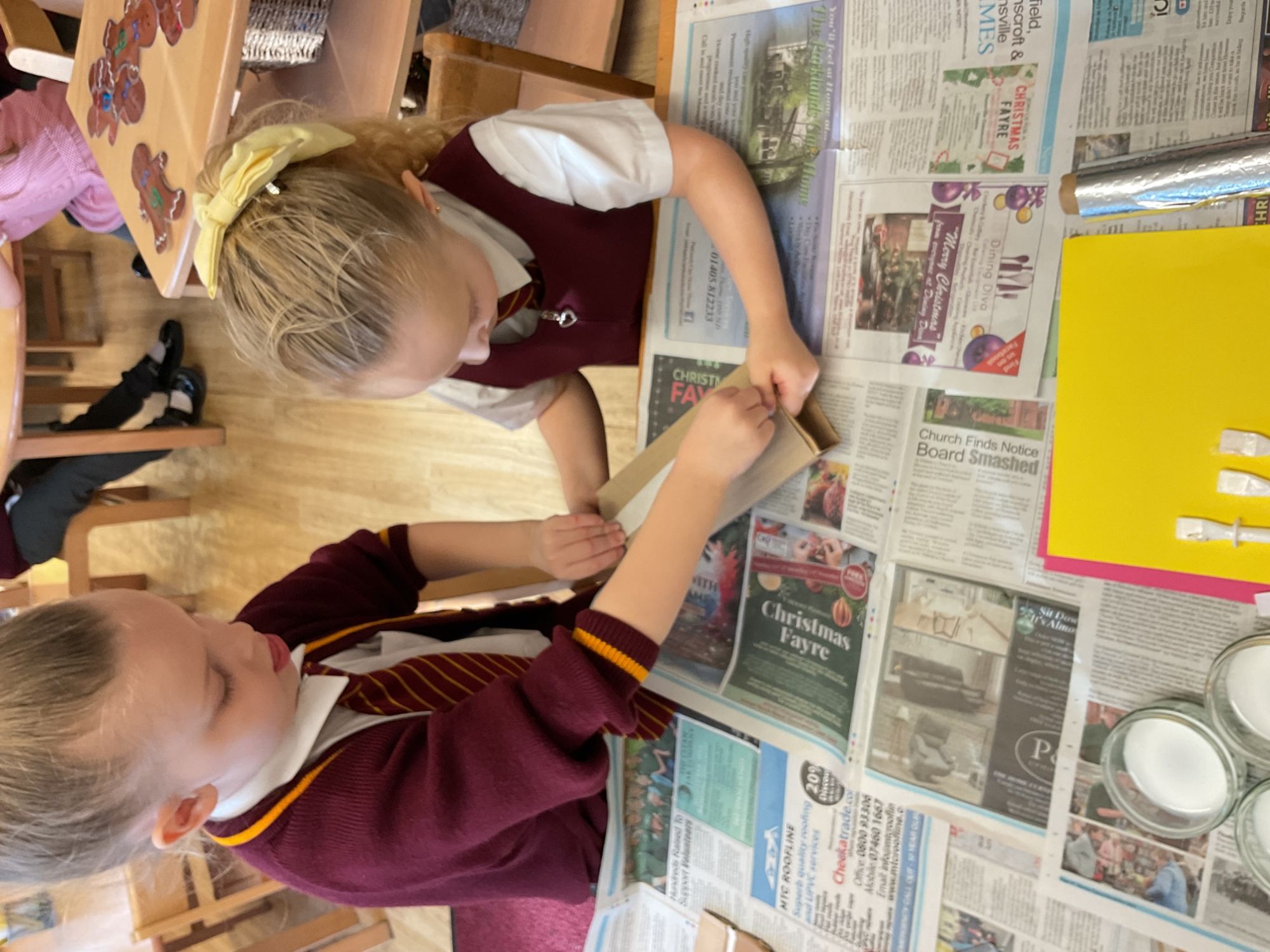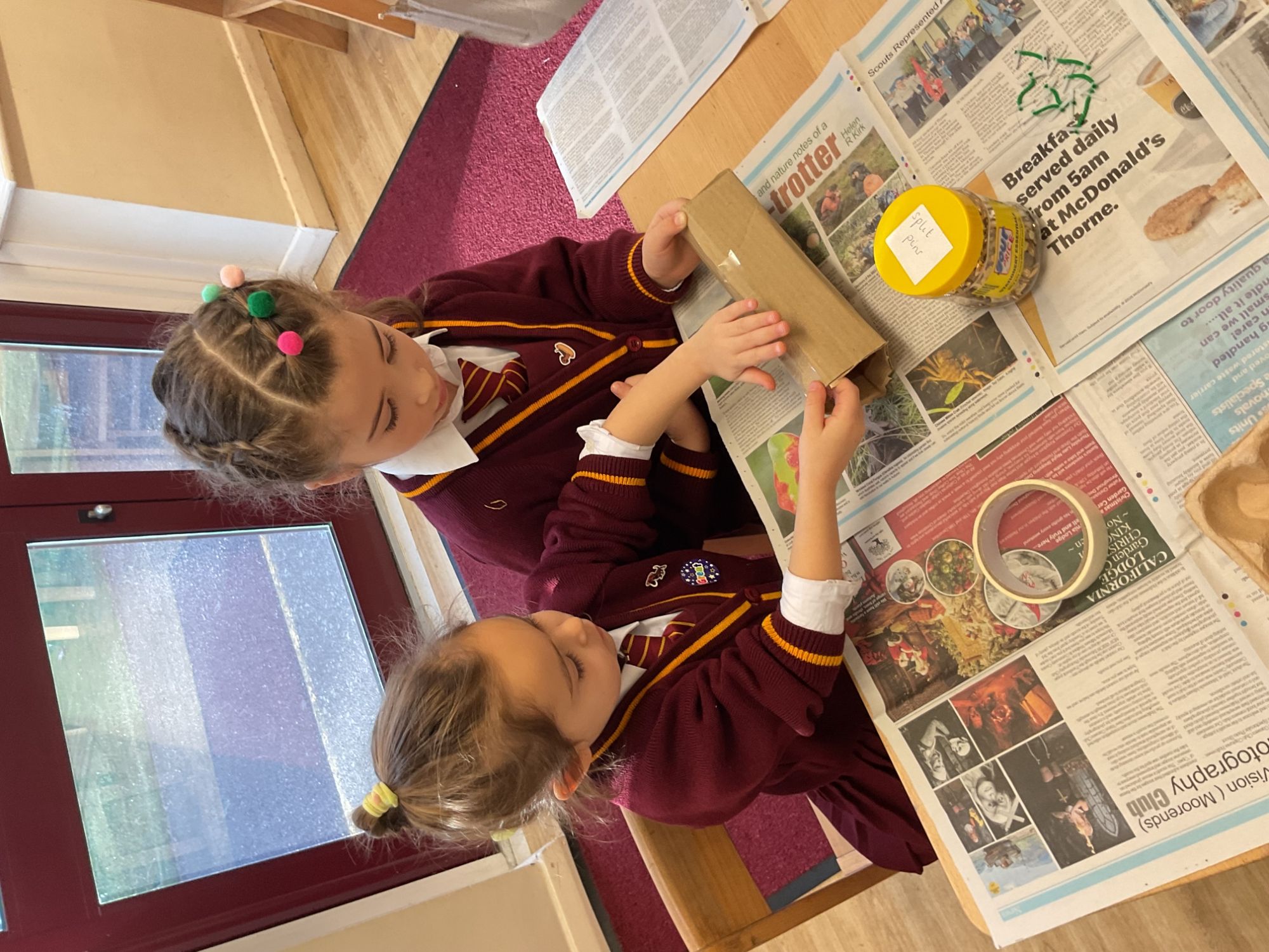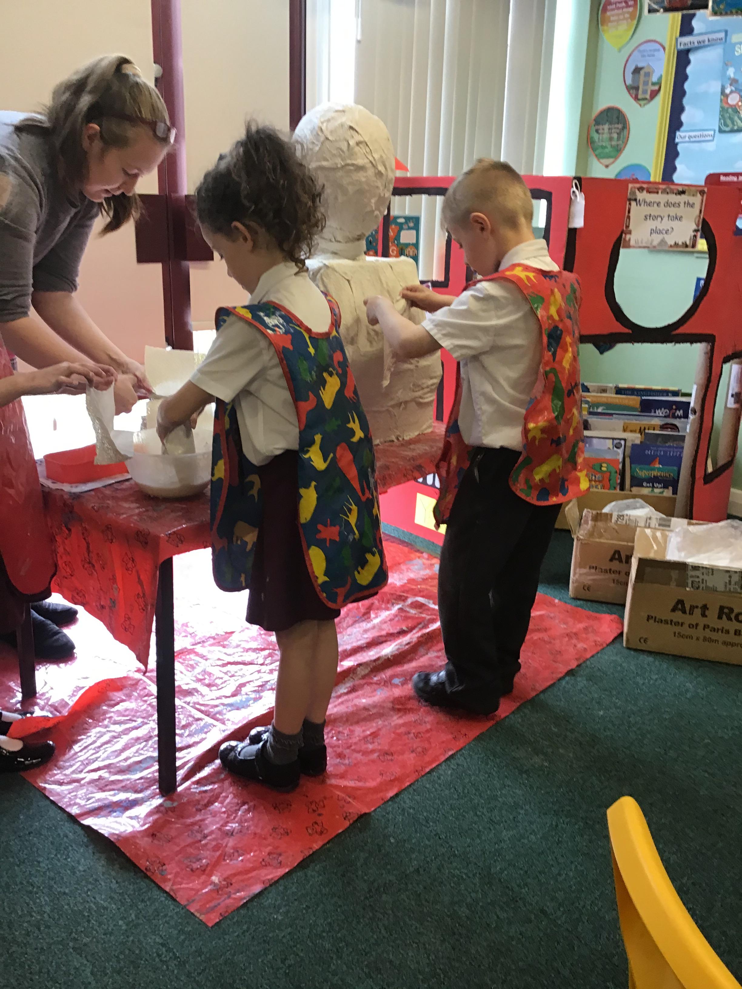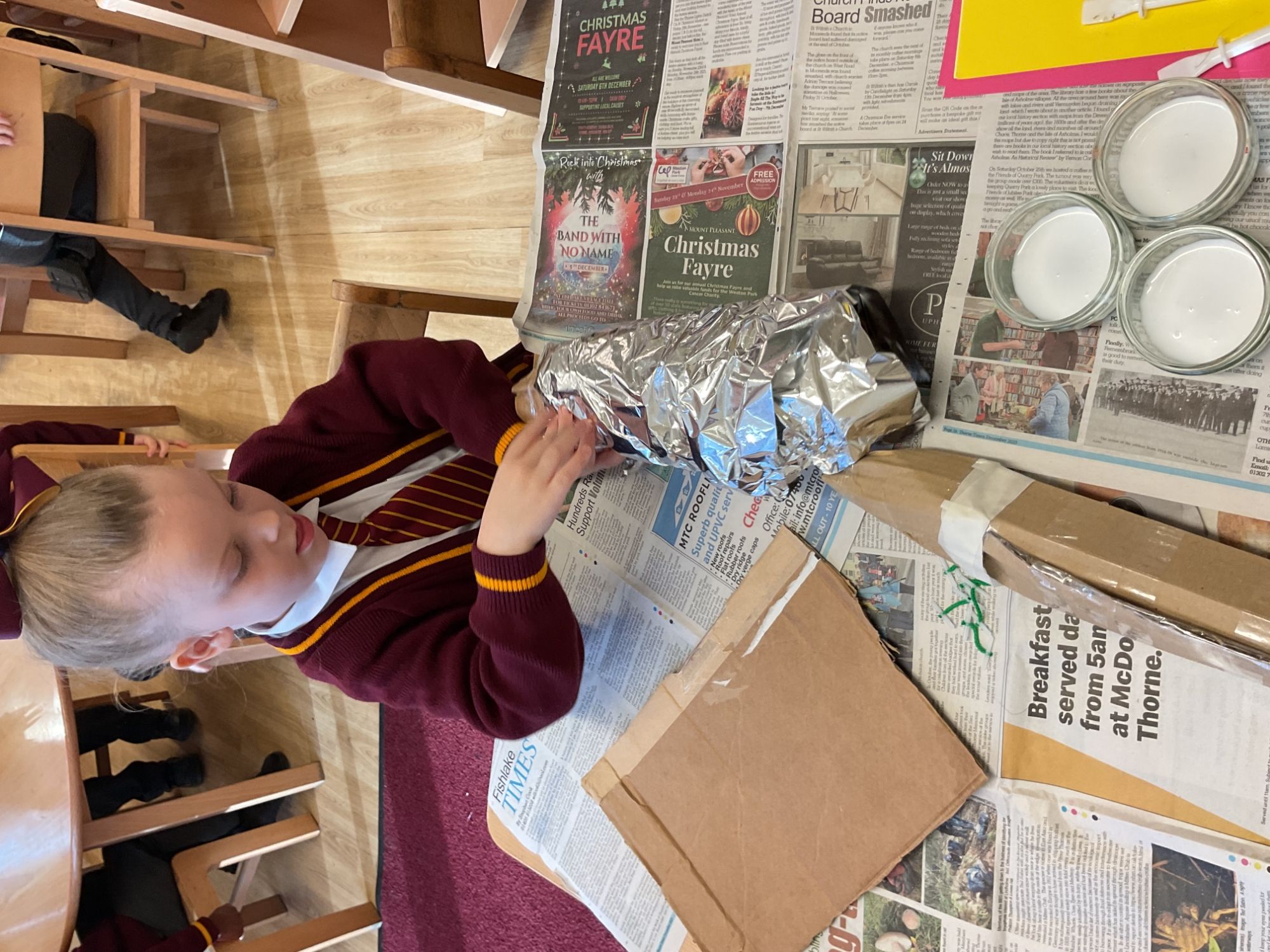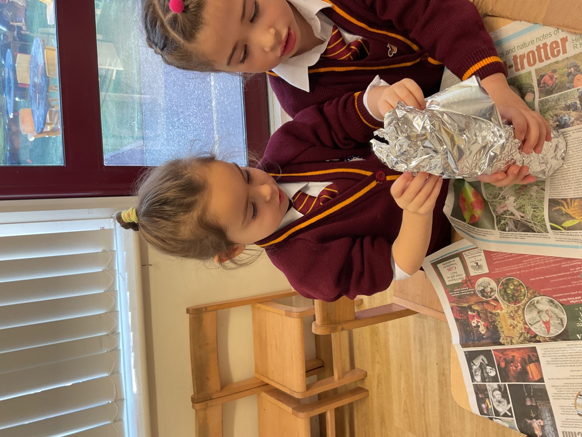Reception children have been experimenting (and getting messy) with modroc. They shaped and moulded newspaper in the shape of a crown and cut and wet modroc before applying it. Next job, painting and applying jewels!