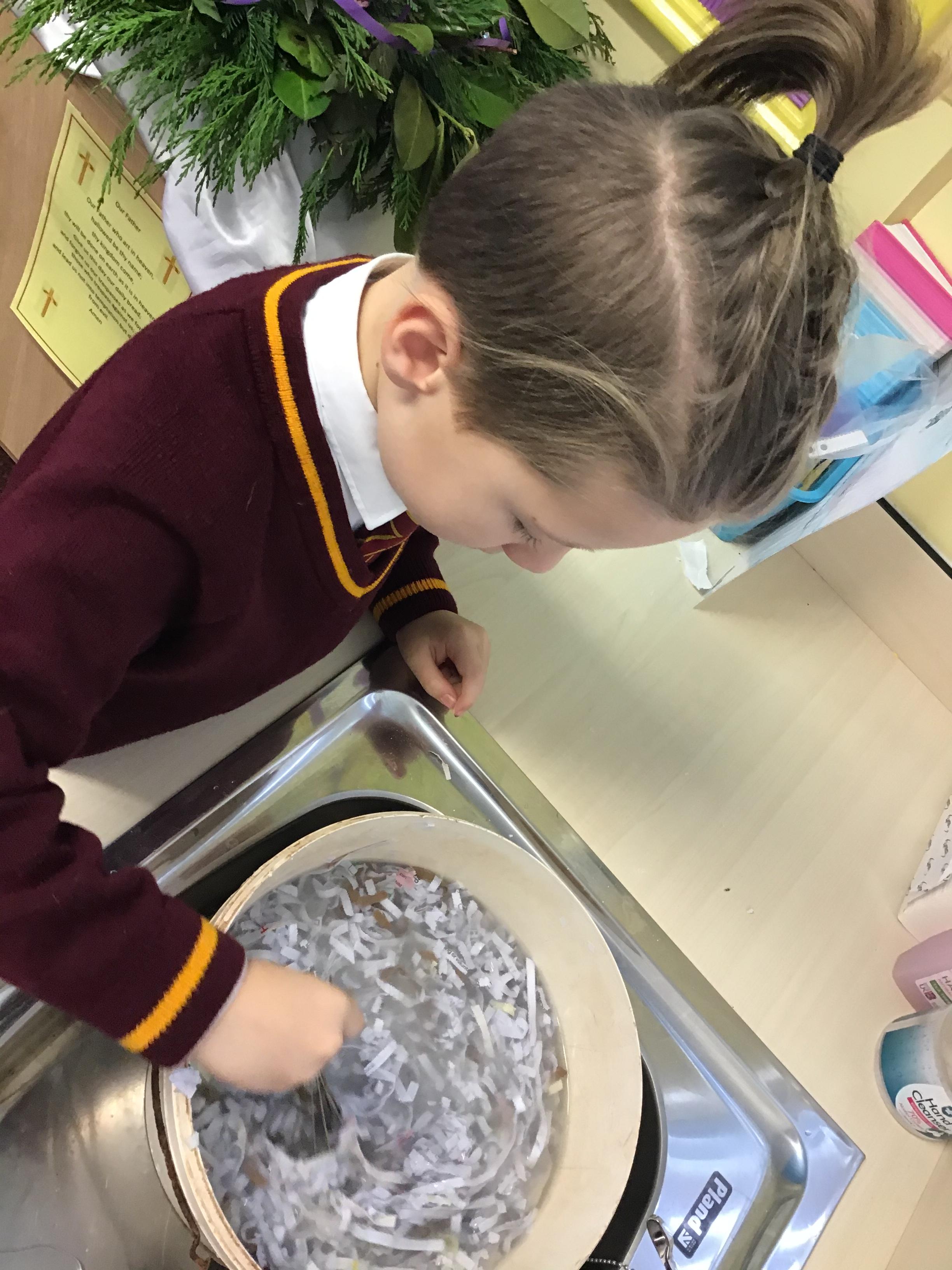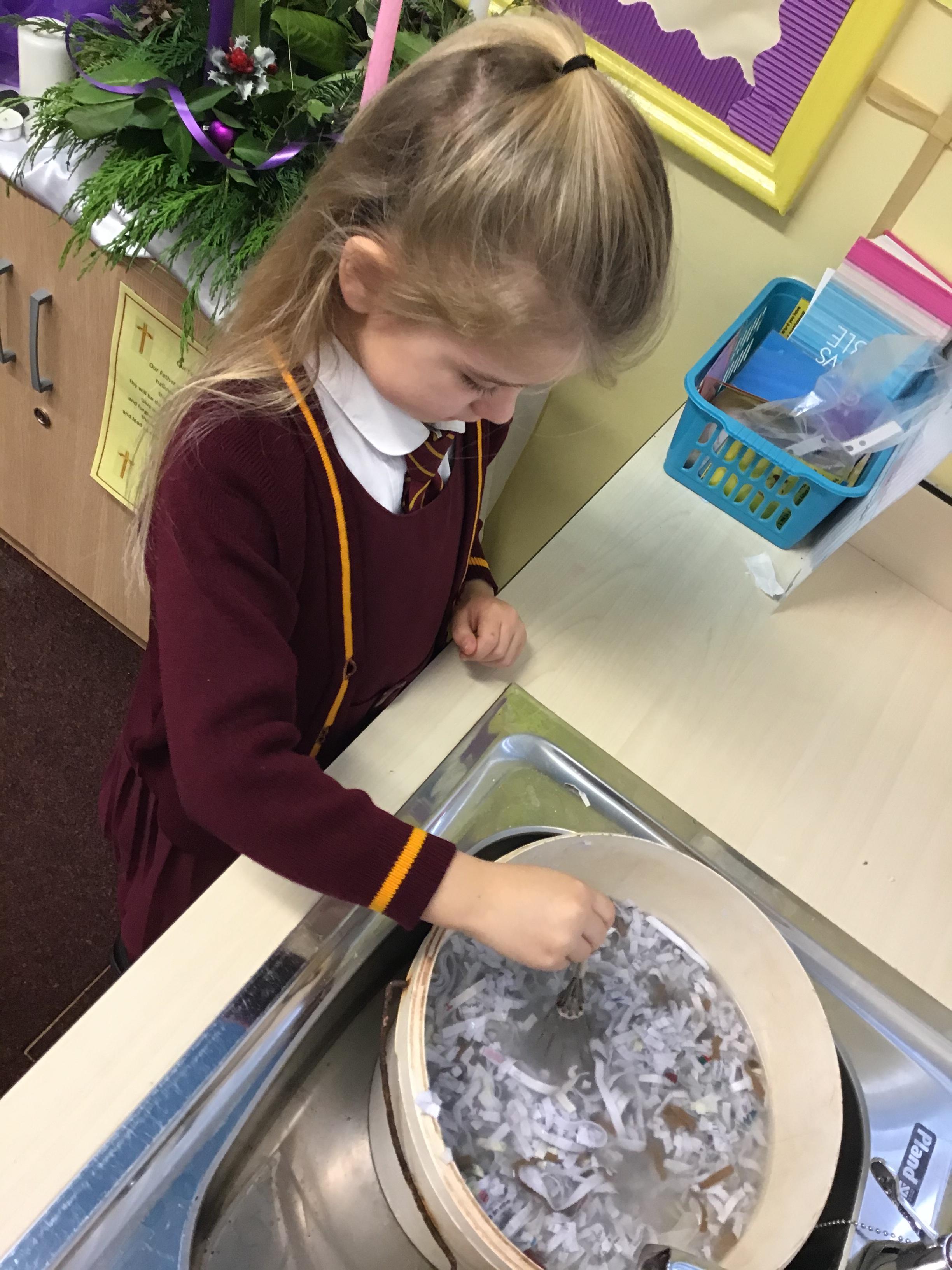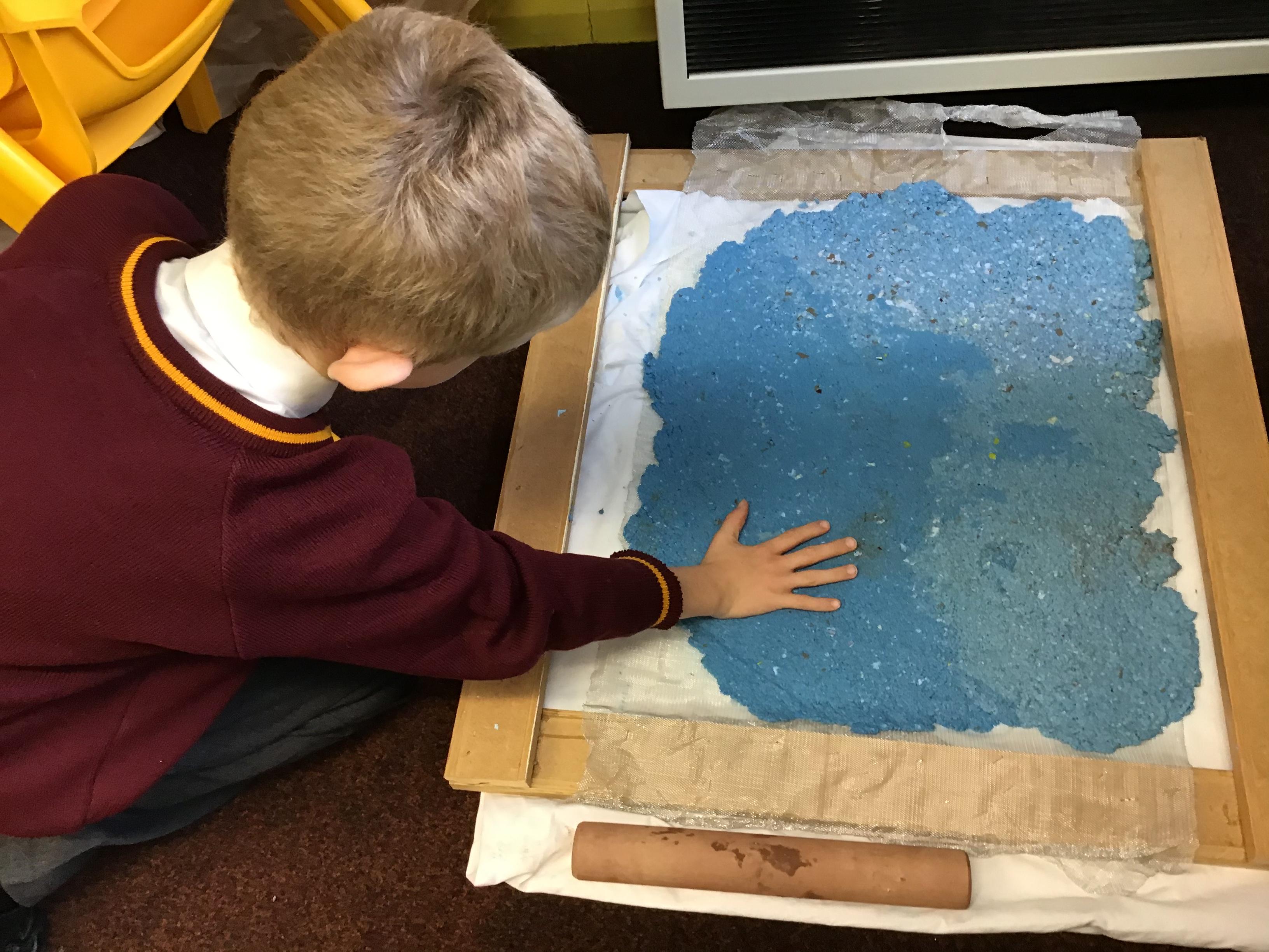Y3 have created their own paper, by creating a paste out of PVA glue, water and shredded news paper. After this Y3 mashed and blended the paper to form a paste, which they were able to squash and roll flat. We then left it to dry before we cut out our paper shapes to stick onto our Christmas cards.