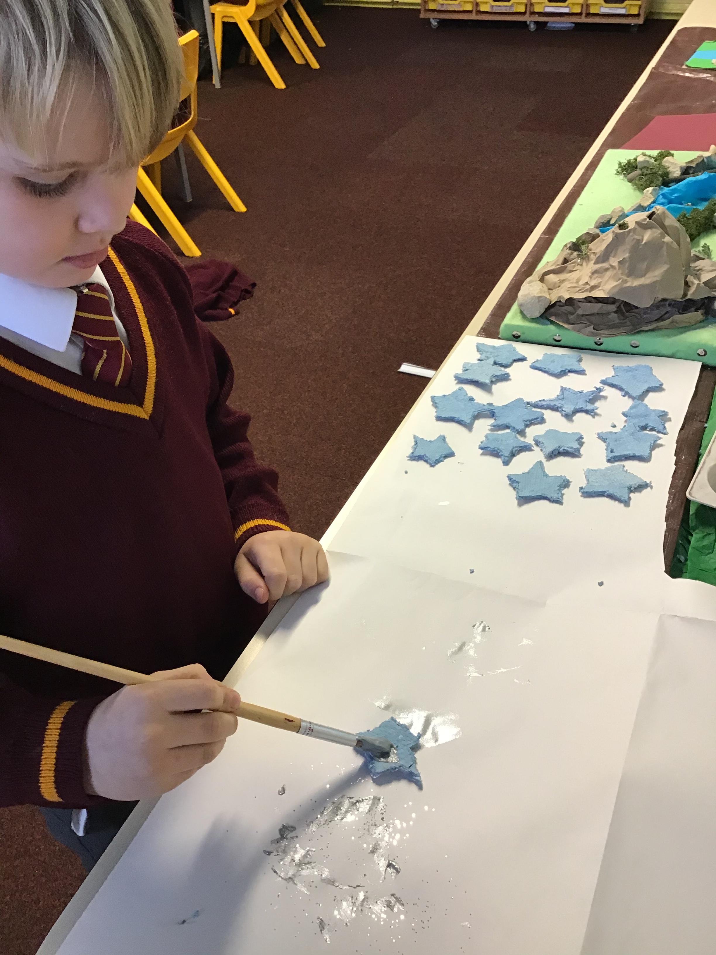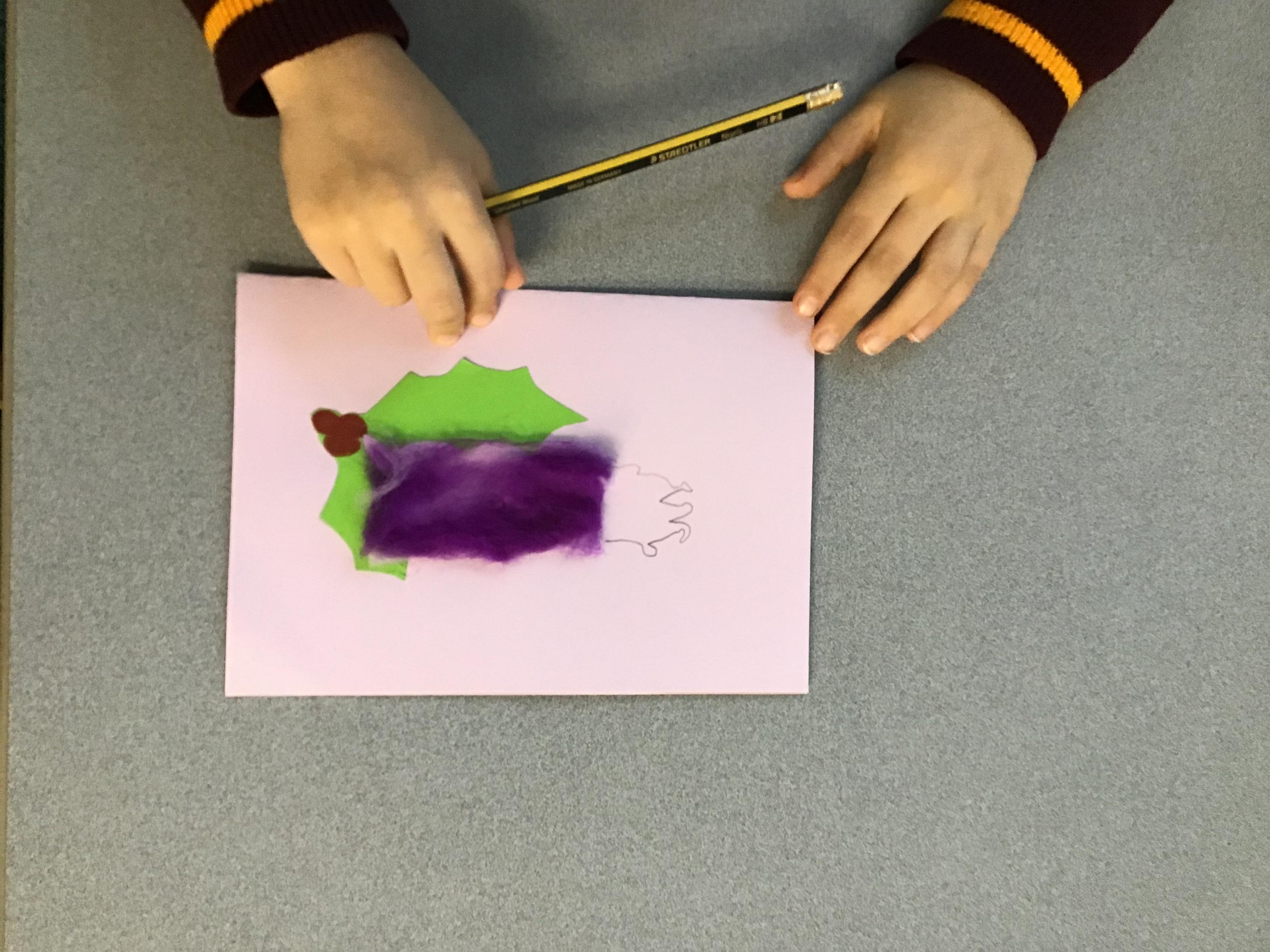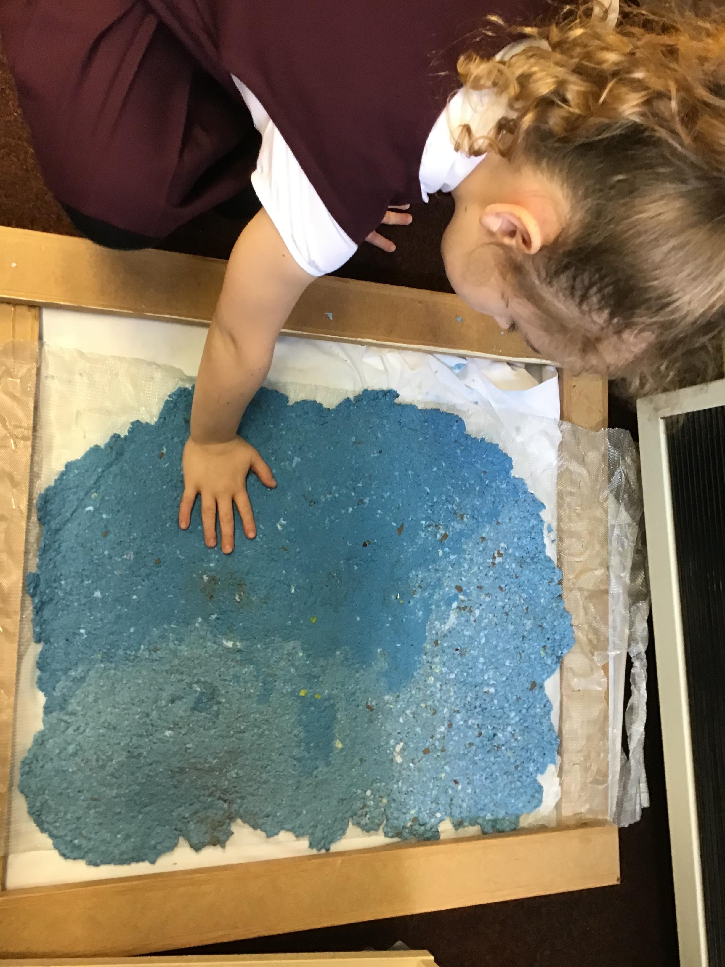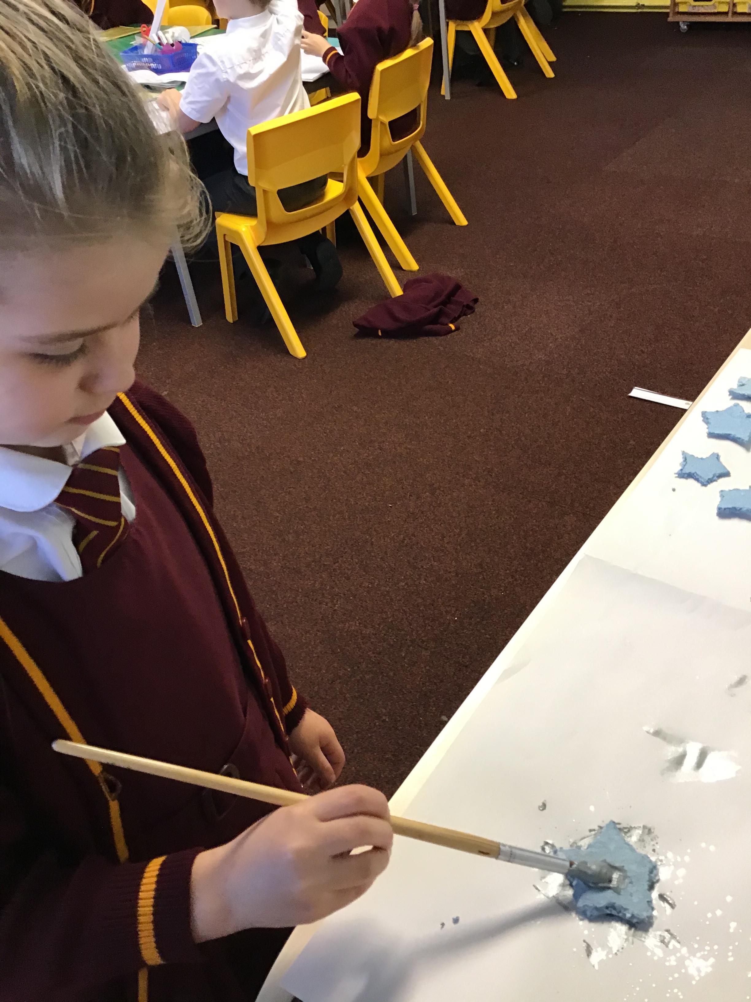 Y3 have created their own paper, by creating a paste out of PVA glue, water and shredded news paper. After this Y3 mashed and blended the paper to form a paste, which they were able to squash and roll flat. We then left it to dry before we cut out our paper shapes to stick onto our Christmas cards.