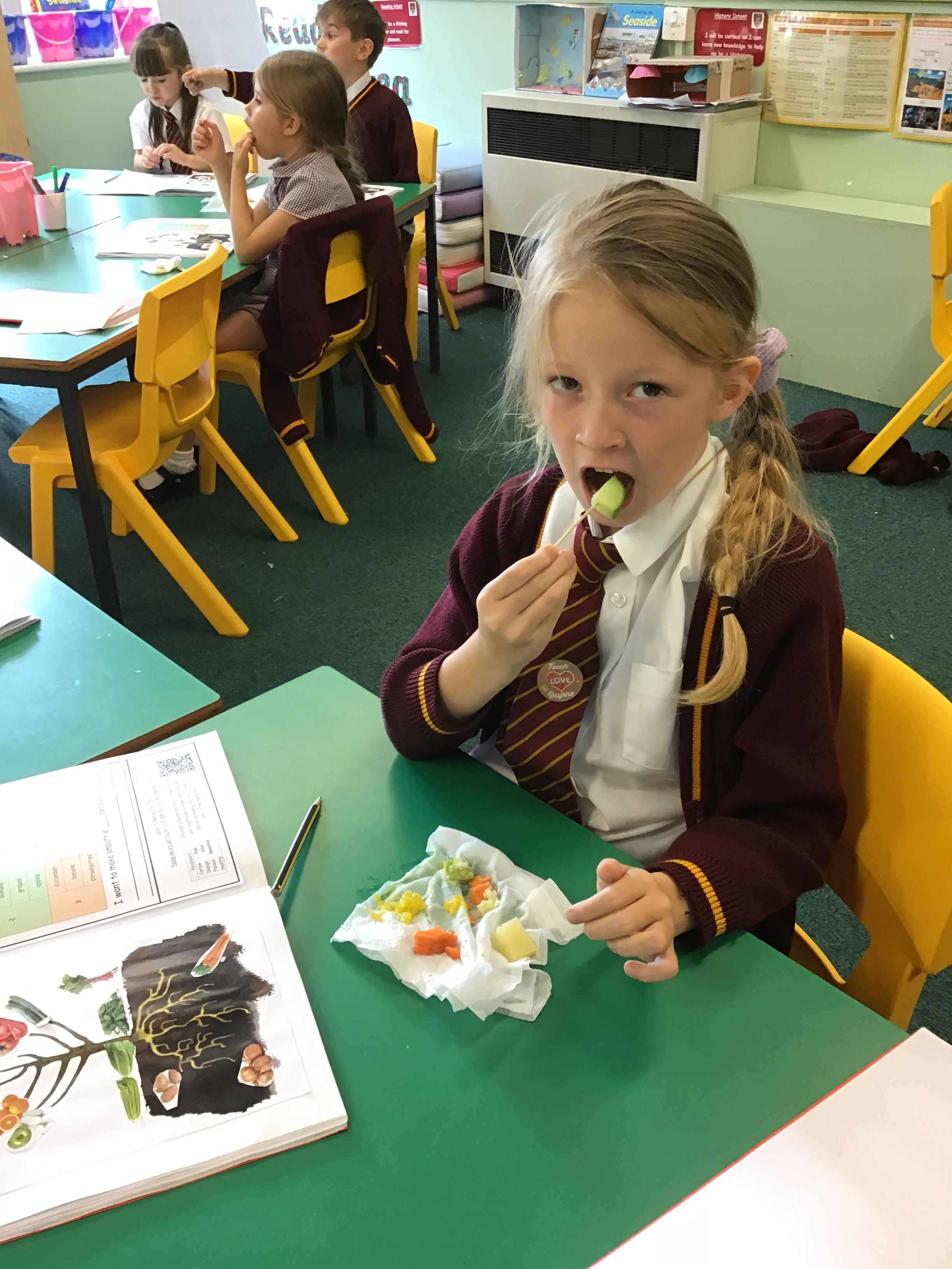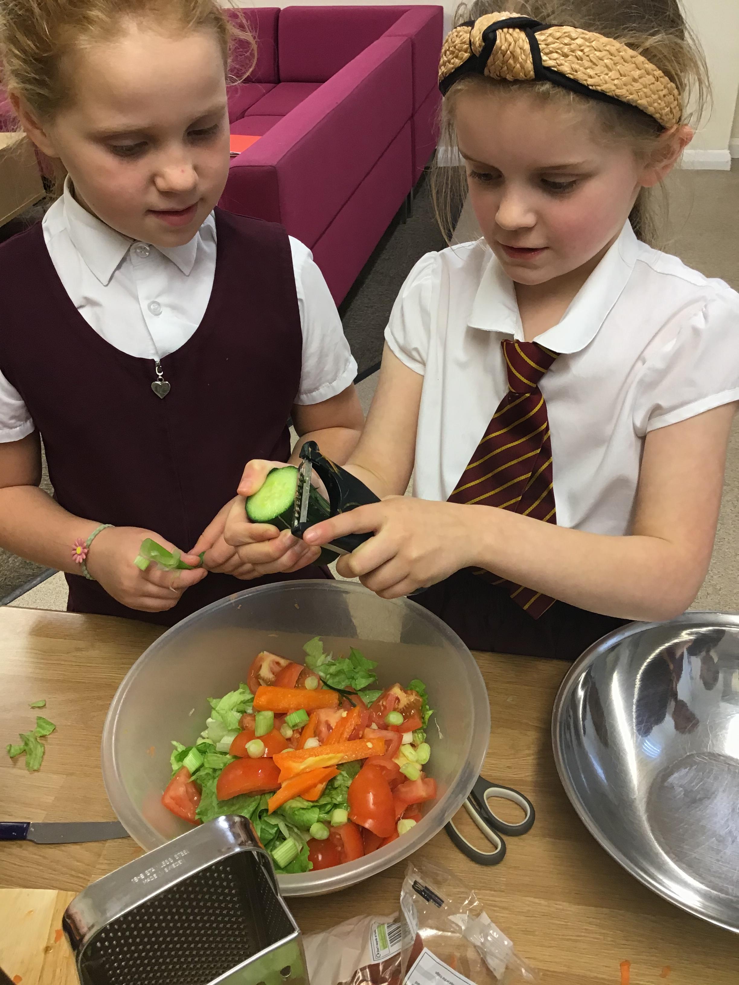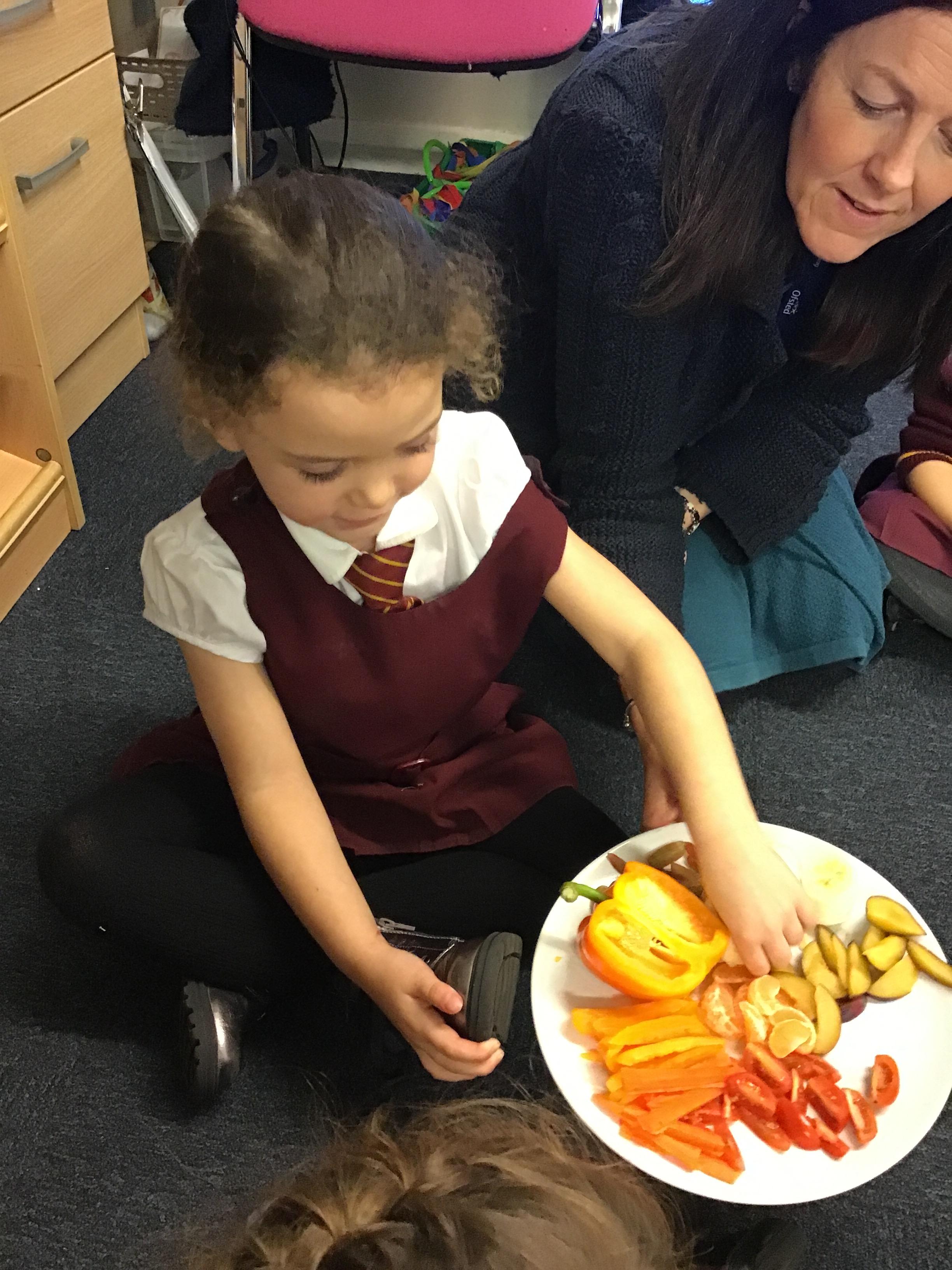 After revisiting the health and safety rules, children in Reception prepared the ingredients to create their rainbow salad. They tasted and evaluate their rainbow salad.