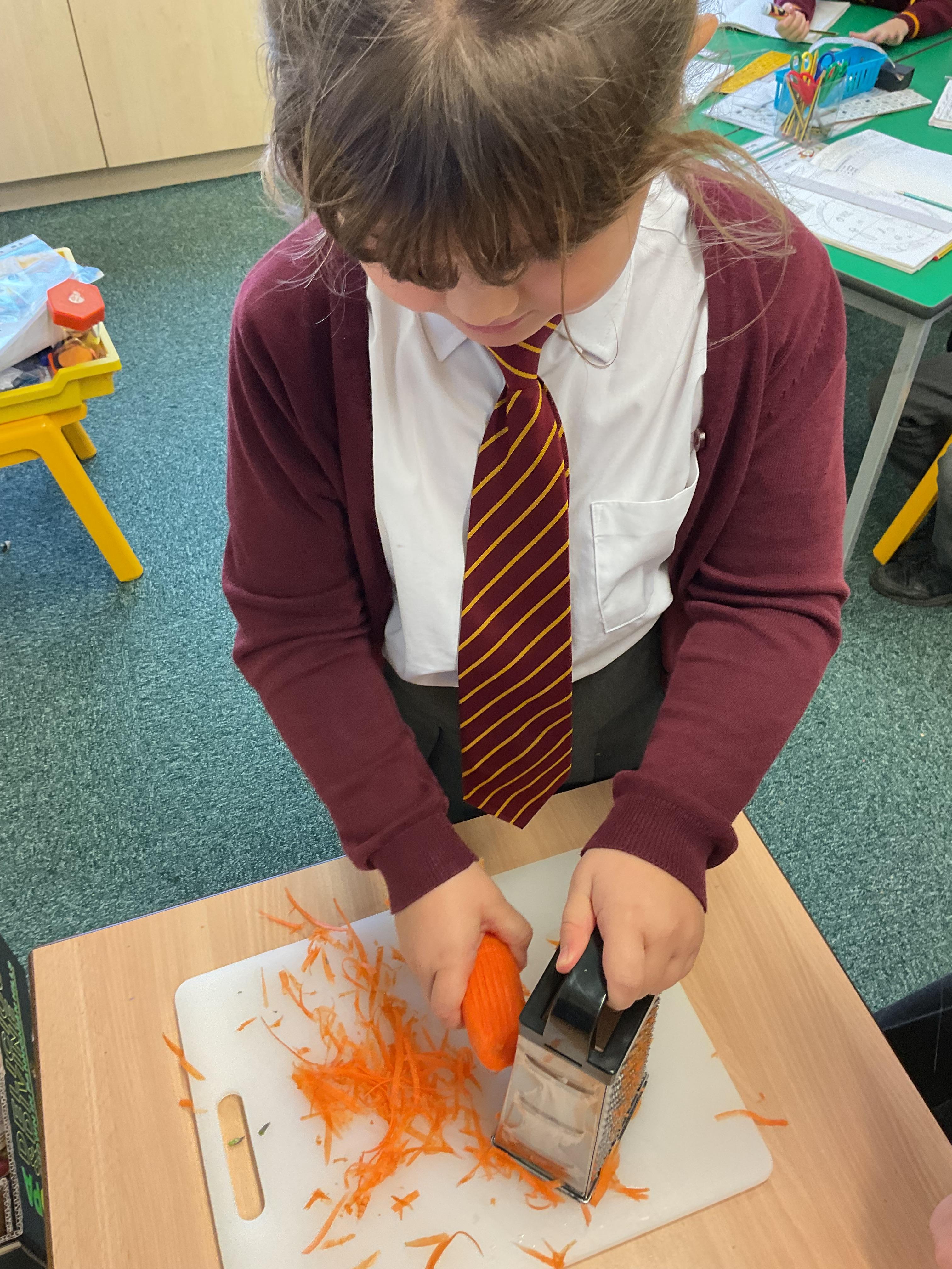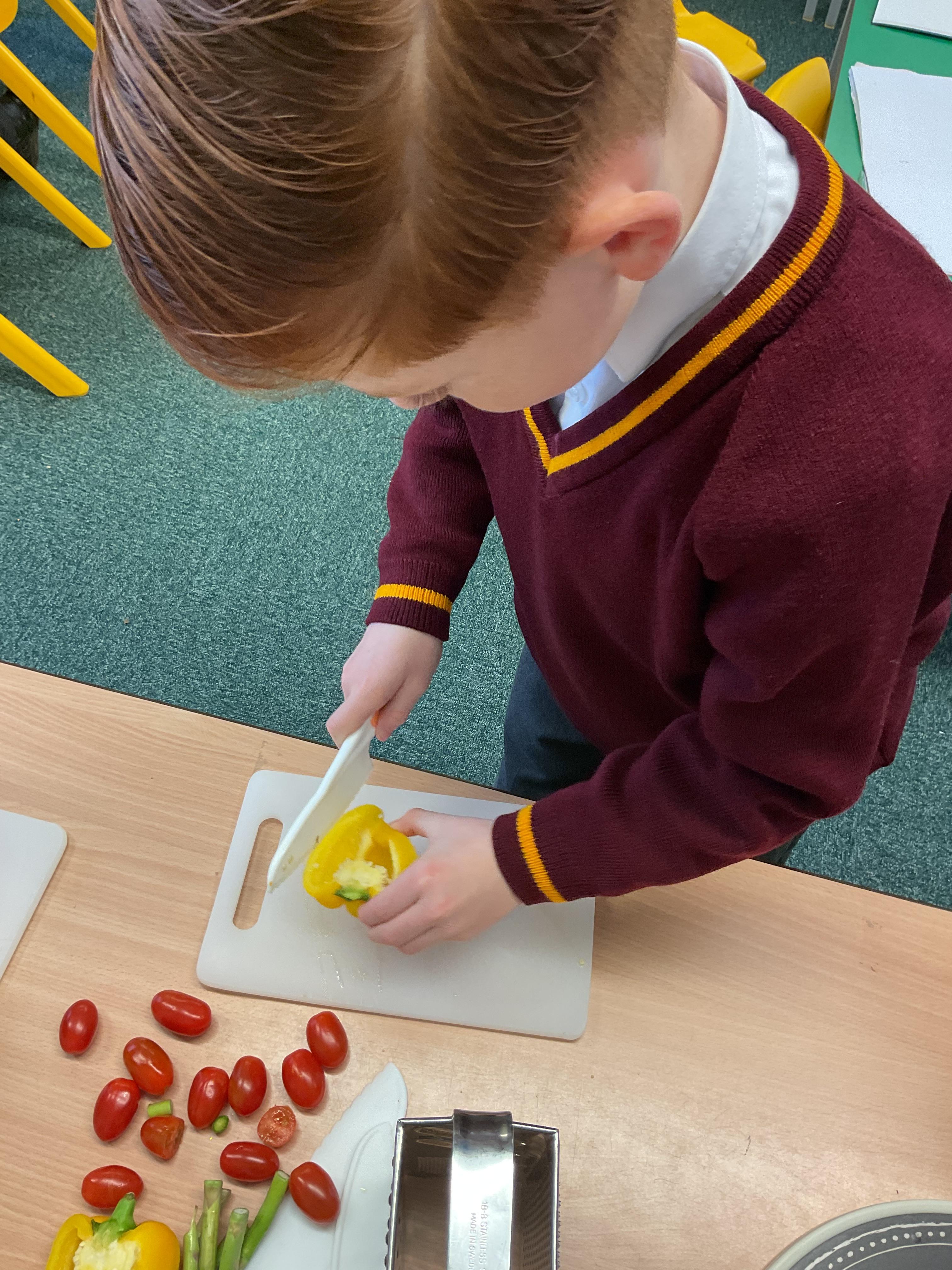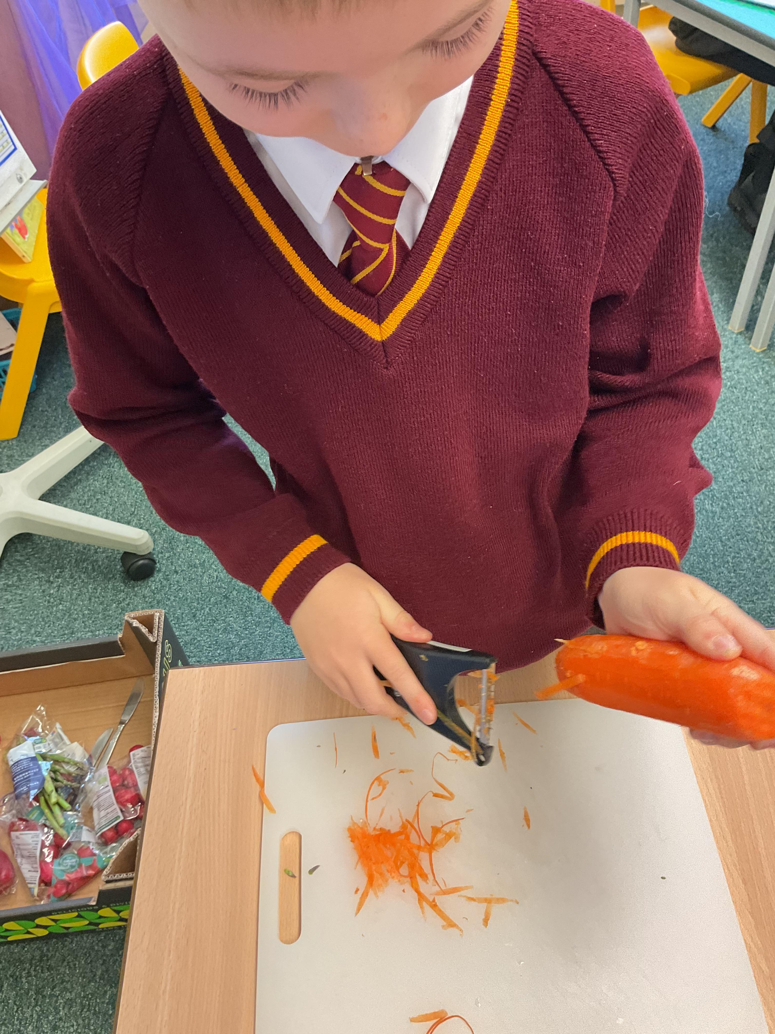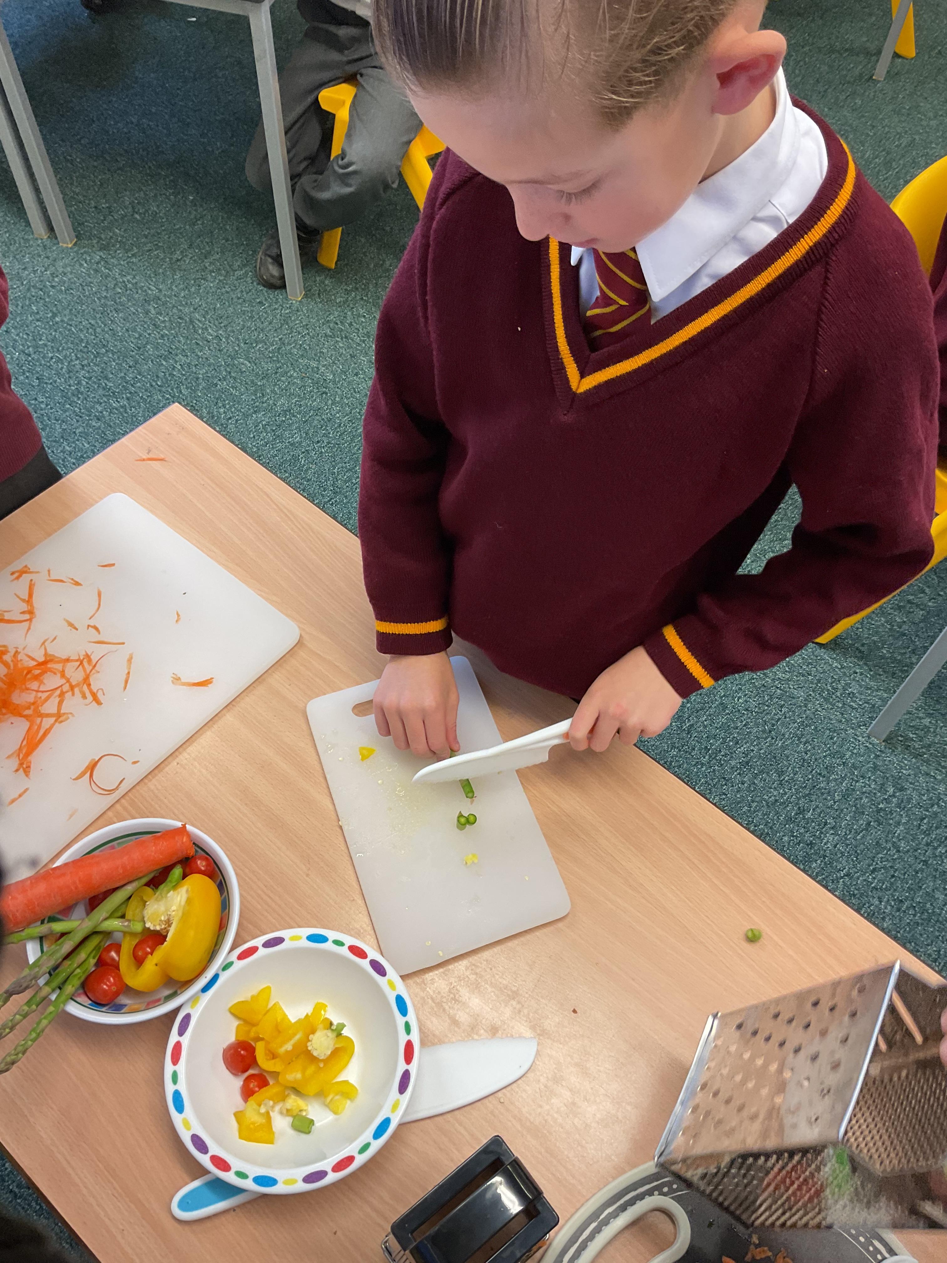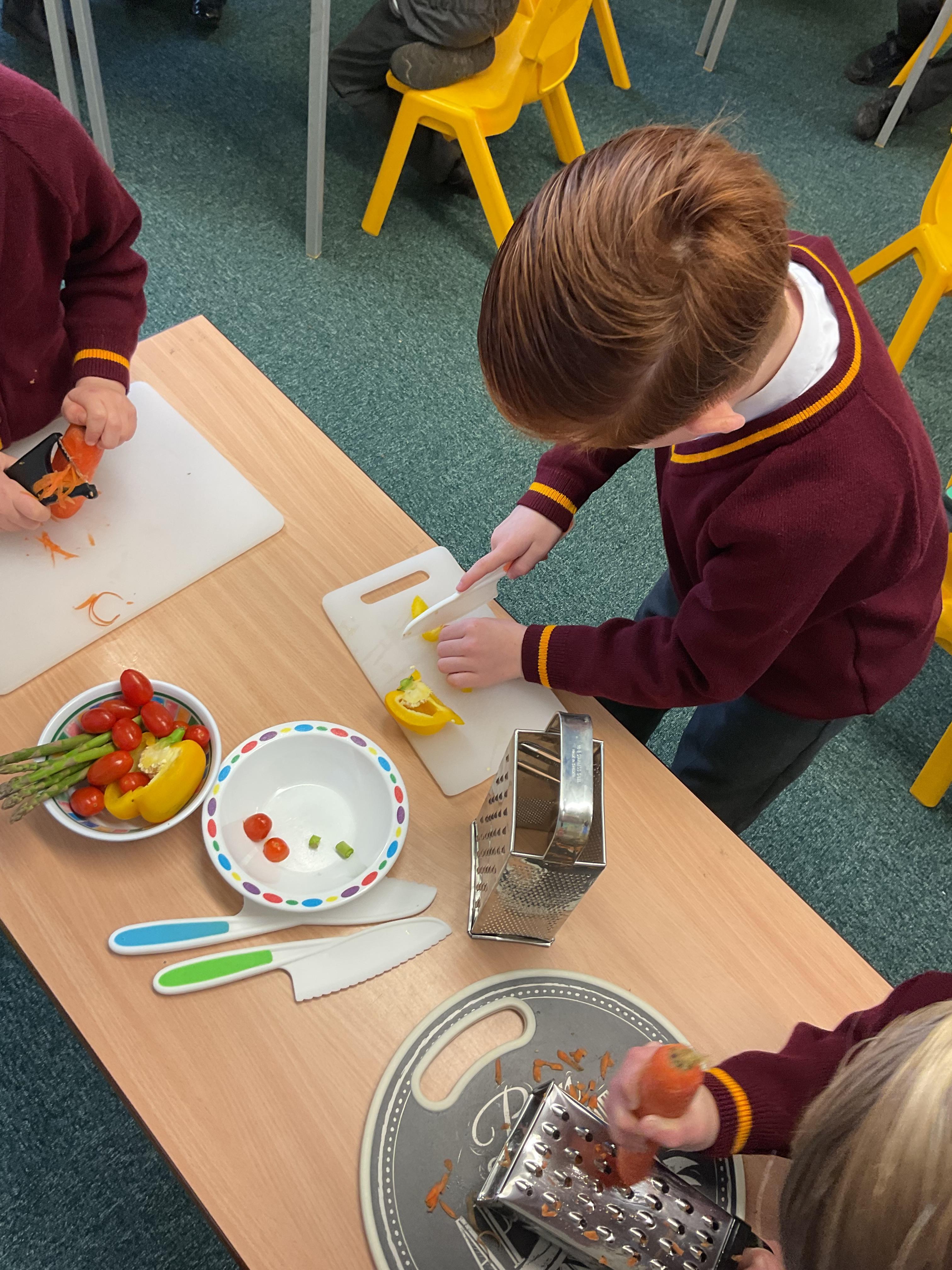 In Y3, we have been practicing our cutting and peeling skills, in preparation for making our vegetable tart. The children were careful and cautious when handling kitchen utensils and equipment. The children enjoyed using their bridge and claw grip to slice different varieties of vegetables. The children also practiced using different variations of peelers and graters, on some vegetables.