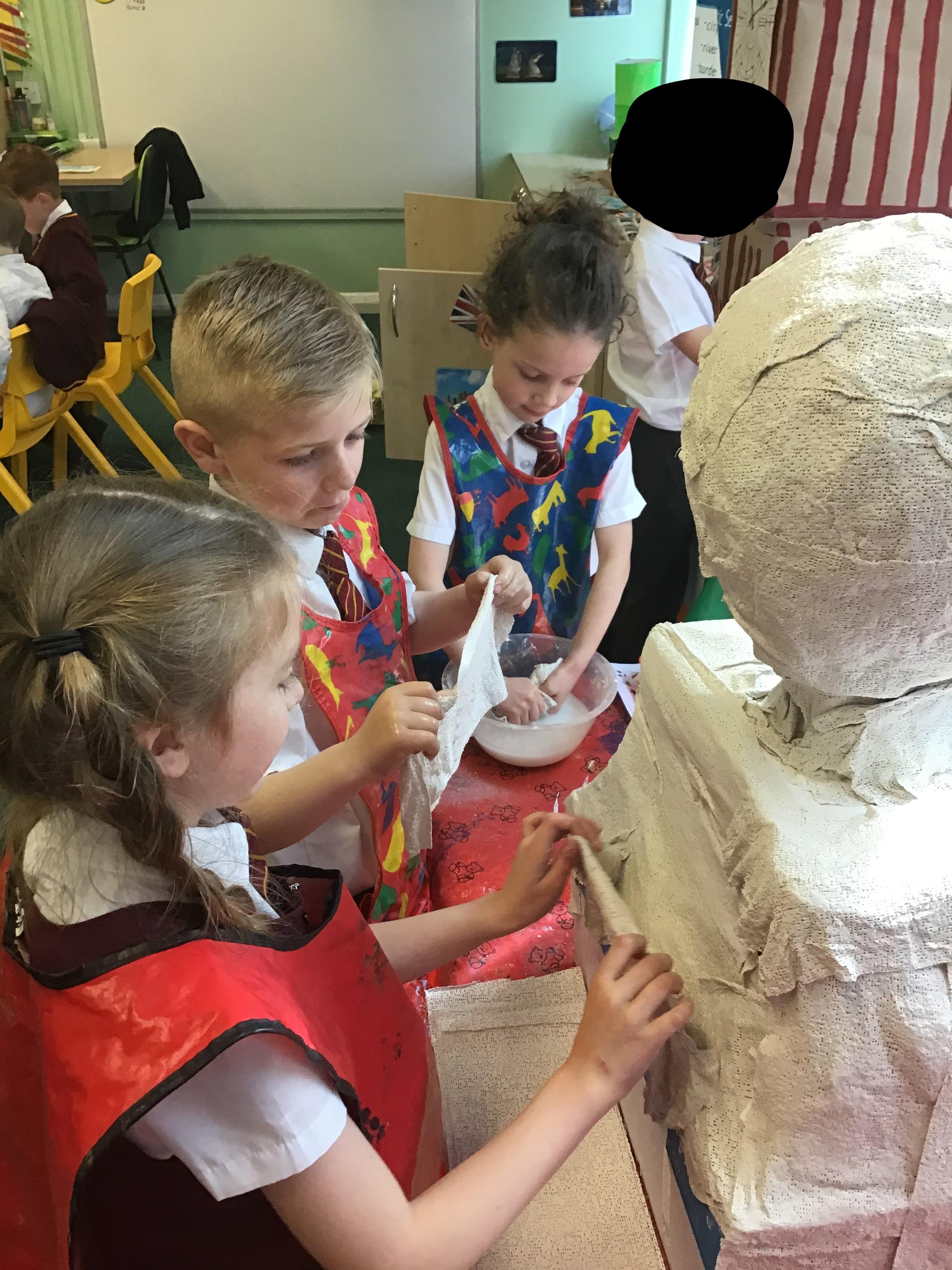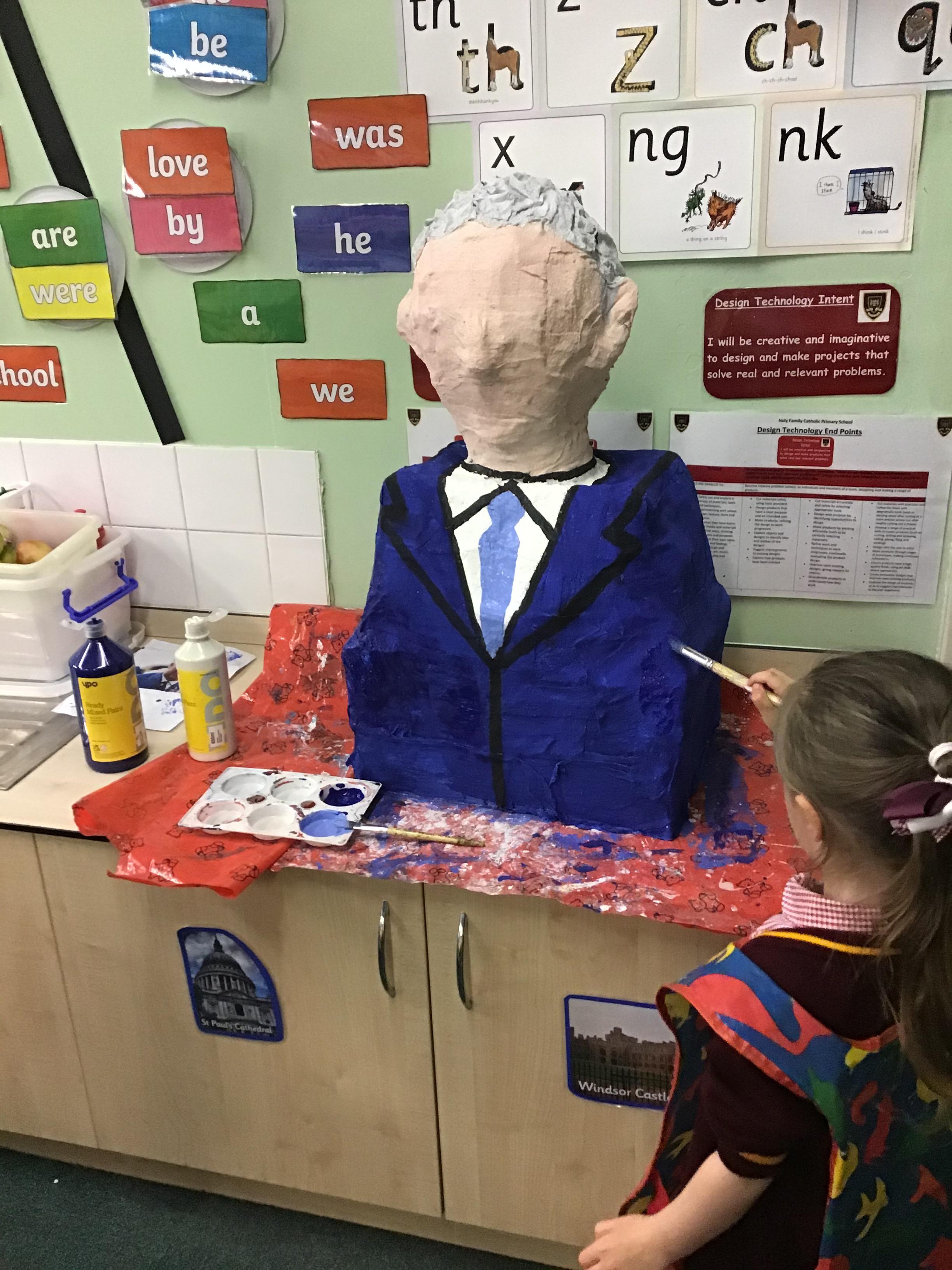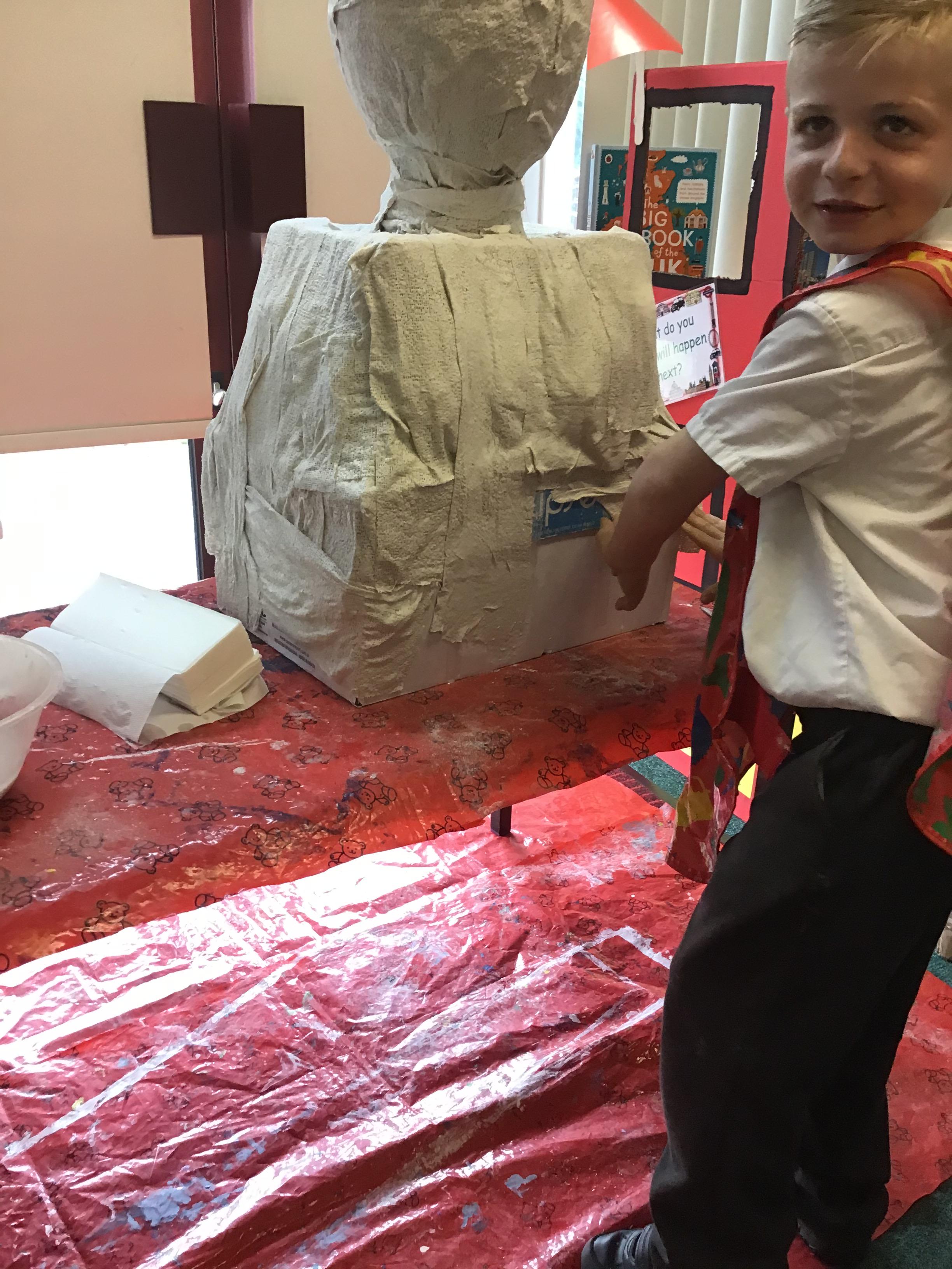 Year 1 used a range of materials and skills to create our 3D sculpture of King Charles for his Coronation day. We began with using cardboard boxes and using cellotape to tape the boxes together and in place to create our base structure. We then used modroc to mould around the boxes to create a human 3D structure. We manipulated the modroc by scrunching it together to create textured wavy hair. Once dried, we mixed together paints and painted the sculpture using a photograph as inspiration to represent King Charles.