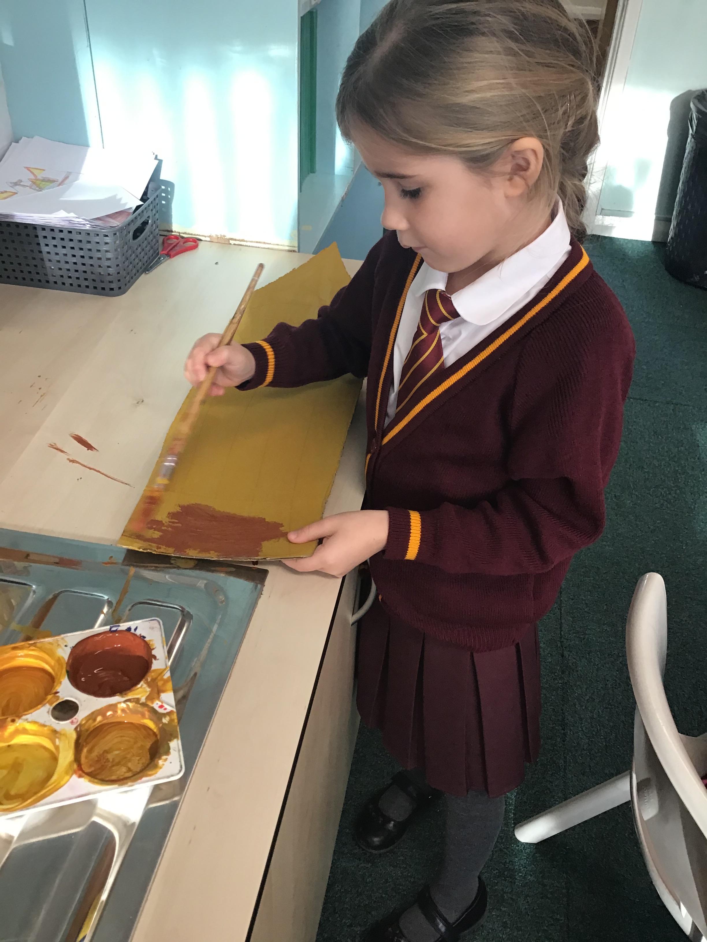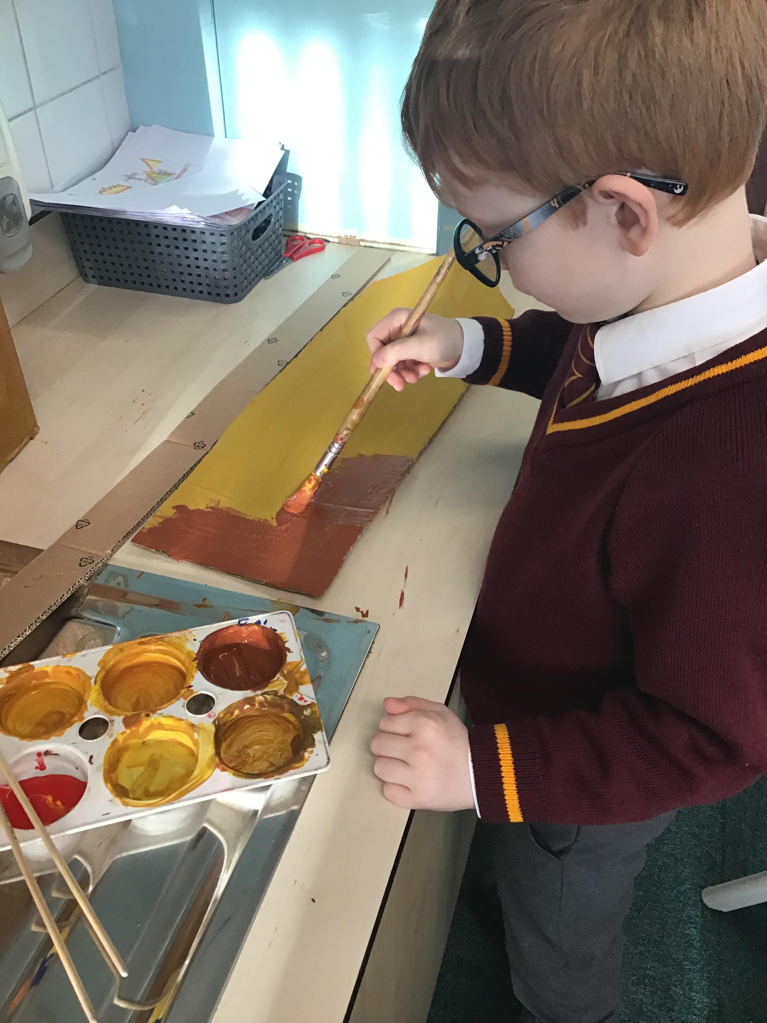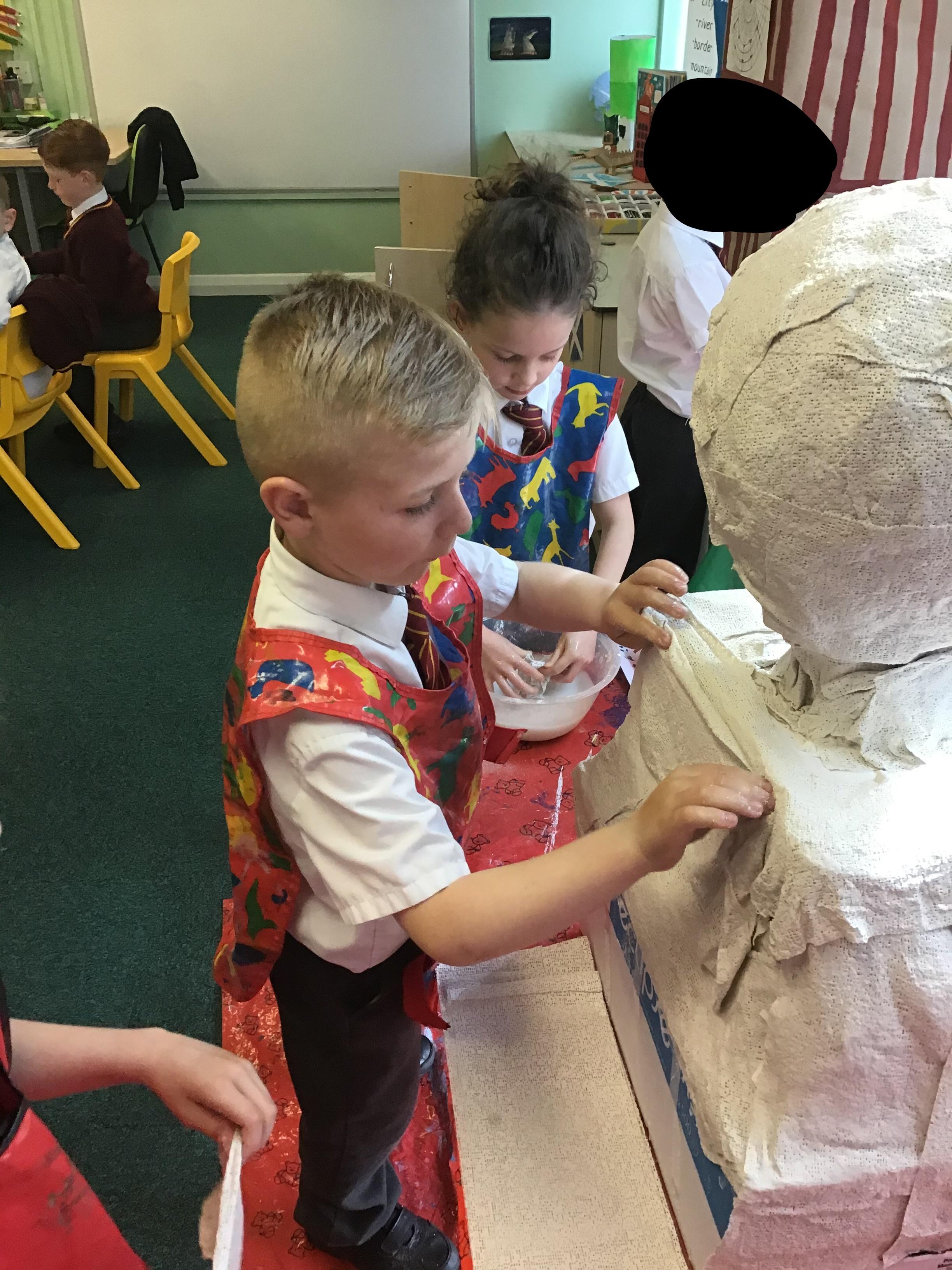Year 1 used a range of materials and skills to create our 3D sculpture of King Charles for his Coronation day. We began with using cardboard boxes and using cellotape to tape the boxes together and in place to create our base structure. We then used modroc to mould around the boxes to create a human 3D structure. We manipulated the modroc by scrunching it together to create textured wavy hair. Once dried, we mixed together paints and painted the sculpture using a photograph as inspiration to represent King Charles.