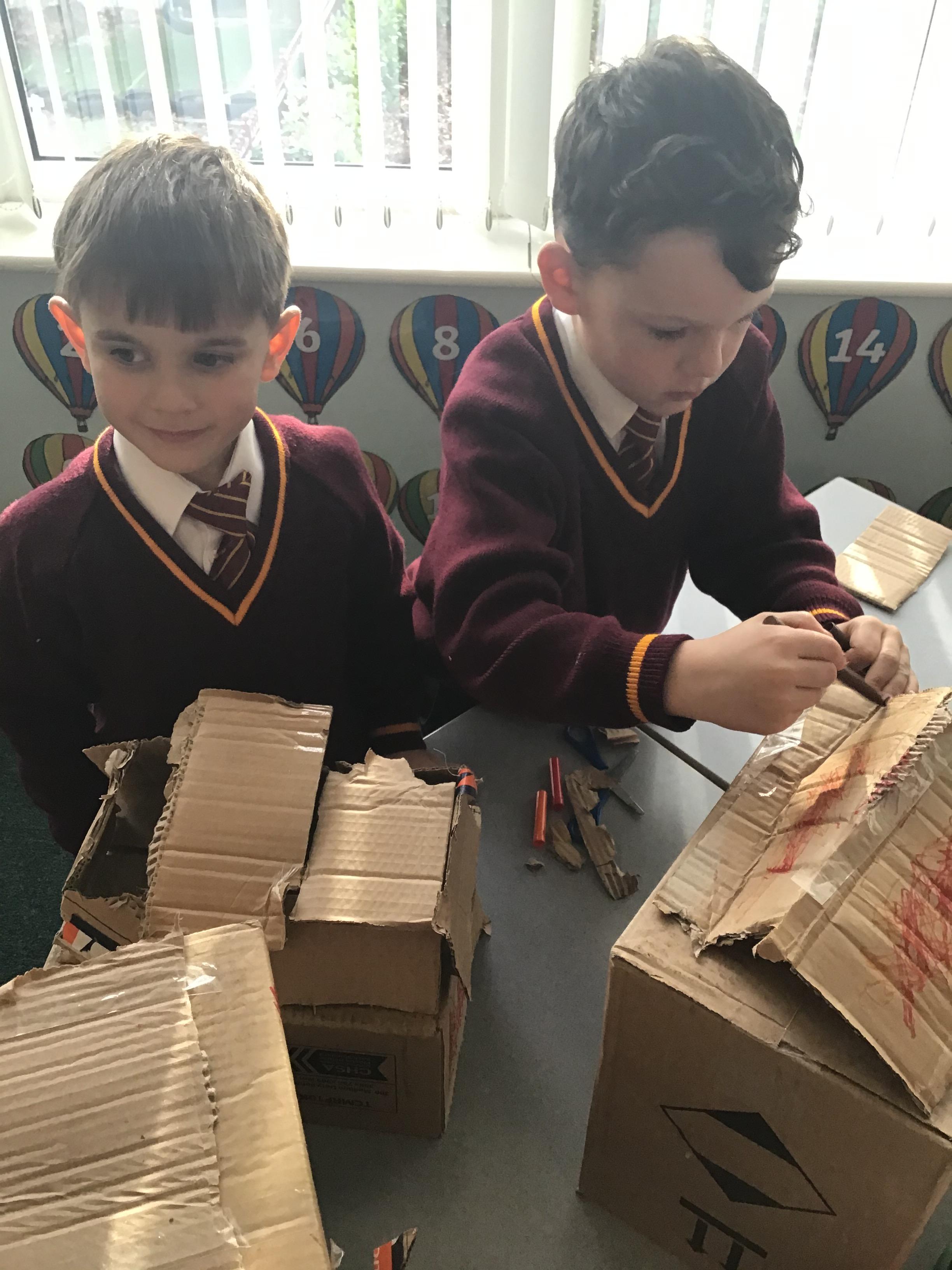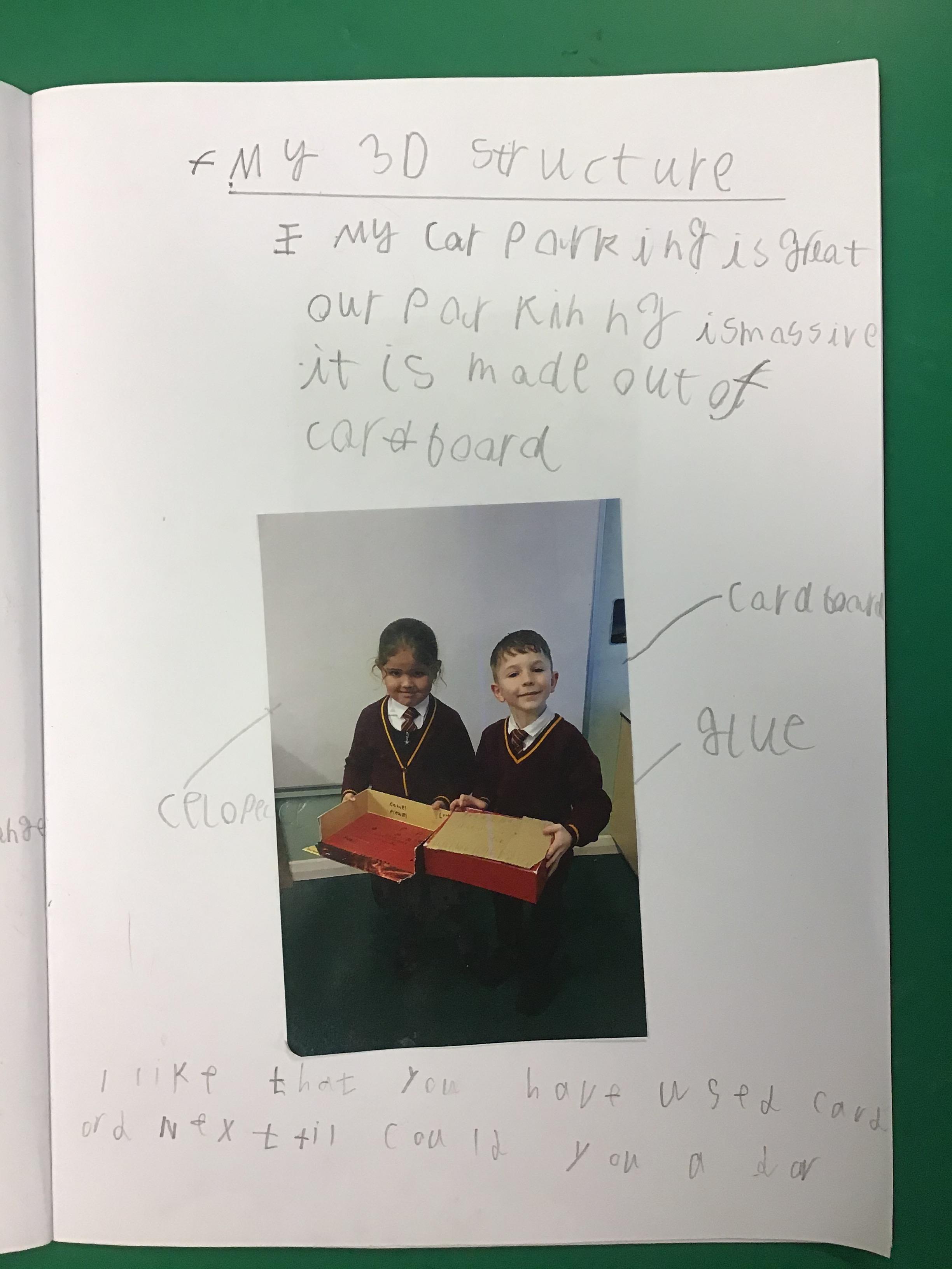 Year 1 was given the design brief to make a car port for Fred's car. They analysed different materials and experimented to see which ones were suitable and which ones were not. They then designed their own car port and labelled what resources they was going to use. The children then created their own 3D sculptures of a car port using different materials and resources to put them altogether.
