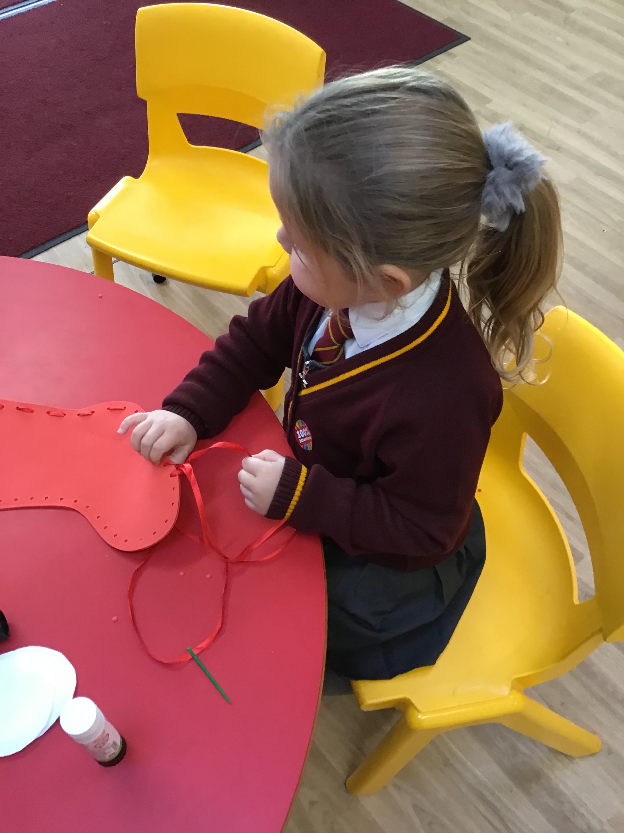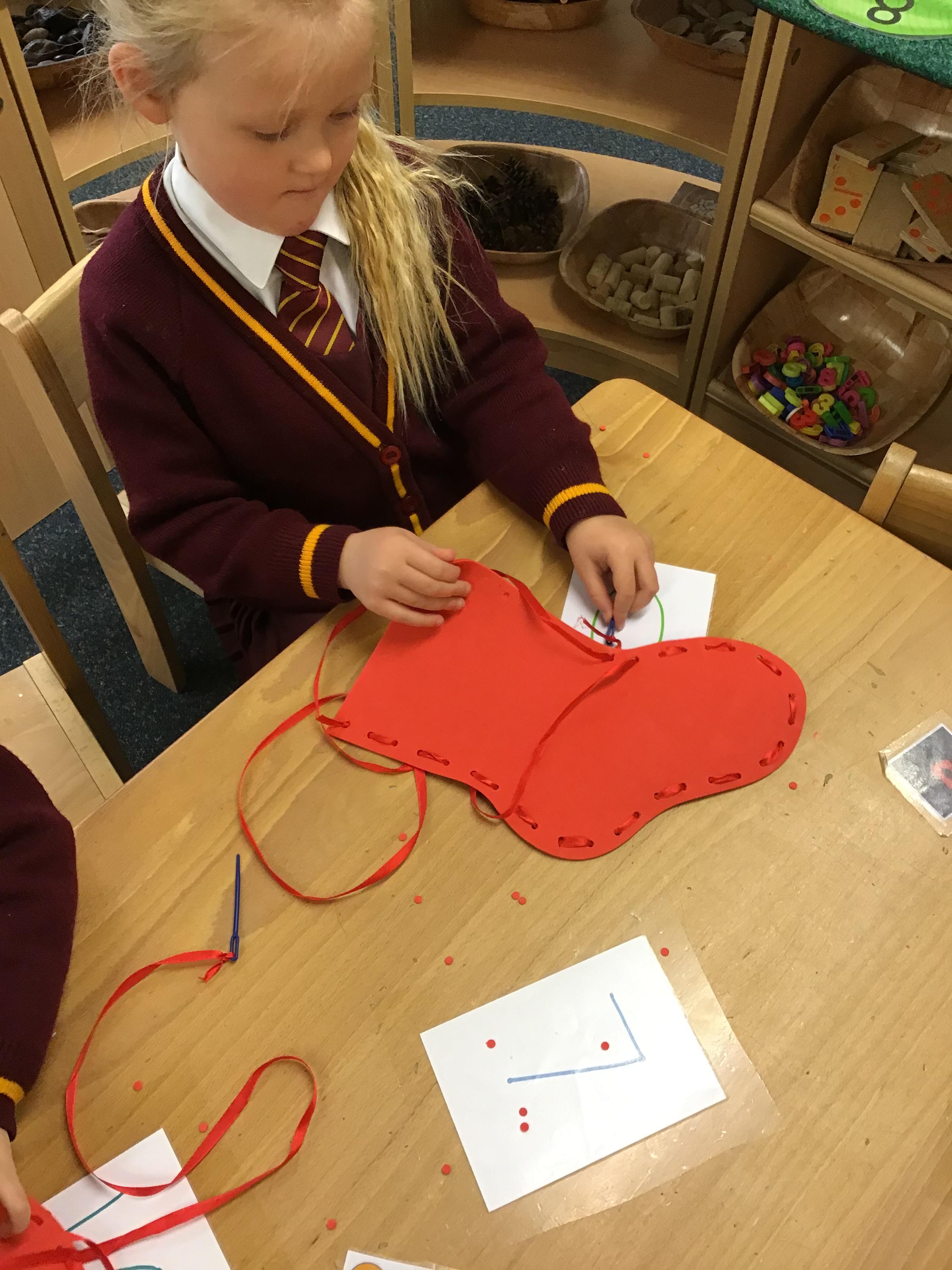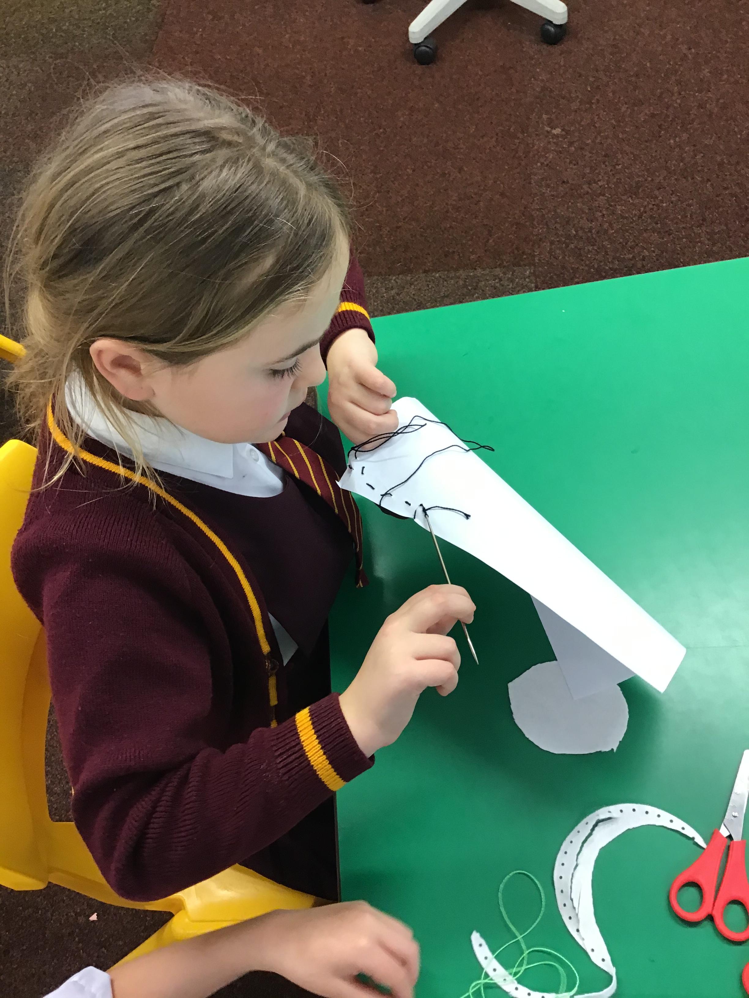 Children in Reception used a range of tools and techniques to create their own flower threading pattern. This helped to develop their fine motor skills and explore a variety of materials and to share their creations.