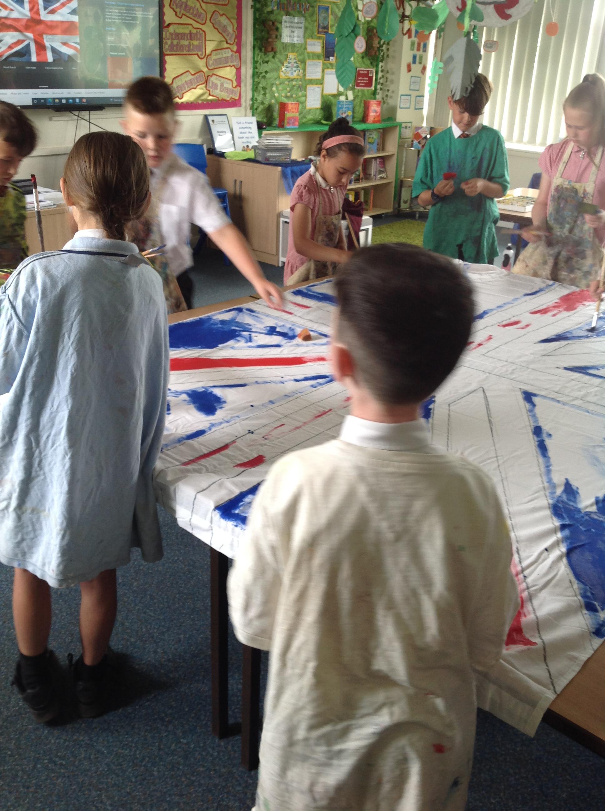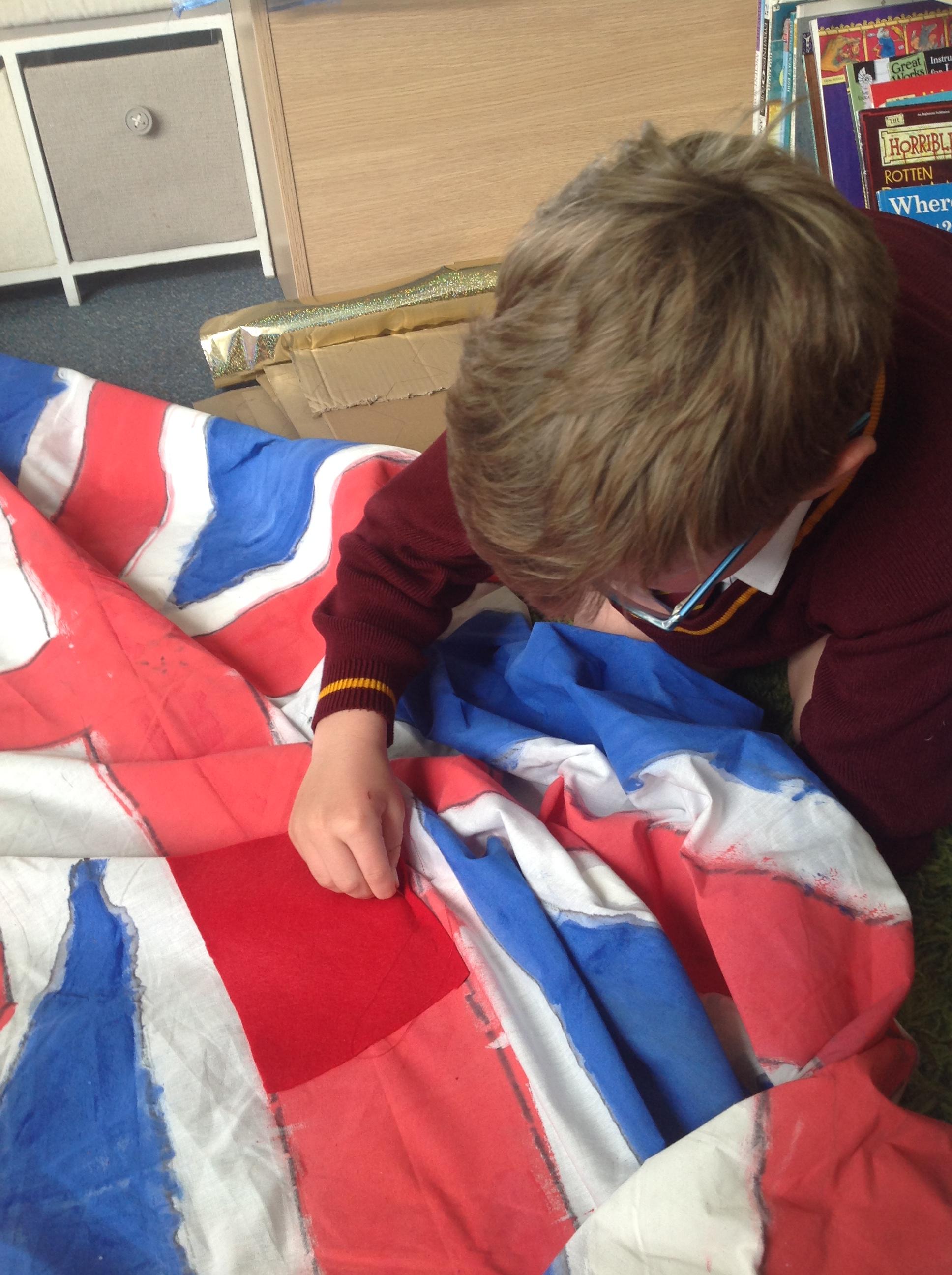 In Year 4, the children have started creating our Union Jack for the Jubilee celebrations we are having in school. The children are making a Union Jack but on a grand scale! The children have started our Union Jack by painting it using the red, white and blue colours. The children have started to finish our flag by sewing some felt onto it. The children will also be cutting pieces of felt and gluing them on so that our Union Jack is mixed media. The children did a fantastic job today and were very proud of not only creating their Union Jack but also leaving a Union Jack printed on the tables!