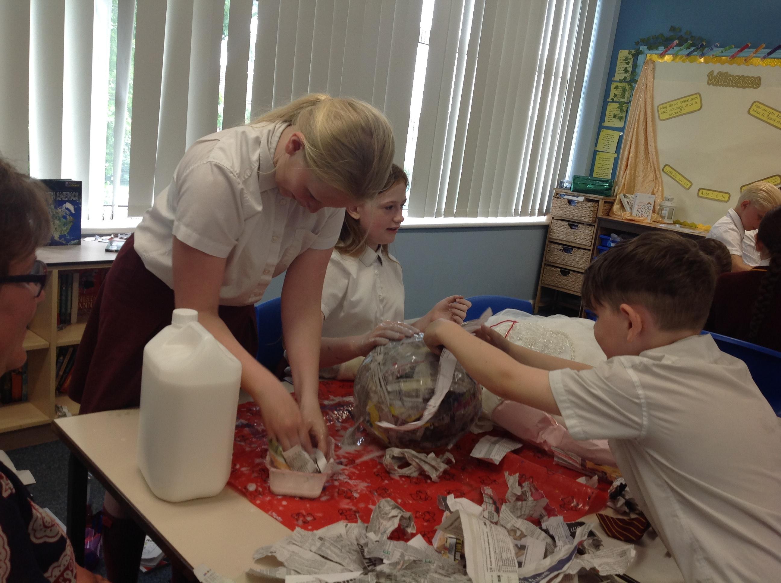 Chicken wire was used to make the outline, modroc was applied and then smoothed to finish. Children then used a sponge to paint the Orb as well as using a small paint brush for the finer details. Children then researched the jewels that were used using iPads and very carefully, using fine motor skills, applied them in the correct position.