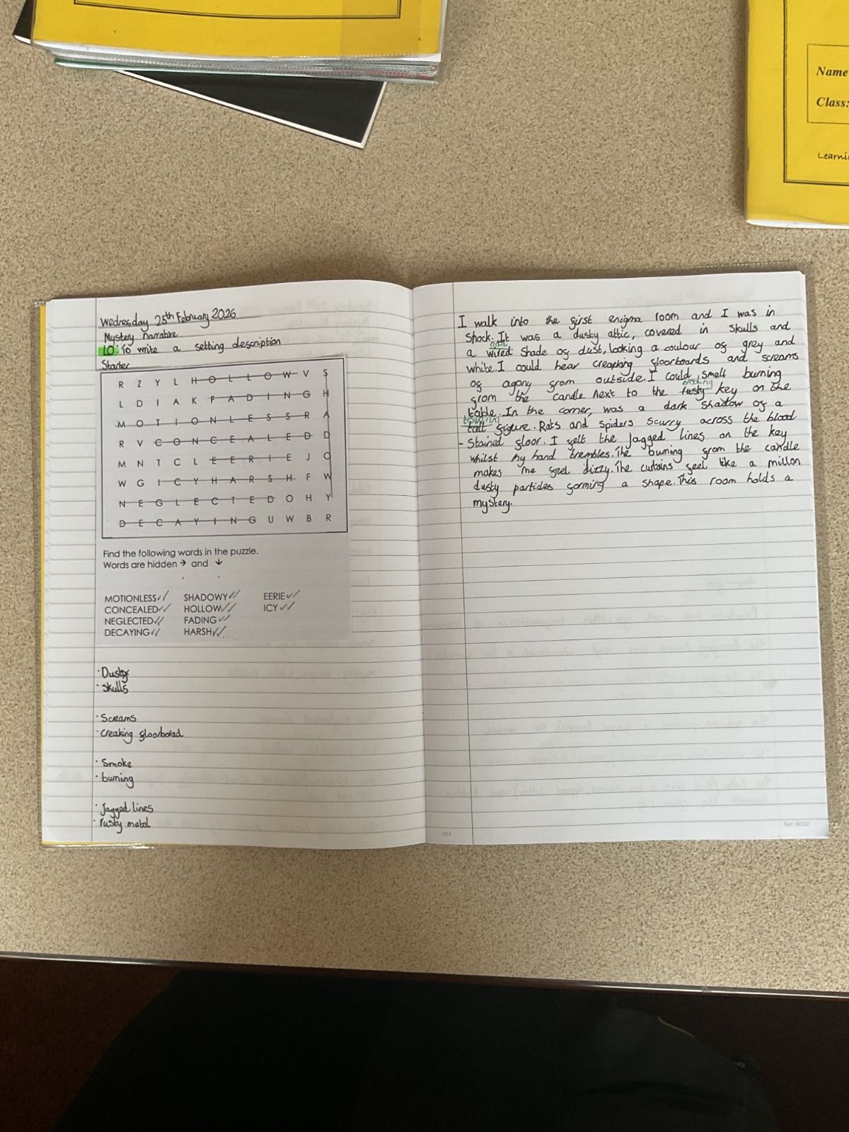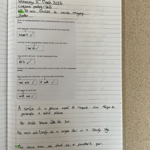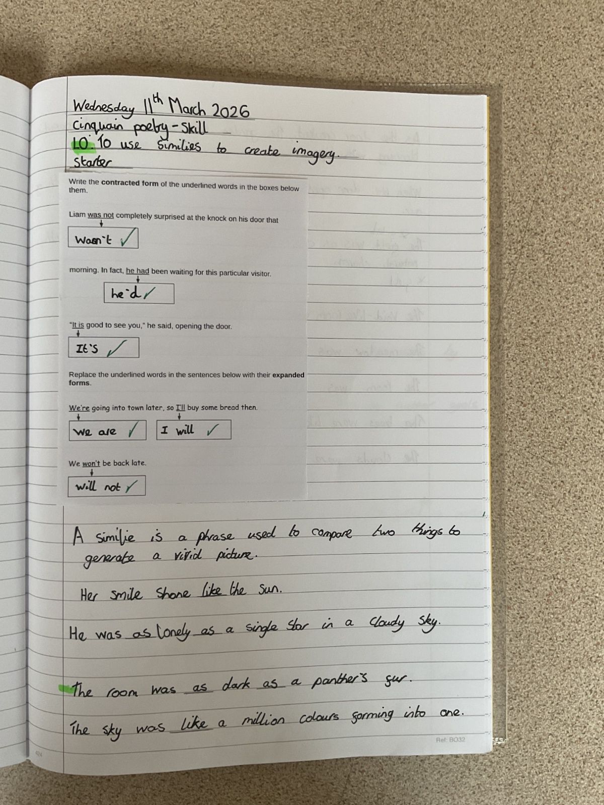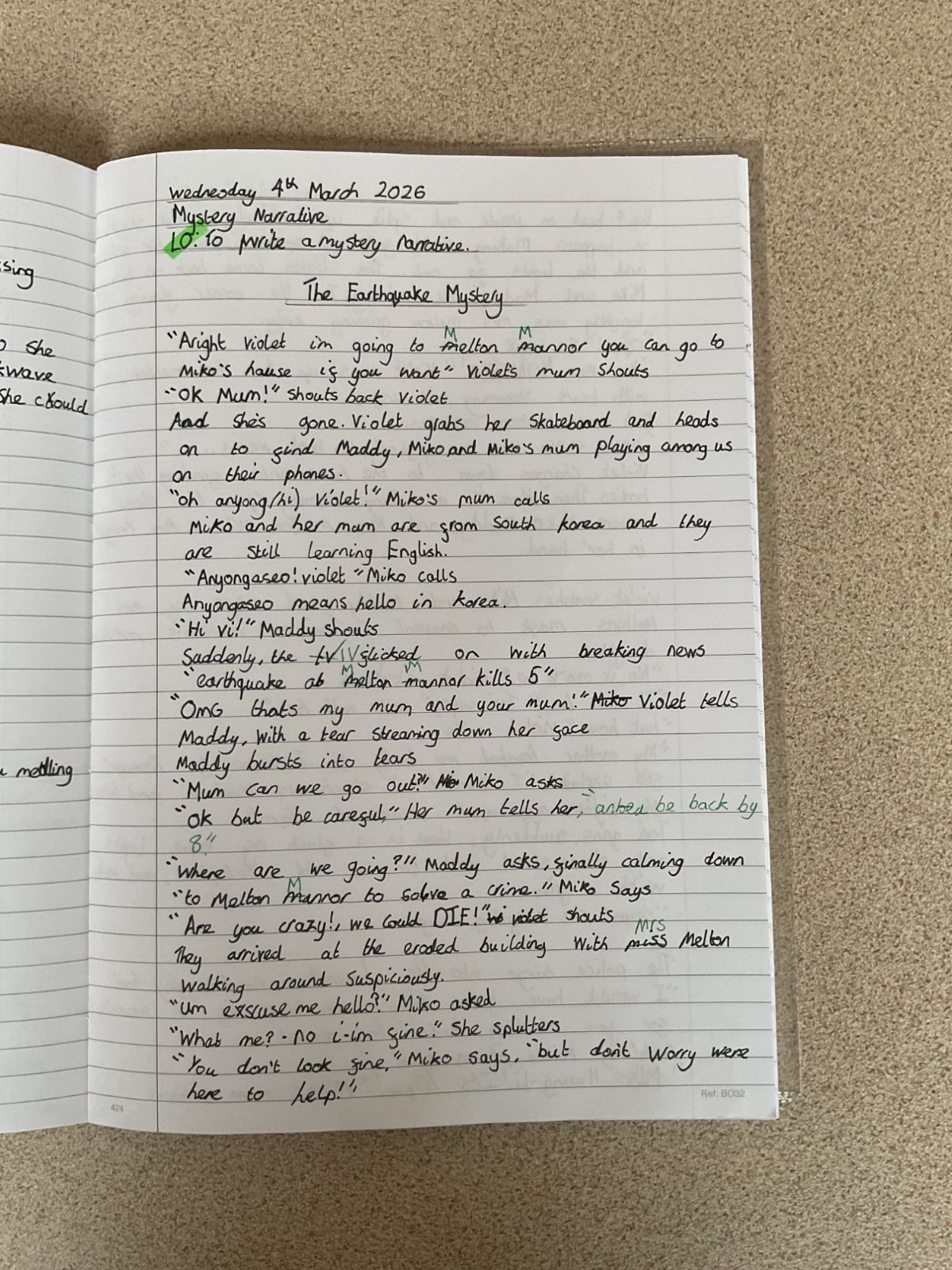 In Spring 2 Literacy, Year 6 wrote a Rondeau Poem based on Flanders Fields and wrote a diary written from a soldier in a WW1 trench. For our creative writes, we wrote a horror narrative based on the film Alma and an adventure narrative based on Shrek for World Book Day!
