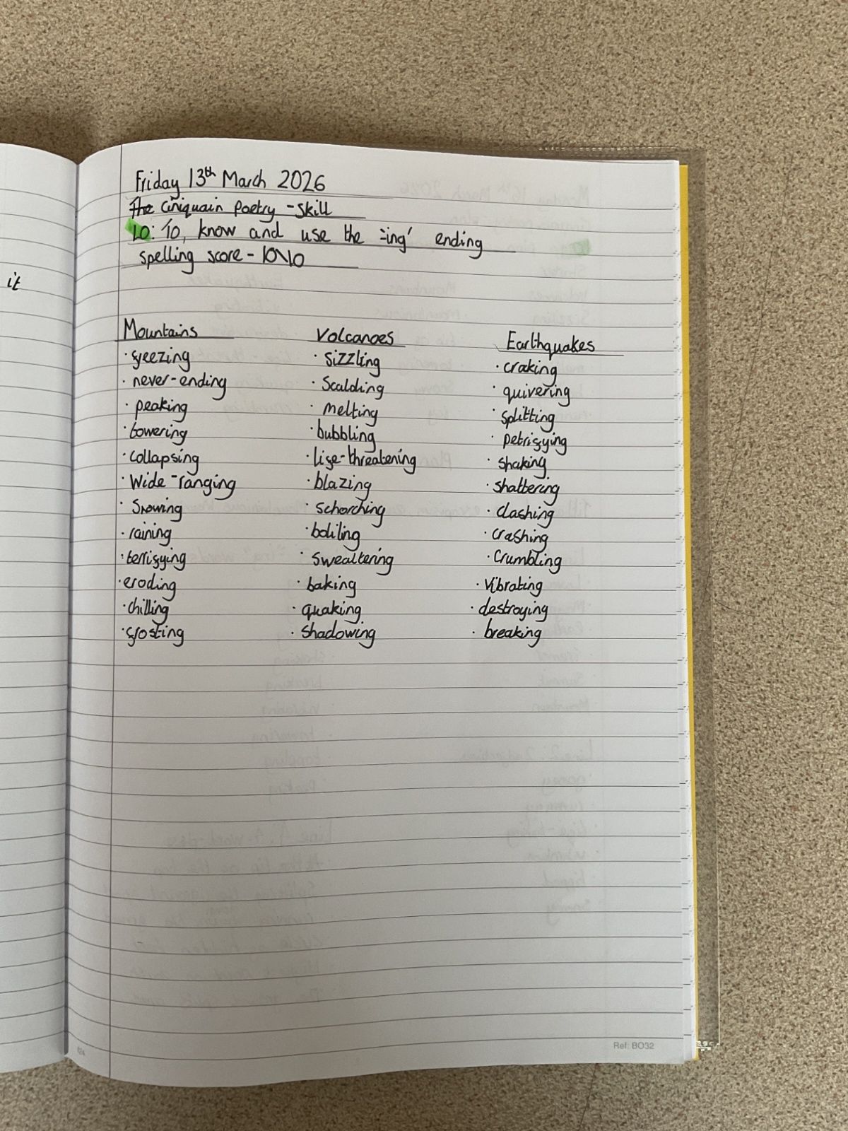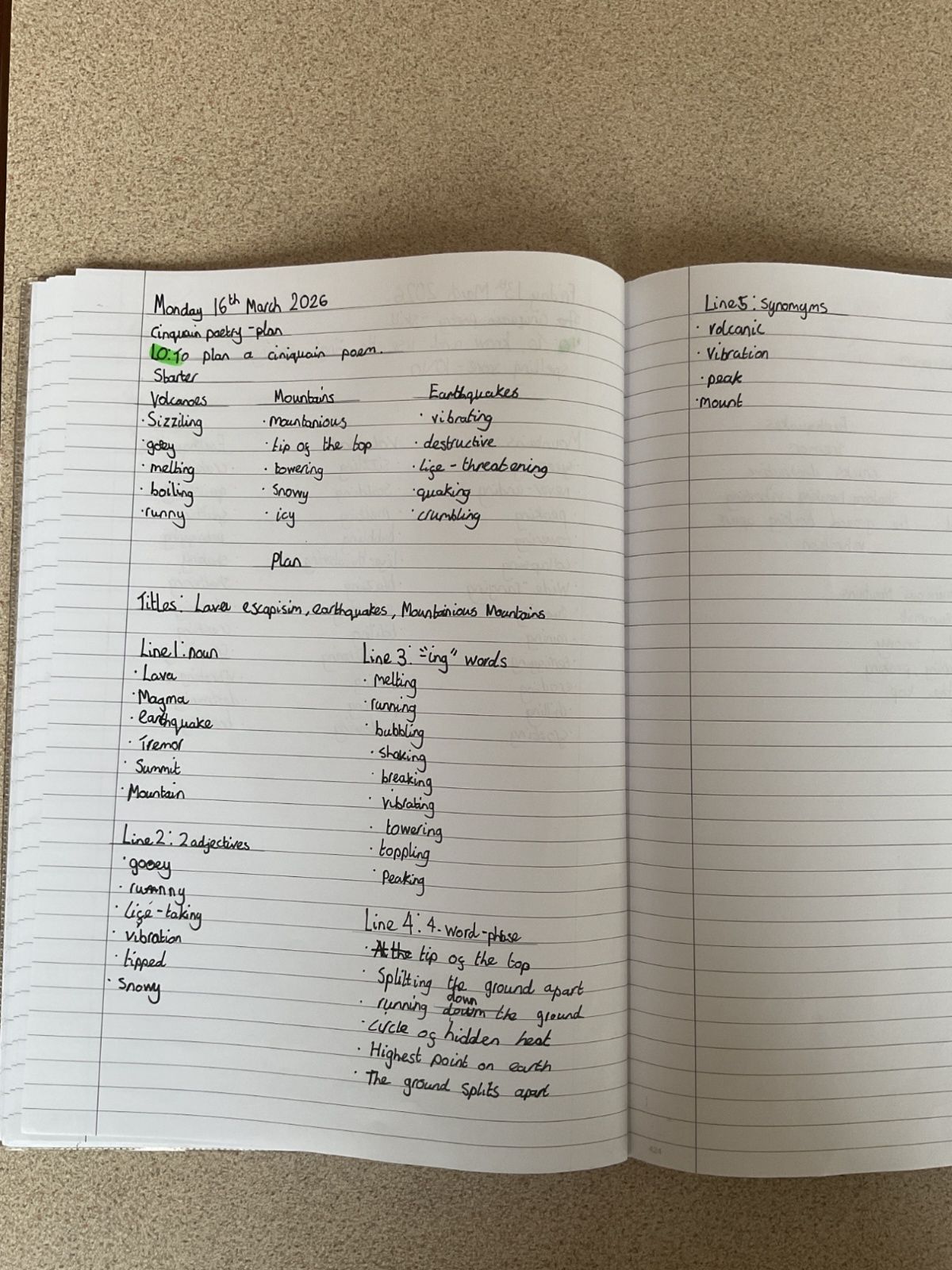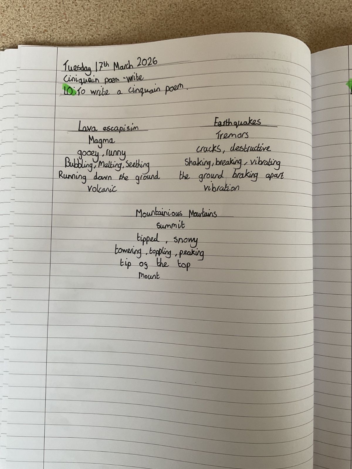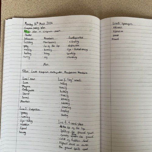 In Spring 1, Year 5 have written and adventure narrative and explanation text linked to our topic - Mountains, Volcanoes and Earthquakes