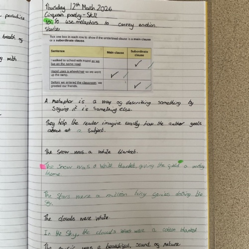 During the Spring term, in Literacy, Year 6 wrote a diary entry from the trenches of World War 1 and Rondeau poetry linked to the famous war poem; Flanders Fields