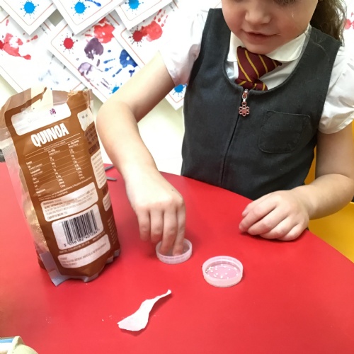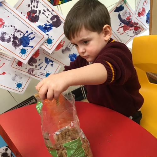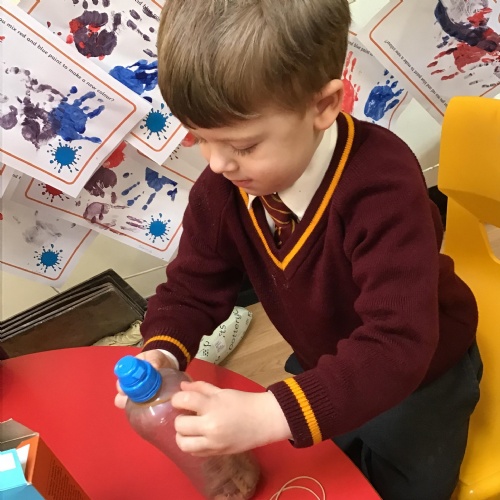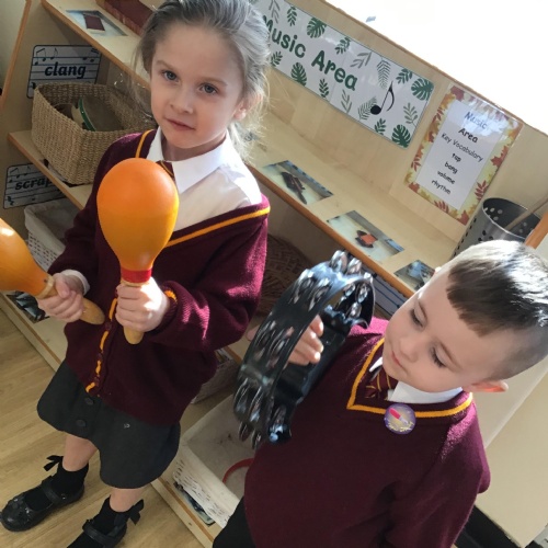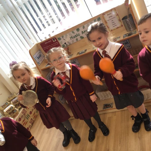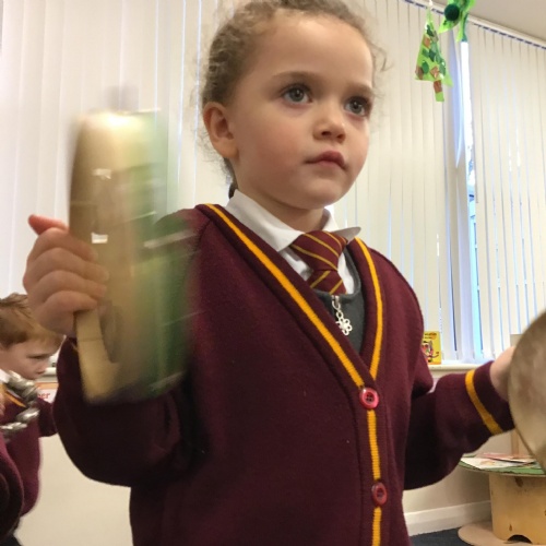 The children have enjoyed exploring different musical instruments. They then made their own instruments out of recyclable materials and played their instruments along to the music. The children were encouraged to play loudly, quietly, quickly or slowly when appropriate.