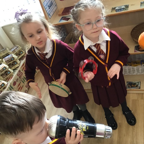 The nursery children have enjoyed exploring a variety of musical instruments and discovering the different sounds they can make. They then used recyclable materials to design and create their own instruments, which they proudly played along to music. During these activities, the children were encouraged to experiment with playing their instruments loudly or quietly, and quickly or slowly, helping them develop their listening skills and understanding of rhythm.