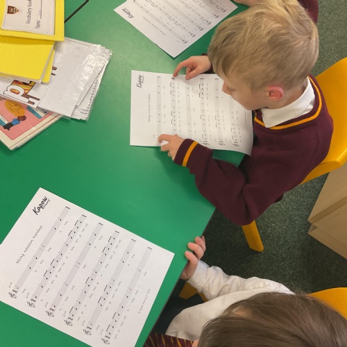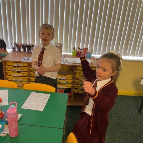 Year 1 loved creating and performing their own superhero theme tunes using patterns of high and low-pitched notes and creating rhythms.
